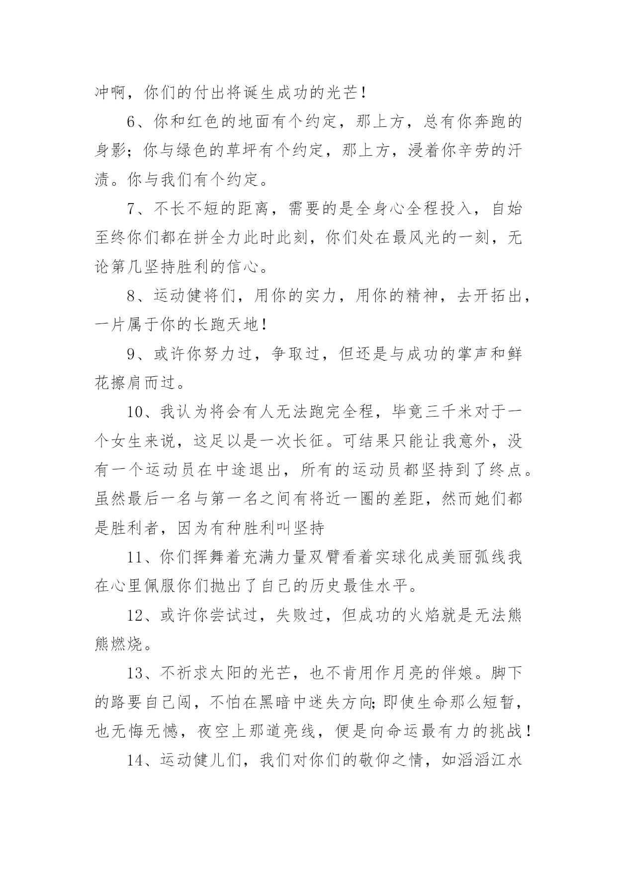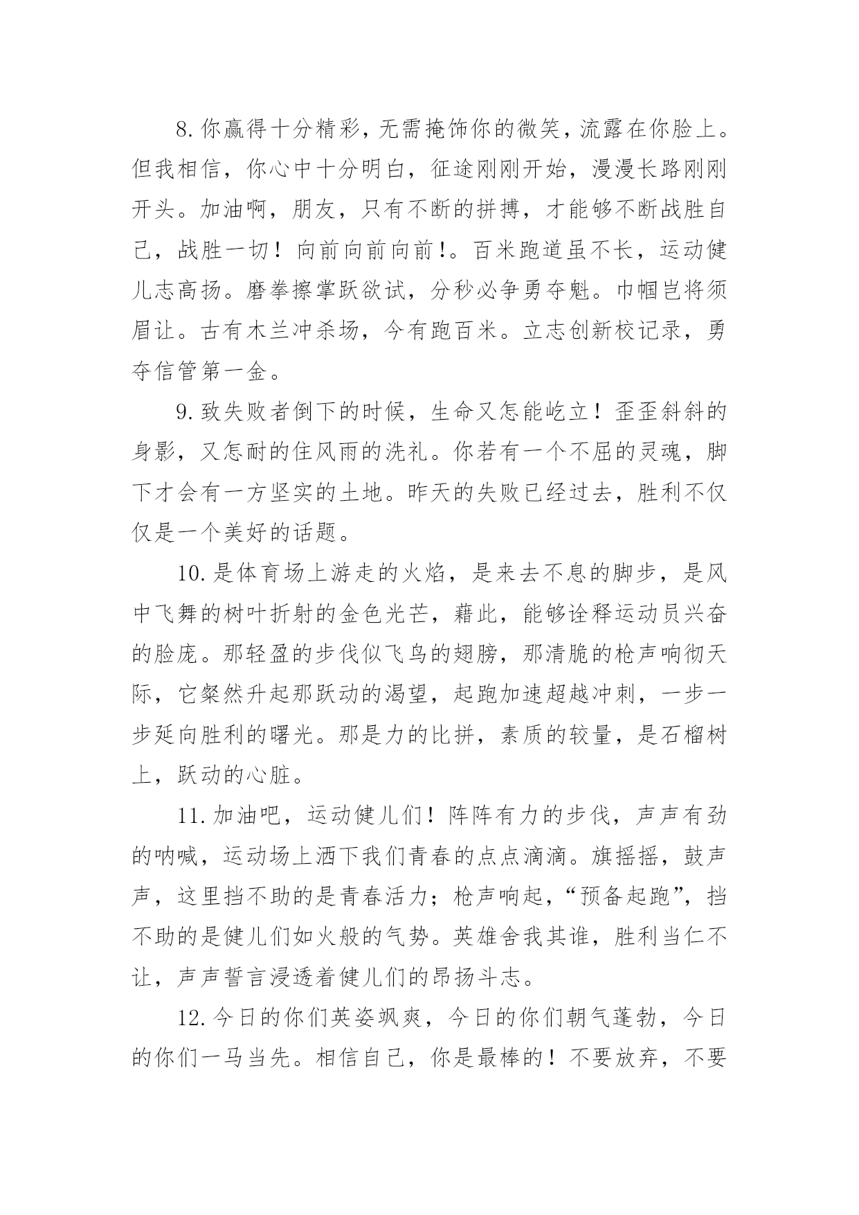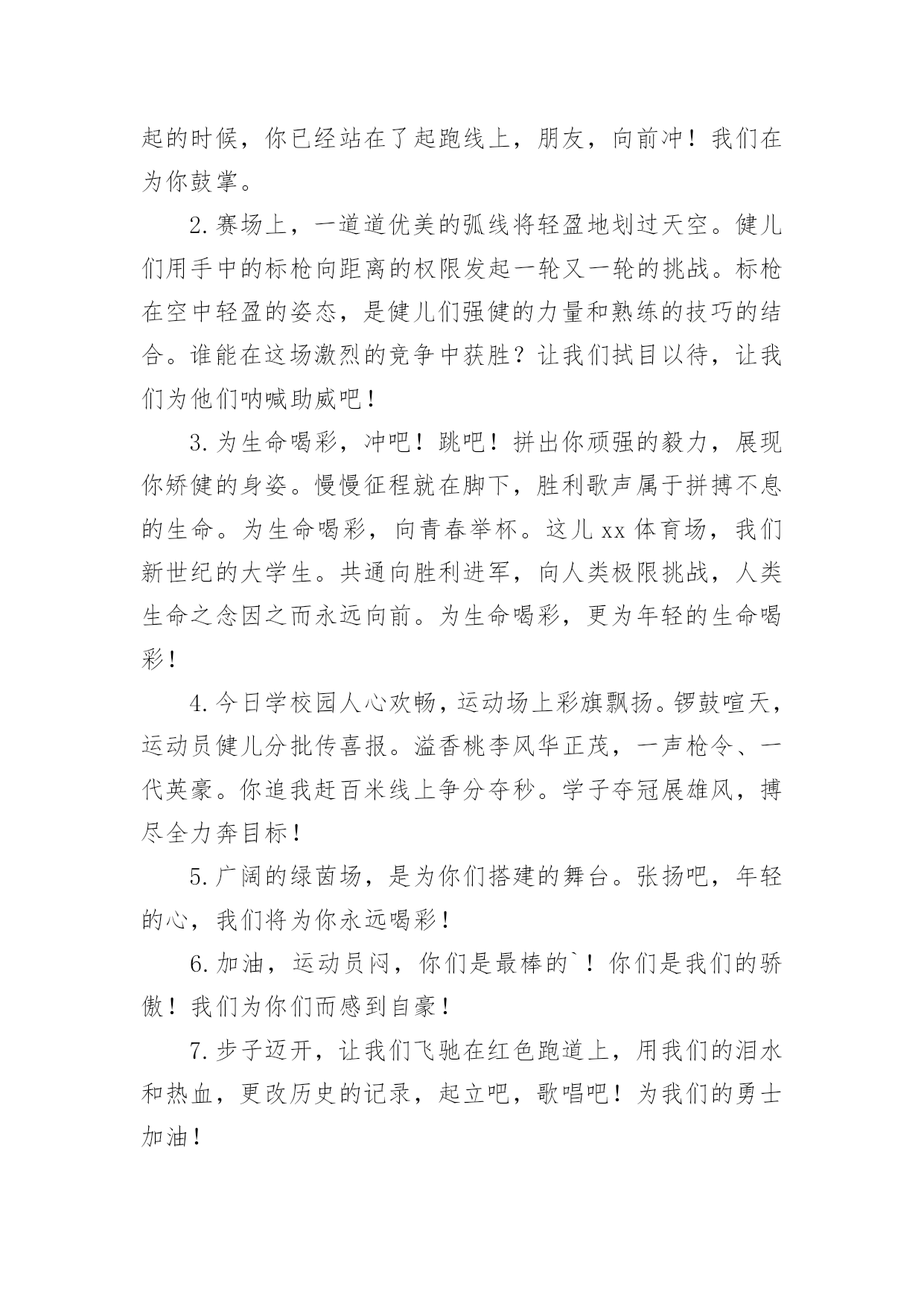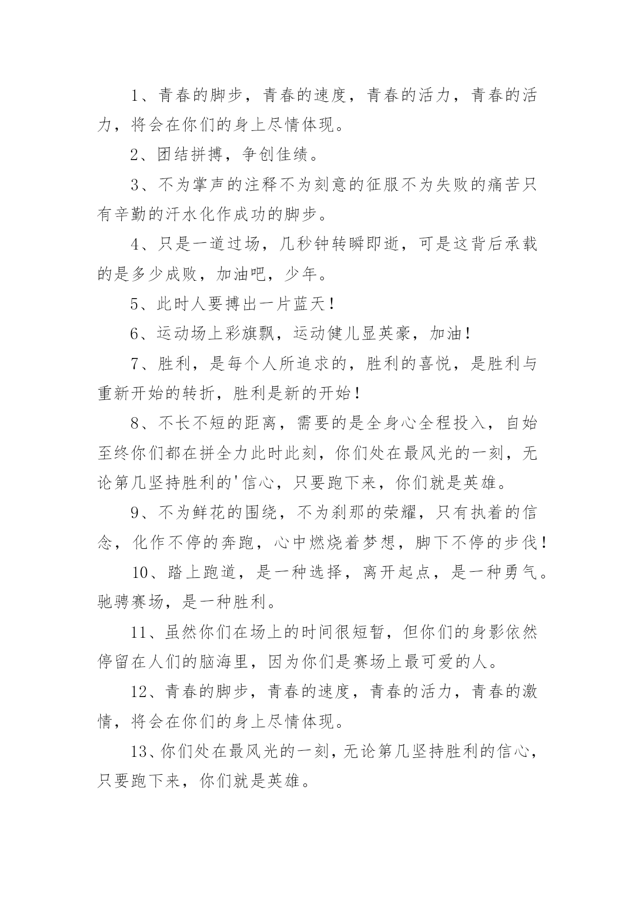 运动会加油稿运动会加油稿[优选15篇]在现在社会,我们都跟加油稿有着直接或间接的联系,加油稿是一种对他人有正向激励作用的文稿。还是对加油稿一筹莫展吗?以下是小编帮大家整理的运动会加油稿,欢迎大家分享。运动会加油稿11、观众席上掌声雷动,热热烈烈划破长空,他们的灵魂在叫,血在烧,都是渴望有无限的希望,掌声响起来为新的力量喝彩,掌声响起来,每一棵都精彩。晨风轻轻地唤醒骄阳,校园的操场传来发令枪的声响,彩旗与呐喊声一起在飘荡着,心和起点紧紧的相连,用青春和热血来铺洒白色的跑道,用激情点燃胜利的曙光!赛场上,无数飞扬的红色生命,无数威武的骑手,映动着一个个跃动的生命。因为有你,初冬的阳光撮成煦暖;因为有你,终点的线条色彩斑斓;因为有你,掌声才显出非凡意义。2、年轻的心,蓬勃的心,向上的心,酝酿着梦幻,滋润着信念,喷发着志气,即使收效甚微,不愿放弃目标,即使落伍,不愿停止前进的步伐,为了昨天的汗水,去实现今天的辉煌。是的,我们能行,我们能赢,心中重复了无数次,是的,我们,能赢。因为我们富有生命的热情,必胜的信心;未来的挑战,必胜的坚定。向着辽阔大地大呼:我们一定赢!3、汗水,泪水;笑声,歌声;我们尽情挥洒。开幕式上,运动场上,我们尽情展现,多少艰辛,多少困苦,我们勇敢承担。因为年轻,因为张扬,因为我们知道:用今天的汗水换来明天的.微笑。4、愿将希望折成一只小船,沿着溪流送到你的身边;愿把鼓励扎成一束清水,满怀微笑地递到你面前;愿将友谊织成一条毛巾,轻轻的拭去你辛苦的汗水;愿让热情燃烧成一片鲜花,献给你,到一声:“辛苦啦,运动员!”5、拔河,是拔一种潜力,每个人都是有潜力可以挖掘的;拔河,也是拔一种人生。在人生的道路上,谁都想当赢家,靠的是实力,靠的是机遇,靠的也是一种永不放弃的精神,只要你满腔热忱,终不放弃,你终究会赢回来。6、踏上跑道,是一种选择,离开起点,是一种追求,驰骋赛场,是一种骄傲,执着坚持,是一种胜利。我们选择,我们追求,我们同样将胜利,此时此刻,跑道便是我们精彩的舞台,声声加油便是我们最高的奖项!终点永远在前方,成功永远在心中,论何成功,谈何荣辱,心中的信念只有一个:拼搏!当一切不再遥远,洋洋洒洒的快乐,是秋天最美的画面。运动会加油稿21.掌声响起来这里需要激情,这里需要呐喊,这里同样需要掌声。当你乘胜而归,我们为你鼓掌,为你祝贺,当你失败而来,我们同样为你鼓掌,为你骄傲。当掌声再一次想起的时候,你已经站在了起跑线上,朋友,向前冲!我们在为你鼓掌。2.赛场上,一道道优美的弧线将轻盈地划过天空。健儿们用手中的标枪向距离的权限发起一轮又一轮的挑战。标枪在空中轻盈的姿态,是健儿们强健的力量和熟练的技巧的结合。谁能在这场激烈的竞争中获胜?让我们拭目以待,让我们为他们呐喊助威吧!3.为生命喝彩,冲吧!跳吧!拼出你顽强的毅力,展现你矫健的身姿。慢慢征程就在脚下,胜利歌声属于拼搏不息的生命。为生命喝彩,向青春举杯。这儿xx体育场,我们新世纪的大学生。共通向胜利进军,向人类极限挑战,人类生命之念因之而永远向前。为生命喝彩,更为年轻的生命喝彩!4.今日学校园人心欢畅,运动场上彩旗飘扬。锣鼓喧天,运动员健儿分批传喜报。溢香桃李风华正茂,一声枪令、一代英豪。你追我赶百米线上争分夺秒。学子夺冠展雄风,搏尽全力奔目标!5.广阔的绿茵场,是为你们搭建的舞台。张扬吧,年轻的心,我们将为你永远喝彩!6.加油,运动员闷,你们是最棒的`!你们是我们的骄傲!我们为你们而感到自豪!7.步子迈开,让我们飞驰在红色跑道上,用我们的泪水和热血,更改历史的记录,起立吧,歌唱吧!为我们的勇士加油!8.你赢得十分精彩,无需掩饰你的微笑,流露在你脸上。但我相信,你心中十分明白,征途刚刚开始,漫漫长路刚刚开头。加油啊,朋友,只有不断的拼搏,才能够不断战胜自己,战胜一切!向前向前向前!。百米跑道虽不长,运动健儿志高扬。磨拳擦掌跃欲试,分秒必争勇夺魁。巾帼岂将须眉让。古有木兰冲杀场,今有跑百米。立志创新校记录,勇夺信管第一金。9.致失败者倒下的时候,生命又怎能屹立!歪歪斜斜的身影,又怎耐的住风雨的洗礼。你若有一个不屈的灵魂,脚下才会有一方坚实的土地。昨天的失败已经过去,胜利不仅仅是一个美好的话题。10.是体育场上游走的火焰,是来去不息的脚步,是风中飞舞的树叶折射的金色光芒,藉此,能够诠释运动员兴奋的脸庞。那轻盈的步伐似飞鸟的翅膀,那清脆的枪声响彻天际,它粲然升起那跃动的渴望,起跑加速超越冲刺,一步一步延向胜利的曙光。那是力的比拼,素质的较量,是石榴树上,跃动的心脏。11.加油吧,运动健儿们!阵阵有力的步伐,声声有劲的呐喊,运动场上洒下我们青春的点点滴滴。旗摇摇,鼓声声,这里挡不助的是青春活力;枪声响起,“预备起跑”,挡不助的是健儿们如火般的气势。英雄舍我其谁,胜利当仁不让,声声