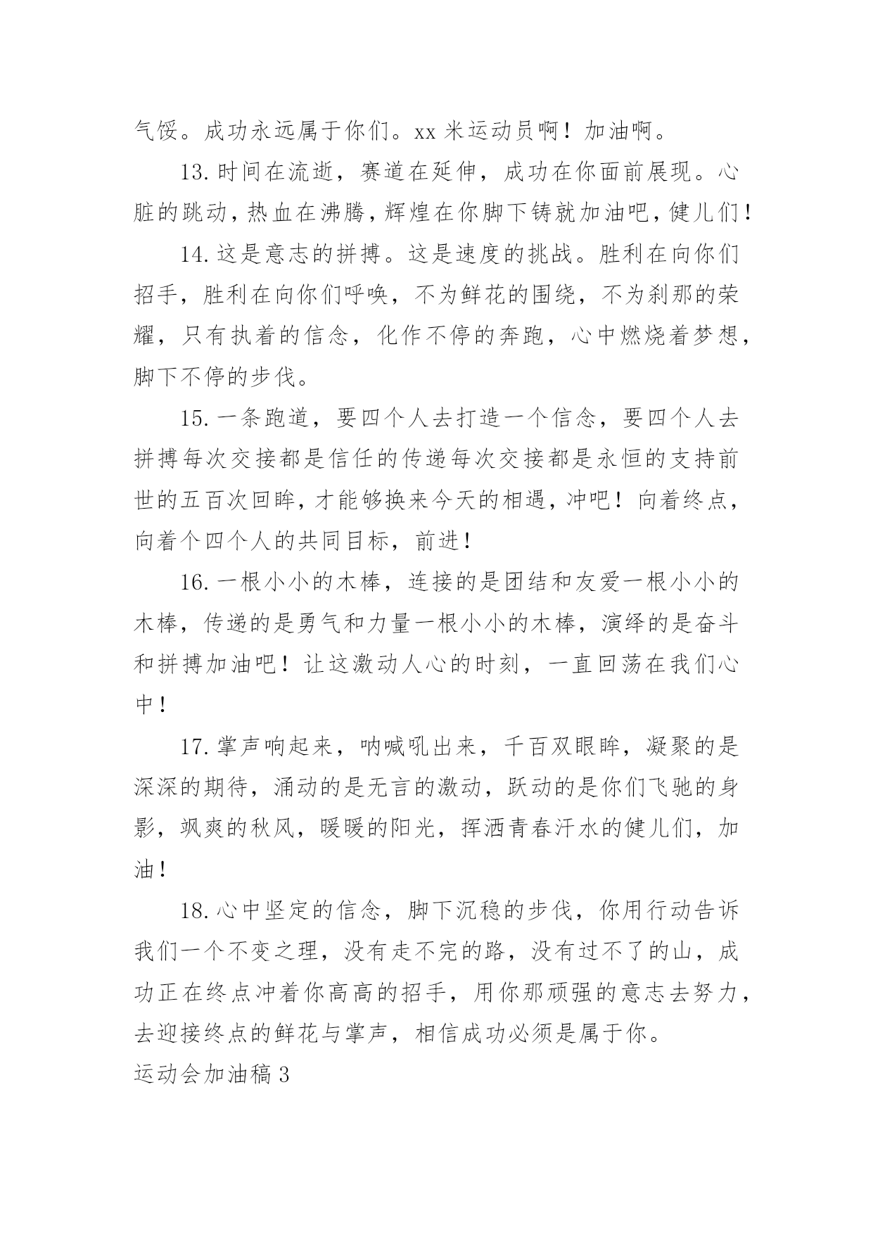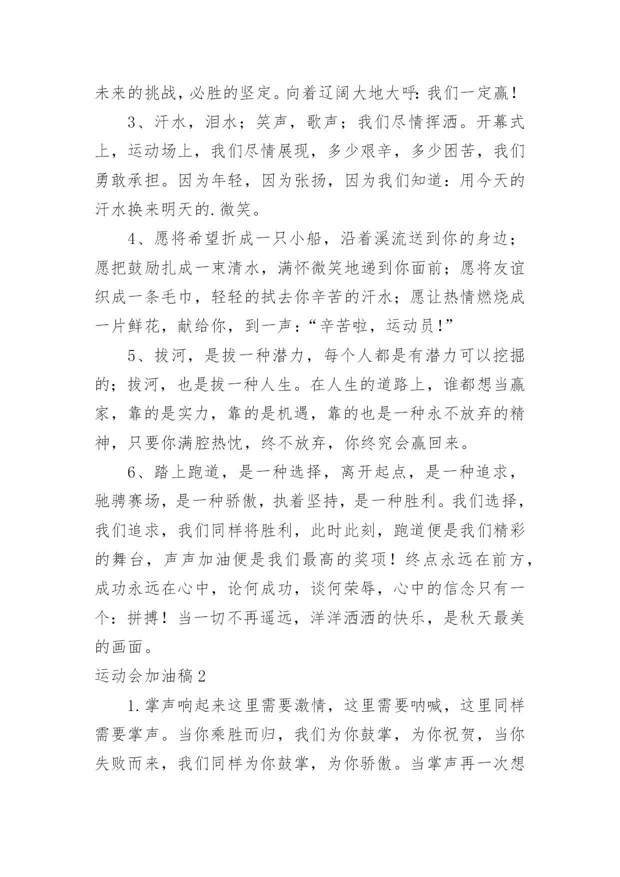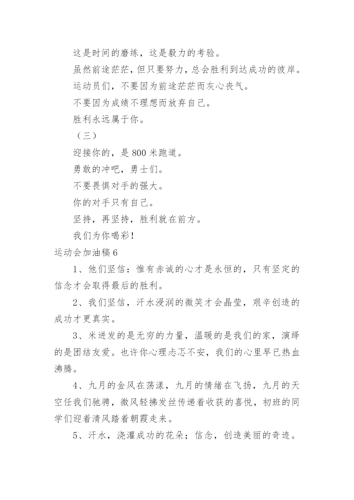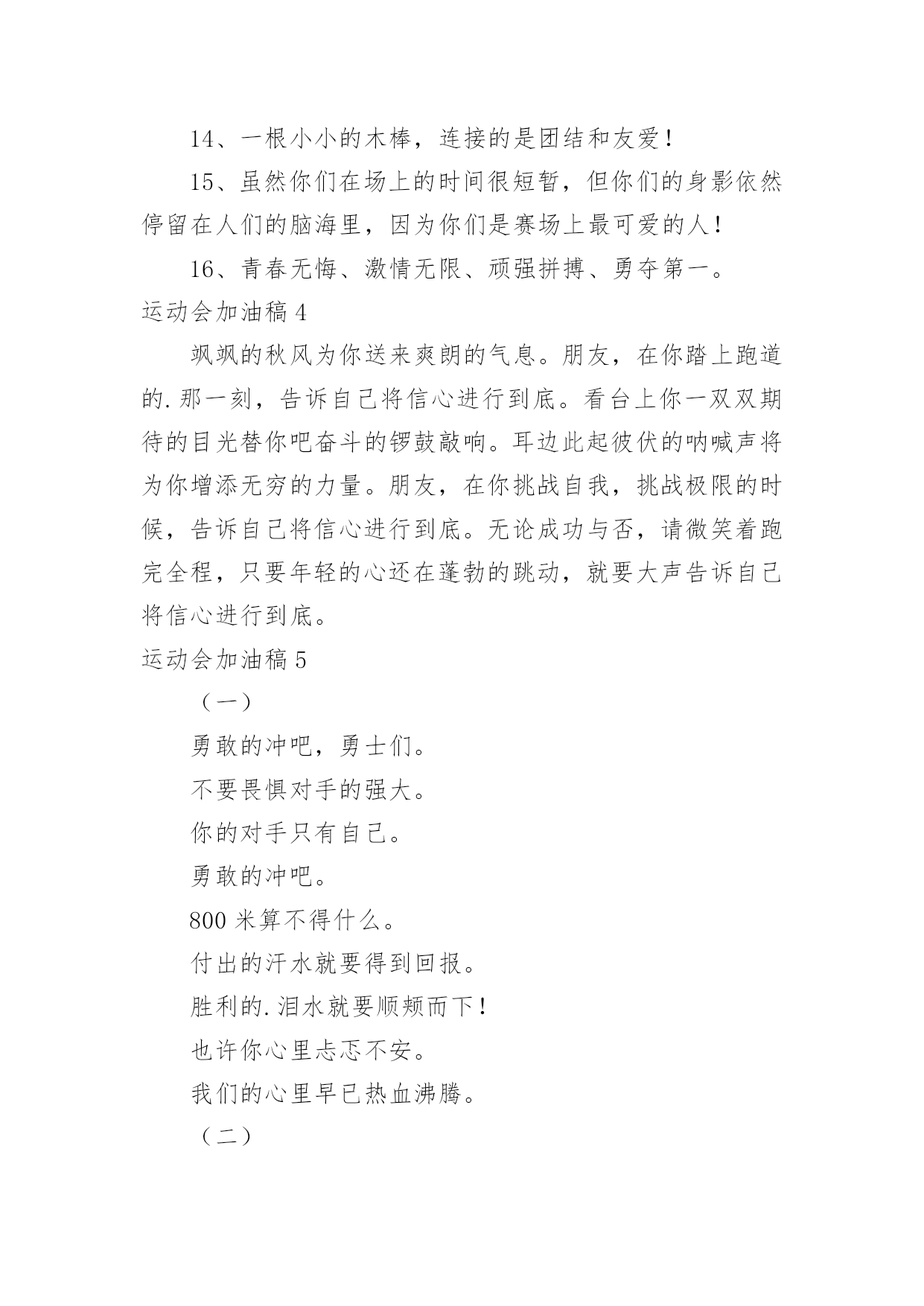 运动会加油稿运动会加油稿[优选15篇]在现在社会,我们都跟加油稿有着直接或间接的联系,加油稿是一种对他人有正向激励作用的文稿。还是对加油稿一筹莫展吗?以下是小编帮大家整理的运动会加油稿,欢迎大家分享。运动会加油稿11、观众席上掌声雷动,热热烈烈划破长空,他们的灵魂在叫,血在烧,都是渴望有无限的希望,掌声响起来为新的力量喝彩,掌声响起来,每一棵都精彩。晨风轻轻地唤醒骄阳,校园的操场传来发令枪的声响,彩旗与呐喊声一起在飘荡着,心和起点紧紧的相连,用青春和热血来铺洒白色的跑道,用激情点燃胜利的曙光!赛场上,无数飞扬的红色生命,无数威武的骑手,映动着一个个跃动的生命。因为有你,初冬的阳光撮成煦暖;因为有你,终点的线条色彩斑斓;因为有你,掌声才显出非凡意义。2、年轻的心,蓬勃的心,向上的心,酝酿着梦幻,滋润着信念,喷发着志气,即使收效甚微,不愿放弃目标,即使落伍,不愿停止前进的步伐,为了昨天的汗水,去实现今天的辉煌。是的,我们能行,我们能赢,心中重复了无数次,是的,我们,能赢。因为我们富有生命的热情,必胜的信心;未来的挑战,必胜的坚定。向着辽阔大地大呼:我们一定赢!3、汗水,泪水;笑声,歌声;我们尽情挥洒。开幕式上,运动场上,我们尽情展现,多少艰辛,多少困苦,我们勇敢承担。因为年轻,因为张扬,因为我们知道:用今天的汗水换来明天的.微笑。4、愿将希望折成一只小船,沿着溪流送到你的身边;愿把鼓励扎成一束清水,满怀微笑地递到你面前;愿将友谊织成一条毛巾,轻轻的拭去你辛苦的汗水;愿让热情燃烧成一片鲜花,献给你,到一声:“辛苦啦,运动员!”5、拔河,是拔一种潜力,每个人都是有潜力可以挖掘的;拔河,也是拔一种人生。在人生的道路上,谁都想当赢家,靠的是实力,靠的是机遇,靠的也是一种永不放弃的精神,只要你满腔热忱,终不放弃,你终究会赢回来。6、踏上跑道,是一种选择,离开起点,是一种追求,驰骋赛场,是一种骄傲,执着坚持,是一种胜利。我们选择,我们追求,我们同样将胜利,此时此刻,跑道便是我们精彩的舞台,声声加油便是我们最高的奖项!终点永远在前方,成功永远在心中,论何成功,谈何荣辱,心中的信念只有一个:拼搏!当一切不再遥远,洋洋洒洒的快乐,是秋天最美的画面。运动会加油稿21.掌声响起来这里需要激情,这里需要呐喊,这里同样需要掌声。当你乘胜而归,我们为你鼓掌,为你祝贺,当你失败而来,我们同样为你鼓掌,为你骄傲。当掌声再一次想起的时候,你已经站在了起跑线上,朋友,向前冲!我们在为你鼓掌。2.赛场上,一道道优美的弧线将轻盈地划过天空。健儿们用手中的标枪向距离的权限发起一轮又一轮的挑战。标枪在空中轻盈的姿态,是健儿们强健的力量和熟练的技巧的结合。谁能在这场激烈的竞争中获胜?让我们拭目以待,让我们为他们呐喊助威吧!3.为生命喝彩,冲吧!跳吧!拼出你顽强的毅力,展现你矫健的身姿。慢慢征程就在脚下,胜利歌声属于拼搏不息的生命。为生命喝彩,向青春举杯。这儿xx体育场,我们新世纪的大学生。共通向胜利进军,向人类极限挑战,人类生命之念因之而永远向前。为生命喝彩,更为年轻的生命喝彩!4.今日学校园人心欢畅,运动场上彩旗飘扬。锣鼓喧天,运动员健儿分批传喜报。溢香桃李风华正茂,一声枪令、一代英豪。你追我赶百米线上争分夺秒。学子夺冠展雄风,搏尽全力奔目标!5.广阔的绿茵场,是为你们搭建的舞台。张扬吧,年轻的心,我们将为你永远喝彩!6.加油,运动员闷,你们是最棒的`!你们是我们的骄傲!我们为你们而感到自豪!7.步子迈开,让我们飞驰在红色跑道上,用我们的泪水和热血,更改历史的记录,起立吧,歌唱吧!为我们的勇士加油!8.你赢得十分精彩,无需掩饰你的微笑,流露在你脸上。但我相信,你心中十分明白,征途刚刚开始,漫漫长路刚刚开头。加油啊,朋友,只有不断的拼搏,才能够不断战胜自己,战胜一切!向前向前向前!。百米跑道虽不长,运动健儿志高扬。磨拳擦掌跃欲试,分秒必争勇夺魁。巾帼岂将须眉让。古有木兰冲杀场,今有跑百米。立志创新校记录,勇夺信管第一金。9.致失败者倒下的时候,生命又怎能屹立!歪歪斜斜的身影,又怎耐的住风雨的洗礼。你若有一个不屈的灵魂,脚下才会有一方坚实的土地。昨天的失败已经过去,胜利不仅仅是一个美好的话题。10.是体育场上游走的火焰,是来去不息的脚步,是风中飞舞的树叶折射的金色光芒,藉此,能够诠释运动员兴奋的脸庞。那轻盈的步伐似飞鸟的翅膀,那清脆的枪声响彻天际,它粲然升起那跃动的渴望,起跑加速超越冲刺,一步一步延向胜利的曙光。那是力的比拼,素质的较量,是石榴树上,跃动的心脏。11.加油吧,运动健儿们!阵阵有力的步伐,声声有劲的呐喊,运动场上洒下我们青春的点点滴滴。旗摇摇,鼓声声,这里挡不助的是青春活力;枪声响起,“预备起跑”,挡不助的是健儿们如火般的气势。英雄舍我其谁,胜利当仁不让,声声