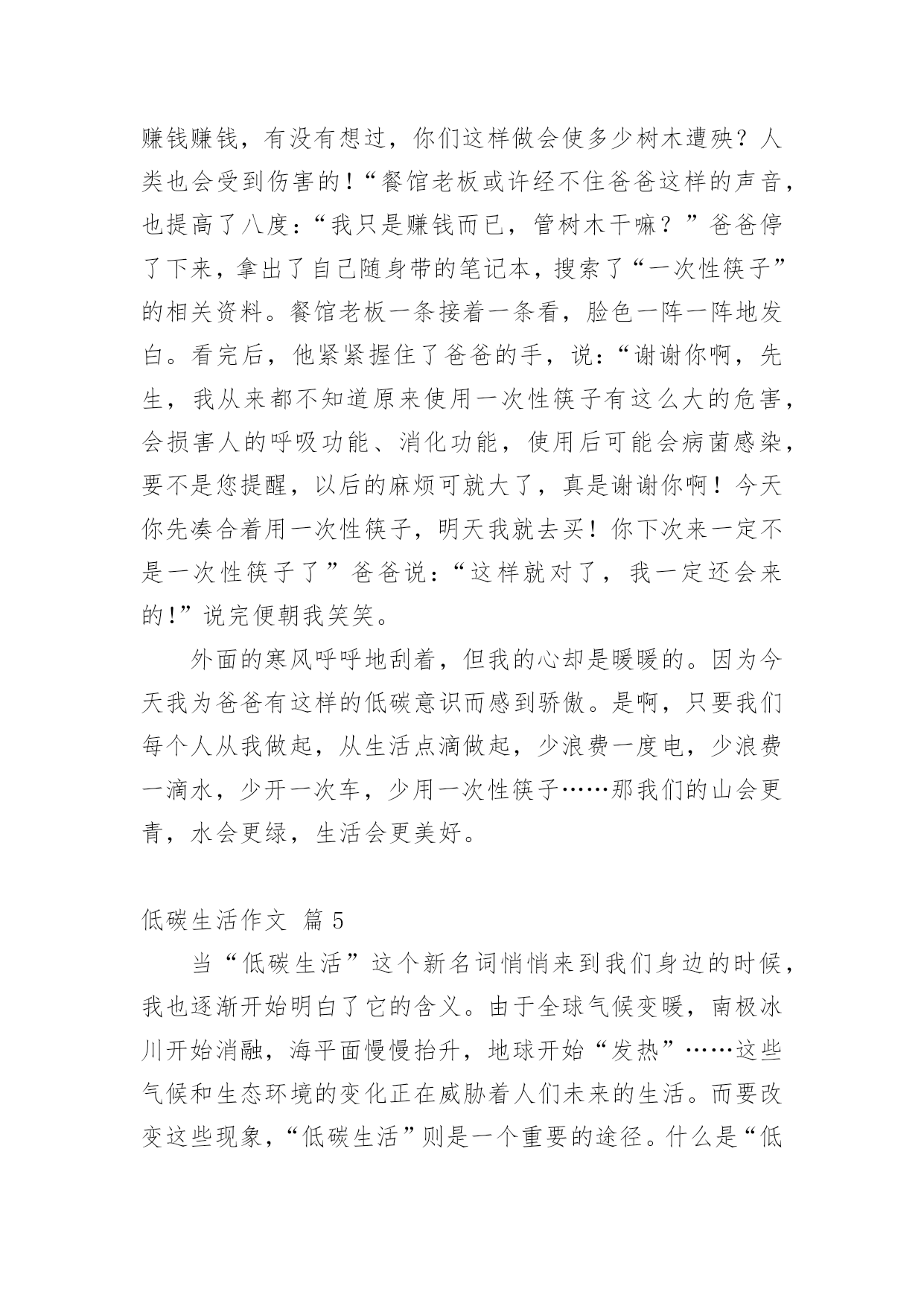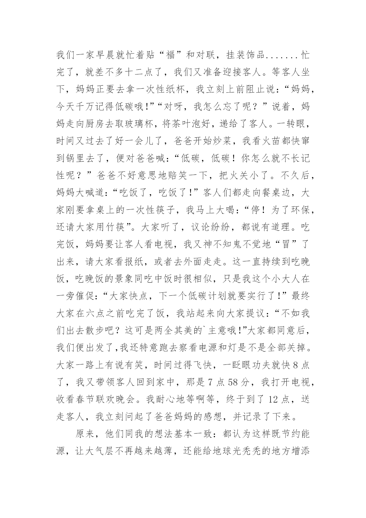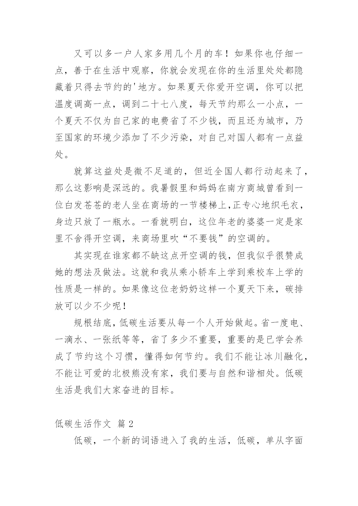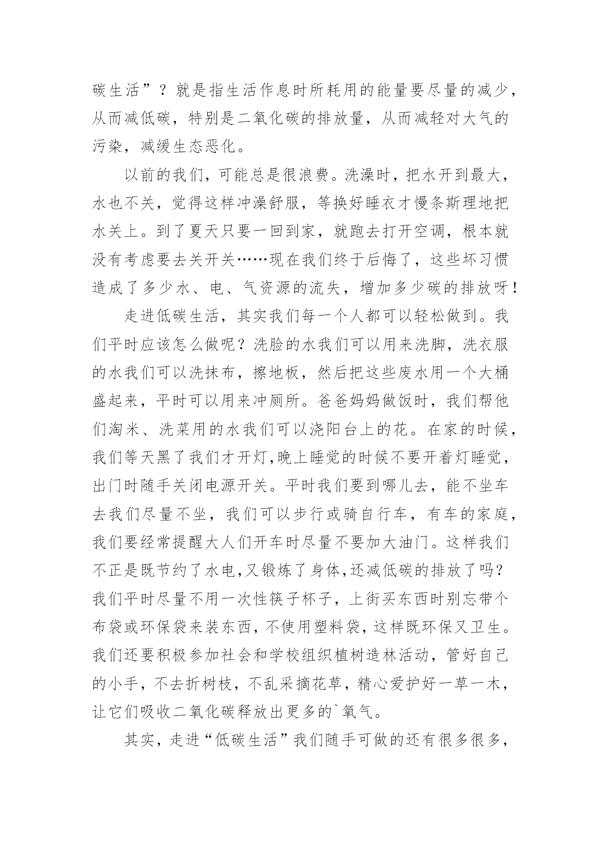 低碳生活作文低碳生活作文14篇(实用)在日常学习、工作和生活中,大家都跟作文打过交道吧,借助作文可以提高我们的语言组织能力。作文的注意事项有许多,你确定会写吗?以下是小编整理的低碳生活作文,欢迎大家分享。低碳生活作文篇1每当我看到上班族们天天挤地铁上班时,心里总有一个想法,为什么他们要挤地铁上班?他们为什么不开车上班?心里却从没有想过乘地铁对环境的好处,对城市的环境有什么好处,对国家的环境有什么好处,甚至对世界有什么好处。“碳”对众人来说都很熟悉,它危害着我们的地球,危害着我们生存的环境,也危害着我们的健康。这么一说,世界上的碳排放要是能少排放一点就是一点,毕竟他对我们来说是有害的,但想让他少排放出来一点,可不是凭口上随便说说的,要有实际行动。其实,在我的生活里,我已为低碳生活付出了一些行动。譬如,我原本小学里每天上下学都由父母专门开车接送,一天碳排放可达数几,就我进了中学后,我改成每天乘校车回家。这既不麻烦我父母每天上下学专门开车接送我,也为低碳生活做了不小的贡献。几十个人每天一起乘一辆车,这一年到头计算下来可节约多少吨汽油啊!可少排放多少碳啊!又可以多一户人家多用几个月的车!如果你也仔细一点,善于在生活中观察,你就会发现在你的生活里处处都隐藏着只得去节约的'地方。如果夏天你爱开空调,你可以把温度调高一点,调到二十七八度,每天节约那么一小点,一个夏天不仅为自己家的电费省了不少钱,而且还为城市,乃至国家的环境少添加了不少污染,对自己对国人都有一点益处。就算这益处是微不足道的,但近全国人都行动起来了,那么这影响是深远的。我暑假里和妈妈在南方商城曾看到一位白发苍苍的老人坐在商场的一节楼梯上,正专心地织毛衣,身边只放了一瓶水。一看就明白,这位年老的婆婆一定是家里不舍得开空调,来商场里吹“不要钱”的空调的。其实现在谁家都不缺这点开空调的钱,但我似乎很赞成她的想法及做法。这就和我从乘小轿车上学到乘校车上学的性质是一样的。如果像这位老奶奶这样一个夏天下来,碳排放可以少不少呢!规根结底,低碳生活要从每一个人开始做起。省一度电、一滴水、一张纸等等,省了多少不重要,重要的是已学会养成了节约这个习惯,懂得如何节约。我们不能让冰川融化,不能让可爱的北极熊没有家,我们要与自然和谐相处。低碳生活是我们大家奋进的目标。低碳生活作文篇2低碳,一个新的词语进入了我的生活,低碳,单从字面上的理解是指较低的温室气体排放。除此之外现在低碳也是环保的代名词,可以延伸到循环利用、节能减排等方面。低碳生活,光说不行,于是我开始“行动”咯!首先要培养全家人的“低碳”意识。我开了一个家庭会议,妈妈正准备把灯都打开,好显得隆重些,我连忙拦住她,把灯“啪啪”关了一大部分,我说:“现在会议开始!会议的内容是打造低碳生活,追求绿色时尚。”大家丈二和尚摸不着脑袋,尤其是妈妈用不解的眼神望着我。然后,我把妈妈的行为说了出来,表明是“污染”,并对妈妈及全家人进行了“思想教育”。大家连忙点头答应加入低碳一族。然后,就全家人开始行动咯!外婆正准备将洗完脸的水倒出厕所,我灵机一动,便大声说:“外婆,水可以循环利用啦!洗完脸的'水可以留下,以便解手后节水冲厕所!”“知道了啦,你这个小精明!”外婆边笑着说边把水倒在一个储水的桶子里。“淘米水不要倒掉了,多可惜。”外婆的声音传来,我闻声赶去,哦,原来是外婆在教育妈妈呀!我忍住笑,仔细听着。“妈,那您说怎么办?”“把淘米水留下来,我用来洗碗。”我一惊,原来还有这么多的“低碳”小窍门。外婆真不愧是“低碳一族”。爸爸正在打印资料,我连忙走过去查看是否符合“低碳”要求。爸爸打印完一面纸,正准备换近的一张纸了,我立刻发同“不合格”处,连忙阻止,爸爸皱了眉头,问:“干什么呀?”我笑着说:“爸爸,这你就不知道了吧。”我顿了顿,把已打印的纸翻了过来,又继续说:“打印的纸两面都要打印哦,节省几面纸就可以避免几棵树木遭到砍伐了。再说20xx年世界环境日的主题是——森林:大自然为您效劳,你是低碳一族的,自然就是环保一族咯!”爸爸吃惊的望着我,马上行动了。当然,我不能光要求他人低碳,自己也要做到,做到多喝白开水,少喝饮料;衣物要重复利用,八成新的又穿不进了,可以送给他人。如果没有人送,即可剪下来做抹布;本子正反面用,草稿本可以先用铝笔做一遍,用完后用橡皮擦擦掉,循环利用。我号召大家都加入“低碳一族”,记住只有一个地球,争做“环保达人”!低碳生活作文篇3以前我对低碳是毫无了解,所以台灯先生总是“整夜未眠”。冰箱伯伯每天都得撑着睡觉。可是,自从学校和各处开始宣传“低碳”,我才意识到错误,于是,我决定把弥补错误和少先队活动相结合,一起完成,时间就定在除夕夜。有了决定后,我设想:除夕夜不使用一次性筷子,不用一次性纸杯喝水,不放鞭炮,除了看“春节联欢晚会”外不看电视。傍晚六点开始