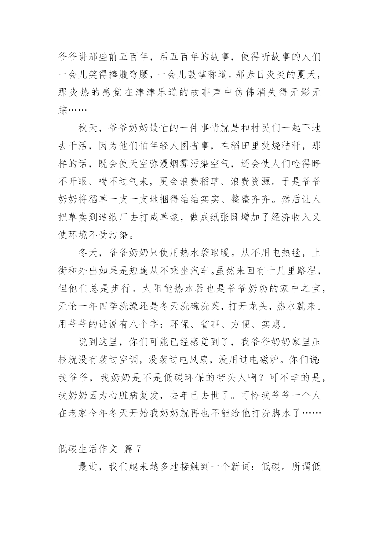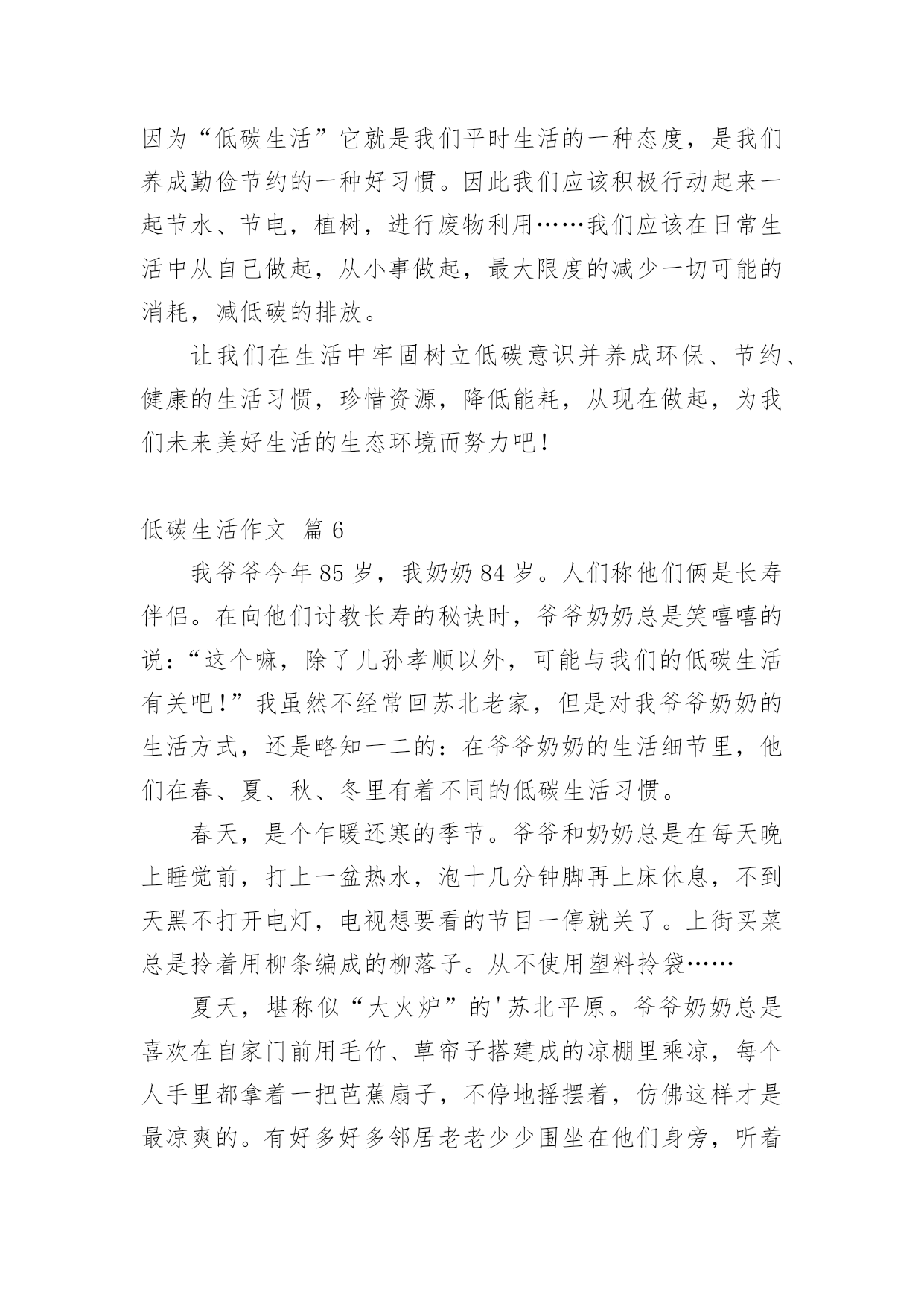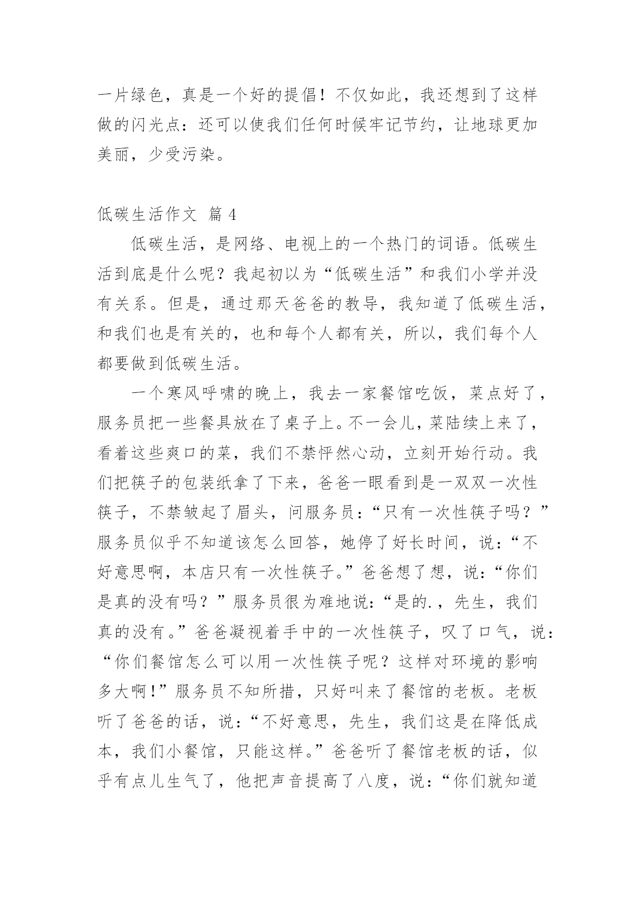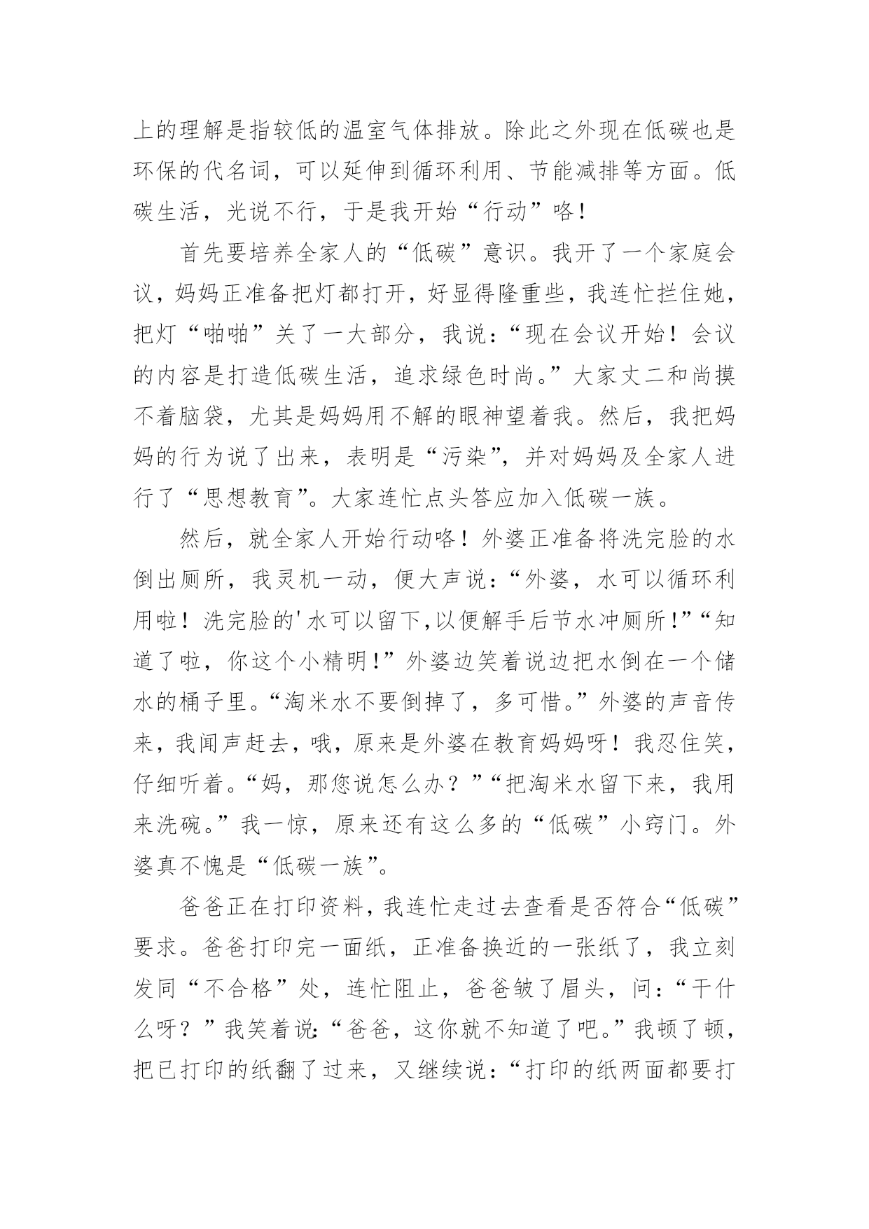 低碳生活作文低碳生活作文14篇(实用)在日常学习、工作和生活中,大家都跟作文打过交道吧,借助作文可以提高我们的语言组织能力。作文的注意事项有许多,你确定会写吗?以下是小编整理的低碳生活作文,欢迎大家分享。低碳生活作文篇1每当我看到上班族们天天挤地铁上班时,心里总有一个想法,为什么他们要挤地铁上班?他们为什么不开车上班?心里却从没有想过乘地铁对环境的好处,对城市的环境有什么好处,对国家的环境有什么好处,甚至对世界有什么好处。“碳”对众人来说都很熟悉,它危害着我们的地球,危害着我们生存的环境,也危害着我们的健康。这么一说,世界上的碳排放要是能少排放一点就是一点,毕竟他对我们来说是有害的,但想让他少排放出来一点,可不是凭口上随便说说的,要有实际行动。其实,在我的生活里,我已为低碳生活付出了一些行动。譬如,我原本小学里每天上下学都由父母专门开车接送,一天碳排放可达数几,就我进了中学后,我改成每天乘校车回家。这既不麻烦我父母每天上下学专门开车接送我,也为低碳生活做了不小的贡献。几十个人每天一起乘一辆车,这一年到头计算下来可节约多少吨汽油啊!可少排放多少碳啊!又可以多一户人家多用几个月的车!如果你也仔细一点,善于在生活中观察,你就会发现在你的生活里处处都隐藏着只得去节约的'地方。如果夏天你爱开空调,你可以把温度调高一点,调到二十七八度,每天节约那么一小点,一个夏天不仅为自己家的电费省了不少钱,而且还为城市,乃至国家的环境少添加了不少污染,对自己对国人都有一点益处。就算这益处是微不足道的,但近全国人都行动起来了,那么这影响是深远的。我暑假里和妈妈在南方商城曾看到一位白发苍苍的老人坐在商场的一节楼梯上,正专心地织毛衣,身边只放了一瓶水。一看就明白,这位年老的婆婆一定是家里不舍得开空调,来商场里吹“不要钱”的空调的。其实现在谁家都不缺这点开空调的钱,但我似乎很赞成她的想法及做法。这就和我从乘小轿车上学到乘校车上学的性质是一样的。如果像这位老奶奶这样一个夏天下来,碳排放可以少不少呢!规根结底,低碳生活要从每一个人开始做起。省一度电、一滴水、一张纸等等,省了多少不重要,重要的是已学会养成了节约这个习惯,懂得如何节约。我们不能让冰川融化,不能让可爱的北极熊没有家,我们要与自然和谐相处。低碳生活是我们大家奋进的目标。低碳生活作文篇2低碳,一个新的词语进入了我的生活,低碳,单从字面上的理解是指较低的温室气体排放。除此之外现在低碳也是环保的代名词,可以延伸到循环利用、节能减排等方面。低碳生活,光说不行,于是我开始“行动”咯!首先要培养全家人的“低碳”意识。我开了一个家庭会议,妈妈正准备把灯都打开,好显得隆重些,我连忙拦住她,把灯“啪啪”关了一大部分,我说:“现在会议开始!会议的内容是打造低碳生活,追求绿色时尚。”大家丈二和尚摸不着脑袋,尤其是妈妈用不解的眼神望着我。然后,我把妈妈的行为说了出来,表明是“污染”,并对妈妈及全家人进行了“思想教育”。大家连忙点头答应加入低碳一族。然后,就全家人开始行动咯!外婆正准备将洗完脸的水倒出厕所,我灵机一动,便大声说:“外婆,水可以循环利用啦!洗完脸的'水可以留下,以便解手后节水冲厕所!”“知道了啦,你这个小精明!”外婆边笑着说边把水倒在一个储水的桶子里。“淘米水不要倒掉了,多可惜。”外婆的声音传来,我闻声赶去,哦,原来是外婆在教育妈妈呀!我忍住笑,仔细听着。“妈,那您说怎么办?”“把淘米水留下来,我用来洗碗。”我一惊,原来还有这么多的“低碳”小窍门。外婆真不愧是“低碳一族”。爸爸正在打印资料,我连忙走过去查看是否符合“低碳”要求。爸爸打印完一面纸,正准备换近的一张纸了,我立刻发同“不合格”处,连忙阻止,爸爸皱了眉头,问:“干什么呀?”我笑着说:“爸爸,这你就不知道了吧。”我顿了顿,把已打印的纸翻了过来,又继续说:“打印的纸两面都要打印哦,节省几面纸就可以避免几棵树木遭到砍伐了。再说20xx年世界环境日的主题是——森林:大自然为您效劳,你是低碳一族的,自然就是环保一族咯!”爸爸吃惊的望着我,马上行动了。当然,我不能光要求他人低碳,自己也要做到,做到多喝白开水,少喝饮料;衣物要重复利用,八成新的又穿不进了,可以送给他人。如果没有人送,即可剪下来做抹布;本子正反面用,草稿本可以先用铝笔做一遍,用完后用橡皮擦擦掉,循环利用。我号召大家都加入“低碳一族”,记住只有一个地球,争做“环保达人”!低碳生活作文篇3以前我对低碳是毫无了解,所以台灯先生总是“整夜未眠”。冰箱伯伯每天都得撑着睡觉。可是,自从学校和各处开始宣传“低碳”,我才意识到错误,于是,我决定把弥补错误和少先队活动相结合,一起完成,时间就定在除夕夜。有了决定后,我设想:除夕夜不使用一次性筷子,不用一次性纸杯喝水,不放鞭炮,除了看“春节联欢晚会”外不看电视。傍晚六点开始