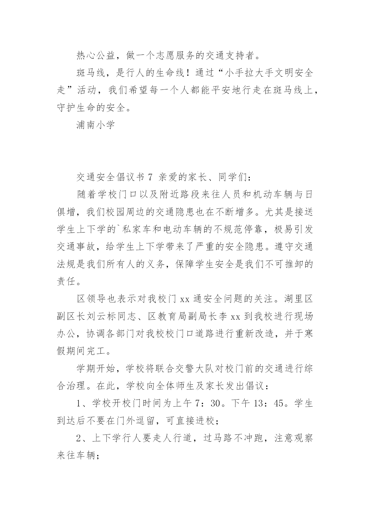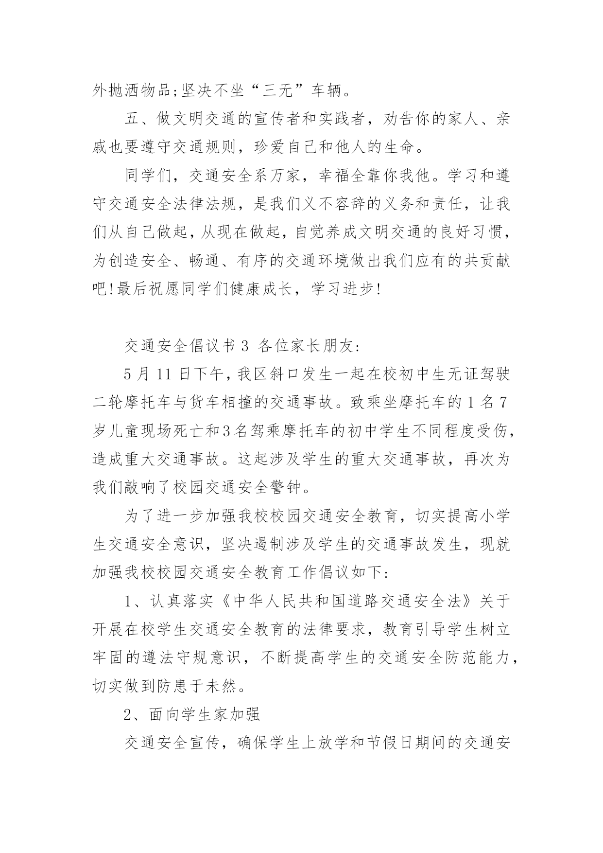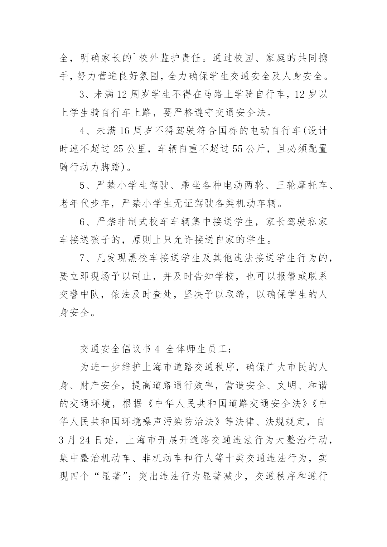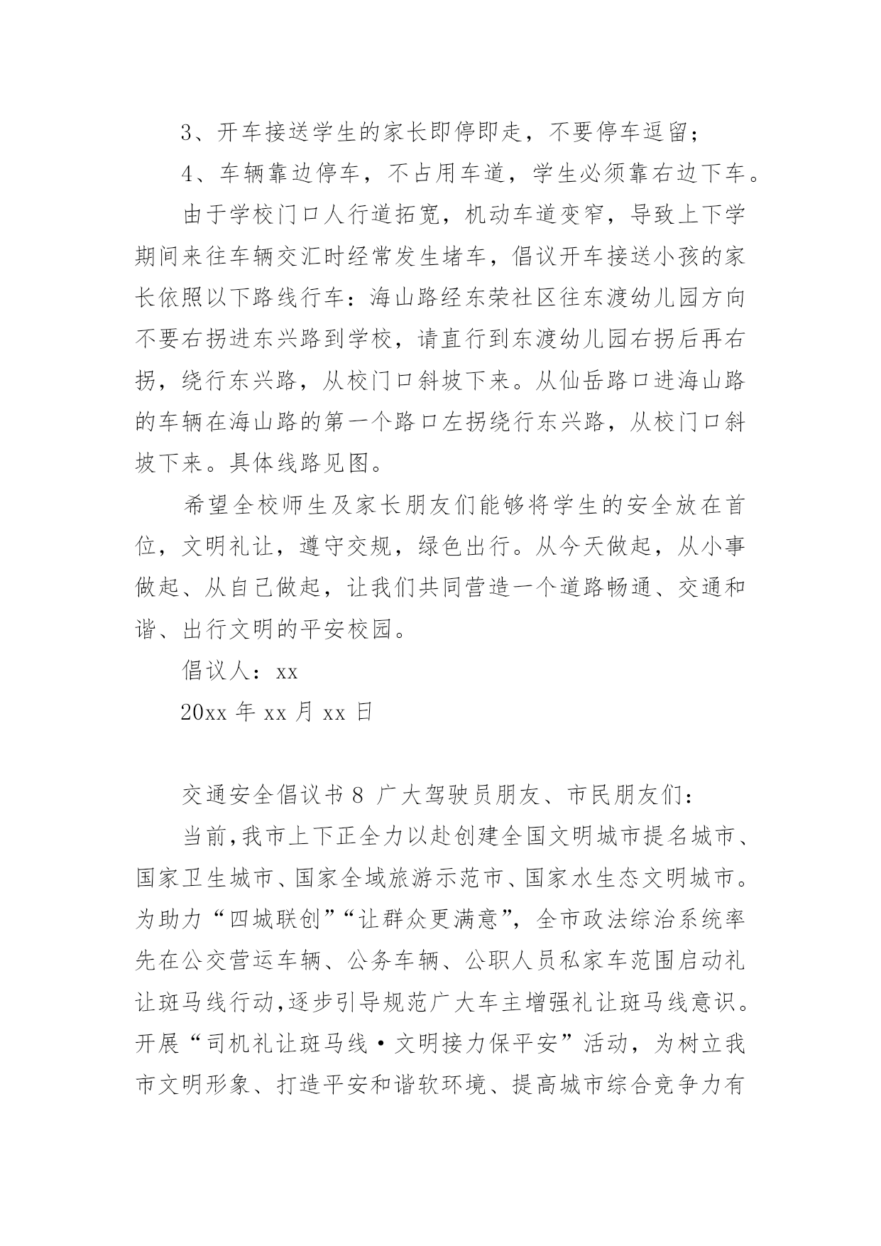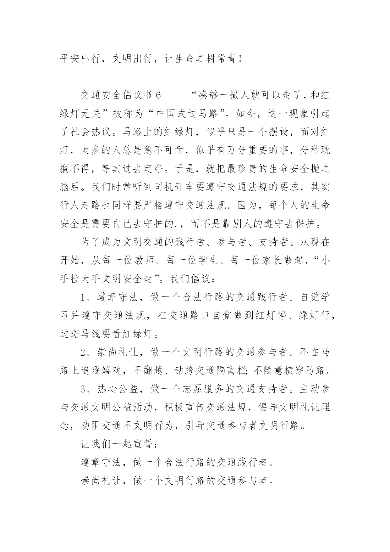 交通安全倡议书关于交通安全倡议书(通用20篇)在当今社会生活中,需要使用倡议书的场合越来越多,在写作上,倡议书有一定的书写规范。那么一般倡议书是怎么写的呢?下面是小编整理的关于交通安全倡议书,仅供参考,欢迎大家阅读。交通安全倡议书1同学们:20xx年全国共发生交通安全事故378781起,造成89455人死亡,其中有近3万名儿童在交通事故中受伤。俗话说:“没有规矩不成方圆”。遵守交通规则是我们应尽的责任和义务。一、认真学习、宣传和自觉遵守交通安全法律法规,增强社会公德意识和交通安全意识,树立文明交通新风。二、文明走路。不要在班马上拥挤前行,要按照线路直行。三、文明骑车。未满12周岁的不准骑自行车;未满16周岁的`不准骑电动车。做到不闯红灯,不走快车道,不扶身并行、猛拐、互相追逐;不牵引、攀扶车辆,不双手离把;骑自行车横过机动车道时,应下车推行;不骑车带人,不违章载物;不打伞骑车;步行或骑自行车过马路时要做到“一停、二看、三通过”。同学们,平平安安出门,快快乐乐回家。倡议人:时间:交通安全倡议书2亲爱的同学们:在社会高速发展,交通面貌日新月异,交通路网四通八达,交通车辆川流不息的今天,道路交通安全对于我们每个人来说都尤为重要。为了增强同学们的交通安全意识、交通法制意识、交通文明意识和自我保护能力,共同营造文明、和谐的交通环境,为了你我的生命安全,六一班全体同学向全区的青少年朋友们提出以下几点倡议:一、认真学习、宣传和自觉遵守交通安全法律法规,增强社会公德意识和交通安全意识,树立文明交通新风。二、文明走路:必须在人行道行走,没有人行道的道路要在行走。不闯红灯,不三五成群并肩走,不在马路上追逐打闹嬉戏、使用滑板、旱冰鞋,不要穿越、倚坐在马路边的护栏、花台上,特别在路口,不要急拐猛跑。不准在道路上扒车、追车、强行拦车和抛物击车。三、文明骑车:做到不闯红灯,不走快车道,不扶身并行、猛拐、互相追逐、不牵引、攀扶车辆,不双手离把;步行或骑自行车过马路时要做到“一停、二看、三通过。”四、文明乘车:坐家长的摩托车请戴好头盔;请在站台等候公交车,坐到车辆停稳后有序上下车,遵守“前门上车,后门下车”的'规则,不将身体任何部位伸出车外,不向车外抛洒物品;坚决不坐“三无”车辆。五、做文明交通的宣传者和实践者,劝告你的家人、亲戚也要遵守交通规则,珍爱自己和他人的生命。同学们,交通安全系万家,幸福全靠你我他。学习和遵守交通安全法律法规,是我们义不容辞的义务和责任,让我们从自己做起,从现在做起,自觉养成文明交通的良好习惯,为创造安全、畅通、有序的交通环境做出我们应有的共贡献吧!最后祝愿同学们健康成长,学习进步!交通安全倡议书3各位家长朋友:5月11日下午,我区斜口发生一起在校初中生无证驾驶二轮摩托车与货车相撞的交通事故。致乘坐摩托车的1名7岁儿童现场死亡和3名驾乘摩托车的初中学生不同程度受伤,造成重大交通事故。这起涉及学生的重大交通事故,再次为我们敲响了校园交通安全警钟。为了进一步加强我校校园交通安全教育,切实提高小学生交通安全意识,坚决遏制涉及学生的交通事故发生,现就加强我校校园交通安全教育工作倡议如下:1、认真落实《中华人民共和国道路交通安全法》关于开展在校学生交通安全教育的法律要求,教育引导学生树立牢固的遵法守规意识,不断提高学生的交通安全防范能力,切实做到防患于未然。2、面向学生家加强交通安全宣传,确保学生上放学和节假日期间的交通安全,明确家长的`校外监护责任。通过校园、家庭的共同携手,努力营造良好氛围,全力确保学生交通安全及人身安全。3、未满12周岁学生不得在马路上学骑自行车,12岁以上学生骑自行车上路,要严格遵守交通安全法。4、未满16周岁不得驾驶符合国标的电动自行车(设计时速不超过25公里,车辆自重不超过55公斤,且必须配置骑行动力脚踏)。5、严禁小学生驾驶、乘坐各种电动两轮、三轮摩托车、老年代步车,严禁小学生无证驾驶各类机动车辆。6、严禁非制式校车车辆集中接送学生,家长驾驶私家车接送孩子的,原则上只允许接送自家的学生。7、凡发现黑校车接送学生及其他违法接送学生行为的,要立即现场予以制止,并及时告知学校,也可以报警或联系交警中队,依法及时查处,坚决予以取缔,以确保学生的人身安全。交通安全倡议书4全体师生员工:为进一步维护上海市道路交通秩序,确保广大市民的人身、财产安全,提高道路通行效率,营造安全、文明、和谐的交通环境,根据《中华人民共和国道路交通安全法》《中华人民共和国环境噪声污染防治法》等法律、法规规定,自3月24日始,上海市开展开道路交通违法行为大整治行动,集中整治机动车、非机动车和行人等十类交通违法行为,实现四个“显著”:突出违法行为显著减少,交通秩序和通行能力显著改观,交通基础设施显著优化,交通参与者尊法守法意识显箸提升。随着社会进步