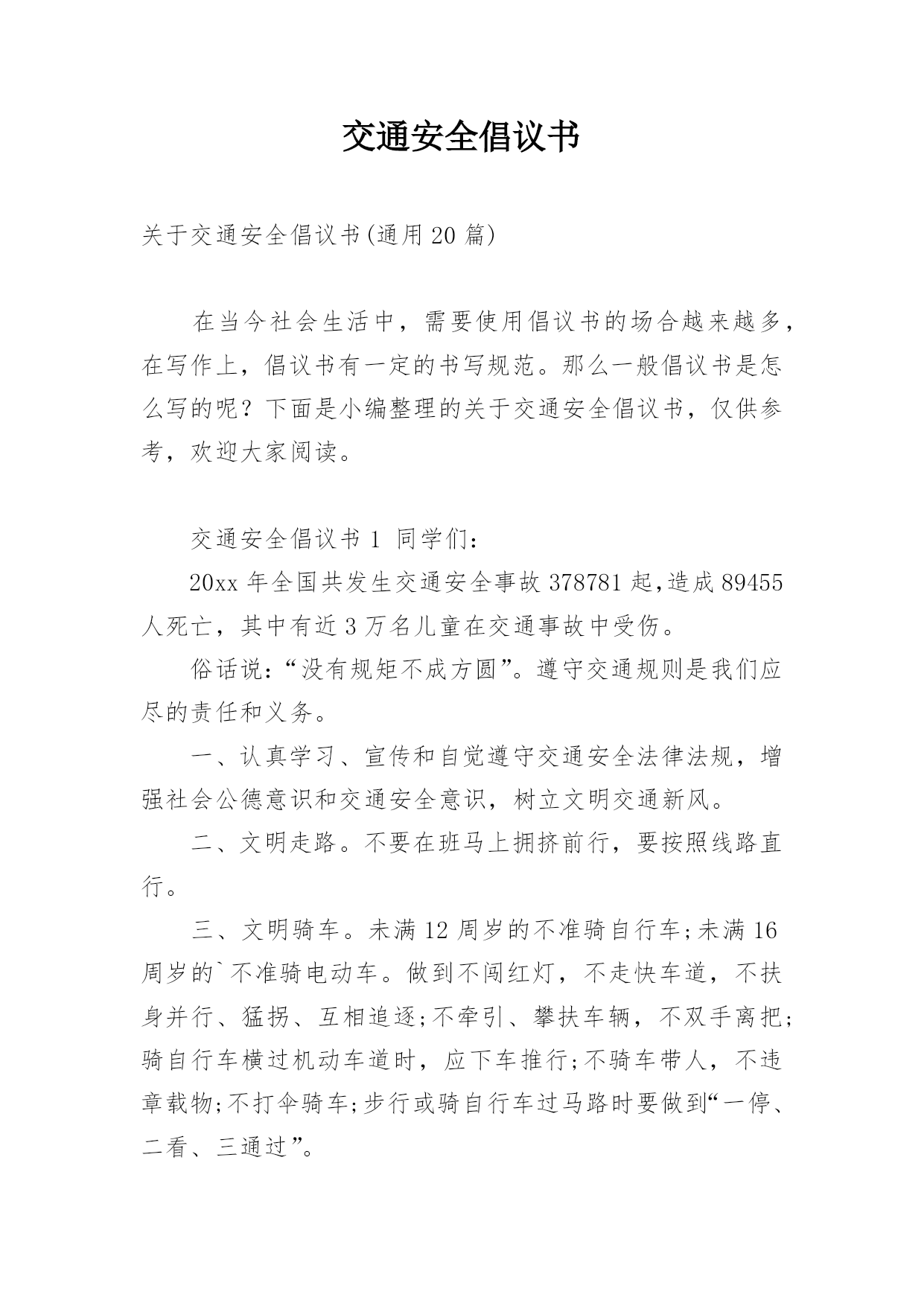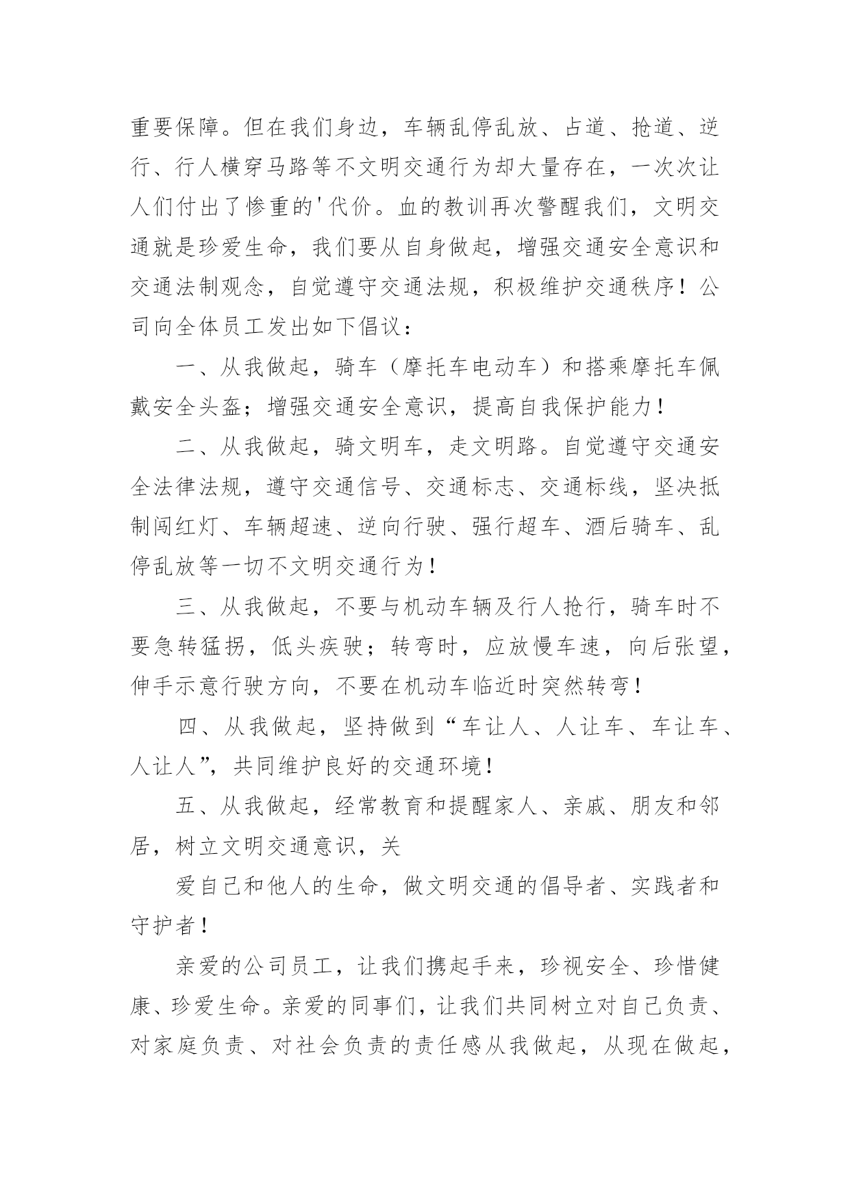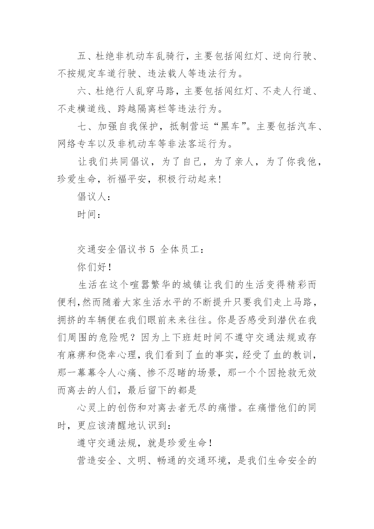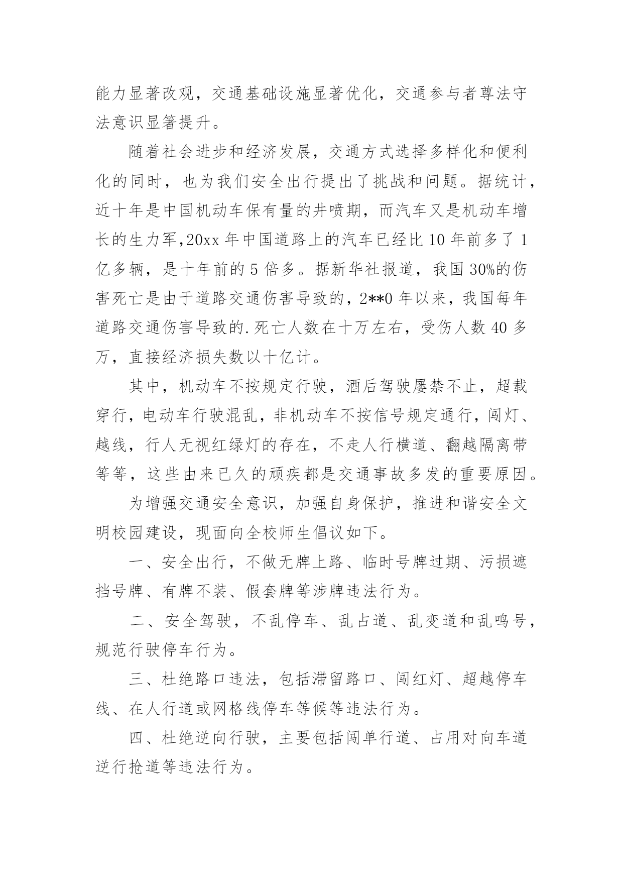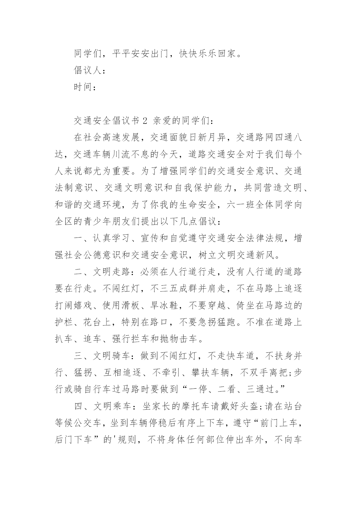 交通安全倡议书关于交通安全倡议书(通用20篇)在当今社会生活中,需要使用倡议书的场合越来越多,在写作上,倡议书有一定的书写规范。那么一般倡议书是怎么写的呢?下面是小编整理的关于交通安全倡议书,仅供参考,欢迎大家阅读。交通安全倡议书1同学们:20xx年全国共发生交通安全事故378781起,造成89455人死亡,其中有近3万名儿童在交通事故中受伤。俗话说:“没有规矩不成方圆”。遵守交通规则是我们应尽的责任和义务。一、认真学习、宣传和自觉遵守交通安全法律法规,增强社会公德意识和交通安全意识,树立文明交通新风。二、文明走路。不要在班马上拥挤前行,要按照线路直行。三、文明骑车。未满12周岁的不准骑自行车;未满16周岁的`不准骑电动车。做到不闯红灯,不走快车道,不扶身并行、猛拐、互相追逐;不牵引、攀扶车辆,不双手离把;骑自行车横过机动车道时,应下车推行;不骑车带人,不违章载物;不打伞骑车;步行或骑自行车过马路时要做到“一停、二看、三通过”。同学们,平平安安出门,快快乐乐回家。倡议人:时间:交通安全倡议书2亲爱的同学们:在社会高速发展,交通面貌日新月异,交通路网四通八达,交通车辆川流不息的今天,道路交通安全对于我们每个人来说都尤为重要。为了增强同学们的交通安全意识、交通法制意识、交通文明意识和自我保护能力,共同营造文明、和谐的交通环境,为了你我的生命安全,六一班全体同学向全区的青少年朋友们提出以下几点倡议:一、认真学习、宣传和自觉遵守交通安全法律法规,增强社会公德意识和交通安全意识,树立文明交通新风。二、文明走路:必须在人行道行走,没有人行道的道路要在行走。不闯红灯,不三五成群并肩走,不在马路上追逐打闹嬉戏、使用滑板、旱冰鞋,不要穿越、倚坐在马路边的护栏、花台上,特别在路口,不要急拐猛跑。不准在道路上扒车、追车、强行拦车和抛物击车。三、文明骑车:做到不闯红灯,不走快车道,不扶身并行、猛拐、互相追逐、不牵引、攀扶车辆,不双手离把;步行或骑自行车过马路时要做到“一停、二看、三通过。”四、文明乘车:坐家长的摩托车请戴好头盔;请在站台等候公交车,坐到车辆停稳后有序上下车,遵守“前门上车,后门下车”的'规则,不将身体任何部位伸出车外,不向车外抛洒物品;坚决不坐“三无”车辆。五、做文明交通的宣传者和实践者,劝告你的家人、亲戚也要遵守交通规则,珍爱自己和他人的生命。同学们,交通安全系万家,幸福全靠你我他。学习和遵守交通安全法律法规,是我们义不容辞的义务和责任,让我们从自己做起,从现在做起,自觉养成文明交通的良好习惯,为创造安全、畅通、有序的交通环境做出我们应有的共贡献吧!最后祝愿同学们健康成长,学习进步!交通安全倡议书3各位家长朋友:5月11日下午,我区斜口发生一起在校初中生无证驾驶二轮摩托车与货车相撞的交通事故。致乘坐摩托车的1名7岁儿童现场死亡和3名驾乘摩托车的初中学生不同程度受伤,造成重大交通事故。这起涉及学生的重大交通事故,再次为我们敲响了校园交通安全警钟。为了进一步加强我校校园交通安全教育,切实提高小学生交通安全意识,坚决遏制涉及学生的交通事故发生,现就加强我校校园交通安全教育工作倡议如下:1、认真落实《中华人民共和国道路交通安全法》关于开展在校学生交通安全教育的法律要求,教育引导学生树立牢固的遵法守规意识,不断提高学生的交通安全防范能力,切实做到防患于未然。2、面向学生家加强交通安全宣传,确保学生上放学和节假日期间的交通安全,明确家长的`校外监护责任。通过校园、家庭的共同携手,努力营造良好氛围,全力确保学生交通安全及人身安全。3、未满12周岁学生不得在马路上学骑自行车,12岁以上学生骑自行车上路,要严格遵守交通安全法。4、未满16周岁不得驾驶符合国标的电动自行车(设计时速不超过25公里,车辆自重不超过55公斤,且必须配置骑行动力脚踏)。5、严禁小学生驾驶、乘坐各种电动两轮、三轮摩托车、老年代步车,严禁小学生无证驾驶各类机动车辆。6、严禁非制式校车车辆集中接送学生,家长驾驶私家车接送孩子的,原则上只允许接送自家的学生。7、凡发现黑校车接送学生及其他违法接送学生行为的,要立即现场予以制止,并及时告知学校,也可以报警或联系交警中队,依法及时查处,坚决予以取缔,以确保学生的人身安全。交通安全倡议书4全体师生员工:为进一步维护上海市道路交通秩序,确保广大市民的人身、财产安全,提高道路通行效率,营造安全、文明、和谐的交通环境,根据《中华人民共和国道路交通安全法》《中华人民共和国环境噪声污染防治法》等法律、法规规定,自3月24日始,上海市开展开道路交通违法行为大整治行动,集中整治机动车、非机动车和行人等十类交通违法行为,实现四个“显著”:突出违法行为显著减少,交通秩序和通行能力显著改观,交通基础设施显著优化,交通参与者尊法守法意识显箸提升。随着社会进步