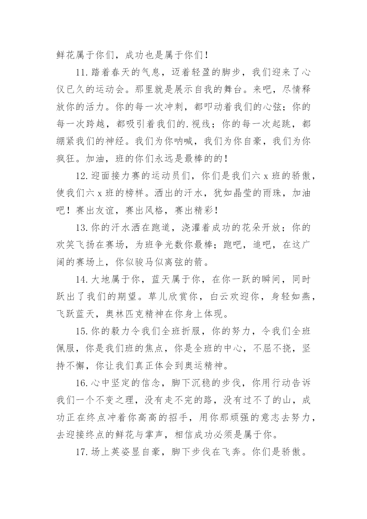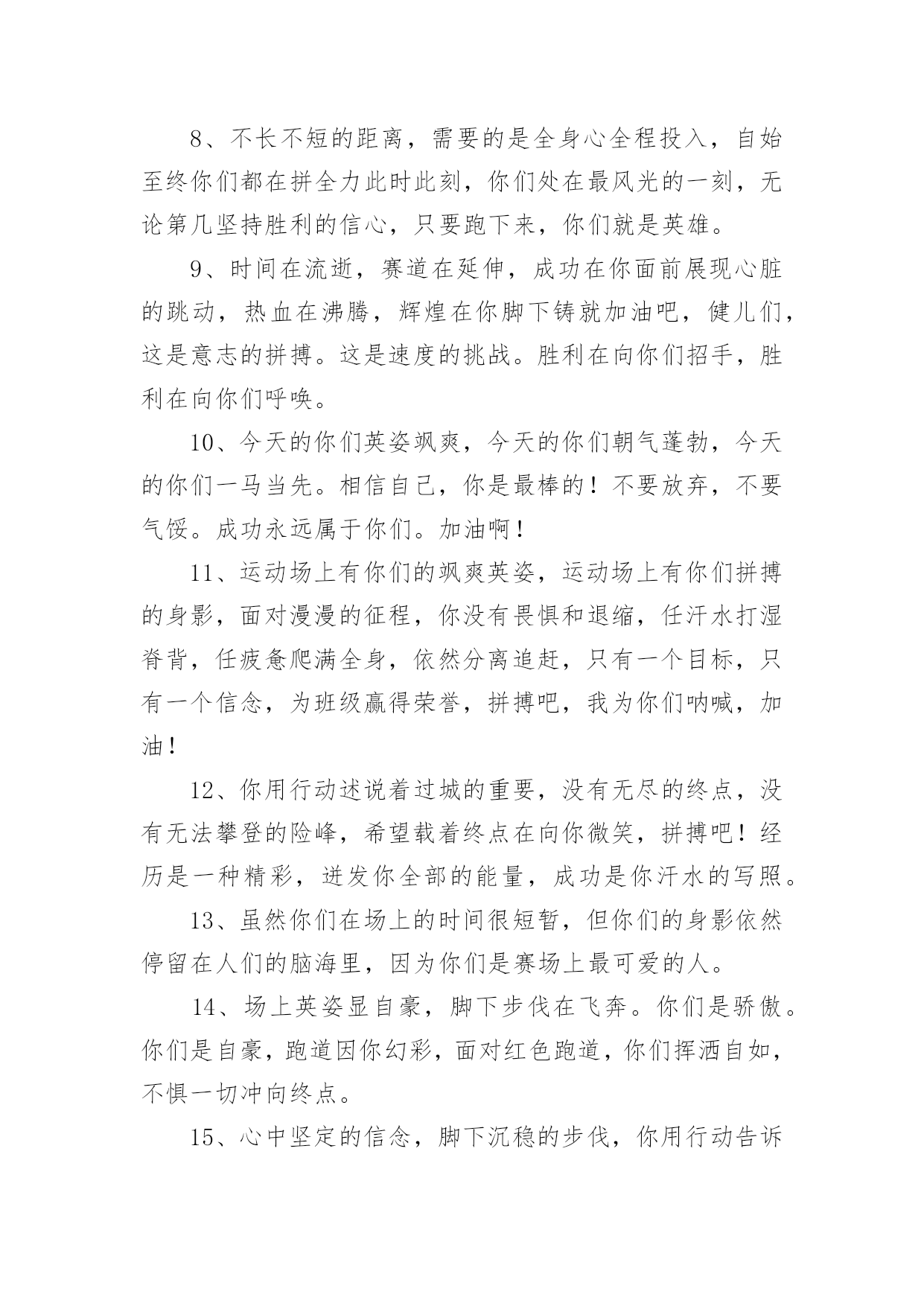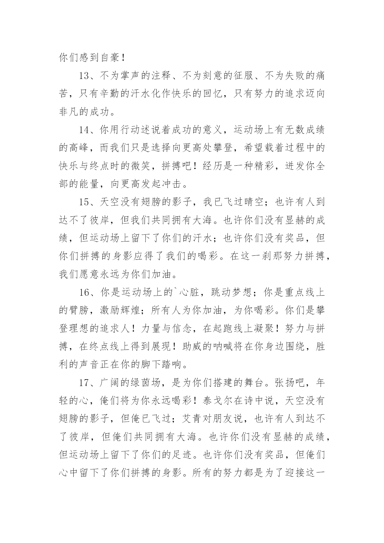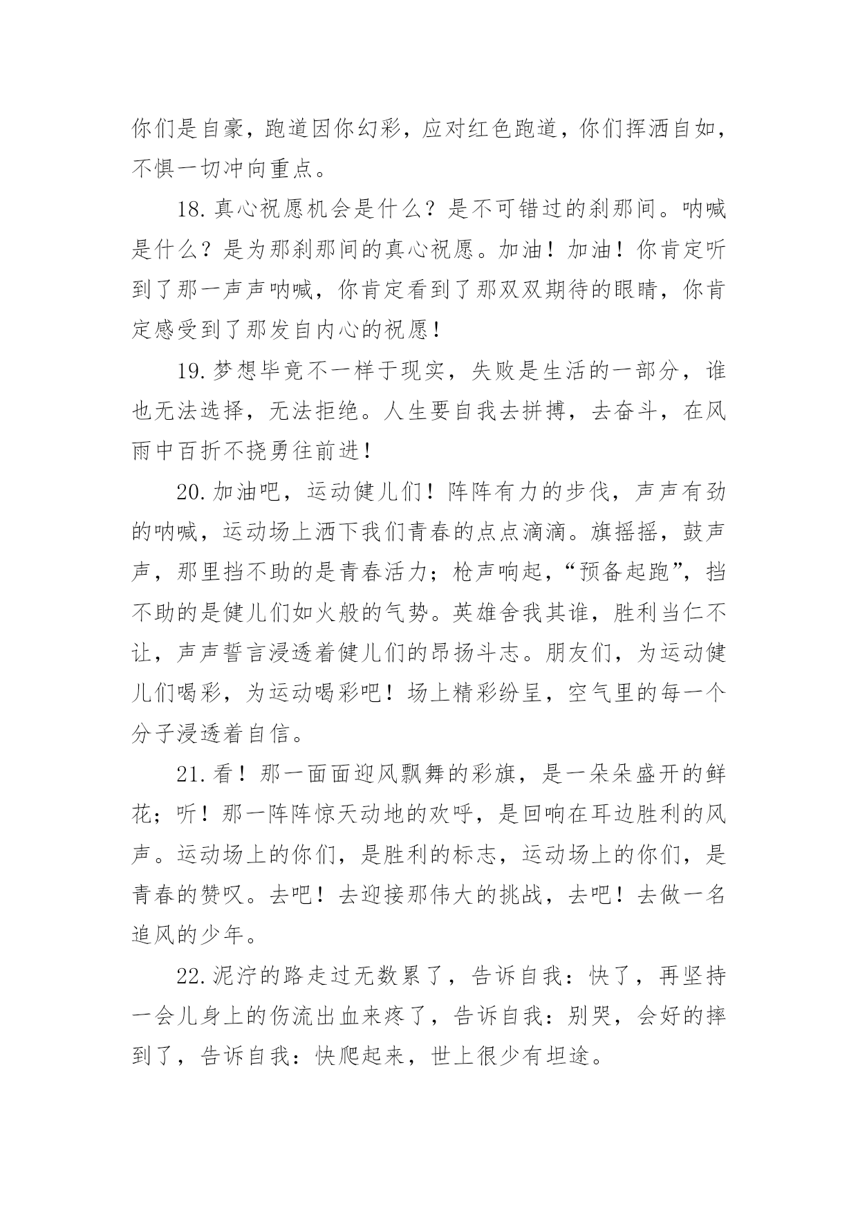 运动会加油稿运动会加油稿经典【15篇】在社会一步步向前发展的今天,我们使用上加油稿的情况与日俱增,借助加油稿可以表达对对方的鼓励和支持。相信很多朋友都对写加油稿感到非常苦恼吧,以下是小编整理的运动会加油稿,仅供参考,希望能够帮助到大家。运动会加油稿11、广阔的绿茵场,是为你们搭建的舞台。张扬吧,年轻的心,我们将为你永远喝彩!2、泰戈尔在诗中说,天空没有翅膀的影子,但我已飞过;艾青对朋友说,也许有人到达不了彼岸,但我们共同拥有大海。也许你们没有显赫的成绩,但运动场上留下了你们的足迹。也许你们没有奖品,但我们心中留下了你们拼搏的身影。所有的努力都是为了迎接这一刹那,所有的拼搏都是为了这一声令下。3、就像花儿准备了春、秋、冬,就是为了红透整个盛夏。就像雪花经历了春、夏、秋就是为了洁白整个严冬。蹲下,昂首,出发……轻轻的一抬脚,便牵动了全场的目光潇洒的迫挥挥手,便满足了那一份无言的等待。迎着朝阳,你们踏歌而去,背着希望,我们等待你们的归来。4、也许流星并不少见,但它燃烧的刹那,留给人间最美丽的回忆!也许笑脸并不少见,但胜利的喜悦,总会留给世界精彩的一瞬!是的,那些曾经美妙的东西只有短短的一瞬间,但那却把最辉煌的一刻留给了人间。胜利,是每个人所追求的,胜利的喜悦,是胜利与重新开始的转折,胜利是新的开始!5、不长不短的距离,需要的是全身心全程投入,自始至终你们都在拼全力此时此刻,你们处在最风光的一刻,无论第几坚持胜利的信心,只要跑下来,你们就是英雄。6、时间在流逝,赛道在延伸,成功在你面前展现心脏的跳动,热血在沸腾,辉煌在你脚下铸就加油吧,健儿们。7、这是意志的拼搏。这是速度的挑战。胜利在向你们招手/胜利在向你们呼唤。8、不为鲜花的围绕,不为刹那的荣耀,只有执着的信念,化作不停的奔跑,心中燃烧着梦想,脚下不停的步伐。9、你用行动述说着过城的重要,没有无尽的终点,没有无法攀登的险峰,希望载着终点在向你微笑,拼搏吧!经历是一种精彩,迸发你全部的能量,成功是你汗水的写照。10、虽然你们在场上的时间很短暂,但你们的身影依然停留在人们的脑海里,因为你们是赛场上最可爱的人。11、不为掌声的注释不为刻意的征服不为失败的痛苦只有辛勤的汗水化作成功的脚步。12、超越对手,更要超越自我,追求卓越是我们的目标,是我们的信念,在清爽的秋季,在喧嚣的赛场,你们点燃了似火的热情,无论成败,你们永远是我们的骄傲,我们都为你们感到自豪!13、不为掌声的注释、不为刻意的征服、不为失败的痛苦,只有辛勤的汗水化作快乐的回忆,只有努力的追求迈向非凡的成功。14、你用行动述说着成功的意义,运动场上有无数成绩的高峰,而我们只是选择向更高处攀登,希望载着过程中的快乐与终点时的微笑,拼搏吧!经历是一种精彩,迸发你全部的能量,向更高发起冲击。15、天空没有翅膀的影子,我已飞过晴空;也许有人到达不了彼岸,但我们共同拥有大海。也许你们没有显赫的成绩,但运动场上留下了你们的汗水;也许你们没有奖品,但你们拼搏的身影应得了我们的喝彩。在这一刹那努力拼搏,我们愿意永远为你们加油。16、你是运动场上的`心脏,跳动梦想;你是重点线上的臂膀,激励辉煌;所有人为你加油,为你喝彩。你们是攀登理想的追求人!力量与信念,在起跑线上凝聚!努力与拼搏,在终点线上得到展现!助威的呐喊将在你身边围绕,胜利的声音正在你的脚下踏响。17、广阔的绿茵场,是为你们搭建的舞台。张扬吧,年轻的心,俺们将为你永远喝彩!泰戈尔在诗中说,天空没有翅膀的影子,但俺已飞过;艾青对朋友说,也许有人到达不了彼岸,但俺们共同拥有大海。也许你们没有显赫的成绩,但运动场上留下了你们的足迹。也许你们没有奖品,但俺们心中留下了你们拼搏的身影。所有的努力都是为了迎接这一刹那,所有的拼搏都是为了这一声令下。18、有多少次挥汗如雨,伤痛曾添满记忆,只因为始终相信,去拼搏才能胜利。总在鼓舞自己,要成功就得努力。热血在赛场沸腾,巨人在赛场升起。相信自己,你将赢得胜利,创造奇迹;相信自己,梦想在你手中,这是你的天地。当一切过去,你们将是第一。相信自己,你们将超越极限,超越自己!相信自己,加油吧,健儿们,相信你自己。19、年轻的、我们自信飞扬,青春的气息如同出生的朝阳,蓬勃的力量如同阳光的挥洒。此时此刻,跑道便是我们精彩的舞台,声声加油便是我们最高的奖项!论何成功,谈何荣辱,心中的信念只有一个:拼搏!运动会加油稿21、温暖的阳光洒在赛场上,男子乙组标枪的比赛即将开始。赛场上,一道道优美的弧线将轻盈地划过天空。健儿们用手中的标枪向距离的权限发起一轮又一轮的挑战。标枪在空中轻盈的姿态,是健儿们强健的力量和熟练的技巧的结合。谁能在这场激烈的竞争中获胜?让我们拭目以待,让我们为他们呐喊、助威吧!只有将力量与技巧合二为一的人,才能获得胜利的桂冠!2、有多少次挥汗如雨,伤痛曾添