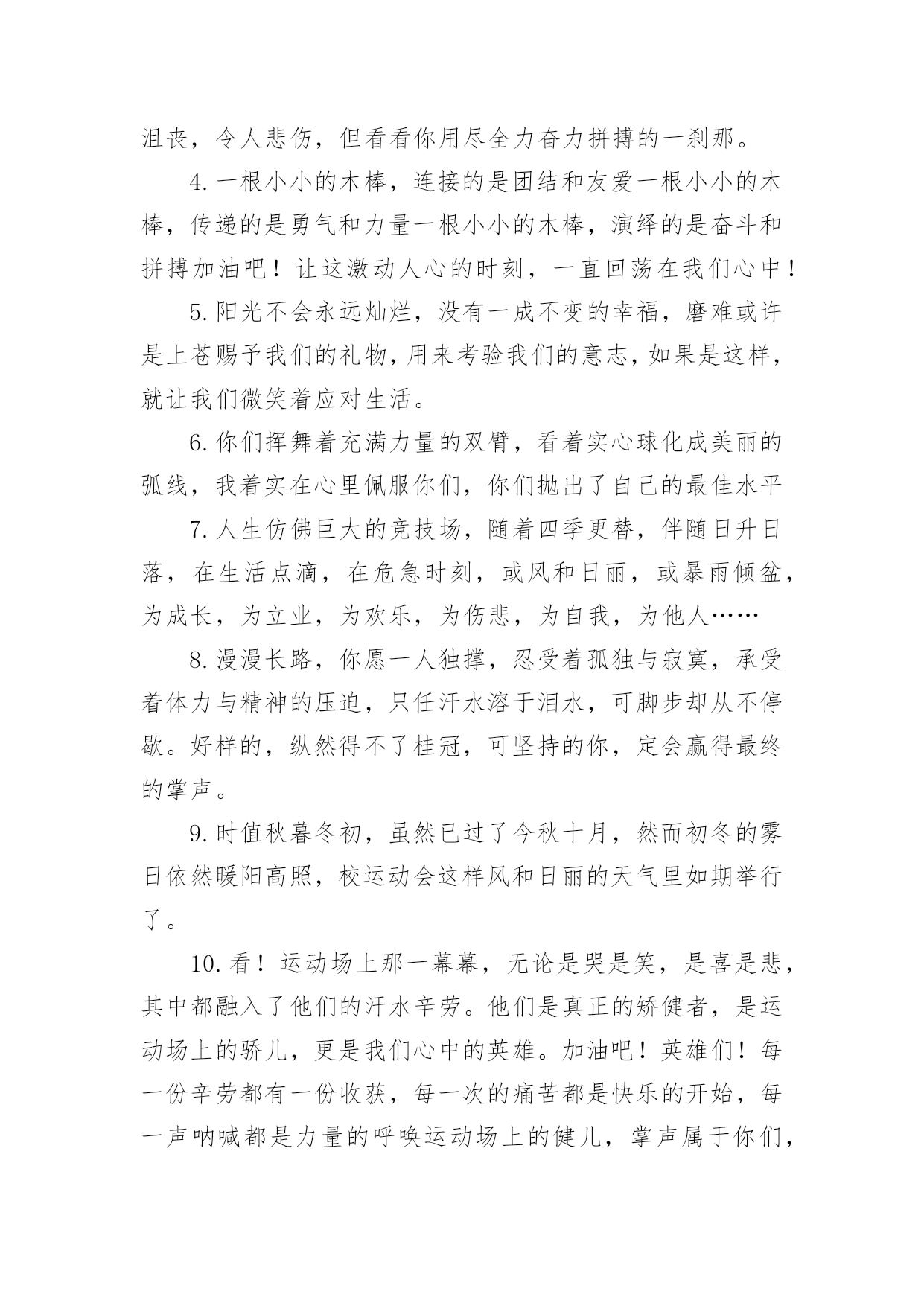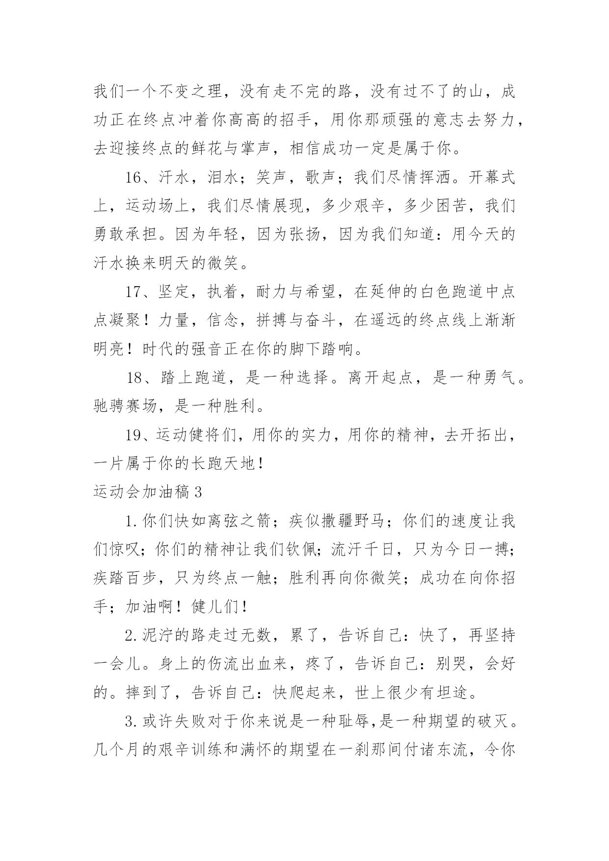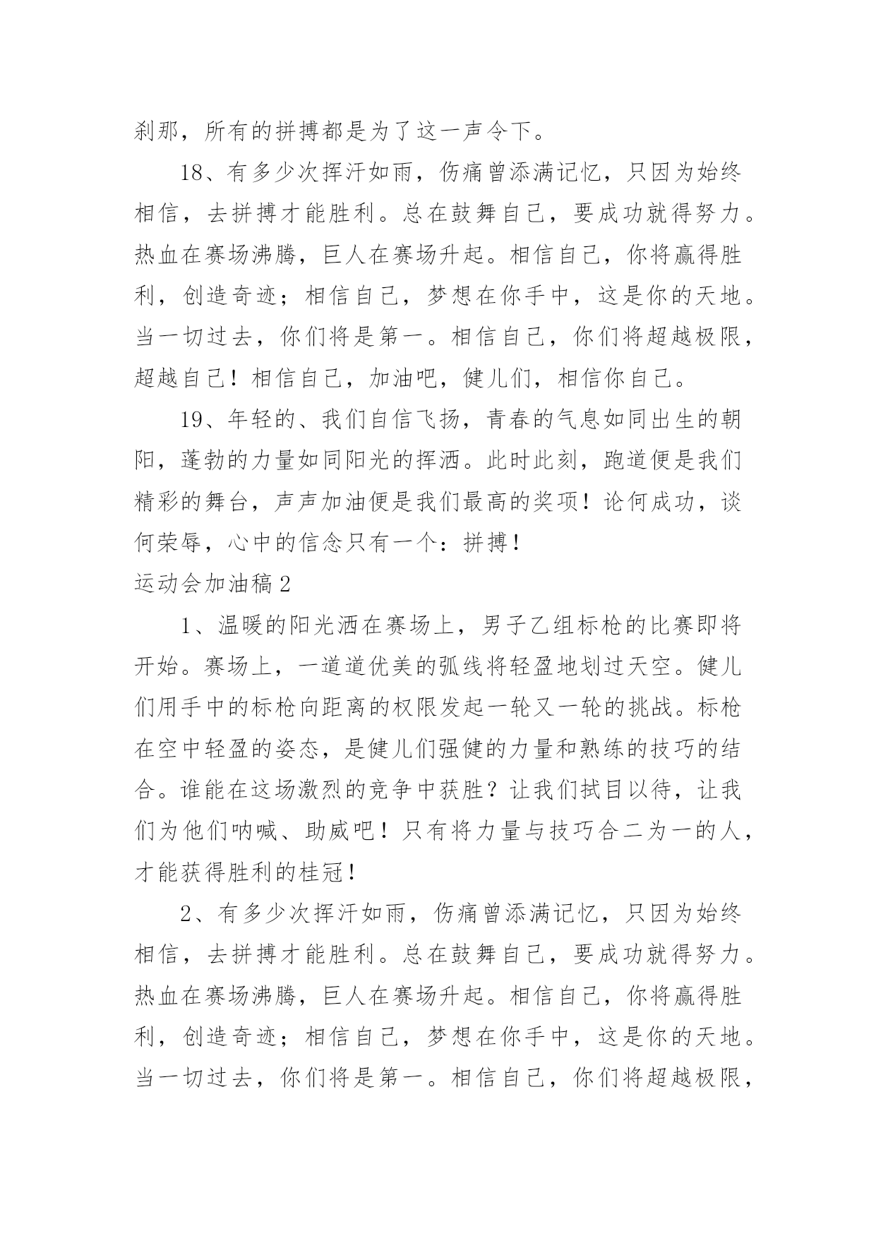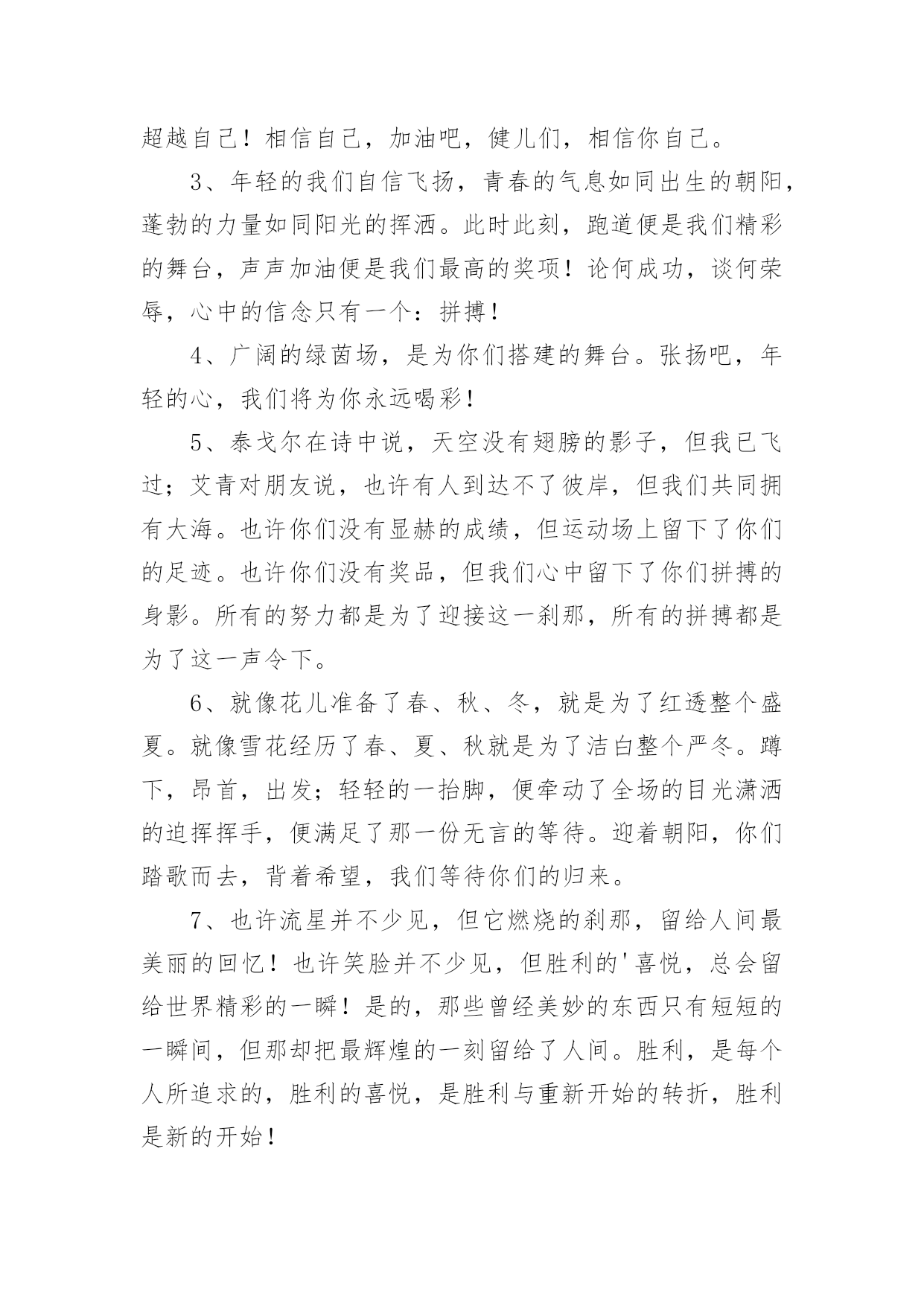 运动会加油稿运动会加油稿经典【15篇】在社会一步步向前发展的今天,我们使用上加油稿的情况与日俱增,借助加油稿可以表达对对方的鼓励和支持。相信很多朋友都对写加油稿感到非常苦恼吧,以下是小编整理的运动会加油稿,仅供参考,希望能够帮助到大家。运动会加油稿11、广阔的绿茵场,是为你们搭建的舞台。张扬吧,年轻的心,我们将为你永远喝彩!2、泰戈尔在诗中说,天空没有翅膀的影子,但我已飞过;艾青对朋友说,也许有人到达不了彼岸,但我们共同拥有大海。也许你们没有显赫的成绩,但运动场上留下了你们的足迹。也许你们没有奖品,但我们心中留下了你们拼搏的身影。所有的努力都是为了迎接这一刹那,所有的拼搏都是为了这一声令下。3、就像花儿准备了春、秋、冬,就是为了红透整个盛夏。就像雪花经历了春、夏、秋就是为了洁白整个严冬。蹲下,昂首,出发……轻轻的一抬脚,便牵动了全场的目光潇洒的迫挥挥手,便满足了那一份无言的等待。迎着朝阳,你们踏歌而去,背着希望,我们等待你们的归来。4、也许流星并不少见,但它燃烧的刹那,留给人间最美丽的回忆!也许笑脸并不少见,但胜利的喜悦,总会留给世界精彩的一瞬!是的,那些曾经美妙的东西只有短短的一瞬间,但那却把最辉煌的一刻留给了人间。胜利,是每个人所追求的,胜利的喜悦,是胜利与重新开始的转折,胜利是新的开始!5、不长不短的距离,需要的是全身心全程投入,自始至终你们都在拼全力此时此刻,你们处在最风光的一刻,无论第几坚持胜利的信心,只要跑下来,你们就是英雄。6、时间在流逝,赛道在延伸,成功在你面前展现心脏的跳动,热血在沸腾,辉煌在你脚下铸就加油吧,健儿们。7、这是意志的拼搏。这是速度的挑战。胜利在向你们招手/胜利在向你们呼唤。8、不为鲜花的围绕,不为刹那的荣耀,只有执着的信念,化作不停的奔跑,心中燃烧着梦想,脚下不停的步伐。9、你用行动述说着过城的重要,没有无尽的终点,没有无法攀登的险峰,希望载着终点在向你微笑,拼搏吧!经历是一种精彩,迸发你全部的能量,成功是你汗水的写照。10、虽然你们在场上的时间很短暂,但你们的身影依然停留在人们的脑海里,因为你们是赛场上最可爱的人。11、不为掌声的注释不为刻意的征服不为失败的痛苦只有辛勤的汗水化作成功的脚步。12、超越对手,更要超越自我,追求卓越是我们的目标,是我们的信念,在清爽的秋季,在喧嚣的赛场,你们点燃了似火的热情,无论成败,你们永远是我们的骄傲,我们都为你们感到自豪!13、不为掌声的注释、不为刻意的征服、不为失败的痛苦,只有辛勤的汗水化作快乐的回忆,只有努力的追求迈向非凡的成功。14、你用行动述说着成功的意义,运动场上有无数成绩的高峰,而我们只是选择向更高处攀登,希望载着过程中的快乐与终点时的微笑,拼搏吧!经历是一种精彩,迸发你全部的能量,向更高发起冲击。15、天空没有翅膀的影子,我已飞过晴空;也许有人到达不了彼岸,但我们共同拥有大海。也许你们没有显赫的成绩,但运动场上留下了你们的汗水;也许你们没有奖品,但你们拼搏的身影应得了我们的喝彩。在这一刹那努力拼搏,我们愿意永远为你们加油。16、你是运动场上的`心脏,跳动梦想;你是重点线上的臂膀,激励辉煌;所有人为你加油,为你喝彩。你们是攀登理想的追求人!力量与信念,在起跑线上凝聚!努力与拼搏,在终点线上得到展现!助威的呐喊将在你身边围绕,胜利的声音正在你的脚下踏响。17、广阔的绿茵场,是为你们搭建的舞台。张扬吧,年轻的心,俺们将为你永远喝彩!泰戈尔在诗中说,天空没有翅膀的影子,但俺已飞过;艾青对朋友说,也许有人到达不了彼岸,但俺们共同拥有大海。也许你们没有显赫的成绩,但运动场上留下了你们的足迹。也许你们没有奖品,但俺们心中留下了你们拼搏的身影。所有的努力都是为了迎接这一刹那,所有的拼搏都是为了这一声令下。18、有多少次挥汗如雨,伤痛曾添满记忆,只因为始终相信,去拼搏才能胜利。总在鼓舞自己,要成功就得努力。热血在赛场沸腾,巨人在赛场升起。相信自己,你将赢得胜利,创造奇迹;相信自己,梦想在你手中,这是你的天地。当一切过去,你们将是第一。相信自己,你们将超越极限,超越自己!相信自己,加油吧,健儿们,相信你自己。19、年轻的、我们自信飞扬,青春的气息如同出生的朝阳,蓬勃的力量如同阳光的挥洒。此时此刻,跑道便是我们精彩的舞台,声声加油便是我们最高的奖项!论何成功,谈何荣辱,心中的信念只有一个:拼搏!运动会加油稿21、温暖的阳光洒在赛场上,男子乙组标枪的比赛即将开始。赛场上,一道道优美的弧线将轻盈地划过天空。健儿们用手中的标枪向距离的权限发起一轮又一轮的挑战。标枪在空中轻盈的姿态,是健儿们强健的力量和熟练的技巧的结合。谁能在这场激烈的竞争中获胜?让我们拭目以待,让我们为他们呐喊、助威吧!只有将力量与技巧合二为一的人,才能获得胜利的桂冠!2、有多少次挥汗如雨,伤痛曾添