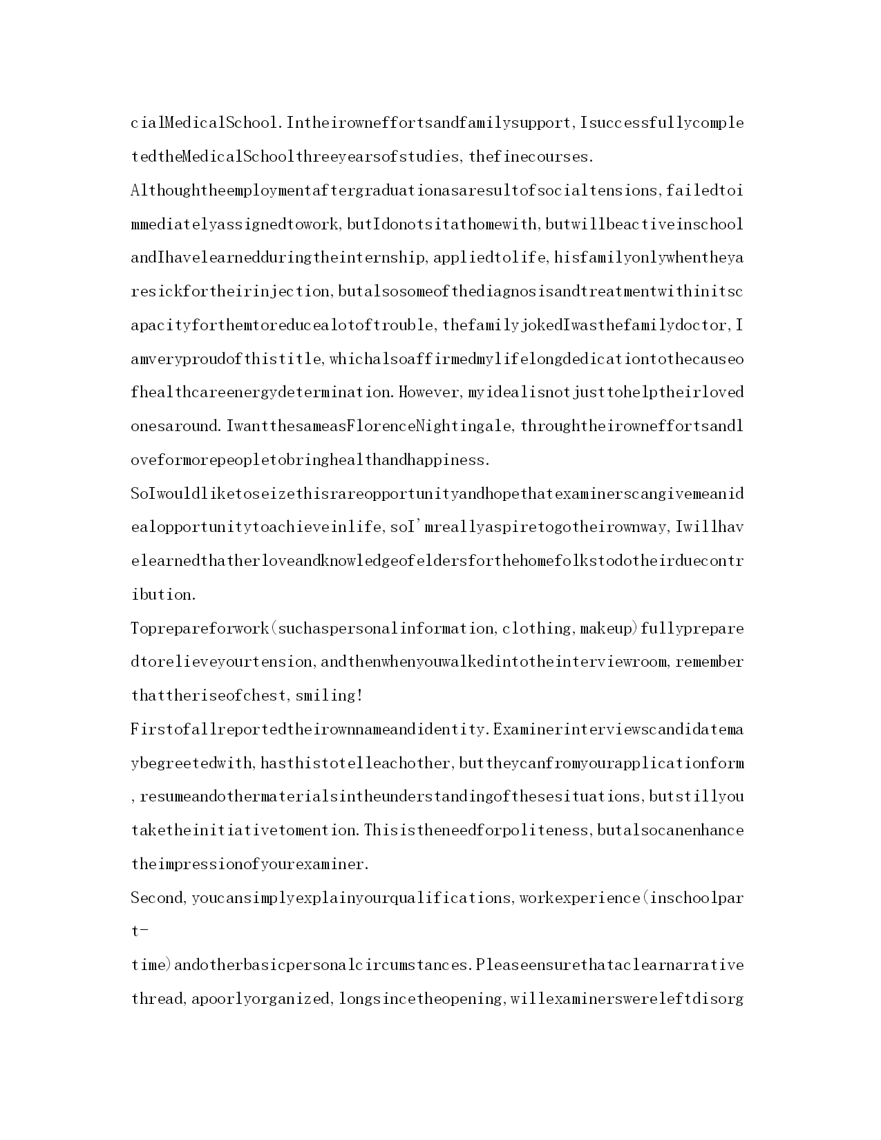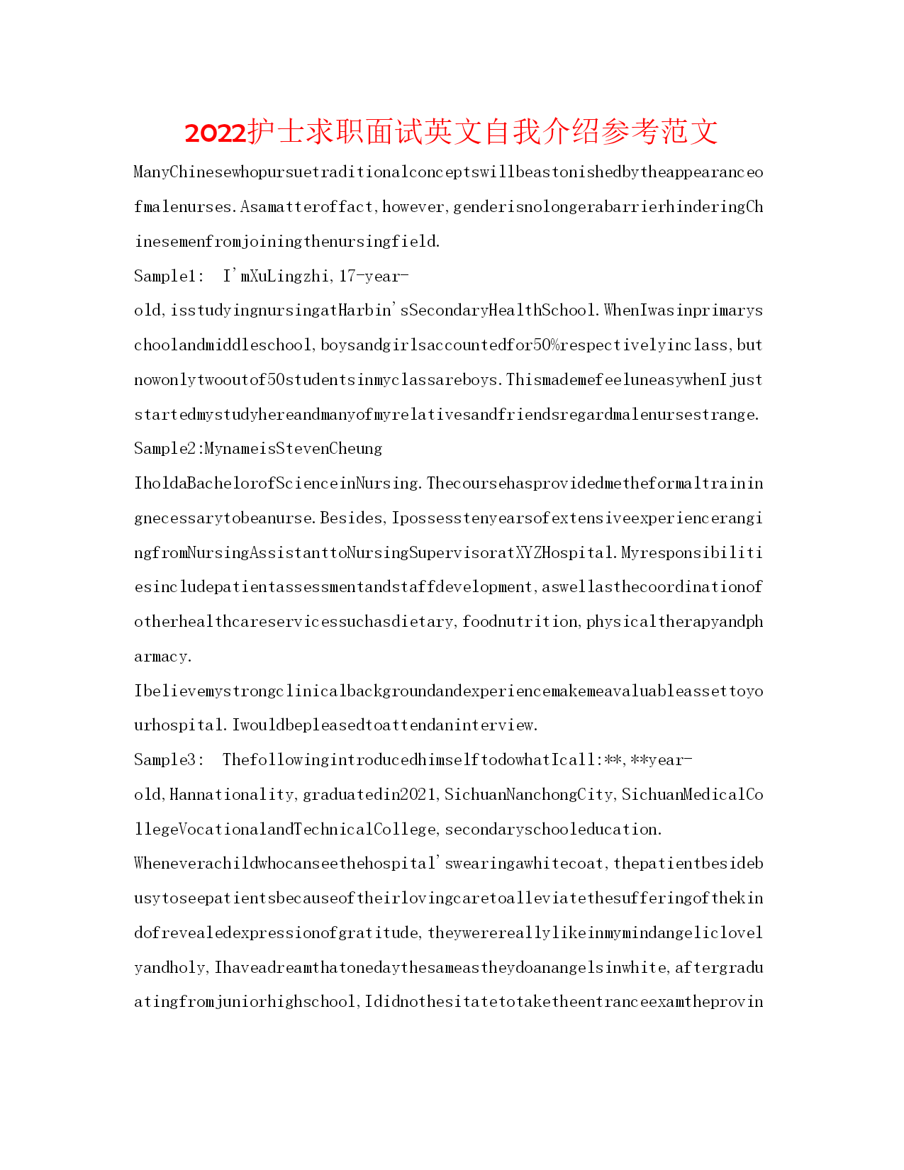 2022护士求职面试英文自我介绍参考范文ManyChinesewhopursuetraditionalconceptswillbeastonishedbytheappearanceofmalenurses.Asamatteroffact,however,genderisnolongerabarrierhinderingChinesemenfromjoiningthenursingfield.Sample1:I'mXuLingzhi,17-year-old,isstudyingnursingatHarbin'sSecondaryHealthSchool.WhenIwasinprimaryschoolandmiddleschool,boysandgirlsaccountedfor50%respectivelyinclass,butnowonlytwooutof50studentsinmyclassareboys.ThismademefeeluneasywhenIjuststartedmystudyhereandmanyofmyrelativesandfriendsregardmalenursestrange.Sample2:MynameisStevenCheungIholdaBachelorofScienceinNursing.Thecoursehasprovidedmetheformaltrainingnecessarytobeanurse.Besides,IpossesstenyearsofextensiveexperiencerangingfromNursingAssistanttoNursingSupervisoratXYZHospital.Myresponsibilitiesincludepatientassessmentandstaffdevelopment,aswellasthecoordinationofotherhealthcareservicessuchasdietary,foodnutrition,physicaltherapyandpharmacy.Ibelievemystrongclinicalbackgroundandexperiencemakemeavaluableassettoyourhospital.Iwouldbepleasedtoattendaninterview.Sample3:ThefollowingintroducedhimselftodowhatIcall:**,**year-old,Hannationality,graduatedin2021,SichuanNanchongCity,SichuanMedicalCollegeVocationalandTechnicalCollege,secondaryschooleducation.Wheneverachildwhocanseethehospital'swearingawhitecoat,thepatientbesidebusytoseepatientsbecauseoftheirlovingcaretoalleviatethesufferingofthekindofrevealedexpressionofgratitude,theywerereallylikeinmymindangeliclovelyandholy,Ihaveadreamthatonedaythesameastheydoanangelsinwhite,aftergraduatingfromjuniorhighschool,IdidnothesitatetotaketheentranceexamtheprovincialMedicalSchool.Intheirowneffortsandfamilysupport,IsuccessfullycompletedtheMedicalSchoolthreeyearsofstudies,thefinecourses.Althoughtheemploymentaftergraduationasaresultofsocialtensions,failedtoimmediatelyassignedtowork,butIdonotsitathomewith,butwillbeactiveinschoolandIhavelearnedduringtheinternship,appliedtolife,hisfamilyonlywhentheyaresickfortheirinjection,butalsosomeofthediagnosisandtreatmentwithinitscapacityforthemtored