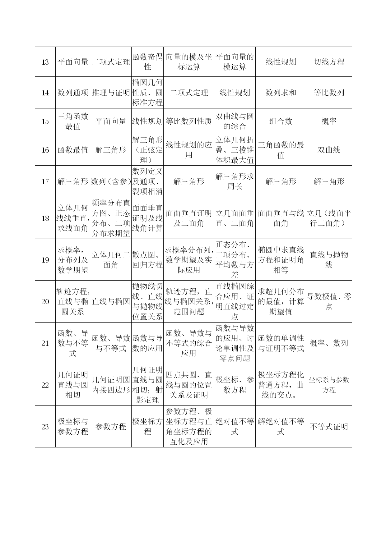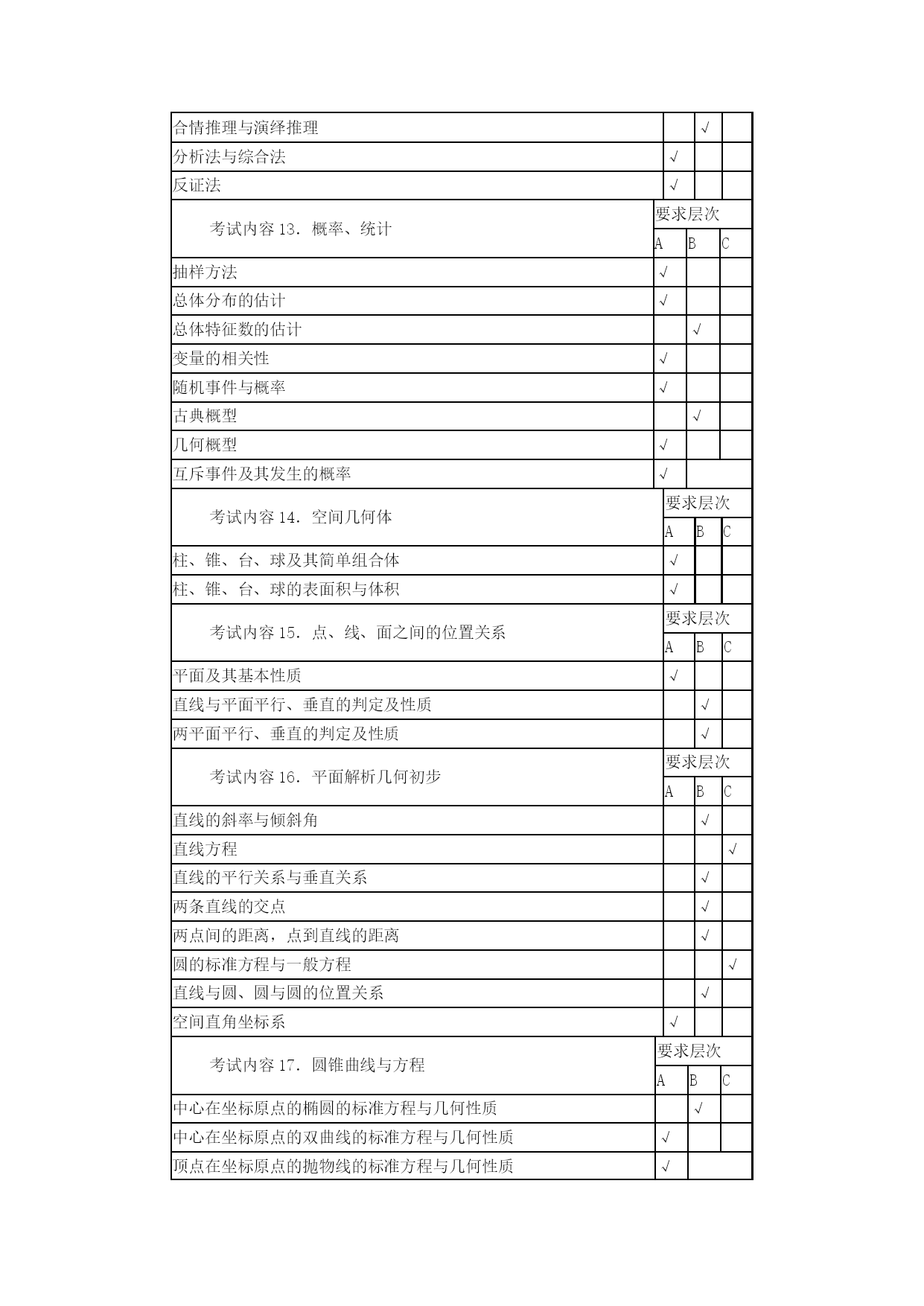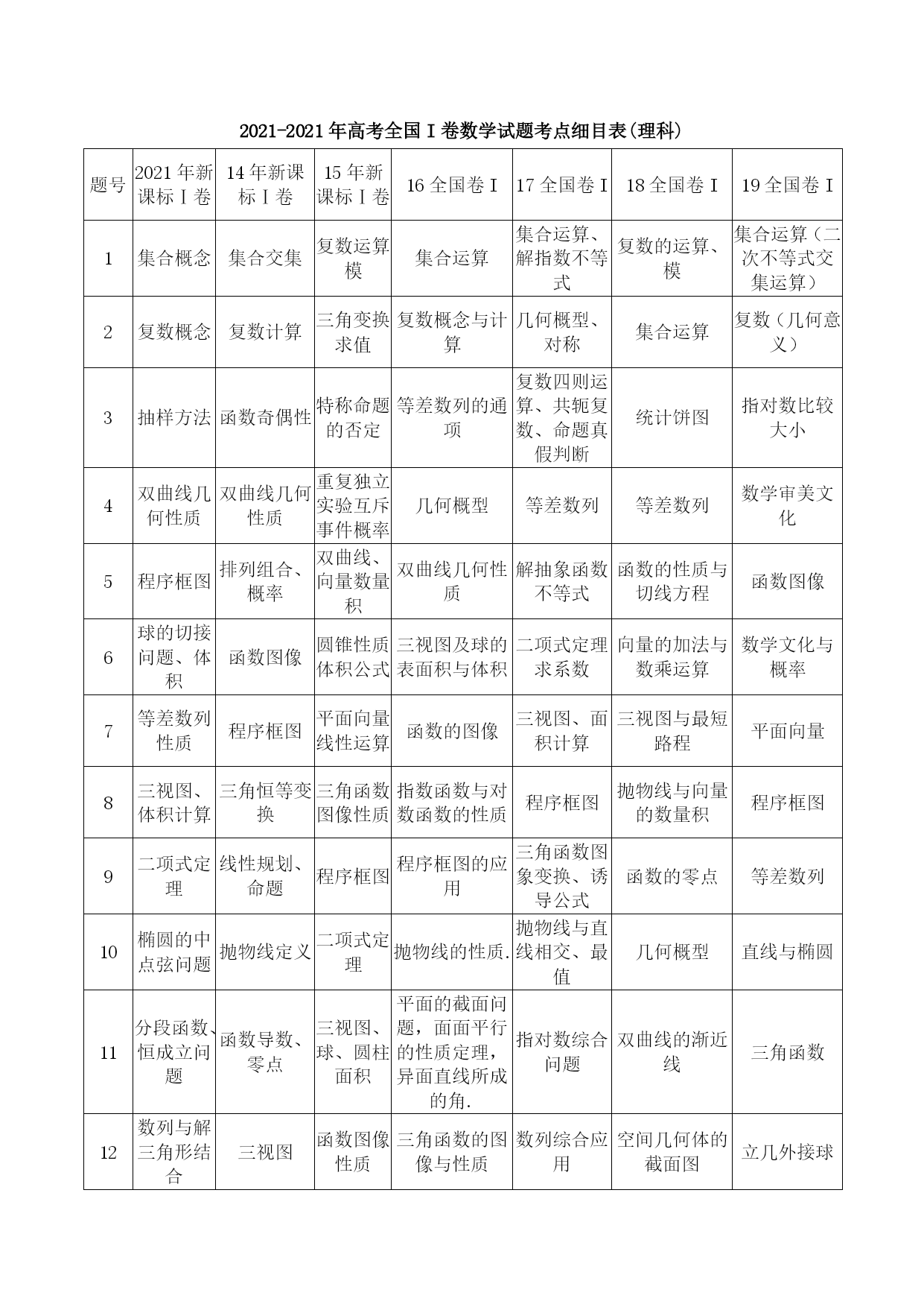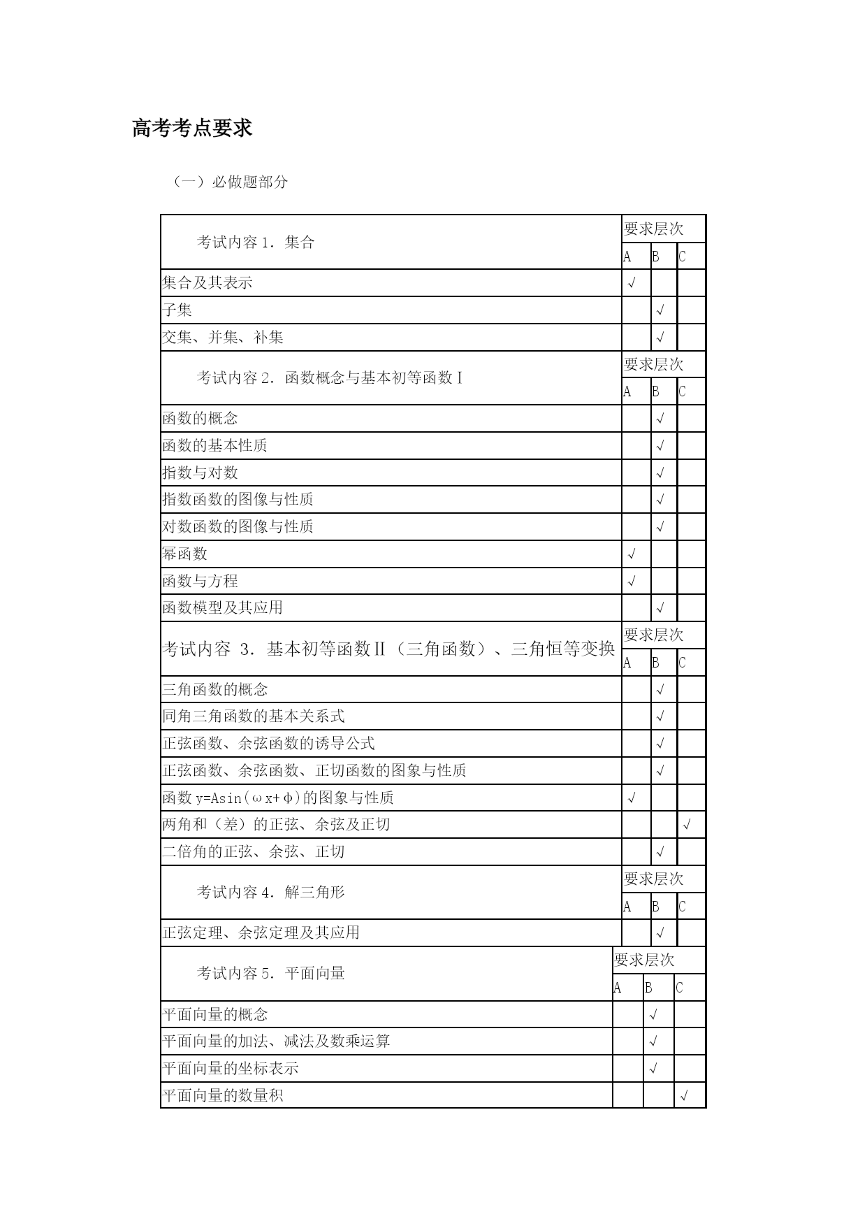 江苏高考数学考点表优质资料(可以直接使用,可编辑优质资料,欢迎下载)高考考点要求(一)必做题部分考试内容1.集合要求层次ABC集合及其表示√子集√交集、并集、补集√考试内容2.函数概念与基本初等函数Ⅰ要求层次ABC函数的概念√函数的基本性质√指数与对数√指数函数的图像与性质√对数函数的图像与性质√幂函数√函数与方程√函数模型及其应用√考试内容3.基本初等函数Ⅱ(三角函数)、三角恒等变换要求层次ABC三角函数的概念√同角三角函数的基本关系式√正弦函数、余弦函数的诱导公式√正弦函数、余弦函数、正切函数的图象与性质√函数y=Asin(ωx+φ)的图象与性质√两角和(差)的正弦、余弦及正切√二倍角的正弦、余弦、正切√考试内容4.解三角形要求层次ABC正弦定理、余弦定理及其应用√考试内容5.平面向量要求层次ABC平面向量的概念√平面向量的加法、减法及数乘运算√平面向量的坐标表示√平面向量的数量积√平面向量的平行与垂直√平面向量的应用√考试内容6.数列要求层次ABC数列的概念√等差数列√等比数列√考试内容7.不等式要求层次ABC基本不等式√二元一次不等式√线性规划√考试内容8.复数要求层次ABC复数的概念√复数的四则运算√复数的几何意义√考试内容9.导数及其应用要求层次ABC导数的概念√导数的几何意义√导数的运算√利用导数研究函数的单调性与极值√导数在实际问题中的应用√考试内容10.算法初步要求层次ABC算法的含义√流程图√基本算法语句√考试内容11.常用逻辑用语要求层次ABC命题的四则形式√充分条件、必要条件、充分必要条件√简单的逻辑联结词√全称量词与存在量词√考试内容12.推理与证明要求层次ABC合情推理与演绎推理√分析法与综合法√反证法√考试内容13.概率、统计要求层次ABC抽样方法√总体分布的估计√总体特征数的估计√变量的相关性√随机事件与概率√古典概型√几何概型√互斥事件及其发生的概率√考试内容14.空间几何体要求层次ABC柱、锥、台、球及其简单组合体√柱、锥、台、球的表面积与体积√考试内容15.点、线、面之间的位置关系要求层次ABC平面及其基本性质√直线与平面平行、垂直的判定及性质√两平面平行、垂直的判定及性质√考试内容16.平面解析几何初步要求层次ABC直线的斜率与倾斜角√直线方程√直线的平行关系与垂直关系√两条直线的交点√两点间的距离,点到直线的距离√圆的标准方程与一般方程√直线与圆、圆与圆的位置关系√空间直角坐标系√考试内容17.圆锥曲线与方程要求层次ABC中心在坐标原点的椭圆的标准方程与几何性质√中心在坐标原点的双曲线的标准方程与几何性质√顶点在坐标原点的抛物线的标准方程与几何性质√(二)附加题部分(选修系列2:不含选修系列1中的内容)1.圆锥曲线与方程考试内容要求层次ABC曲线与方程√顶点在坐标原点的抛物线的标准方程与几何性质√2.空间向量与立体几何考试内容要求层次ABC空间向量的概念√空间向量共线、共面的充分必要条件√空间向量的加法、减法及数乘运算√空间向量的坐标表示√空间向量的数量积√空间向量的共线与垂直√直线的方向向量与平面的法向量√空间向量的应用√3.导数及其应用考试内容要求层次ABC简单的复合函数的导数√4.推理与证明考试内容要求层次ABC数学归纳法的原理√数学归纳法的简单应用√5.计数原理考试内容要求层次ABC加法原理与乘法原理√排列与组合√二项式定理√6.概率统计考试内容要求层次ABC离散型随机变量及其分布列√超几何分布√条件概率及相互独立事件√n次独立重复试验的模型及二项分布√离散型随机变量的均值与方差√8.矩阵与变换考试内容要求层次ABC矩阵的概念√二阶矩阵与平面向量√常见的平面交换√矩阵的复合与矩阵的乘法√二阶逆矩阵√二阶矩阵的特征值与特征向量√二阶矩阵的简单应用√9.坐标系与参数方程考试内容要求层次ABC坐标系的有关概念√简单图形的极坐标方程√极坐标方程与直角坐标方程的互化√参数方程√直线、圆及椭圆的参数方程√参数方程与普通方程的互化√参数方程的简单应用√2021-2021年高考全国I卷数学试题考点细目表(理科)题号2021年新课标Ⅰ卷14年新课标Ⅰ卷15年新课标Ⅰ卷16全国卷I17全国卷I18全国卷I19全国卷I1集合概念集合交集复数运算、模集合运算集合运算、解指数不等式复数的运算、模集合运算(二次不等式交集运算)2复数概念复数计算三角变换、求值复数概念与计算几何概型、对称集合运算复数(几何意义)3抽样方法函数奇偶性特称命题的否定等差数列的通项复数四则运算、共轭复数、命题真假判断统计饼图指对数比较大小4双曲线几何性质双曲线几何性质重复独立实验互斥事件概率几何概型等差数列等差数列数学审美文化5程序框图排列组合、概率双曲线、向量数量积双曲线几何性质解抽象函数不等式函数