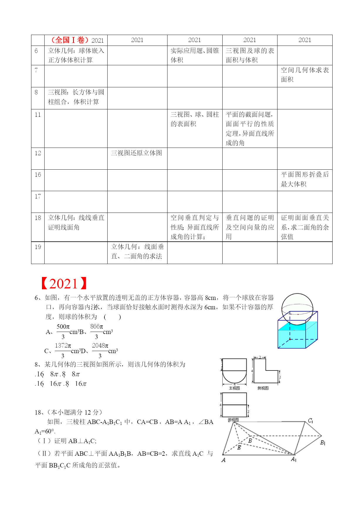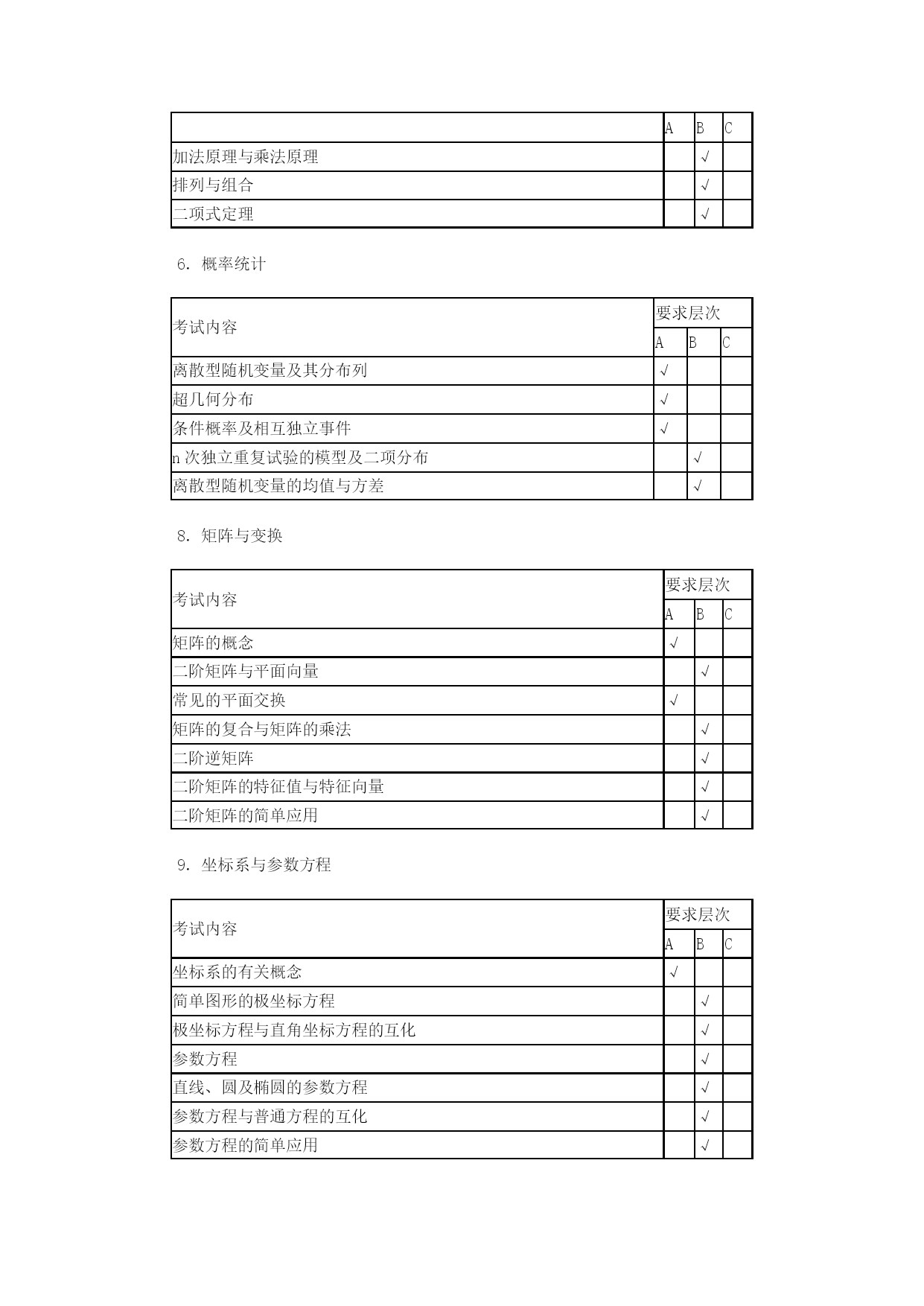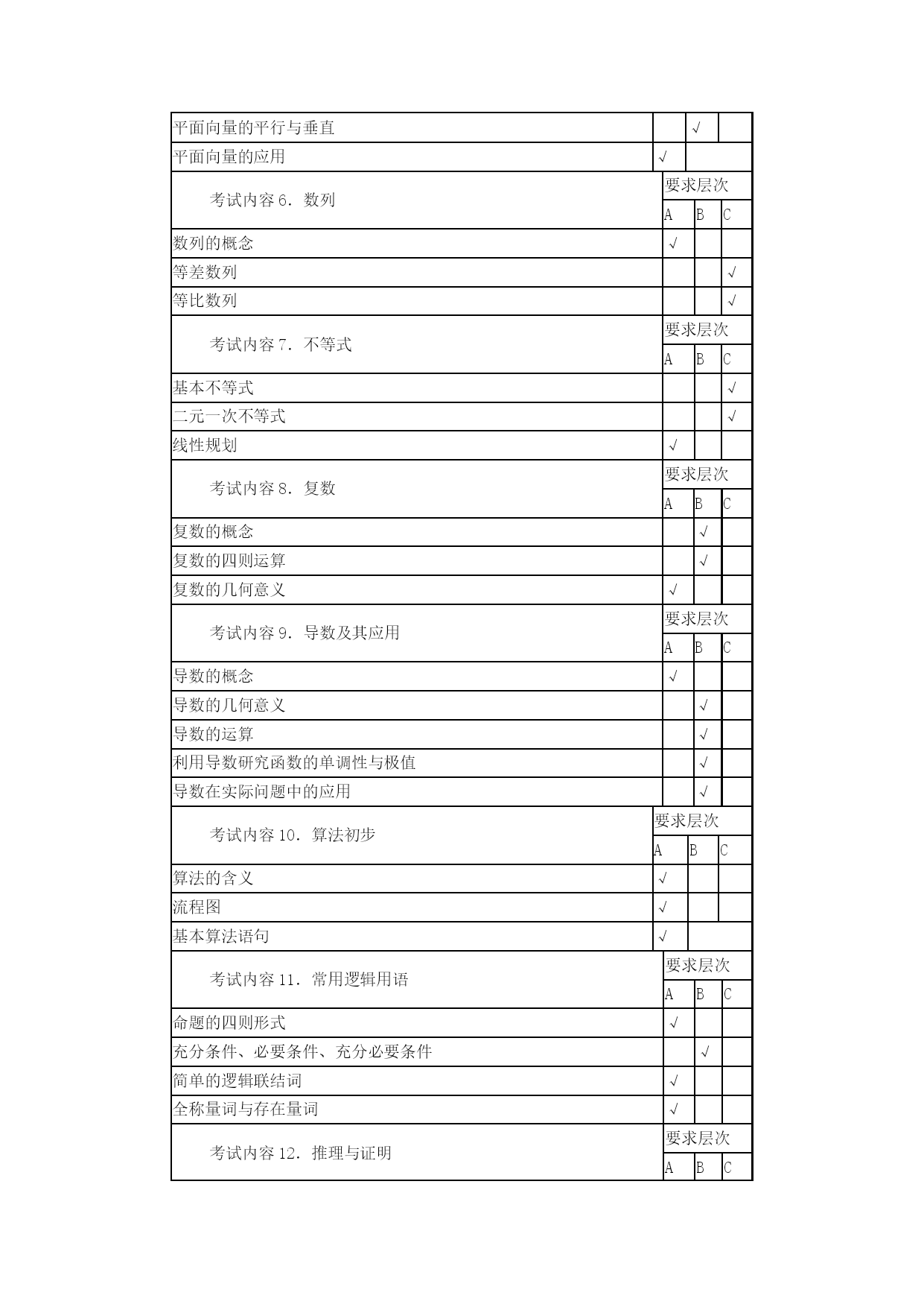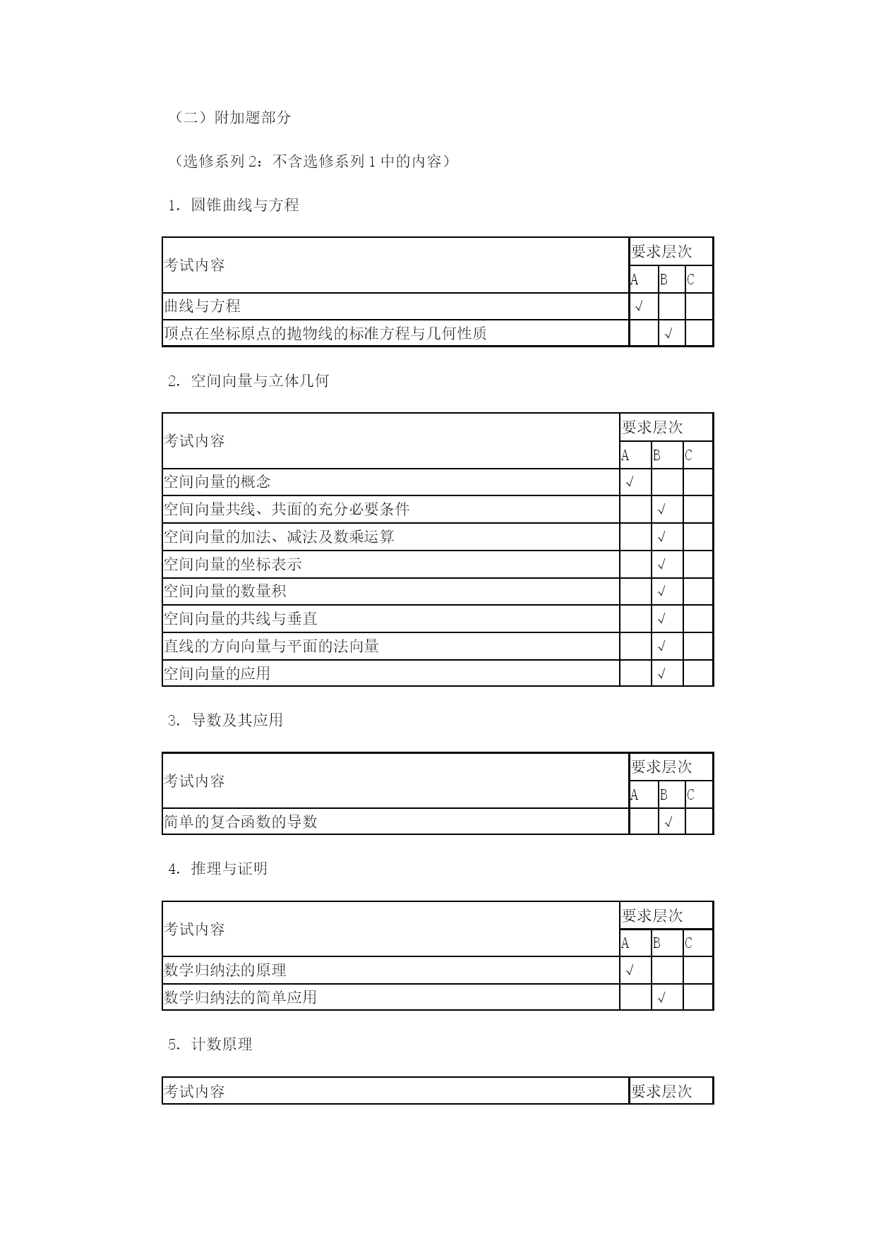 江苏高考数学考点表优质资料(可以直接使用,可编辑优质资料,欢迎下载)高考考点要求(一)必做题部分考试内容1.集合要求层次ABC集合及其表示√子集√交集、并集、补集√考试内容2.函数概念与基本初等函数Ⅰ要求层次ABC函数的概念√函数的基本性质√指数与对数√指数函数的图像与性质√对数函数的图像与性质√幂函数√函数与方程√函数模型及其应用√考试内容3.基本初等函数Ⅱ(三角函数)、三角恒等变换要求层次ABC三角函数的概念√同角三角函数的基本关系式√正弦函数、余弦函数的诱导公式√正弦函数、余弦函数、正切函数的图象与性质√函数y=Asin(ωx+φ)的图象与性质√两角和(差)的正弦、余弦及正切√二倍角的正弦、余弦、正切√考试内容4.解三角形要求层次ABC正弦定理、余弦定理及其应用√考试内容5.平面向量要求层次ABC平面向量的概念√平面向量的加法、减法及数乘运算√平面向量的坐标表示√平面向量的数量积√平面向量的平行与垂直√平面向量的应用√考试内容6.数列要求层次ABC数列的概念√等差数列√等比数列√考试内容7.不等式要求层次ABC基本不等式√二元一次不等式√线性规划√考试内容8.复数要求层次ABC复数的概念√复数的四则运算√复数的几何意义√考试内容9.导数及其应用要求层次ABC导数的概念√导数的几何意义√导数的运算√利用导数研究函数的单调性与极值√导数在实际问题中的应用√考试内容10.算法初步要求层次ABC算法的含义√流程图√基本算法语句√考试内容11.常用逻辑用语要求层次ABC命题的四则形式√充分条件、必要条件、充分必要条件√简单的逻辑联结词√全称量词与存在量词√考试内容12.推理与证明要求层次ABC合情推理与演绎推理√分析法与综合法√反证法√考试内容13.概率、统计要求层次ABC抽样方法√总体分布的估计√总体特征数的估计√变量的相关性√随机事件与概率√古典概型√几何概型√互斥事件及其发生的概率√考试内容14.空间几何体要求层次ABC柱、锥、台、球及其简单组合体√柱、锥、台、球的表面积与体积√考试内容15.点、线、面之间的位置关系要求层次ABC平面及其基本性质√直线与平面平行、垂直的判定及性质√两平面平行、垂直的判定及性质√考试内容16.平面解析几何初步要求层次ABC直线的斜率与倾斜角√直线方程√直线的平行关系与垂直关系√两条直线的交点√两点间的距离,点到直线的距离√圆的标准方程与一般方程√直线与圆、圆与圆的位置关系√空间直角坐标系√考试内容17.圆锥曲线与方程要求层次ABC中心在坐标原点的椭圆的标准方程与几何性质√中心在坐标原点的双曲线的标准方程与几何性质√顶点在坐标原点的抛物线的标准方程与几何性质√(二)附加题部分(选修系列2:不含选修系列1中的内容)1.圆锥曲线与方程考试内容要求层次ABC曲线与方程√顶点在坐标原点的抛物线的标准方程与几何性质√2.空间向量与立体几何考试内容要求层次ABC空间向量的概念√空间向量共线、共面的充分必要条件√空间向量的加法、减法及数乘运算√空间向量的坐标表示√空间向量的数量积√空间向量的共线与垂直√直线的方向向量与平面的法向量√空间向量的应用√3.导数及其应用考试内容要求层次ABC简单的复合函数的导数√4.推理与证明考试内容要求层次ABC数学归纳法的原理√数学归纳法的简单应用√5.计数原理考试内容要求层次ABC加法原理与乘法原理√排列与组合√二项式定理√6.概率统计考试内容要求层次ABC离散型随机变量及其分布列√超几何分布√条件概率及相互独立事件√n次独立重复试验的模型及二项分布√离散型随机变量的均值与方差√8.矩阵与变换考试内容要求层次ABC矩阵的概念√二阶矩阵与平面向量√常见的平面交换√矩阵的复合与矩阵的乘法√二阶逆矩阵√二阶矩阵的特征值与特征向量√二阶矩阵的简单应用√9.坐标系与参数方程考试内容要求层次ABC坐标系的有关概念√简单图形的极坐标方程√极坐标方程与直角坐标方程的互化√参数方程√直线、圆及椭圆的参数方程√参数方程与普通方程的互化√参数方程的简单应用√2021-2021年高考全国I卷数学试题考点细目表(理科)题号2021年新课标Ⅰ卷14年新课标Ⅰ卷15年新课标Ⅰ卷16全国卷I17全国卷I18全国卷I19全国卷I1集合概念集合交集复数运算、模集合运算集合运算、解指数不等式复数的运算、模集合运算(二次不等式交集运算)2复数概念复数计算三角变换、求值复数概念与计算几何概型、对称集合运算复数(几何意义)3抽样方法函数奇偶性特称命题的否定等差数列的通项复数四则运算、共轭复数、命题真假判断统计饼图指对数比较大小4双曲线几何性质双曲线几何性质重复独立实验互斥事件概率几何概型等差数列等差数列数学审美文化5程序框图排列组合、概率双曲线、向量数量积双曲线几何性质解抽象函数不等式函数