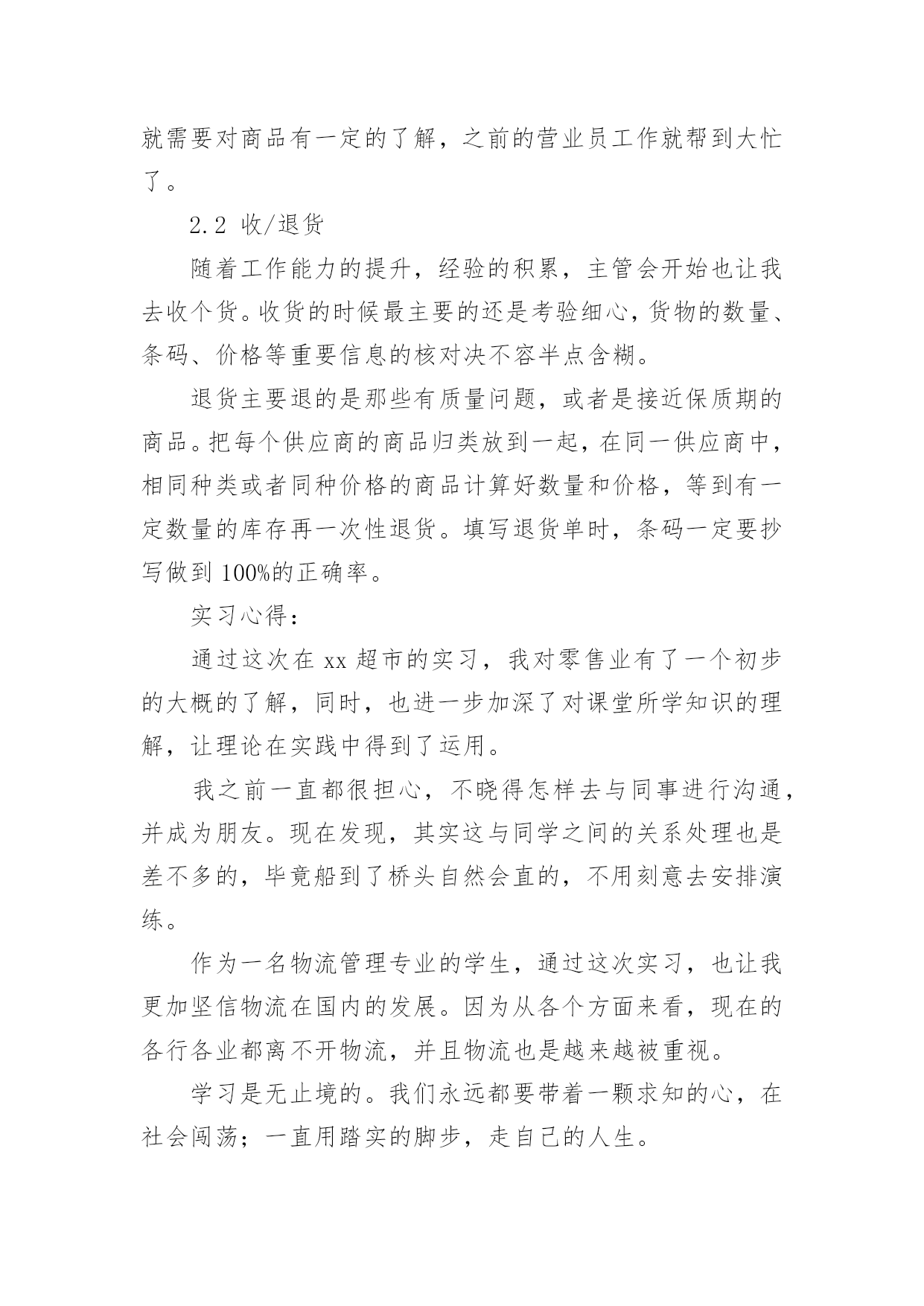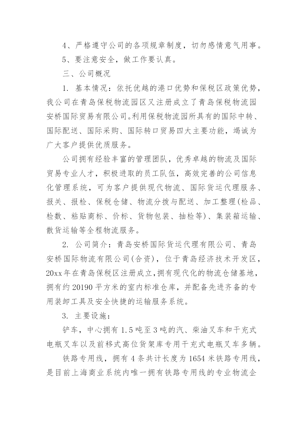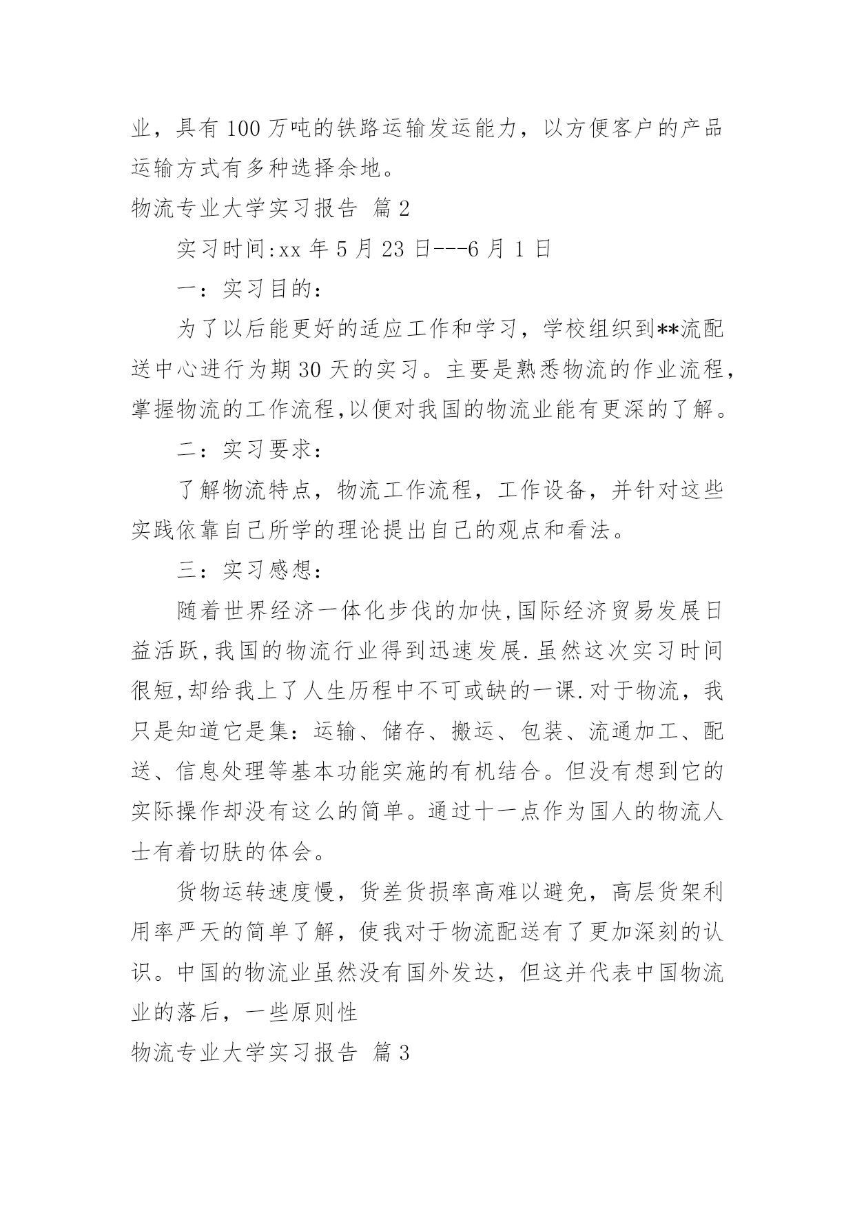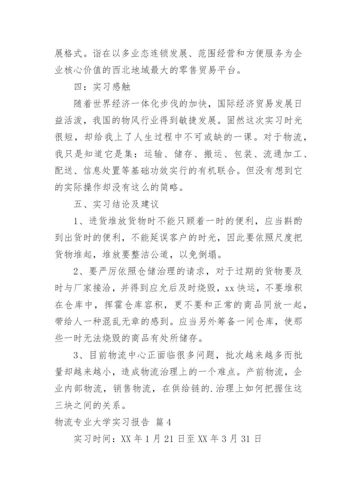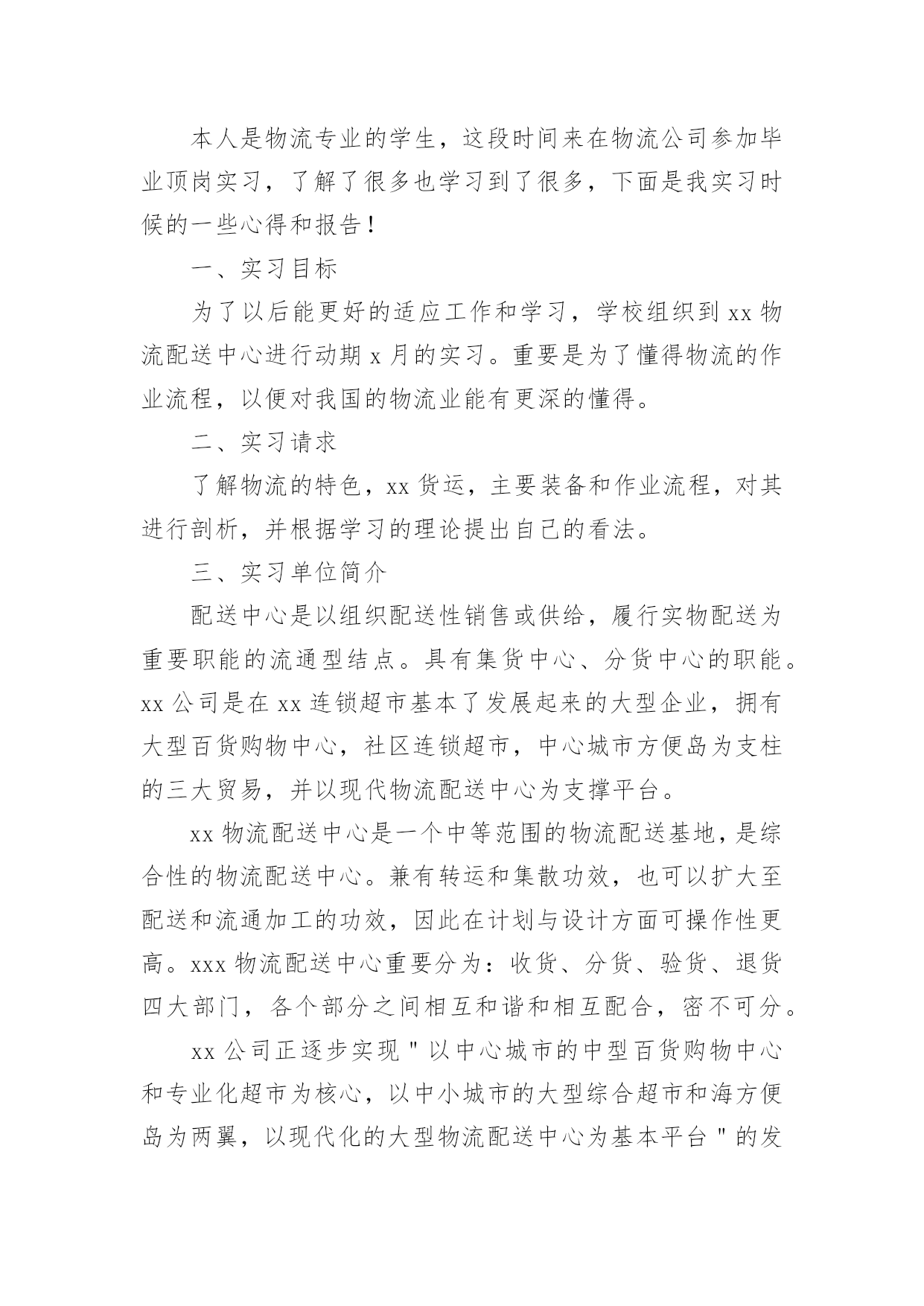 物流专业大学实习报告有关物流专业大学实习报告四篇在经济发展迅速的今天,我们使用报告的情况越来越多,报告包含标题、正文、结尾等。相信许多人会觉得报告很难写吧,以下是小编收集整理的物流专业大学实习报告4篇,希望对大家有所帮助。物流专业大学实习报告篇1为了更好的适应以后的学习和工作,在本学期末,由学校统一安排物流管理实习。我们将所学到的专业知识和具体实践相结合,以提高我们的专业综合素质和能力,为以后的学习和工作打下坚实的基础。一、实习目的初步认识社会,进一步了解货代以及物流运输组织与管理的相关知识,做到学以致用,把从学校学到的理论知识与实际工作中的实践贯穿起来,从社会实践中,逐步完善自我、发展自我,最终完全融入现实生活当中,做一名言出必行、知识与能力兼备、符合社会主义发展目标的合格大学生。二、实习注意事项1、勤学苦练,善于创新,善于思考。2、纸上得来终须浅,绝知此事要躬行。3、灵活处理人际关系(同事关系、上下级关系、客户关系)。4、严格遵守公司的各项规章制度,切勿感情意气用事。5、要注意安全,做工作要认真。三、公司概况1.基本情况:依托优越的港口优势和保税区政策优势,我公司在青岛保税物流园区又注册成立了青岛保税物流园安桥国际贸易有限公司。利用保税物流园所具有的国际中转、国际配送、国际采购、国际转口贸易四大主要功能,竭诚为广大客户提供优质服务。公司拥有经验丰富的管理团队,优秀卓越的物流及国际贸易专业人才,积极进取的员工队伍,高效完善的公司信息化管理系统,可为客户提供现代物流、国际货运代理服务、报关、报检、保税仓储、物流分拨与配送、加工整理(检品、检数、粘贴商标、价标、货物包装、抽检等)、集装箱运输、散货运输等全程物流服务。2.公司简介:青岛安桥国际货运代理有限公司、青岛安桥国际物流有限公司(合资),位于青岛经济技术开发区,20xx年在青岛保税区注册成立,拥有现代化的物流仓储基地,拥有约20190平方米的室内标准仓库,并配备先进齐备的专用装卸工具及安全快捷的运输服务系统。3.主要设施:铲车,中心拥有1.5吨至3吨的汽、柴油叉车和干充式电瓶叉车以及前移式高位货架库专用干充式电瓶叉车多辆。铁路专用线,拥有4条共计长度为1654米铁路专用线,是目前上海商业系统内唯一拥有铁路专用线的专业物流企业,具有100万吨的铁路运输发运能力,以方便客户的产品运输方式有多种选择余地。物流专业大学实习报告篇2实习时间:xx年5月23日---6月1日一:实习目的:为了以后能更好的适应工作和学习,学校组织到**流配送中心进行为期30天的实习。主要是熟悉物流的作业流程,掌握物流的工作流程,以便对我国的物流业能有更深的了解。二:实习要求:了解物流特点,物流工作流程,工作设备,并针对这些实践依靠自己所学的理论提出自己的观点和看法。三:实习感想:随着世界经济一体化步伐的加快,国际经济贸易发展日益活跃,我国的物流行业得到迅速发展.虽然这次实习时间很短,却给我上了人生历程中不可或缺的一课.对于物流,我只是知道它是集:运输、储存、搬运、包装、流通加工、配送、信息处理等基本功能实施的有机结合。但没有想到它的实际操作却没有这么的简单。通过十一点作为国人的物流人士有着切肤的体会。货物运转速度慢,货差货损率高难以避免,高层货架利用率严天的简单了解,使我对于物流配送有了更加深刻的认识。中国的物流业虽然没有国外发达,但这并代表中国物流业的落后,一些原则性物流专业大学实习报告篇3本人是物流专业的学生,这段时间来在物流公司参加毕业顶岗实习,了解了很多也学习到了很多,下面是我实习时候的一些心得和报告!一、实习目标为了以后能更好的适应工作和学习,学校组织到xx物流配送中心进行动期x月的实习。重要是为了懂得物流的作业流程,以便对我国的物流业能有更深的懂得。二、实习请求了解物流的特色,xx货运,主要装备和作业流程,对其进行剖析,并根据学习的理论提出自己的看法。三、实习单位简介配送中心是以组织配送性销售或供给,履行实物配送为重要职能的流通型结点。具有集货中心、分货中心的职能。xx公司是在xx连锁超市基本了发展起来的大型企业,拥有大型百货购物中心,社区连锁超市,中心城市方便岛为支柱的三大贸易,并以现代物流配送中心为支撑平台。xx物流配送中心是一个中等范围的物流配送基地,是综合性的物流配送中心。兼有转运和集散功效,也可以扩大至配送和流通加工的功效,因此在计划与设计方面可操作性更高。xxx物流配送中心重要分为:收货、分货、验货、退货四大部门,各个部分之间相互和谐和相互配合,密不可分。xx公司正逐步实现"以中心城市的中型百货购物中心和专业化超市为核心,以中小城市的大型综合超市和海方便岛为两翼,以现代化的大型物流配送中心为基本平台"的发展格式。诣在以多业态连锁发展、范围经营和方便服务为企业核心价值的西北地域最