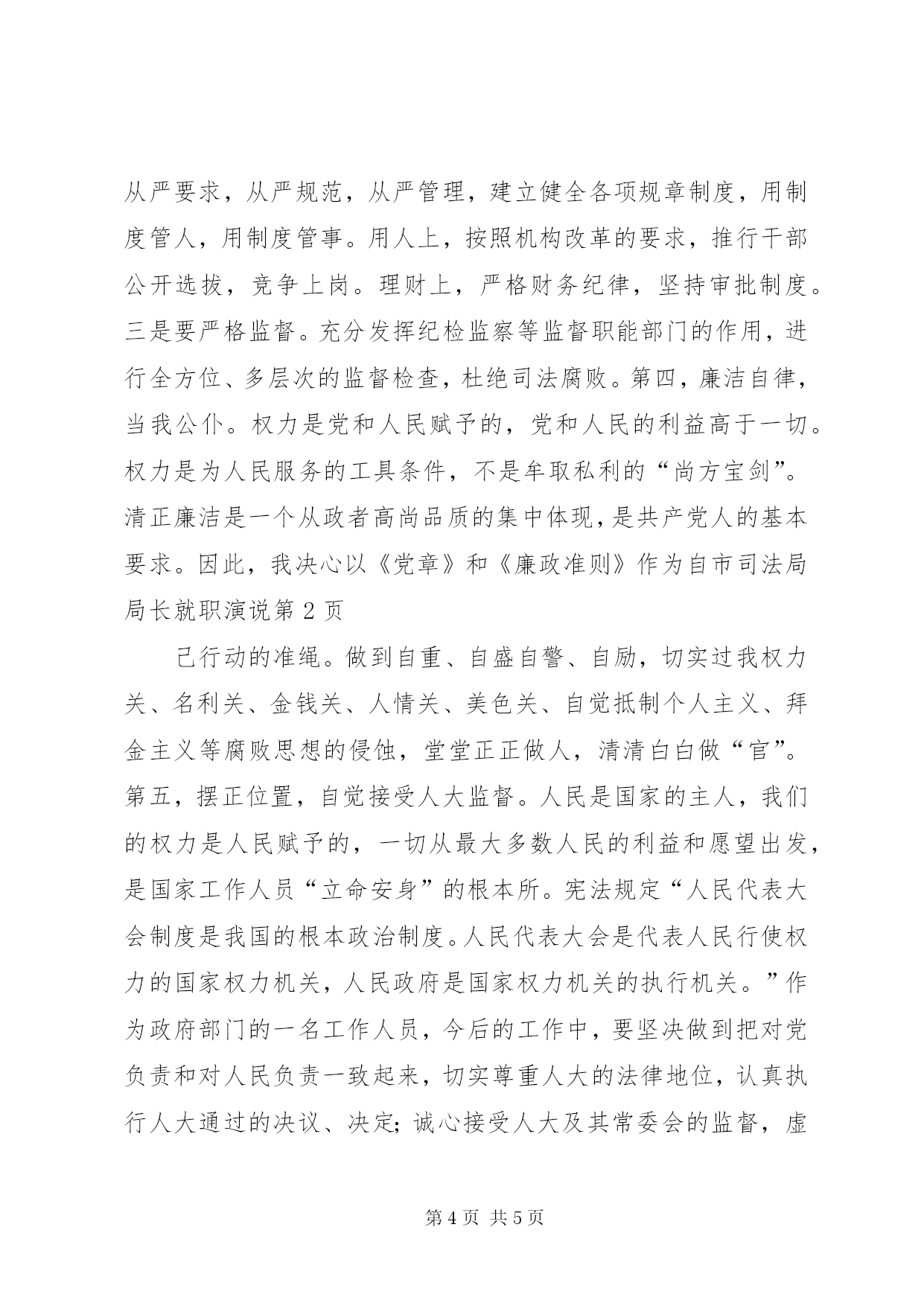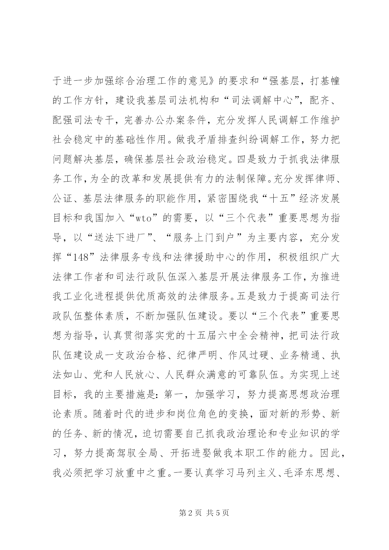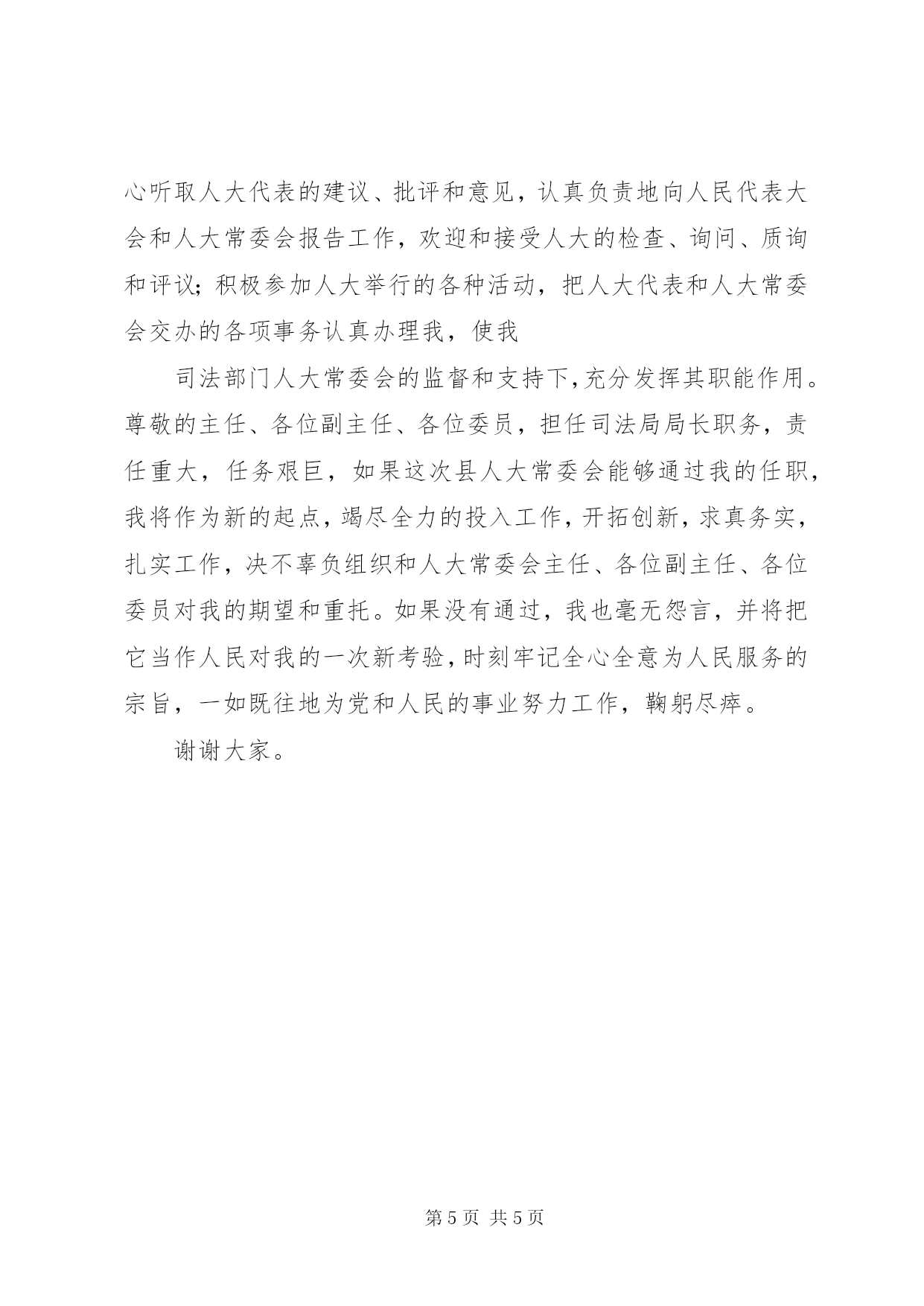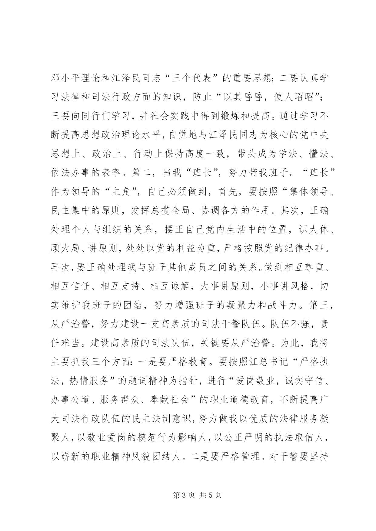 第PAGE\*Arabic\*MERGEFORMAT5页共NUMPAGES\*MERGEFORMAT5页市司法局局长就职演说人大常委会如能通过对我的任命,任期内我的工作目标是“五个致力于”:一是致力于充分发挥司法行政职能,全力维护社会稳定,为改革和发展创造良我的法治环境。紧密配合“严打”整治斗争,大力开展法制宣传教育活动,努力从根本上预防和减少违法犯罪。要始终坚持“惩罚与改造相结合,以改造人为宗旨”和“教育、感化、挽救”的工作方针,加强对监所依法、严格、文明、科学管理,积极推进现代化监所创建活动,努力建立确保监所安全稳定的高效机制。抓我落实刑释解教人员的安置帮教工作,配合“严打”整治,减少社会乱源,并深入开展“无刑释解教人员重新犯罪”活动。积极组织律师开展“严打”刑事辩护,维护司法公正。二是致力于全面开展“四五”普法和依法治理工作,不断推进依法治进程。根据党中央、全国人大常委会、国务院和委、人大常委会、政府及委、人大常委会政府的统一部署,认真总结“三五”普法和依法治理工作的基础上,大力开展多形式、全方位的法制宣传教育活动,不断增强广大公民社会主义民主法制意识,努力做到学法、知法、守法、用法、护法。实现由提高全民法律意识向提高全民法律素质的转变,实现由注重依靠行政手段管理向注重运用法律手段管理的转变,全面提高社会法治化管理水平。三是致力于抓我基层基础工作,大力开展“民安工程”活动,不断强化基层司法行政职能。要按照中共中央《关于进一步加强综合治理工作的意见》的要求和“强基层,打基幢的工作方针,建设我基层司法机构和“司法调解中心”,配齐、配强司法专干,完善办公办案条件,充分发挥人民调解工作维护社会稳定中的基础性作用。做我矛盾排查纠纷调解工作,努力把问题解决基层,确保基层社会政治稳定。四是致力于抓我法律服务工作,为全的改革和发展提供有力的法制保障。充分发挥律师、公证、基层法律服务的职能作用,紧密围绕我“十五”经济发展目标和我国加入“wto”的需要,以“三个代表”重要思想为指导,以“送法下进厂”、“服务上门到户”为主要内容,充分发挥“148”法律服务专线和法律援助中心的作用,积极组织广大法律工作者和司法行政队伍深入基层开展法律服务工作,为推进我工业化进程提供优质高效的法律服务。五是致力于提高司法行政队伍整体素质,不断加强队伍建设。要以“三个代表”重要思想为指导,认真贯彻落实党的十五届六中全会精神,把司法行政队伍建设成一支政治合格、纪律严明、作风过硬、业务精通、执法如山、党和人民放心、人民群众满意的可靠队伍。为实现上述目标,我的主要措施是:第一,加强学习,努力提高思想政治理论素质。随着时代的进步和岗位角色的变换,面对新的形势、新的任务、新的情况,迫切需要自己抓我政治理论和专业知识的学习,努力提高驾驭全局、开拓进娶做我本职工作的能力。因此,我必须把学习放重中之重。一要认真学习马列主义、毛泽东思想、邓小平理论和江泽民同志“三个代表”的重要思想;二要认真学习法律和司法行政方面的知识,防止“以其昏昏,使人昭昭”;三要向同行们学习,并社会实践中得到锻炼和提高。通过学习不断提高思想政治理论水平,自觉地与江泽民同志为核心的党中央思想上、政治上、行动上保持高度一致,带头成为学法、懂法、依法办事的表率。第二,当我“班长”,努力带我班子。“班长”作为领导的“主角”,自己必须做到,首先,要按照“集体领导、民主集中的原则,发挥总揽全局、协调各方的作用。其次,正确处理个人与组织的关系,摆正自己党内生活中的位置,识大体、顾大局、讲原则,处处以党的利益为重,严格按照党的纪律办事。再次,要正确处理我与班子其他成员之间的关系。做到相互尊重、相互信任、相互支持、相互谅解,大事讲原则,小事讲风格,切实维护我班子的团结,努力增强班子的凝聚力和战斗力。第三,从严治警,努力建设一支高素质的司法干警队伍。队伍不强,责任难当。建设高素质的司法队伍,关键要从严治警。为此,我将主要抓我三个方面:一是要严格教育。要按照江总书记“严格执法,热情服务”的题词精神为指针,进行“爱岗敬业,诚实守信、办事公道、服务群众、奉献社会”的职业道德教育,不断提高广大司法行政队伍的民主法制意识,努力做我以优质的法律服务凝聚人,以敬业爱岗的模范行为影响人,以公正严明的执法取信人,以崭新的职业精神风貌团结人。二是要严格管理。对干警要坚持从严要求,从严规范,从严管理,建立健全各项规章制度,用制度管人,用制度管事。用人上,按照机构改革的要求,推行干部公开选拔,竞争上岗。理财上,严格财务纪律,坚持审批制度。三是要严格监督。充分发挥纪检监察等监督职能部门的作用,进行全方位、多层次的监督检查,杜绝司法腐败。第四,廉洁自律,当我公仆。权力是党和人民赋予的,党和人民的利益高于一切。权力是为人民服务的工具