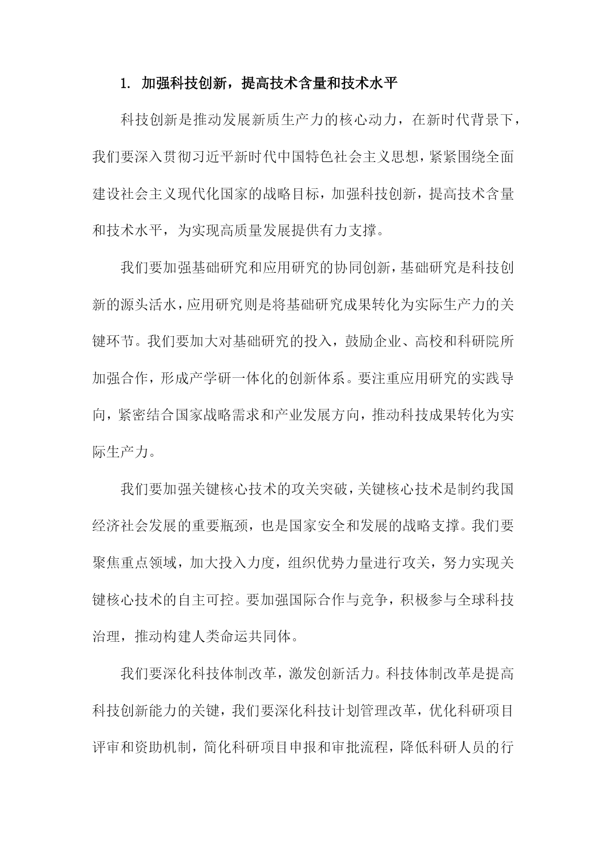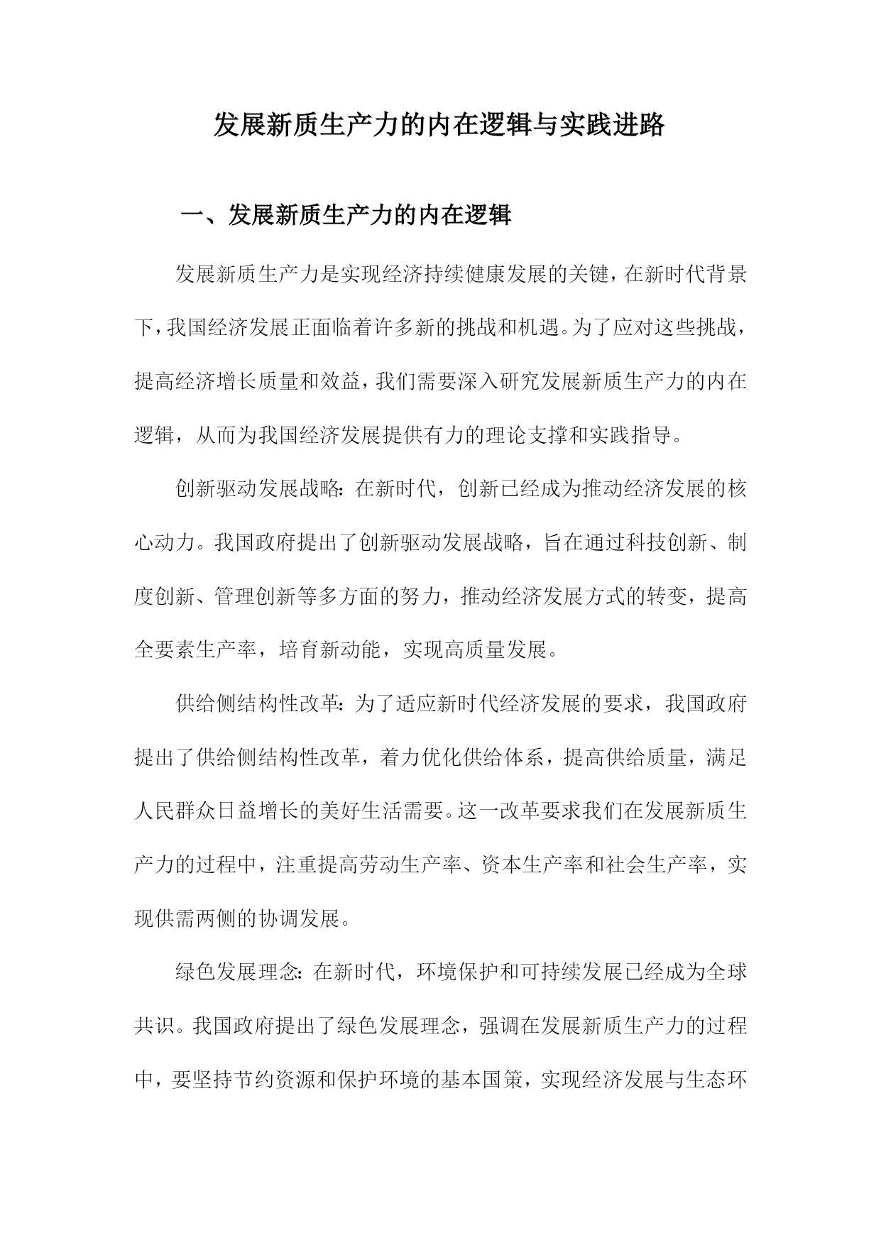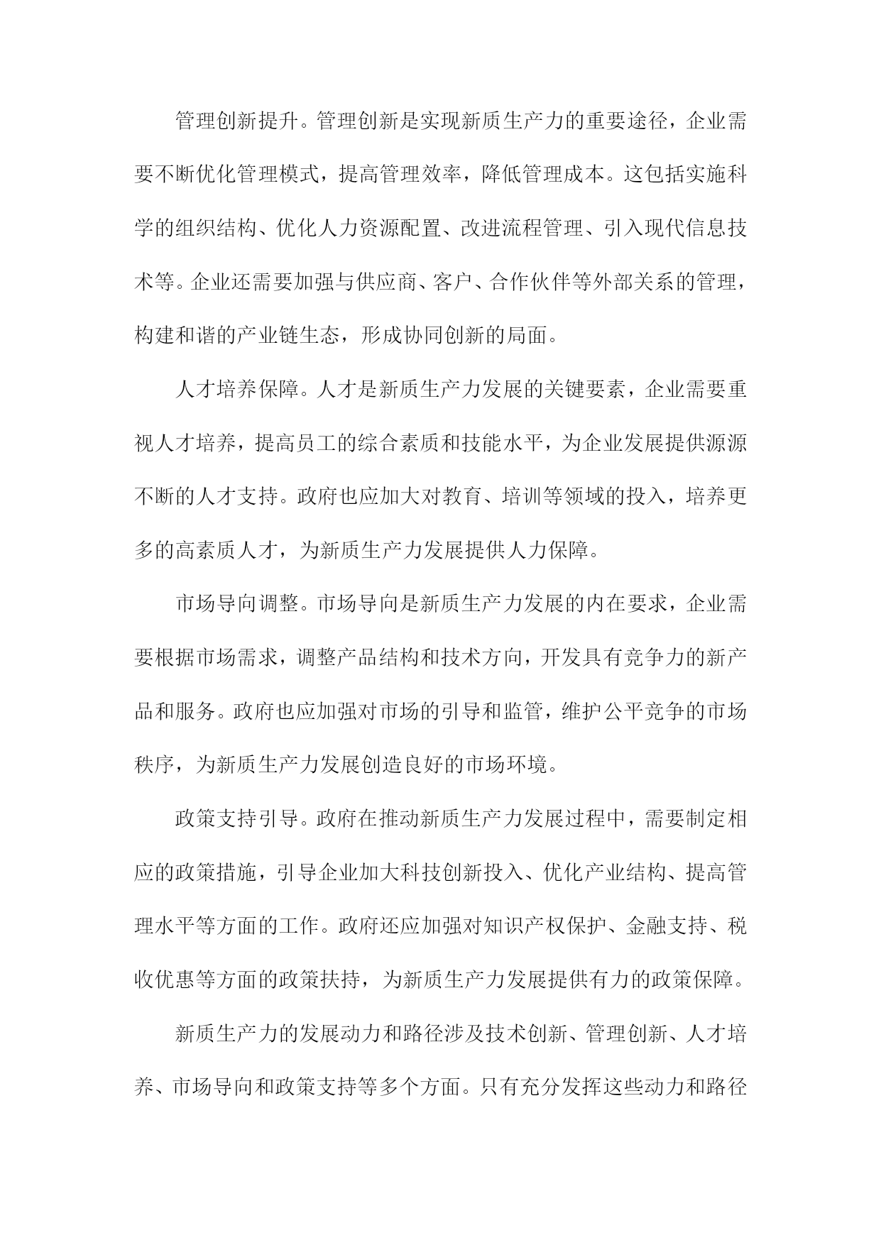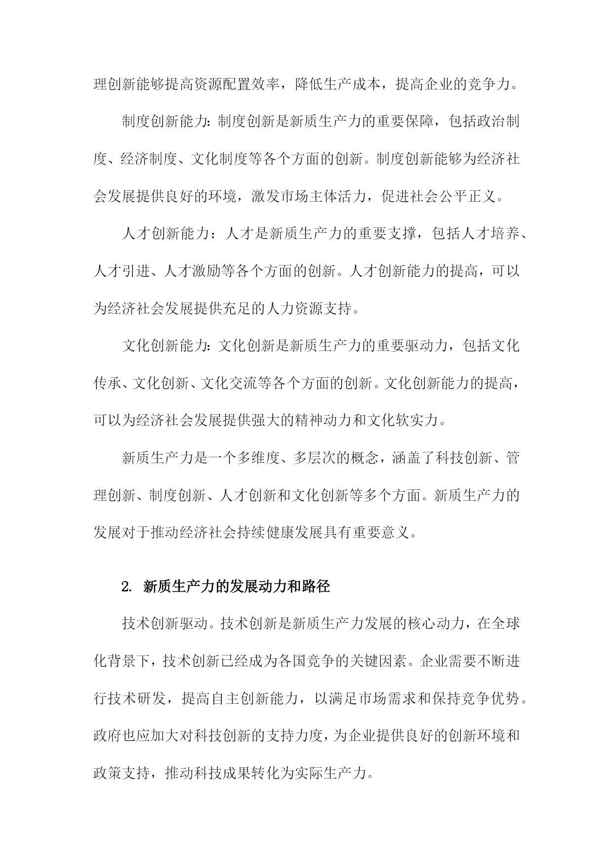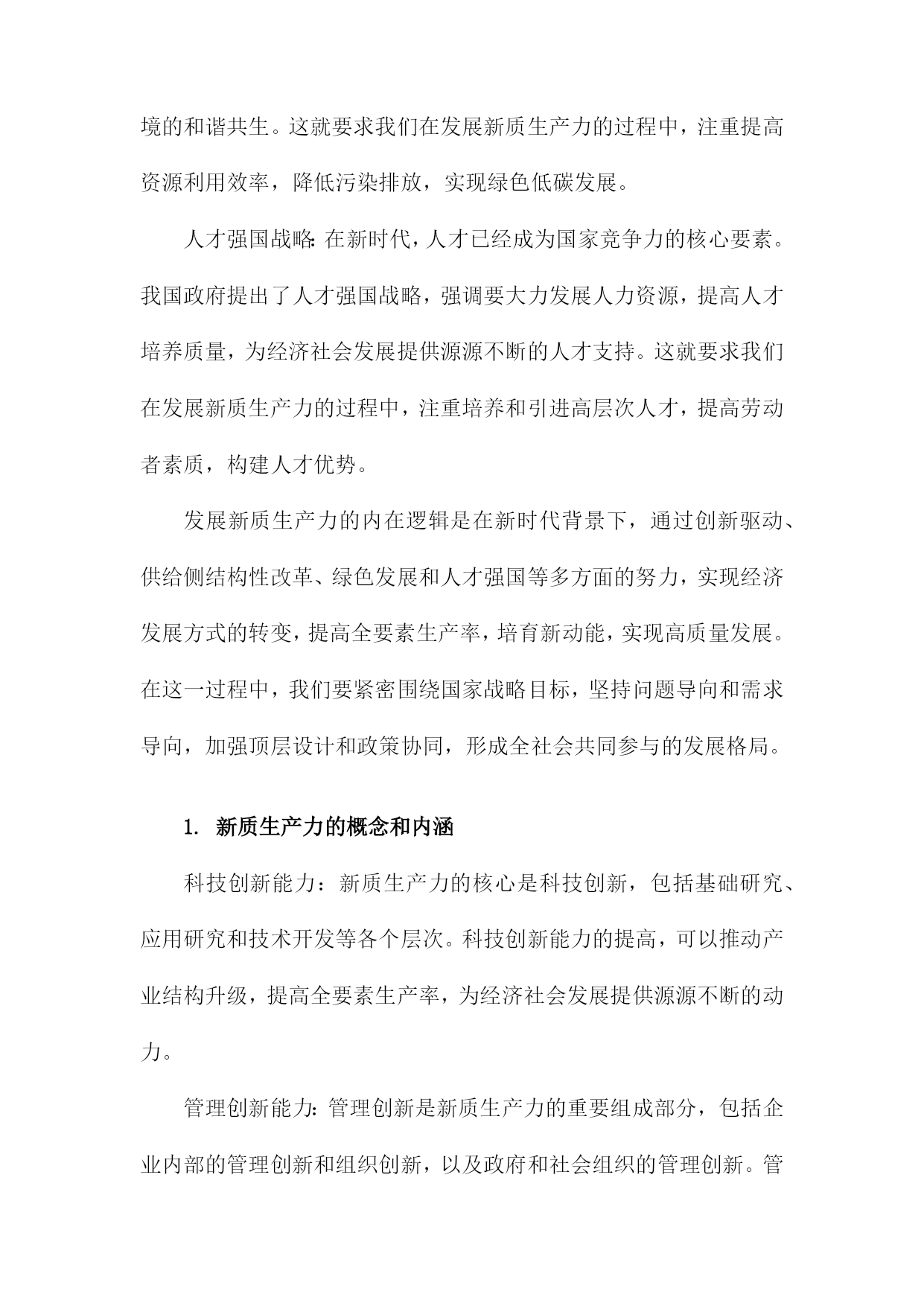 发展新质生产力的内在逻辑与实践进路一、发展新质生产力的内在逻辑发展新质生产力是实现经济持续健康发展的关键,在新时代背景下,我国经济发展正面临着许多新的挑战和机遇。为了应对这些挑战,提高经济增长质量和效益,我们需要深入研究发展新质生产力的内在逻辑,从而为我国经济发展提供有力的理论支撑和实践指导。创新驱动发展战略:在新时代,创新已经成为推动经济发展的核心动力。我国政府提出了创新驱动发展战略,旨在通过科技创新、制度创新、管理创新等多方面的努力,推动经济发展方式的转变,提高全要素生产率,培育新动能,实现高质量发展。供给侧结构性改革:为了适应新时代经济发展的要求,我国政府提出了供给侧结构性改革,着力优化供给体系,提高供给质量,满足人民群众日益增长的美好生活需要。这一改革要求我们在发展新质生产力的过程中,注重提高劳动生产率、资本生产率和社会生产率,实现供需两侧的协调发展。绿色发展理念:在新时代,环境保护和可持续发展已经成为全球共识。我国政府提出了绿色发展理念,强调在发展新质生产力的过程中,要坚持节约资源和保护环境的基本国策,实现经济发展与生态环境的和谐共生。这就要求我们在发展新质生产力的过程中,注重提高资源利用效率,降低污染排放,实现绿色低碳发展。人才强国战略:在新时代,人才已经成为国家竞争力的核心要素。我国政府提出了人才强国战略,强调要大力发展人力资源,提高人才培养质量,为经济社会发展提供源源不断的人才支持。这就要求我们在发展新质生产力的过程中,注重培养和引进高层次人才,提高劳动者素质,构建人才优势。发展新质生产力的内在逻辑是在新时代背景下,通过创新驱动、供给侧结构性改革、绿色发展和人才强国等多方面的努力,实现经济发展方式的转变,提高全要素生产率,培育新动能,实现高质量发展。在这一过程中,我们要紧密围绕国家战略目标,坚持问题导向和需求导向,加强顶层设计和政策协同,形成全社会共同参与的发展格局。1.新质生产力的概念和内涵科技创新能力:新质生产力的核心是科技创新,包括基础研究、应用研究和技术开发等各个层次。科技创新能力的提高,可以推动产业结构升级,提高全要素生产率,为经济社会发展提供源源不断的动力。管理创新能力:管理创新是新质生产力的重要组成部分,包括企业内部的管理创新和组织创新,以及政府和社会组织的管理创新。管理创新能够提高资源配置效率,降低生产成本,提高企业的竞争力。制度创新能力:制度创新是新质生产力的重要保障,包括政治制度、经济制度、文化制度等各个方面的创新。制度创新能够为经济社会发展提供良好的环境,激发市场主体活力,促进社会公平正义。人才创新能力:人才是新质生产力的重要支撑,包括人才培养、人才引进、人才激励等各个方面的创新。人才创新能力的提高,可以为经济社会发展提供充足的人力资源支持。文化创新能力:文化创新是新质生产力的重要驱动力,包括文化传承、文化创新、文化交流等各个方面的创新。文化创新能力的提高,可以为经济社会发展提供强大的精神动力和文化软实力。新质生产力是一个多维度、多层次的概念,涵盖了科技创新、管理创新、制度创新、人才创新和文化创新等多个方面。新质生产力的发展对于推动经济社会持续健康发展具有重要意义。2.新质生产力的发展动力和路径技术创新驱动。技术创新是新质生产力发展的核心动力,在全球化背景下,技术创新已经成为各国竞争的关键因素。企业需要不断进行技术研发,提高自主创新能力,以满足市场需求和保持竞争优势。政府也应加大对科技创新的支持力度,为企业提供良好的创新环境和政策支持,推动科技成果转化为实际生产力。管理创新提升。管理创新是实现新质生产力的重要途径,企业需要不断优化管理模式,提高管理效率,降低管理成本。这包括实施科学的组织结构、优化人力资源配置、改进流程管理、引入现代信息技术等。企业还需要加强与供应商、客户、合作伙伴等外部关系的管理,构建和谐的产业链生态,形成协同创新的局面。人才培养保障。人才是新质生产力发展的关键要素,企业需要重视人才培养,提高员工的综合素质和技能水平,为企业发展提供源源不断的人才支持。政府也应加大对教育、培训等领域的投入,培养更多的高素质人才,为新质生产力发展提供人力保障。市场导向调整。市场导向是新质生产力发展的内在要求,企业需要根据市场需求,调整产品结构和技术方向,开发具有竞争力的新产品和服务。政府也应加强对市场的引导和监管,维护公平竞争的市场秩序,为新质生产力发展创造良好的市场环境。政策支持引导。政府在推动新质生产力发展过程中,需要制定相应的政策措施,引导企业加大科技创新投入、优化产业结构、提高管理水平等方面的工作。政府还应加强对知识产权保护、金融支持、税收优惠等方面的政策扶持,为新质生产力发展提供有力的政策保障。新质生产力的发展动力和路径涉及技术创新、管理创