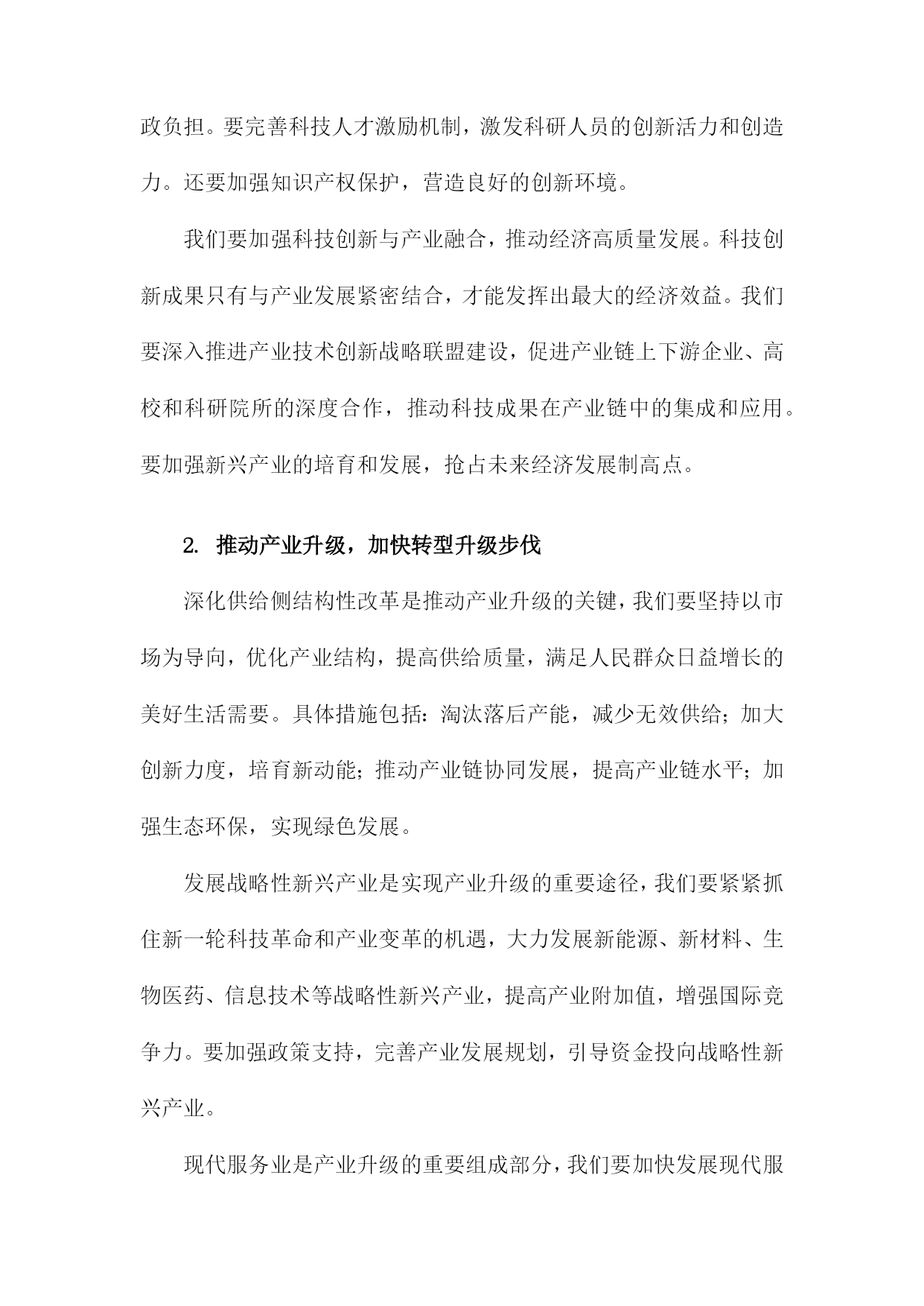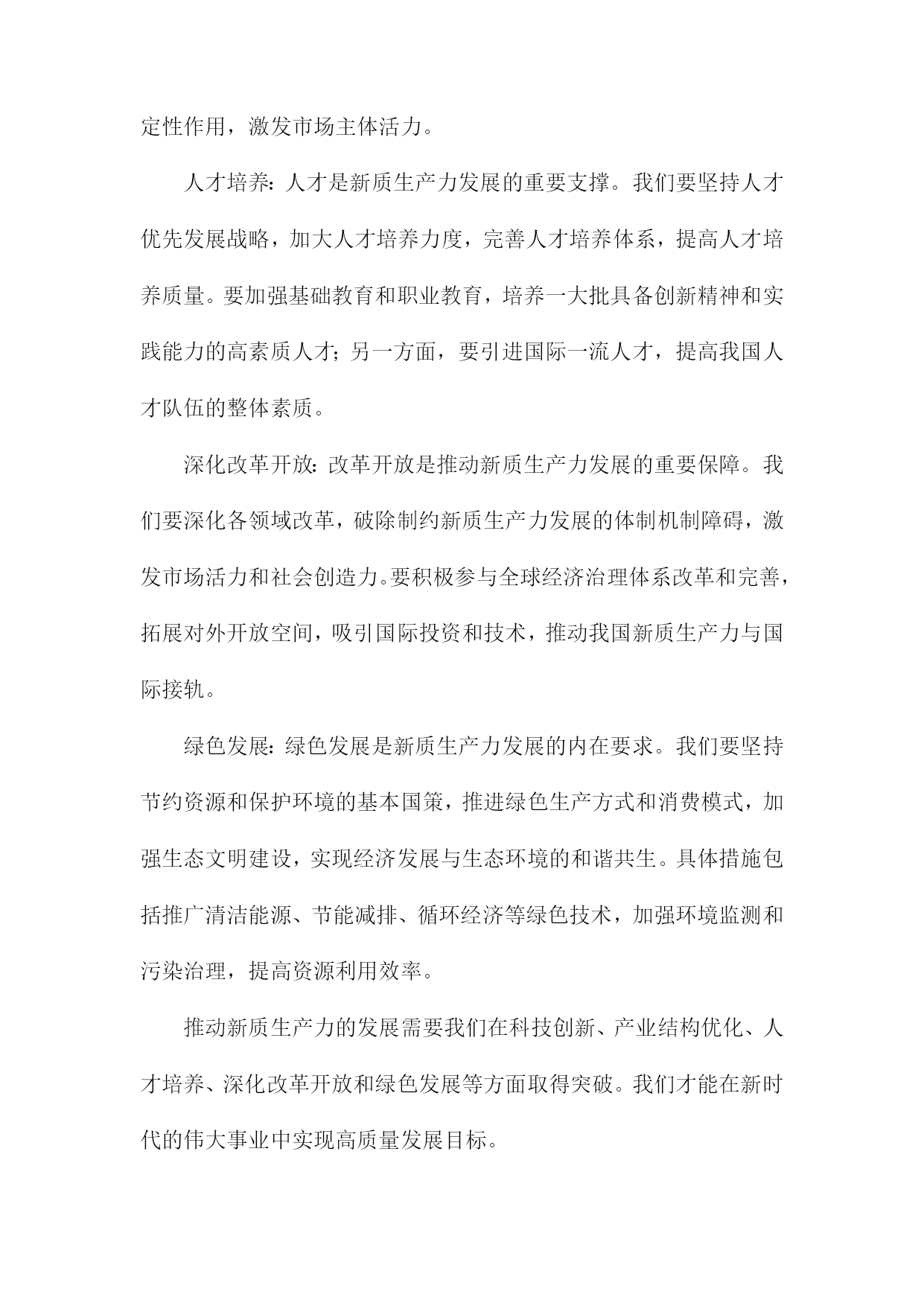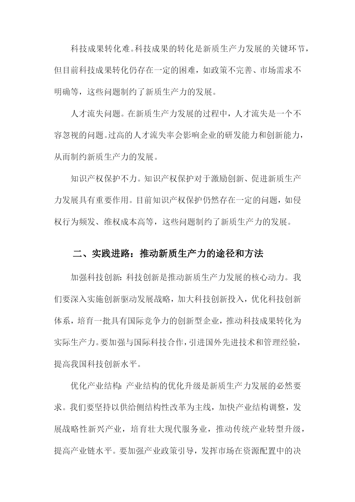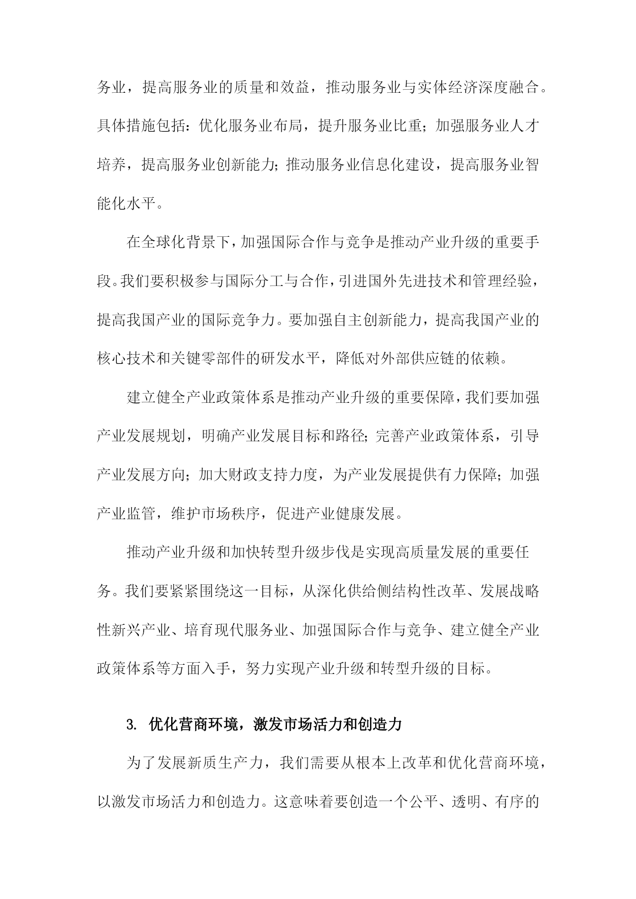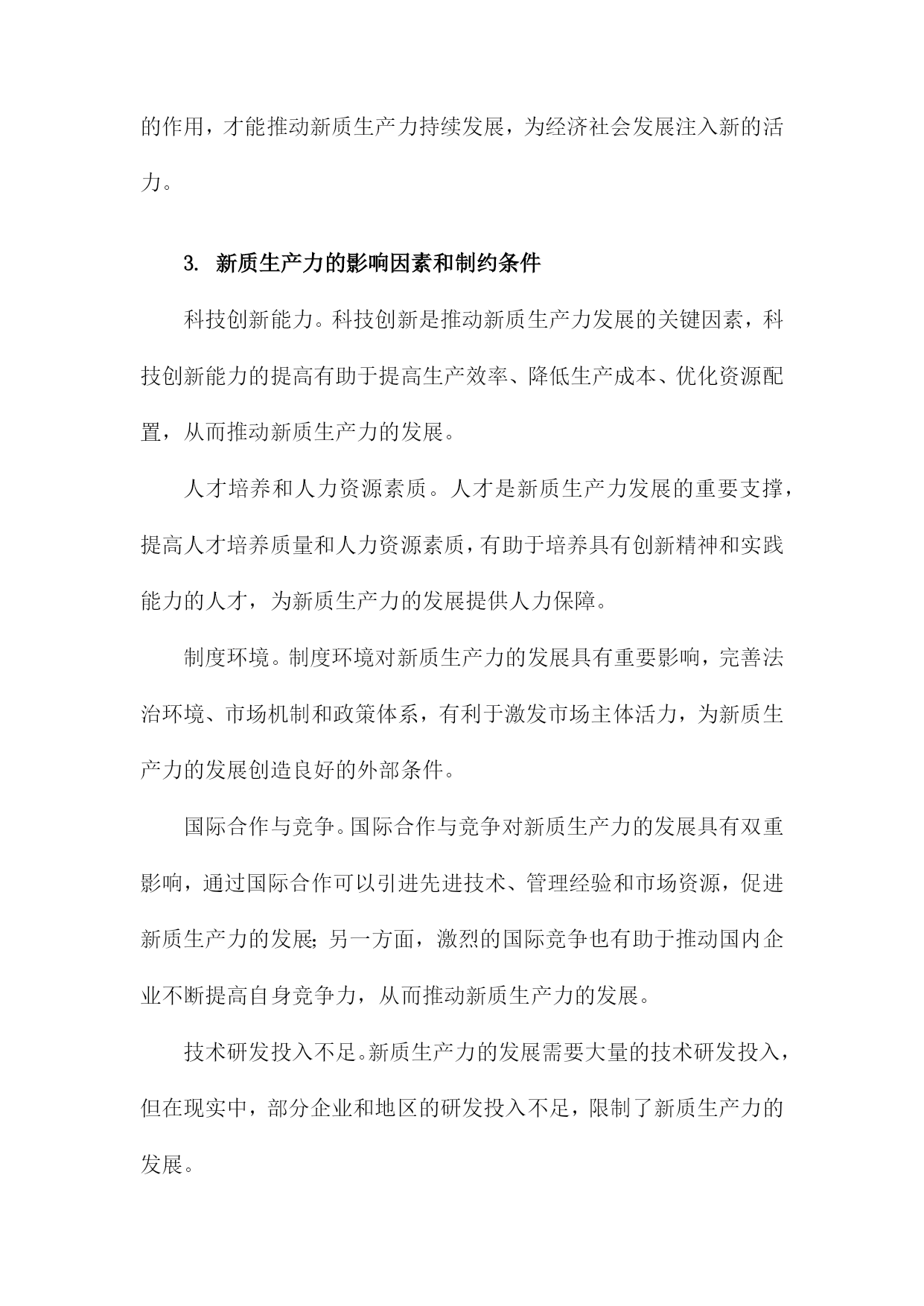 发展新质生产力的内在逻辑与实践进路一、发展新质生产力的内在逻辑发展新质生产力是实现经济持续健康发展的关键,在新时代背景下,我国经济发展正面临着许多新的挑战和机遇。为了应对这些挑战,提高经济增长质量和效益,我们需要深入研究发展新质生产力的内在逻辑,从而为我国经济发展提供有力的理论支撑和实践指导。创新驱动发展战略:在新时代,创新已经成为推动经济发展的核心动力。我国政府提出了创新驱动发展战略,旨在通过科技创新、制度创新、管理创新等多方面的努力,推动经济发展方式的转变,提高全要素生产率,培育新动能,实现高质量发展。供给侧结构性改革:为了适应新时代经济发展的要求,我国政府提出了供给侧结构性改革,着力优化供给体系,提高供给质量,满足人民群众日益增长的美好生活需要。这一改革要求我们在发展新质生产力的过程中,注重提高劳动生产率、资本生产率和社会生产率,实现供需两侧的协调发展。绿色发展理念:在新时代,环境保护和可持续发展已经成为全球共识。我国政府提出了绿色发展理念,强调在发展新质生产力的过程中,要坚持节约资源和保护环境的基本国策,实现经济发展与生态环境的和谐共生。这就要求我们在发展新质生产力的过程中,注重提高资源利用效率,降低污染排放,实现绿色低碳发展。人才强国战略:在新时代,人才已经成为国家竞争力的核心要素。我国政府提出了人才强国战略,强调要大力发展人力资源,提高人才培养质量,为经济社会发展提供源源不断的人才支持。这就要求我们在发展新质生产力的过程中,注重培养和引进高层次人才,提高劳动者素质,构建人才优势。发展新质生产力的内在逻辑是在新时代背景下,通过创新驱动、供给侧结构性改革、绿色发展和人才强国等多方面的努力,实现经济发展方式的转变,提高全要素生产率,培育新动能,实现高质量发展。在这一过程中,我们要紧密围绕国家战略目标,坚持问题导向和需求导向,加强顶层设计和政策协同,形成全社会共同参与的发展格局。1.新质生产力的概念和内涵科技创新能力:新质生产力的核心是科技创新,包括基础研究、应用研究和技术开发等各个层次。科技创新能力的提高,可以推动产业结构升级,提高全要素生产率,为经济社会发展提供源源不断的动力。管理创新能力:管理创新是新质生产力的重要组成部分,包括企业内部的管理创新和组织创新,以及政府和社会组织的管理创新。管理创新能够提高资源配置效率,降低生产成本,提高企业的竞争力。制度创新能力:制度创新是新质生产力的重要保障,包括政治制度、经济制度、文化制度等各个方面的创新。制度创新能够为经济社会发展提供良好的环境,激发市场主体活力,促进社会公平正义。人才创新能力:人才是新质生产力的重要支撑,包括人才培养、人才引进、人才激励等各个方面的创新。人才创新能力的提高,可以为经济社会发展提供充足的人力资源支持。文化创新能力:文化创新是新质生产力的重要驱动力,包括文化传承、文化创新、文化交流等各个方面的创新。文化创新能力的提高,可以为经济社会发展提供强大的精神动力和文化软实力。新质生产力是一个多维度、多层次的概念,涵盖了科技创新、管理创新、制度创新、人才创新和文化创新等多个方面。新质生产力的发展对于推动经济社会持续健康发展具有重要意义。2.新质生产力的发展动力和路径技术创新驱动。技术创新是新质生产力发展的核心动力,在全球化背景下,技术创新已经成为各国竞争的关键因素。企业需要不断进行技术研发,提高自主创新能力,以满足市场需求和保持竞争优势。政府也应加大对科技创新的支持力度,为企业提供良好的创新环境和政策支持,推动科技成果转化为实际生产力。管理创新提升。管理创新是实现新质生产力的重要途径,企业需要不断优化管理模式,提高管理效率,降低管理成本。这包括实施科学的组织结构、优化人力资源配置、改进流程管理、引入现代信息技术等。企业还需要加强与供应商、客户、合作伙伴等外部关系的管理,构建和谐的产业链生态,形成协同创新的局面。人才培养保障。人才是新质生产力发展的关键要素,企业需要重视人才培养,提高员工的综合素质和技能水平,为企业发展提供源源不断的人才支持。政府也应加大对教育、培训等领域的投入,培养更多的高素质人才,为新质生产力发展提供人力保障。市场导向调整。市场导向是新质生产力发展的内在要求,企业需要根据市场需求,调整产品结构和技术方向,开发具有竞争力的新产品和服务。政府也应加强对市场的引导和监管,维护公平竞争的市场秩序,为新质生产力发展创造良好的市场环境。政策支持引导。政府在推动新质生产力发展过程中,需要制定相应的政策措施,引导企业加大科技创新投入、优化产业结构、提高管理水平等方面的工作。政府还应加强对知识产权保护、金融支持、税收优惠等方面的政策扶持,为新质生产力发展提供有力的政策保障。新质生产力的发展动力和路径涉及技术创新、管理创