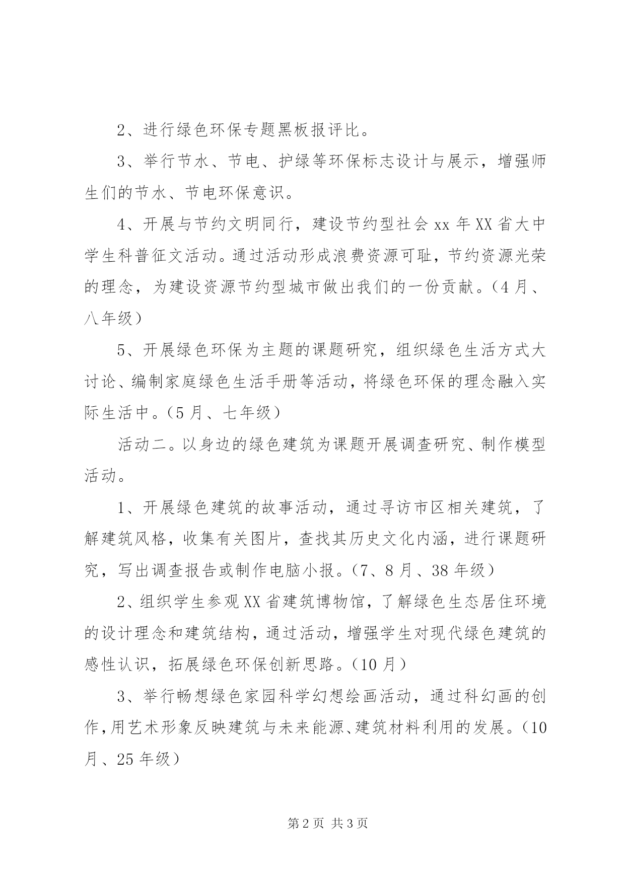 第PAGE\*Arabic\*MERGEFORMAT3页共NUMPAGES\*MERGEFORMAT3页学校科技实践活动方案一、活动目标:以迎世博,让绿色生活方式走进徐汇千万学子家庭活动为契机,结合我校科技建筑模型特色,开展绿色建筑,和谐家园为主题的系列活动,通过活动,提高学生的环保意识,树立正确的环境价值观、学会科学研究的方法,提高实践能力,培养自主探索,开拓创新的科学精神。二、活动阶段安排:1、xx年年3月活动启动2、xx年年3月11月活动实施;3、xx年年11月底活动总结。三、活动内容和形式:一、结合课堂教学,发挥基础学科的先导作用,在各年级选择重点渗透的学科开展环境教育:《环境教育》拓展课,综合科学、地理、语文、生物、物理、政治等等,将人口与环境、环境的污染与保护、节约资源等环保知识融入教学内容中。二、开展主题系列活动:活动一:让绿色走进校园(3月)1、组织全校师生开展绿化角评比活动,美化学习、办公环境。2、进行绿色环保专题黑板报评比。3、举行节水、节电、护绿等环保标志设计与展示,增强师生们的节水、节电环保意识。4、开展与节约文明同行,建设节约型社会xx年XX省大中学生科普征文活动。通过活动形成浪费资源可耻,节约资源光荣的理念,为建设资源节约型城市做出我们的一份贡献。(4月、八年级)5、开展绿色环保为主题的课题研究,组织绿色生活方式大讨论、编制家庭绿色生活手册等活动,将绿色环保的理念融入实际生活中。(5月、七年级)活动二。以身边的绿色建筑为课题开展调查研究、制作模型活动。1、开展绿色建筑的故事活动,通过寻访市区相关建筑,了解建筑风格,收集有关图片,查找其历史文化内涵,进行课题研究,写出调查报告或制作电脑小报。(7、8月、38年级)2、组织学生参观XX省建筑博物馆,了解绿色生态居住环境的设计理念和建筑结构,通过活动,增强学生对现代绿色建筑的感性认识,拓展绿色环保创新思路。(10月)3、举行畅想绿色家园科学幻想绘画活动,通过科幻画的创作,用艺术形象反映建筑与未来能源、建筑材料利用的发展。(10月、25年级)4、举行畅想绿色家园环保创意制作活动,组织学生利用废旧物品,设计并制做未来绿色家园的建筑模型,让资源综合利用、循环利用的理念渗透在建筑设计中,并撰写设计的理念。(1011月、6年级)