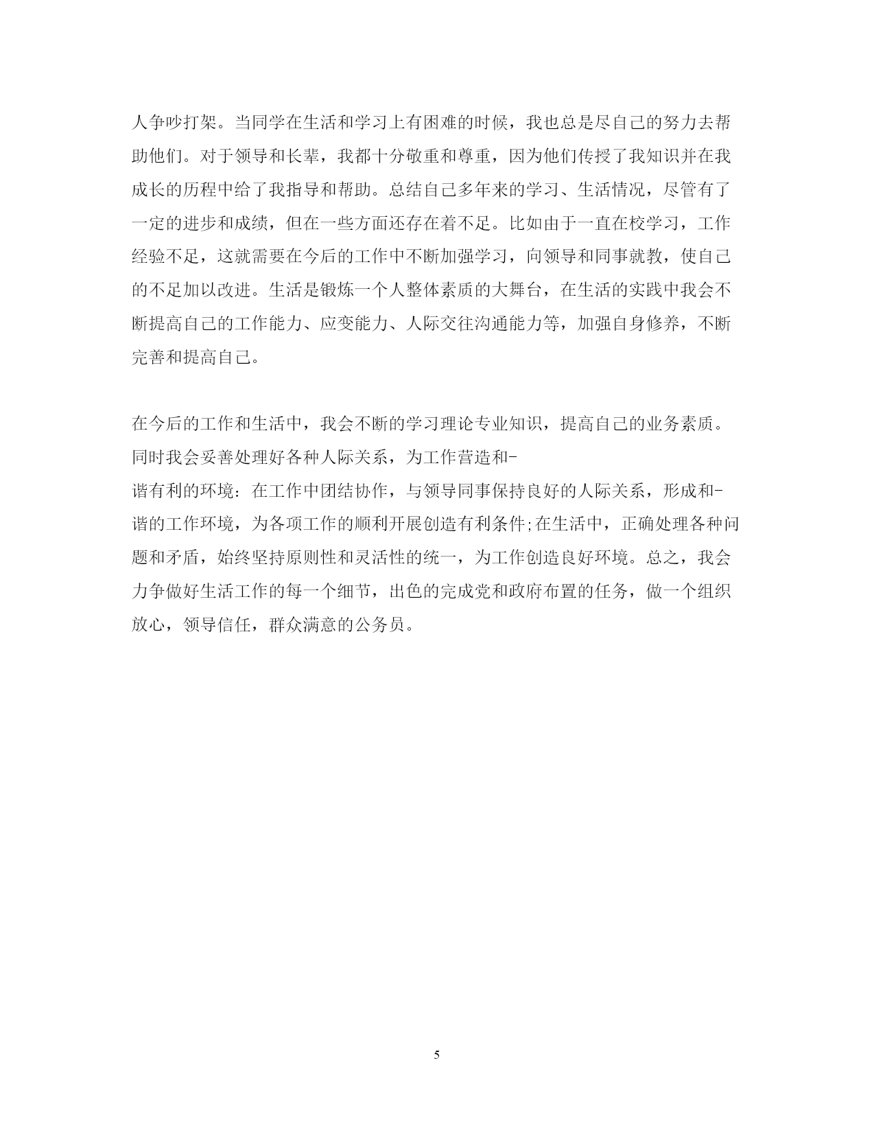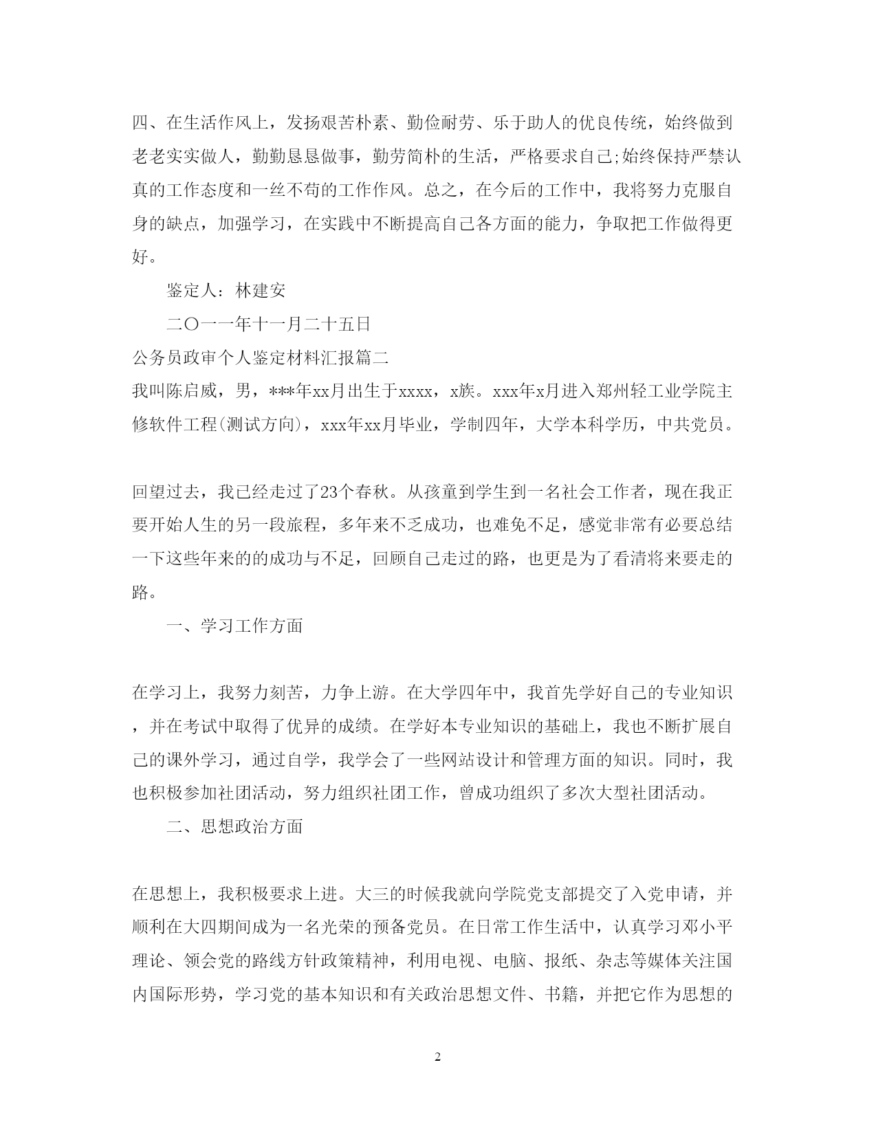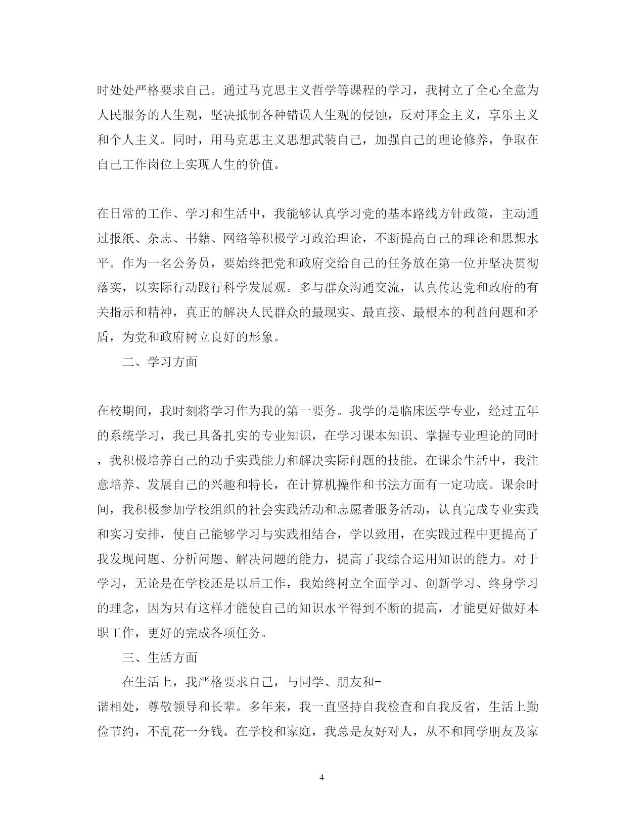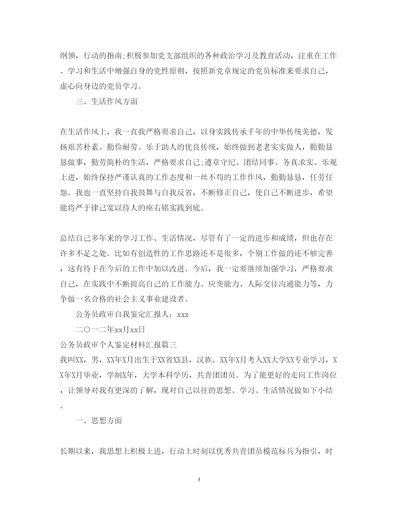 此资料由网络收集而来,如有侵权请告知上传者立即删除。资料共分享,我们负责传递知识。PAGEPAGE5公务员政审个人鉴定材料汇报政审对于公务员来说是是十分必要的!那么你要怎么去写公务员政审个人鉴定材料汇报呢?下面由本小编精心整理的公务员政审个人鉴定材料汇报,希望可以帮到你哦!公务员政审个人鉴定材料汇报篇一我叫林建安,男,1983年7月出生于贵州省镇远县,苗族。20xx年6月毕业于贵州师范大学计算机科学与技术专业。20xx年6月至今在镇远县烟草专卖局(分公司)任职。工作以来,在领导的关怀下,通过不懈努力认真的完成各项任务,也使自己各方面的能力有了进一步的提高。现对自己以往的思想、学习、工作、生活情况做如下小结:一、在思想上,我要求上进,严格要求自己,在日常的工作、学习和生活中,能够认真贯执行彻党的基本路线方针政策。平时通过新闻、报纸、杂志、书籍、网络等学习政治理论,并积极投入到具体实践当中。二、在学习上,我积极进取,在工作中利用相关资源不断学习烟草专卖法律法规,同时向老同志学习丰富的工作经验。今后我将在生活和工作中秉承“活到老,学到老”的理念,不断加强学习,努力提升自身的能力。三、在工作上,我本着团结同志、顾全大局、作风严谨、虚心好学、积极向上的原则,充分发挥不怕麻烦,不怕吃苦、虚心请教、主动学习。参加工作以来我先后担任过保管员(20xx年)、验级员(20xx年)、内管员(20xx年)、证件案件管理员(20xx年),通过努力学习加上自我摸索和实践相结合的方式,较好的完成了领导交办的各项工作。四、在生活作风上,发扬艰苦朴素、勤俭耐劳、乐于助人的优良传统,始终做到老老实实做人,勤勤恳恳做事,勤劳简朴的生活,严格要求自己;始终保持严禁认真的工作态度和一丝不苟的工作作风。总之,在今后的工作中,我将努力克服自身的缺点,加强学习,在实践中不断提高自己各方面的能力,争取把工作做得更好。鉴定人:林建安二〇一一年十一月二十五日公务员政审个人鉴定材料汇报篇二我叫陈启威,男,***年xx月出生于xxxx,x族。xxx年x月进入郑州轻工业学院主修软件工程(测试方向),xxx年xx月毕业,学制四年,大学本科学历,中共党员。回望过去,我已经走过了23个春秋。从孩童到学生到一名社会工作者,现在我正要开始人生的另一段旅程,多年来不乏成功,也难免不足,感觉非常有必要总结一下这些年来的的成功与不足,回顾自己走过的路,也更是为了看清将来要走的路。一、学习工作方面在学习上,我努力刻苦,力争上游。在大学四年中,我首先学好自己的专业知识,并在考试中取得了优异的成绩。在学好本专业知识的基础上,我也不断扩展自己的课外学习,通过自学,我学会了一些网站设计和管理方面的知识。同时,我也积极参加社团活动,努力组织社团工作,曾成功组织了多次大型社团活动。二、思想政治方面在思想上,我积极要求上进。大三的时候我就向学院党支部提交了入党申请,并顺利在大四期间成为一名光荣的预备党员。在日常工作生活中,认真学习邓小平理论、领会党的路线方针政策精神,利用电视、电脑、报纸、杂志等媒体关注国内国际形势,学习党的基本知识和有关政治思想文件、书籍,并把它作为思想的纲领,行动的指南;积极参加党支部组织的各种政治学习及教育活动,注重在工作、学习和生活中增强自身的党性原则,按照新党章规定的党员标准来要求自己,虚心向身边的党员学习。三、生活作风方面在生活作风上,我一直我严格要求自己,以身实践传承千年的中华传统美德,发扬艰苦朴素、勤俭耐劳、乐于助人的优良传统,始终做到老老实实做人,勤勤恳恳做事,勤劳简朴的生活,严格要求自己;遵章守纪、团结同事、务真求实、乐观上进,始终保持严谨认真的工作态度和一丝不苟的工作作风,勤勤恳恳,任劳任怨。我也一直坚持自我鼓舞与自我反省,不断修正自己,使自己不断进步,希望能将严于律己宽以待人的座右铭实践到底。总结自己多年来的学习工作、生活情况,尽管有了一定的进步和成绩,但也存在许多不足之处。比如有创造性的工作思路还不是很多,个别工作做的还不够完善,这有待于在今后的工作中加以改进。今后,我一定要继续加强学习,严格要求自己,在实践中不断提高自己的工作能力、应变能力、人际交往沟通能力等,力争做一名合格的社会主义事业建设者。公务员政审自我鉴定汇报人:xxx二○一二年xx月xx日公务员政审个人鉴定材料汇报篇三我叫XX,男,XX年X月出生于XX省XX县,汉族。XX年X月考入XX大学XX专业学习,XX年X月毕业,学制X年,大学本科学历,共青团团员。为了能更好的走向工作岗位,让领导对我有更深的了解,现对自己以往的思想、学习、生活情况做如下小结。一、思想方面长期以来,我思想上积极上进,行动上时刻以优秀共青团员模范标兵为指引,时时处处严格要求自己。