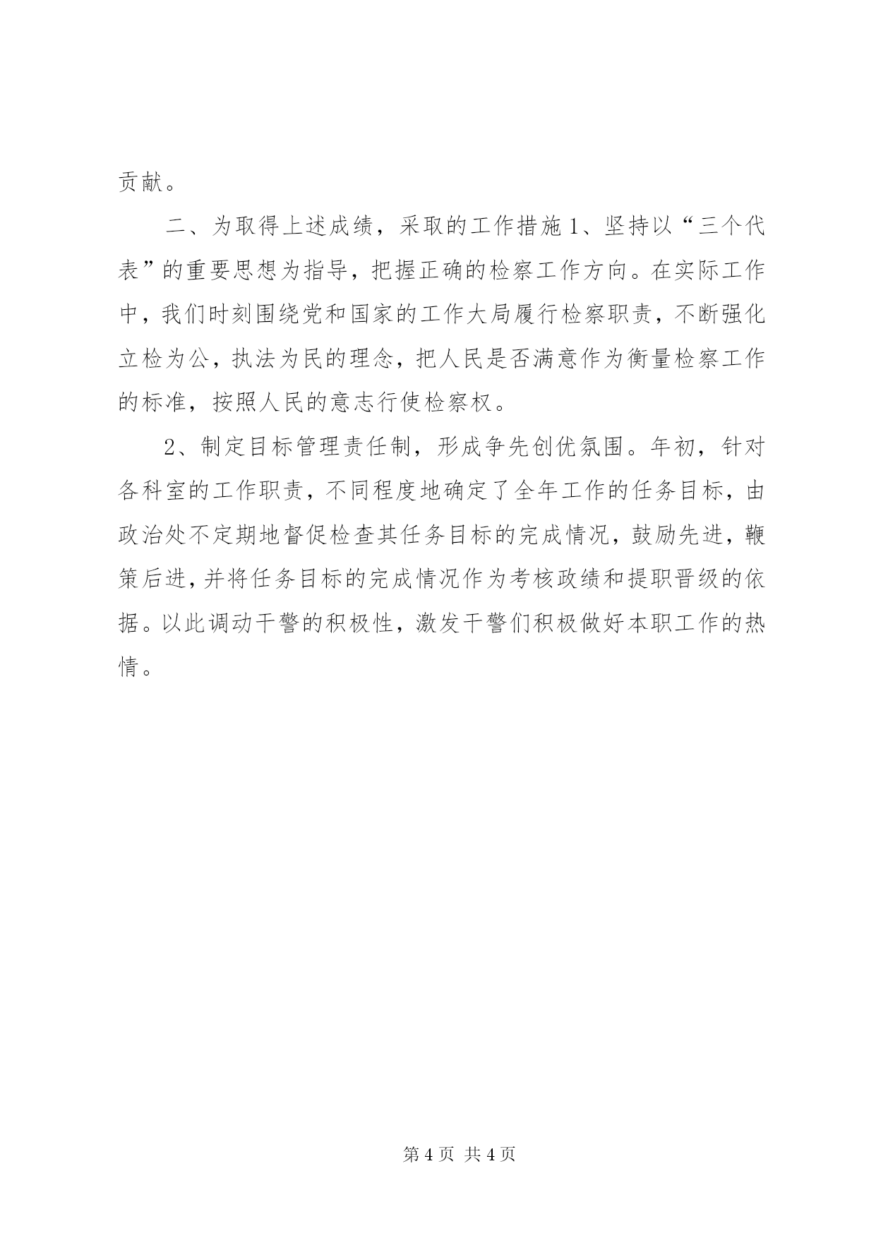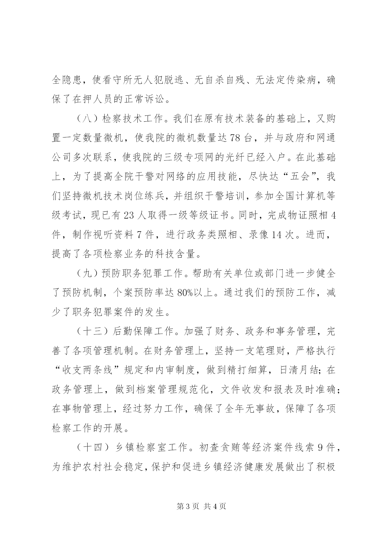 第PAGE\*Arabic\*MERGEFORMAT4页共NUMPAGES\*MERGEFORMAT4页检察院公务员工作总结市委和上级院的正确领导下,在市人大及其常委会的监督下,认真学习贯彻党的十六大和十六届三中、四中全会精神,按照“三个代表”的要求,坚持立检为公,执法为民的思想,突出“强化法律监督,维护公平正义”的主题,紧紧围绕发展、稳定的工作大局,认真履行检察职责,经过全院干警的共同努力,较圆满地完成了市委和上级院交给的各项工作任务。一、工作成绩(一)反贪污贿赂检察工作。上半年共受理各类贪污贿赂等经济案件线索8件12人,经过初查立案8件12人,其中大案2件6人。在所立案件中,贪贿案4件4人,占立案数的50%。已结案6件10人。通过办案,为国家挽回直接经济损失1000余万元。(二)渎职侵权检察工作。共初查渎职侵权案件1件,立案1件1人,依法查处公安干警徇私枉法案件。(三)侦查监督工作。共受理审查批捕案件104件146人,经过审查,批准逮捕103件140人,不批准逮捕1件6人,平均办案时限1.2天,批捕与不批捕的准确率均达到100%。坚持提前介入制度,对重大刑事案件提前介入21件28人,适时引导公安机关侦查取证;通过立案监督,办结刑事立案监督案件3件5人,其中办结公安干警徇私枉法案件1件1人;通过侦查监督,防错1件3人。(四)公诉工作。共受理移送审查起诉案件133件183人,经审查,提起公诉112件156人;作出不起诉8件8人;报送XX市检察院审查起诉10件14人。平均办案时限为4.78天,起诉的准确率达到100%。同时,在审查起诉环节改变定性1件2人,追漏罪漏犯1件1人。(五)控告申诉检察工作。共受理群众举报和来信来访29件(次),其中,来信24件(次),来访5件(人)。对群众举报和来信来访,都及时做出处理,化解了矛盾,消除了不安定因素,防止了重复上访和越级上访。坚持了检察长接待周制度,检察长接待群众来访5件10人。对举报的线索初查3件,其中1件移交侦查部门。(六)民事、行政检察工作。共受理不服市法院判决或裁定的民事、行政申诉案件7件,经调查,立案2件,息诉5件。在所立的2件民事、行政申诉案件中,提请XX市检察院抗诉1件,建议法院再审1件。(七)监所检察工作。共派员驻看守所检察126天,科长到所检查83次,主管检察长到所检查12次,检察长到所检查2次,重大节日协同政法有关部门联合防范检查3次。从中发现并纠正各类违法问题1件1人,即为超期羁押1件1人。同时,加强了对看守所的安全防范检察和管理教育活动检察,及时消除了不安全隐患,使看守所无人犯脱逃、无自杀自残、无法定传染病,确保了在押人员的正常诉讼。(八)检察技术工作。我们在原有技术装备的基础上,又购置一定数量微机,使我院的微机数量达78台,并与政府和网通公司多次联系,使我院的三级专项网的光纤已经入户。在此基础上,为了提高全院干警对网络的应用技能,尽快达“五会”,我们坚持微机技术岗位练兵,并组织干警培训,参加全国计算机等级考试,现已有23人取得一级等级证书。同时,完成物证照相4件,制作视听资料7件,进行政务类照相、录像14次。进而,提高了各项检察业务的科技含量。(九)预防职务犯罪工作。帮助有关单位或部门进一步健全了预防机制,个案预防率达80%以上。通过我们的预防工作,减少了职务犯罪案件的发生。(十三)后勤保障工作。加强了财务、政务和事务管理,完善了各项管理机制。在财务管理上,坚持一支笔理财,严格执行“收支两条线”规定和内审制度,做到精打细算,日清月结;在政务管理上,做到档案管理规范化,文件收发和报表及时准确;在事物管理上,经过努力工作,确保了全年无事故,保障了各项检察工作的开展。(十四)乡镇检察室工作。初查贪贿等经济案件线索9件,为维护农村社会稳定,保护和促进乡镇经济健康发展做出了积极贡献。二、为取得上述成绩,采取的工作措施1、坚持以“三个代表”的重要思想为指导,把握正确的检察工作方向。在实际工作中,我们时刻围绕党和国家的工作大局履行检察职责,不断强化立检为公,执法为民的理念,把人民是否满意作为衡量检察工作的标准,按照人民的意志行使检察权。2、制定目标管理责任制,形成争先创优氛围。年初,针对各科室的工作职责,不同程度地确定了全年工作的任务目标,由政治处不定期地督促检查其任务目标的完成情况,鼓励先进,鞭策后进,并将任务目标的完成情况作为考核政绩和提职晋级的依据。以此调动干警的积极性,激发干警们积极做好本职工作的热情。