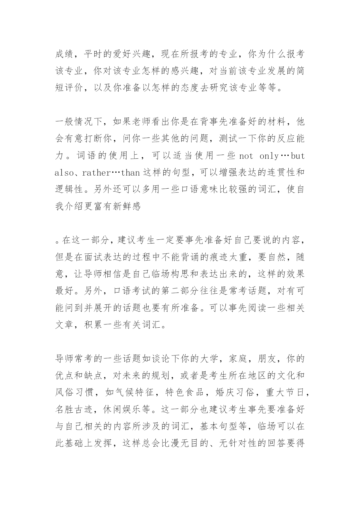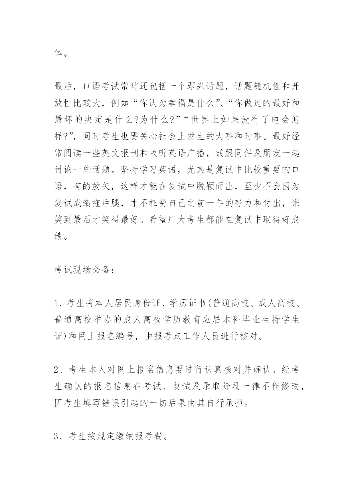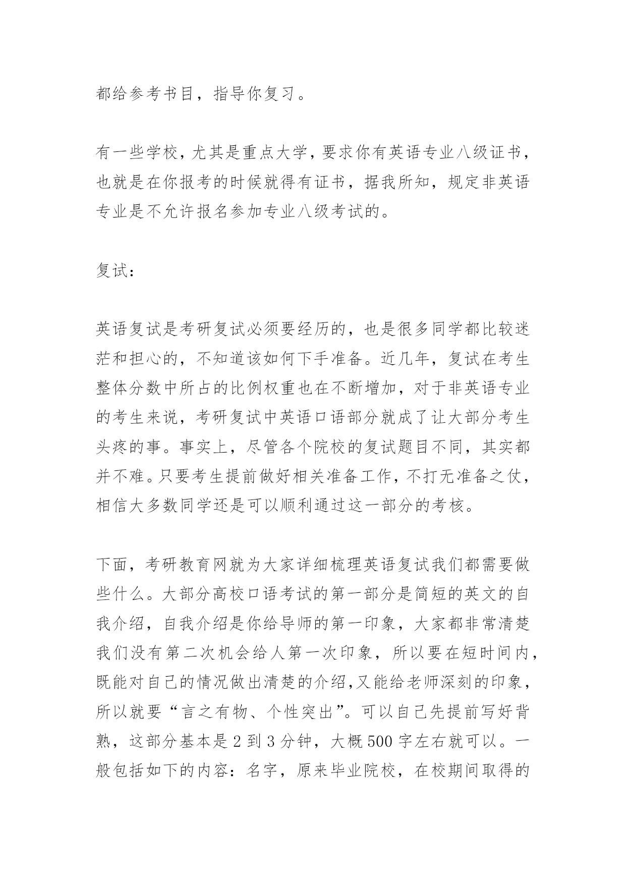 考英语研究生要做些什么考前准备:英语研究生有学术型,专业型两种。考研是可以成功的,而且没什么要求,限制的条件(但是确保你要报考的学校没有要求你本科是否是英语专业)。英语专业研究生有两种,学术型,专业型。总体来说专硕中跨专业的学生比较多,因为专硕不考二外(德语,法语,日语等其中一种)。对于非英语专业,二外的学习很难。专硕考试包括,政治,翻译硕士英语,翻译基础,汉语写作与百科知识(后两个是专业课)。因为专硕不考二外,有很多夸专业的同学以及毕业工作很久,扔掉二外,学不起来二外的人都会选择专业型。因此有好多学校不招应届生,如2012年南开大学,厦门大学等,选择学校时要注意是否招取应届本科生。学术型考试包括政治,二外(选择的时候慎重,假如西班牙语等,只有专门的外国语学校才考的),基础英语,综合英语(后两个是专业课)。这两个方向,政治是教育部命题,其余三科都是学校自主命题,专业硕士,大部分学校不给予参考书目。学术型硕士,几乎都给参考书目,指导你复习。有一些学校,尤其是重点大学,要求你有英语专业八级证书,也就是在你报考的时候就得有证书,据我所知,规定非英语专业是不允许报名参加专业八级考试的。复试:英语复试是考研复试必须要经历的,也是很多同学都比较迷茫和担心的,不知道该如何下手准备。近几年,复试在考生整体分数中所占的比例权重也在不断增加,对于非英语专业的考生来说,考研复试中英语口语部分就成了让大部分考生头疼的事。事实上,尽管各个院校的复试题目不同,其实都并不难。只要考生提前做好相关准备工作,不打无准备之仗,相信大多数同学还是可以顺利通过这一部分的考核。下面,考研教育网就为大家详细梳理英语复试我们都需要做些什么。大部分高校口语考试的第一部分是简短的英文的自我介绍,自我介绍是你给导师的第一印象,大家都非常清楚我们没有第二次机会给人第一次印象,所以要在短时间内,既能对自己的情况做出清楚的介绍,又能给老师深刻的印象,所以就要“言之有物、个性突出”。可以自己先提前写好背熟,这部分基本是2到3分钟,大概500字左右就可以。一般包括如下的内容:名字,原来毕业院校,在校期间取得的成绩,平时的爱好兴趣,现在所报考的专业,你为什么报考该专业,你对该专业怎样的感兴趣,对当前该专业发展的简短评价,以及你准备以怎样的态度去研究该专业等等。一般情况下,如果老师看出你是在背事先准备好的材料,他会有意打断你,问你一些其他的问题,测试一下你的反应能力。词语的使用上,可以适当使用一些notonly…butalso、rather…than这样的句型,可以增强表达的连贯性和逻辑性。另外还可以多用一些口语意味比较强的词汇,使自我介绍更富有新鲜感。在这一部分,建议考生一定要事先准备好自己要说的内容,但是在面试表达的过程中不能背诵的痕迹太重,要自然,随意,让导师相信是自己临场构思和表达出来的,这样的效果最好。另外,口语考试的第二部分往往是常考话题,对有可能问到并展开的话题也要有所准备。可以事先阅读一些相关文章,积累一些有关词汇。导师常考的一些话题如谈论下你的大学,家庭,朋友,你的优点和缺点,对未来的规划,或者是考生所在地区的文化和风俗习惯,如气候特征,特色食品,婚庆习俗,重大节日,名胜古迹,休闲娱乐等。这一部分也建议考生事先要准备好与自己相关的内容所涉及的词汇,基本句型等,临场可以在此基础上发挥,这样总会比漫无目的、无针对性的回答要得体。最后,口语考试常常还包括一个即兴话题,话题随机性和开放性比较大,例如“你认为幸福是什么”、“你做过的最好和最坏的决定是什么?为什么?”“世界上如果没有了电会怎样?”,同时考生也要关心社会上发生的大事和时事。最好经常阅读一些英文报刊和收听英语广播,或跟同伴及朋友一起讨论一些话题。坚持学习英语,尤其是复试中比较重要的口语,有的放矢,这样才能在复试中脱颖而出,至少不会因为复试成绩拖后腿,才不枉费自己之前一年的努力和付出,谁笑到最后才笑得最好。希望广大考生都能在复试中取得好成绩。考试现场必备:1、考生将本人居民身份证、学历证书(普通高校、成人高校、普通高校举办的成人高校学历教育应届本科毕业生持学生证)和网上报名编号,由报考点工作人员进行核对。2、考生本人对网上报名信息要进行认真核对并确认。经考生确认的报名信息在考试、复试及录取阶段一律不作修改,因考生填写错误引起的一切后果由其自行承担。3、考生按规定缴纳报考费。(考生办理报考手续缴纳报考费后,不再退还。选择报考点为北京、天津、河北、河南、四川、湖南、广西、安徽的考生,缴费方式以省级招生管理机构规定为准。注:湖南只在10月10日—31日期间支持网上支付。)