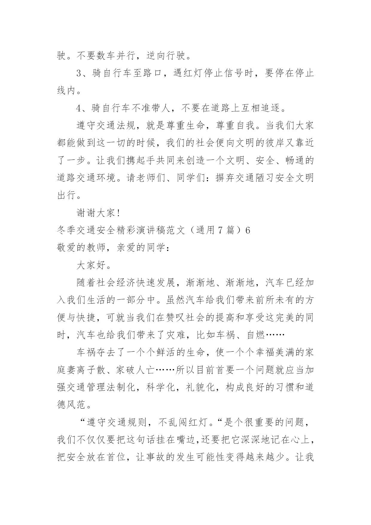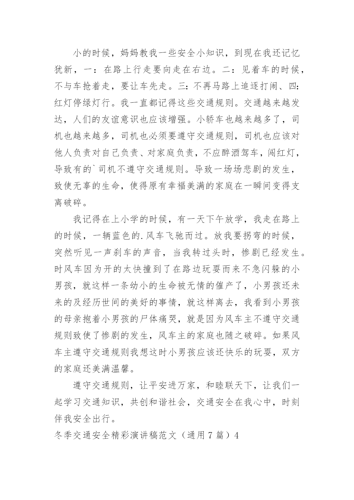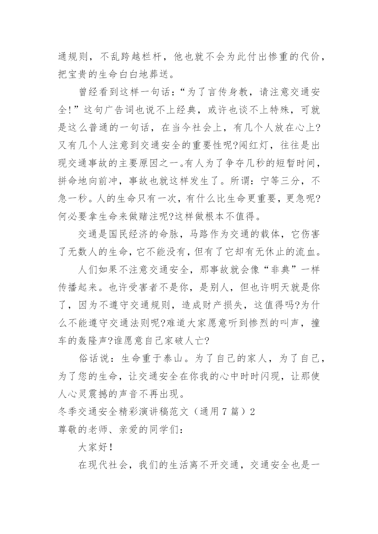 冬季交通安全精彩演讲稿冬季交通安全精彩演讲稿范文(通用7篇)演讲稿是在一定的场合,面对一定的听众,演讲人围绕着主题讲话的文稿。在现实社会中,很多地方都会使用到演讲稿,相信许多人会觉得演讲稿很难写吧,以下是小编为大家整理的冬季交通安全精彩演讲稿范文(通用7篇),欢迎大家借鉴与参考,希望对大家有所帮助。冬季交通安全精彩演讲稿范文(通用7篇)1亲爱的老师、同学们:大家好!生命是唯一的,是宝贵的,世界因为有了生命而变得精彩。您的生命,您珍惜吗?要想生命得到保障,请您遵守交通规则。交通事故时时刻刻都会发生,它像颗威力十足的'炸弹,一时大意,这颗埋伏在我们生活中的炸弹就会爆炸,炸得家庭破碎,炸得人心悲苦。记得我曾经在报纸上看到这样一则报道,我当时惊呆了。一位市民,因为要赶着去上班,而他必须绕过栏杆才能坐车,无奈之下,他情非得已地跨过栏杆。这时,突然,一辆卡车直奔而来,在这千钧一发的时候,只听“啊”的一声尖叫,这位市民被车撞得惨不忍睹,面目全非。当他被送到医院时,早已奄奄一息了。家属为此伤心欲绝。如果他当初能遵守交通规则,不乱跨越栏杆,他也就不会为此付出惨重的代价,把宝贵的生命白白地葬送。曾经看到这样一句话:“为了言传身教,请注意交通安全!”这句广告词也说不上经典,或许也谈不上特殊,可就是这么普通的一句话,在当今社会上,有几个人放在心上?又有几个人注意到交通安全的重要性呢?闯红灯,往往是出现交通事故的主要原因之一。有人为了争夺几秒的短暂时间,拼命地向前冲,事故也就这样发生了。所谓:宁等三分,不急一秒。人的生命只有一次,有什么比生命更重要,更急呢?何必要拿生命来做赌注呢?这样做根本不值得。交通是国民经济的命脉,马路作为交通的载体,它伤害了无数人的生命,它不能没有,但有了它却有无休止的流血。人们如果不注意交通安全,那事故就会像“非典”一样传播起来。也许受害者不是你,是别人,但也许明天就是你了,因为不遵守交通规则,造成财产损失,这值得吗?为什么不能遵守交通法则呢?难道大家愿意听到惨烈的叫声,撞车的轰隆声?谁愿意自己家破人亡?俗话说:生命重于泰山。为了自己的家人,为了自己,为了您的生命,让交通安全在你我的心中时时闪现,让那使人心灵震撼的声音不再出现。冬季交通安全精彩演讲稿范文(通用7篇)2尊敬的老师、亲爱的同学们:大家好!在现代社会,我们的生活离不开交通,交通安全也是一个不容忽视的问题,必须言出必行,从我做起。然而,有些人不注意交通安全。你有没有想过,一点点的疏忽,可能会让你后悔一辈子?记得有一次,我从学校走回家的路上,突然听到不远处有“嘘——”的紧急刹车声和撞车声。听说一辆校车和一辆转弯的车相撞,车头撞上了校车尾部,校车的油漆被撞掉了,有的`变形了,车的大灯也下来了。当时我的心猛地一抖,心想:校车上那么多学生有多危险!如果司机反应稍微慢一点,含苞待放的小花车可能还没开就被车祸撞死了。一想到这我就吓出一身冷汗。这时候双方业主吵起来了,我也靠近了一点。听说车主身上有股难闻的酒味,显然喝了不少酒。这时,交警也赶到现场处理交通事故。那些酒驾的人,不要让自己的生命徘徊在生死线上;不遵守交通规则的,请遵守交通规则!作为一名小学生,我必须以身作则,严格遵守交通规则。交通安全,从我做起。这是一个迫切的问题。让我们珍惜生命,关注交通安全。冬季交通安全精彩演讲稿范文(通用7篇)3尊敬的老师和亲爱的同学:你们好!“安全牵动万人心,平安幸福你我他”。随着科技的发展,人们的生活也跟着好起来,一栋栋楼房平地而起,一辆辆汽车在马路上飞奔。安全对人们越来越重要。小的时候,妈妈教我一些安全小知识,到现在我还记忆犹新,一:在路上行走要向走在右边。二:见着车的时候,不与车抢着走,要让车先走。三:不再马路上追逐打闹、四:红灯停绿灯行。我一直都记得这些交通规则。交通越来越发达,人们的友谊意识也应该增强。小轿车也越来越多了,司机也越来越多,司机也必须要遵守交通规则,司机也应该对他人负责对自己负责、对家庭负责,不应醉酒驾车,闯红灯,导致有的`司机不遵守交通规则。导致一场场悲剧的发生,致使无辜的生命,使得原有幸福美满的家庭在一瞬间变得支离破碎。我记得在上小学的时候,有一天下午放学,我走在路上的时候,一辆蓝色的.风车飞驰而过。放我要拐弯的时候,突然听见一声刹车的声音,当我转过头时,惨剧已经发生。时风车因为开的太快撞到了在路边玩耍而来不急闪躲的小男孩,就这样一条幼小的生命被无情的催产了,小男孩还未来的及经历世间的美好的事情,就这样离去,我看到小男孩的母亲抱着小男孩的尸体痛哭,就是因为风车主不遵守交通规则致使了惨剧的发生,风车主的家庭也随之破碎。如果风车主遵守交通规则我想这时小男孩应该还快乐的玩耍,双方的家庭还美满温馨。遵守交通规则,让平安进万家,和睦联天下,让我们一起学习交通知识,共创和谐社会