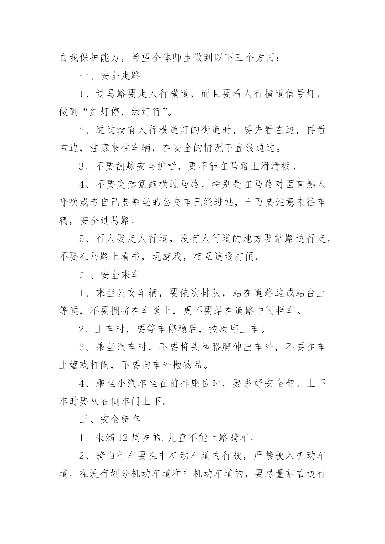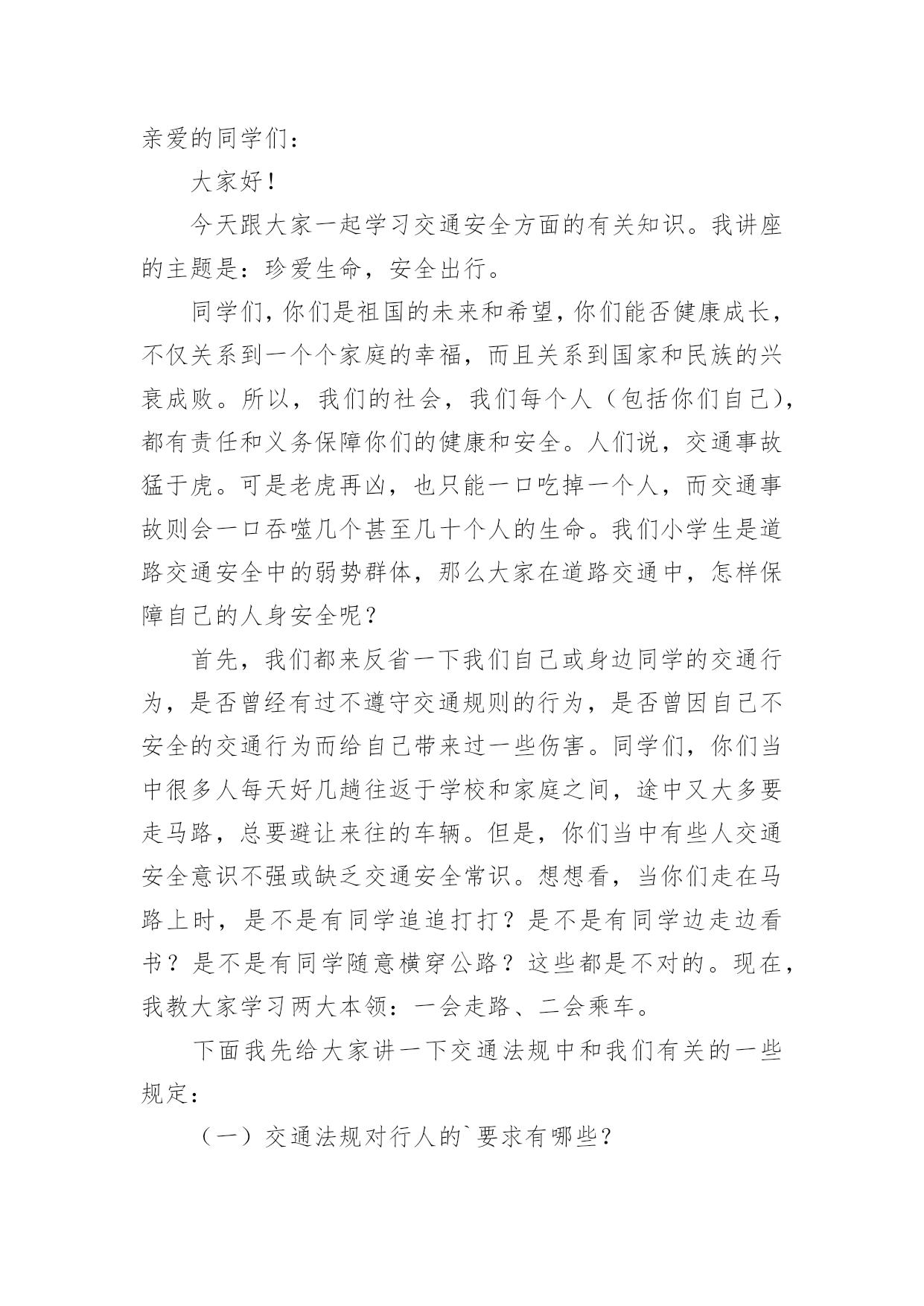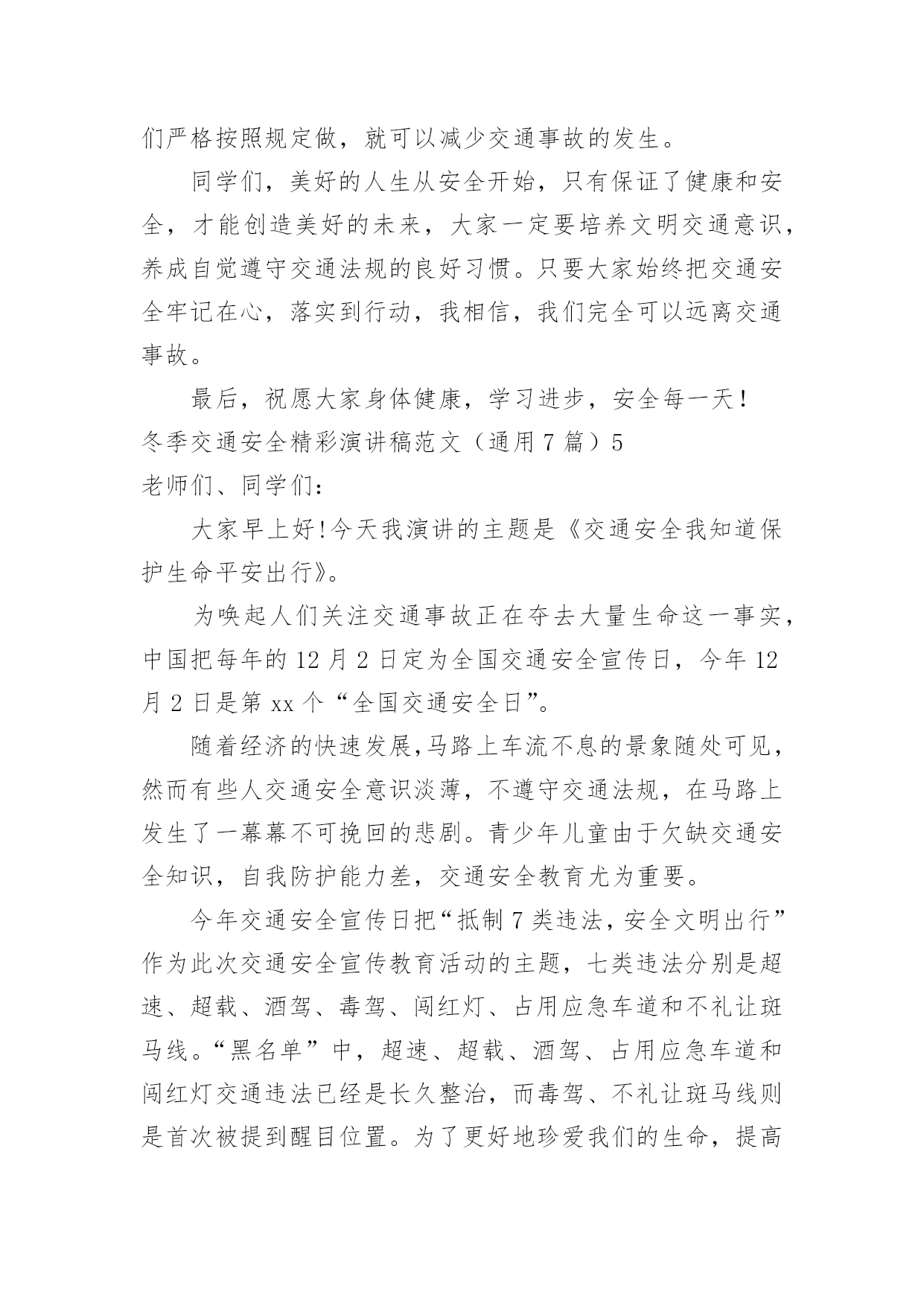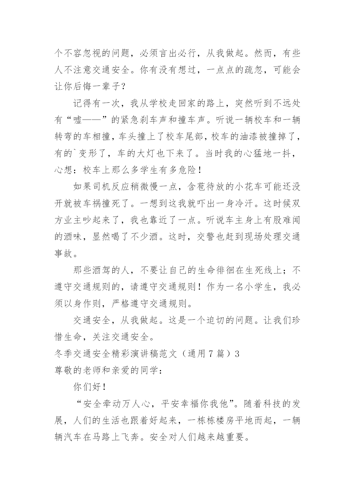 冬季交通安全精彩演讲稿冬季交通安全精彩演讲稿范文(通用7篇)演讲稿是在一定的场合,面对一定的听众,演讲人围绕着主题讲话的文稿。在现实社会中,很多地方都会使用到演讲稿,相信许多人会觉得演讲稿很难写吧,以下是小编为大家整理的冬季交通安全精彩演讲稿范文(通用7篇),欢迎大家借鉴与参考,希望对大家有所帮助。冬季交通安全精彩演讲稿范文(通用7篇)1亲爱的老师、同学们:大家好!生命是唯一的,是宝贵的,世界因为有了生命而变得精彩。您的生命,您珍惜吗?要想生命得到保障,请您遵守交通规则。交通事故时时刻刻都会发生,它像颗威力十足的'炸弹,一时大意,这颗埋伏在我们生活中的炸弹就会爆炸,炸得家庭破碎,炸得人心悲苦。记得我曾经在报纸上看到这样一则报道,我当时惊呆了。一位市民,因为要赶着去上班,而他必须绕过栏杆才能坐车,无奈之下,他情非得已地跨过栏杆。这时,突然,一辆卡车直奔而来,在这千钧一发的时候,只听“啊”的一声尖叫,这位市民被车撞得惨不忍睹,面目全非。当他被送到医院时,早已奄奄一息了。家属为此伤心欲绝。如果他当初能遵守交通规则,不乱跨越栏杆,他也就不会为此付出惨重的代价,把宝贵的生命白白地葬送。曾经看到这样一句话:“为了言传身教,请注意交通安全!”这句广告词也说不上经典,或许也谈不上特殊,可就是这么普通的一句话,在当今社会上,有几个人放在心上?又有几个人注意到交通安全的重要性呢?闯红灯,往往是出现交通事故的主要原因之一。有人为了争夺几秒的短暂时间,拼命地向前冲,事故也就这样发生了。所谓:宁等三分,不急一秒。人的生命只有一次,有什么比生命更重要,更急呢?何必要拿生命来做赌注呢?这样做根本不值得。交通是国民经济的命脉,马路作为交通的载体,它伤害了无数人的生命,它不能没有,但有了它却有无休止的流血。人们如果不注意交通安全,那事故就会像“非典”一样传播起来。也许受害者不是你,是别人,但也许明天就是你了,因为不遵守交通规则,造成财产损失,这值得吗?为什么不能遵守交通法则呢?难道大家愿意听到惨烈的叫声,撞车的轰隆声?谁愿意自己家破人亡?俗话说:生命重于泰山。为了自己的家人,为了自己,为了您的生命,让交通安全在你我的心中时时闪现,让那使人心灵震撼的声音不再出现。冬季交通安全精彩演讲稿范文(通用7篇)2尊敬的老师、亲爱的同学们:大家好!在现代社会,我们的生活离不开交通,交通安全也是一个不容忽视的问题,必须言出必行,从我做起。然而,有些人不注意交通安全。你有没有想过,一点点的疏忽,可能会让你后悔一辈子?记得有一次,我从学校走回家的路上,突然听到不远处有“嘘——”的紧急刹车声和撞车声。听说一辆校车和一辆转弯的车相撞,车头撞上了校车尾部,校车的油漆被撞掉了,有的`变形了,车的大灯也下来了。当时我的心猛地一抖,心想:校车上那么多学生有多危险!如果司机反应稍微慢一点,含苞待放的小花车可能还没开就被车祸撞死了。一想到这我就吓出一身冷汗。这时候双方业主吵起来了,我也靠近了一点。听说车主身上有股难闻的酒味,显然喝了不少酒。这时,交警也赶到现场处理交通事故。那些酒驾的人,不要让自己的生命徘徊在生死线上;不遵守交通规则的,请遵守交通规则!作为一名小学生,我必须以身作则,严格遵守交通规则。交通安全,从我做起。这是一个迫切的问题。让我们珍惜生命,关注交通安全。冬季交通安全精彩演讲稿范文(通用7篇)3尊敬的老师和亲爱的同学:你们好!“安全牵动万人心,平安幸福你我他”。随着科技的发展,人们的生活也跟着好起来,一栋栋楼房平地而起,一辆辆汽车在马路上飞奔。安全对人们越来越重要。小的时候,妈妈教我一些安全小知识,到现在我还记忆犹新,一:在路上行走要向走在右边。二:见着车的时候,不与车抢着走,要让车先走。三:不再马路上追逐打闹、四:红灯停绿灯行。我一直都记得这些交通规则。交通越来越发达,人们的友谊意识也应该增强。小轿车也越来越多了,司机也越来越多,司机也必须要遵守交通规则,司机也应该对他人负责对自己负责、对家庭负责,不应醉酒驾车,闯红灯,导致有的`司机不遵守交通规则。导致一场场悲剧的发生,致使无辜的生命,使得原有幸福美满的家庭在一瞬间变得支离破碎。我记得在上小学的时候,有一天下午放学,我走在路上的时候,一辆蓝色的.风车飞驰而过。放我要拐弯的时候,突然听见一声刹车的声音,当我转过头时,惨剧已经发生。时风车因为开的太快撞到了在路边玩耍而来不急闪躲的小男孩,就这样一条幼小的生命被无情的催产了,小男孩还未来的及经历世间的美好的事情,就这样离去,我看到小男孩的母亲抱着小男孩的尸体痛哭,就是因为风车主不遵守交通规则致使了惨剧的发生,风车主的家庭也随之破碎。如果风车主遵守交通规则我想这时小男孩应该还快乐的玩耍,双方的家庭还美满温馨。遵守交通规则,让平安进万家,和睦联天下,让我们一起学习交通知识,共创和谐社会
