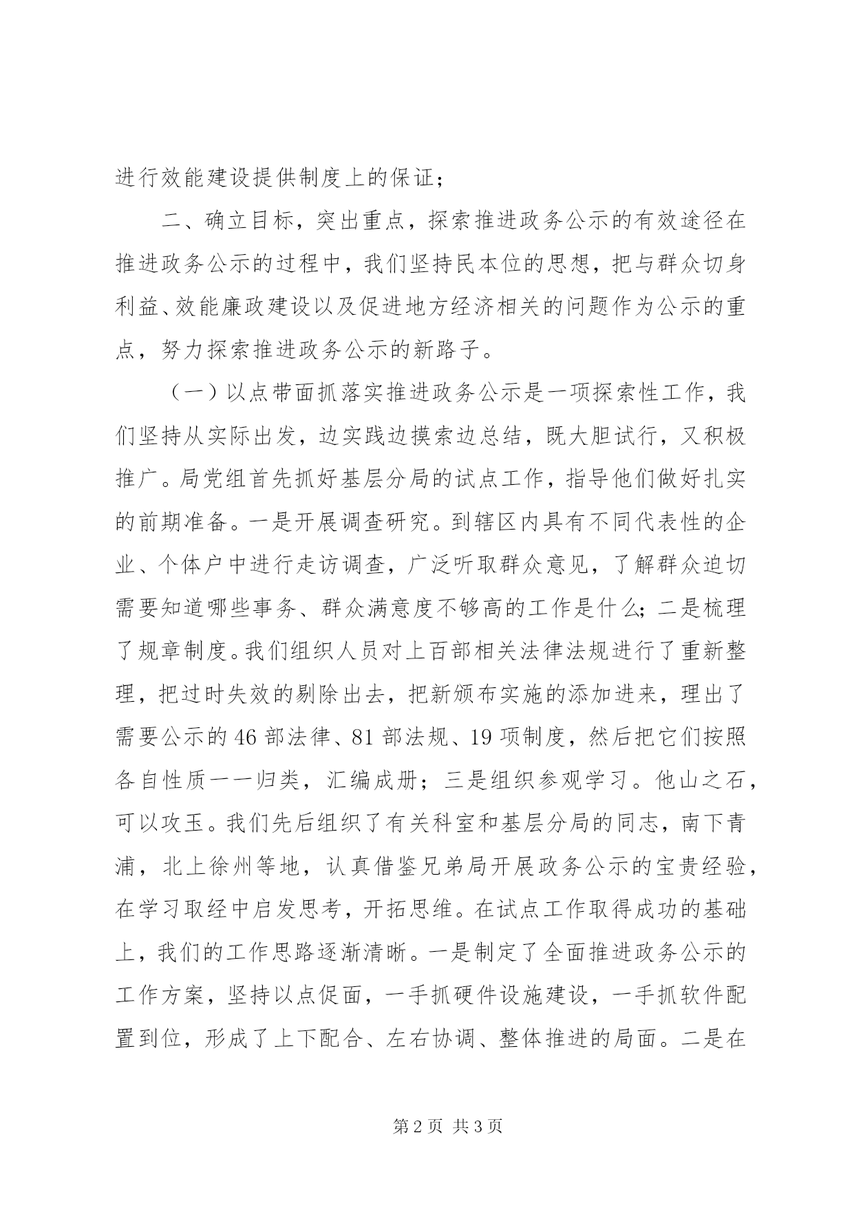 第PAGE\*Arabic\*MERGEFORMAT3页共NUMPAGES\*MERGEFORMAT3页工商局政务公开XX年工作总结一、加强引导,统一认识,夯实推进政务公示的思想基础近年来,各级工商机关在规范内部管理、公开行政行为上作了不少探索。形势和任务的发展,给我们的行政行为提出了更新、更高的要求。为此,我局党组把推进政务公示工作摆上重要议事日程,把政务公示作为基层分局建设服务型工商的一项基础性、长远性工作来抓,并以此为载体,带动基层全面建设。我们在推进政务公示中,首先从解决思想问题入手,突出解决三种模糊认识:有的基层同志认为,推进政务公示无非是重新换换牌子、立立制度,无关紧要;有的基层分局负责人认为,基层工作千头万绪,忙不过来,政务公示是亮了底牌,怕捆住了手脚、工作难以开展;还有的机关干部认为,推进政务公示,工作标准高了,回旋余地小了,压力更大了。针对这些认识上的偏差,我局党组始终保持统一的思想,我们认为,推进政务公示,是促进我们在行使职能中体现全心全意为人民服务这一宗旨的重要举措,具有十分重要的意义:一是政务公示是加快政治文明建设的重要途径。推行政务公示就是要使群众享有充分的知情权、监督权、批评权,突出权力由人民赋予、工作对人民负责的原则;二是政务公示是抓好机关效能建设的重要环节。依托政务公示,可以促进行政行为向程序化、规范化、法制化转变,为深入进行效能建设提供制度上的保证;二、确立目标,突出重点,探索推进政务公示的有效途径在推进政务公示的过程中,我们坚持民本位的思想,把与群众切身利益、效能廉政建设以及促进地方经济相关的问题作为公示的重点,努力探索推进政务公示的新路子。(一)以点带面抓落实推进政务公示是一项探索性工作,我们坚持从实际出发,边实践边摸索边总结,既大胆试行,又积极推广。局党组首先抓好基层分局的试点工作,指导他们做好扎实的前期准备。一是开展调查研究。到辖区内具有不同代表性的企业、个体户中进行走访调查,广泛听取群众意见,了解群众迫切需要知道哪些事务、群众满意度不够高的工作是什么;二是梳理了规章制度。我们组织人员对上百部相关法律法规进行了重新整理,把过时失效的剔除出去,把新颁布实施的添加进来,理出了需要公示的46部法律、81部法规、19项制度,然后把它们按照各自性质一一归类,汇编成册;三是组织参观学习。他山之石,可以攻玉。我们先后组织了有关科室和基层分局的同志,南下青浦,北上徐州等地,认真借鉴兄弟局开展政务公示的宝贵经验,在学习取经中启发思考,开拓思维。在试点工作取得成功的基础上,我们的工作思路逐渐清晰。一是制定了全面推进政务公示的工作方案,坚持以点促面,一手抓硬件设施建设,一手抓软件配置到位,形成了上下配合、左右协调、整体推进的局面。二是在总结试点经验的基础上,制定了政务公示验收达标的统一标准。三是明确了既保进度、又保质量的工作要求,鼓励条件成熟的分局先行一步、率先达标,要求所有基层分局于今年6月底前全面规范、整体达标。