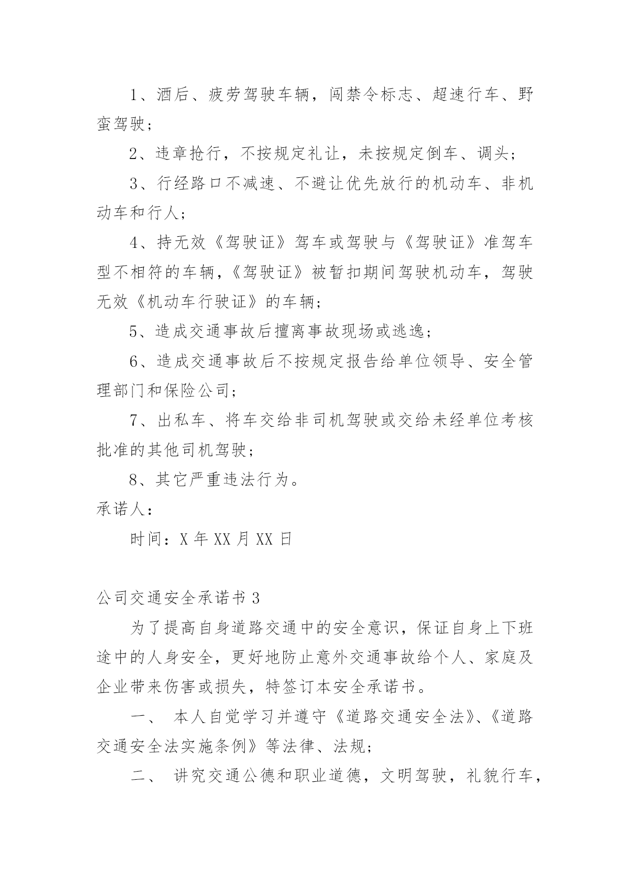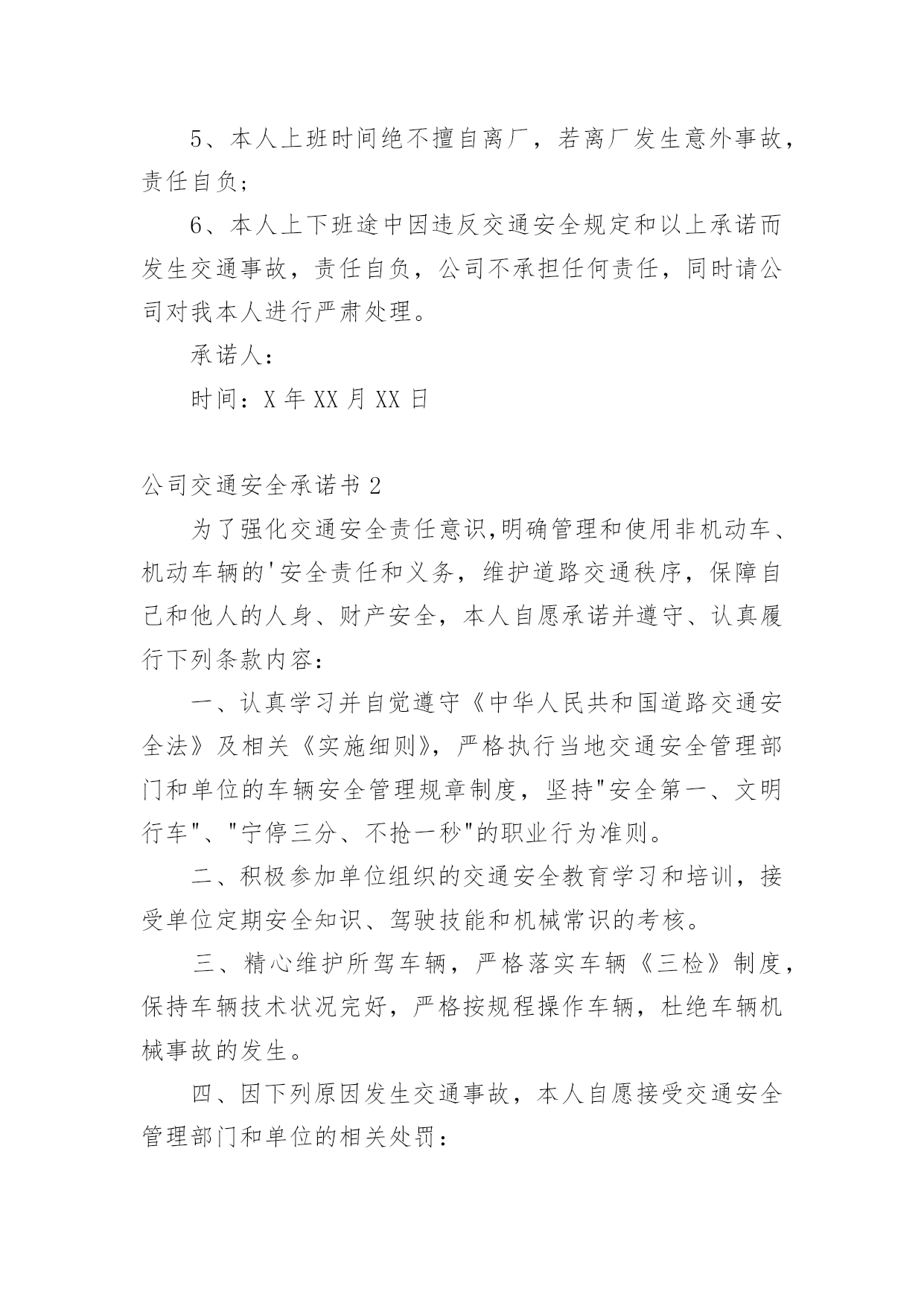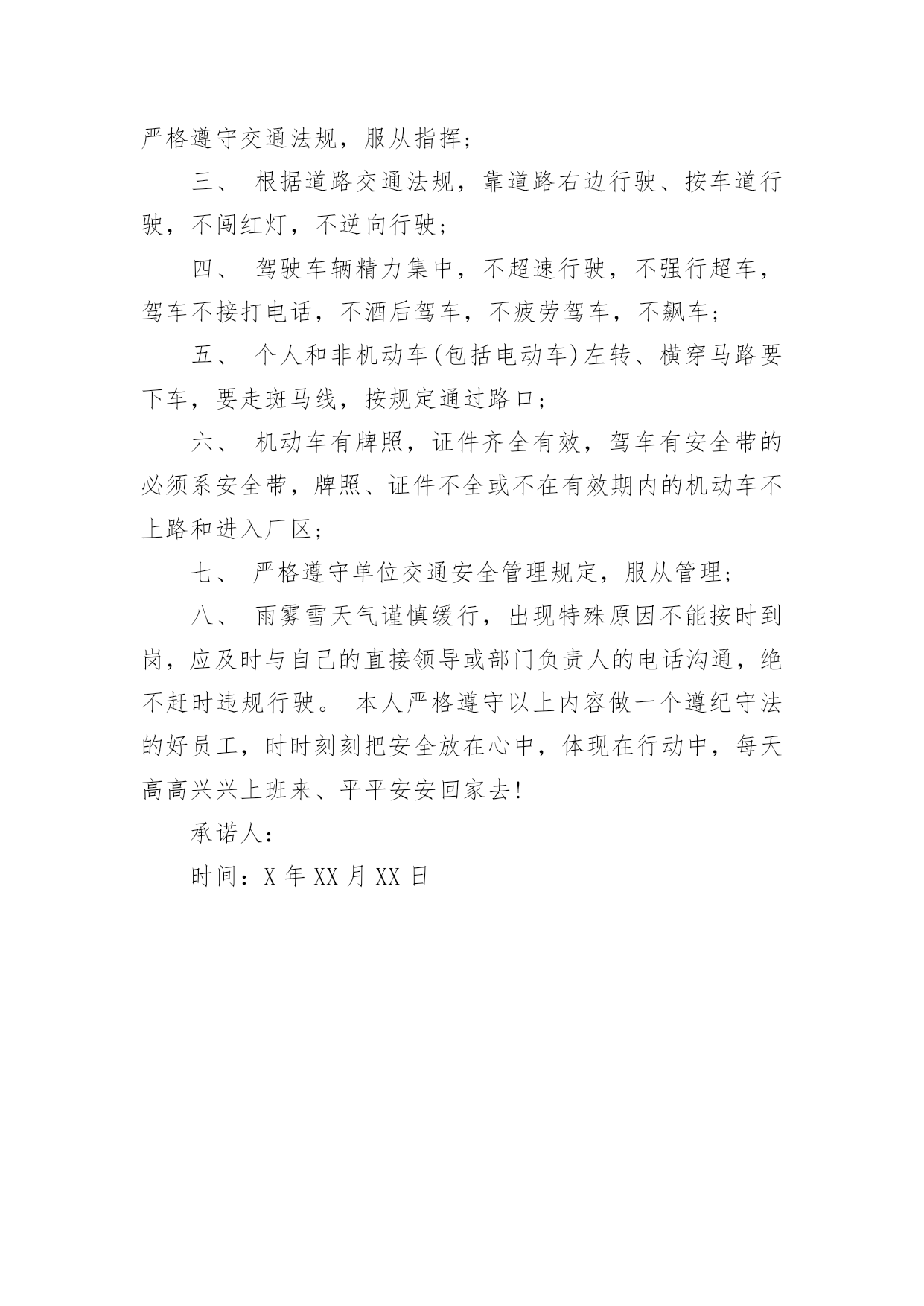 公司交通安全承诺书在充满活力,日益开放的今天,承诺书与我们的生活息息相关,承诺书是签署人内心真实意愿的表示,忌搞形式、走过场,忌出于无奈。你知道承诺书怎样才能写的好吗?以下是小编精心整理的公司交通安全承诺书,欢迎大家借鉴与参考,希望对大家有所帮助。公司交通安全承诺书1为了加强对上下班人员的交通安全管理,防止交通事故给个人、家庭及企业带来伤害或损失。按照公司要求:所有员工必须签订《员工上下班交通安全承诺书》,承诺书内容如下:1、本人上下班途中严格遵守《中华人民共和国道路交通安全法》;靠右边行驶,不闯红灯,不逆向行驶;驾驶机动车或骑行(电动)自行车精力集中,不超速行驶,不强行超车,驾车不接打电话,不酒后驾车,不飙车。2、本人上下班途中骑摩托车保证戴好头盔,如不戴头盔,出现安全事故,由本人自行负责。3、本人驾驶机动车保证牌、照齐全有效,如证件不全不驾车上下班;4、雨雾雪天气谨慎缓行,如不能按时到岗,应及时与自己的直接领导或部门负责人的电话请假,绝不赶时违规行驶。5、本人上班时间绝不擅自离厂,若离厂发生意外事故,责任自负;6、本人上下班途中因违反交通安全规定和以上承诺而发生交通事故,责任自负,公司不承担任何责任,同时请公司对我本人进行严肃处理。承诺人:时间:X年XX月XX日公司交通安全承诺书2为了强化交通安全责任意识,明确管理和使用非机动车、机动车辆的'安全责任和义务,维护道路交通秩序,保障自己和他人的人身、财产安全,本人自愿承诺并遵守、认真履行下列条款内容:一、认真学习并自觉遵守《中华人民共和国道路交通安全法》及相关《实施细则》,严格执行当地交通安全管理部门和单位的车辆安全管理规章制度,坚持"安全第一、文明行车"、"宁停三分、不抢一秒"的职业行为准则。二、积极参加单位组织的交通安全教育学习和培训,接受单位定期安全知识、驾驶技能和机械常识的考核。三、精心维护所驾车辆,严格落实车辆《三检》制度,保持车辆技术状况完好,严格按规程操作车辆,杜绝车辆机械事故的发生。四、因下列原因发生交通事故,本人自愿接受交通安全管理部门和单位的相关处罚:1、酒后、疲劳驾驶车辆,闯禁令标志、超速行车、野蛮驾驶;2、违章抢行,不按规定礼让,未按规定倒车、调头;3、行经路口不减速、不避让优先放行的机动车、非机动车和行人;4、持无效《驾驶证》驾车或驾驶与《驾驶证》准驾车型不相符的车辆,《驾驶证》被暂扣期间驾驶机动车,驾驶无效《机动车行驶证》的车辆;5、造成交通事故后擅离事故现场或逃逸;6、造成交通事故后不按规定报告给单位领导、安全管理部门和保险公司;7、出私车、将车交给非司机驾驶或交给未经单位考核批准的其他司机驾驶;8、其它严重违法行为。承诺人:时间:X年XX月XX日公司交通安全承诺书3为了提高自身道路交通中的安全意识,保证自身上下班途中的人身安全,更好地防止意外交通事故给个人、家庭及企业带来伤害或损失,特签订本安全承诺书。一、本人自觉学习并遵守《道路交通安全法》、《道路交通安全法实施条例》等法律、法规;二、讲究交通公德和职业道德,文明驾驶,礼貌行车,严格遵守交通法规,服从指挥;三、根据道路交通法规,靠道路右边行驶、按车道行驶,不闯红灯,不逆向行驶;四、驾驶车辆精力集中,不超速行驶,不强行超车,驾车不接打电话,不酒后驾车,不疲劳驾车,不飙车;五、个人和非机动车(包括电动车)左转、横穿马路要下车,要走斑马线,按规定通过路口;六、机动车有牌照,证件齐全有效,驾车有安全带的必须系安全带,牌照、证件不全或不在有效期内的机动车不上路和进入厂区;七、严格遵守单位交通安全管理规定,服从管理;八、雨雾雪天气谨慎缓行,出现特殊原因不能按时到岗,应及时与自己的直接领导或部门负责人的电话沟通,绝不赶时违规行驶。本人严格遵守以上内容做一个遵纪守法的好员工,时时刻刻把安全放在心中,体现在行动中,每天高高兴兴上班来、平平安安回家去!承诺人:时间:X年XX月XX日