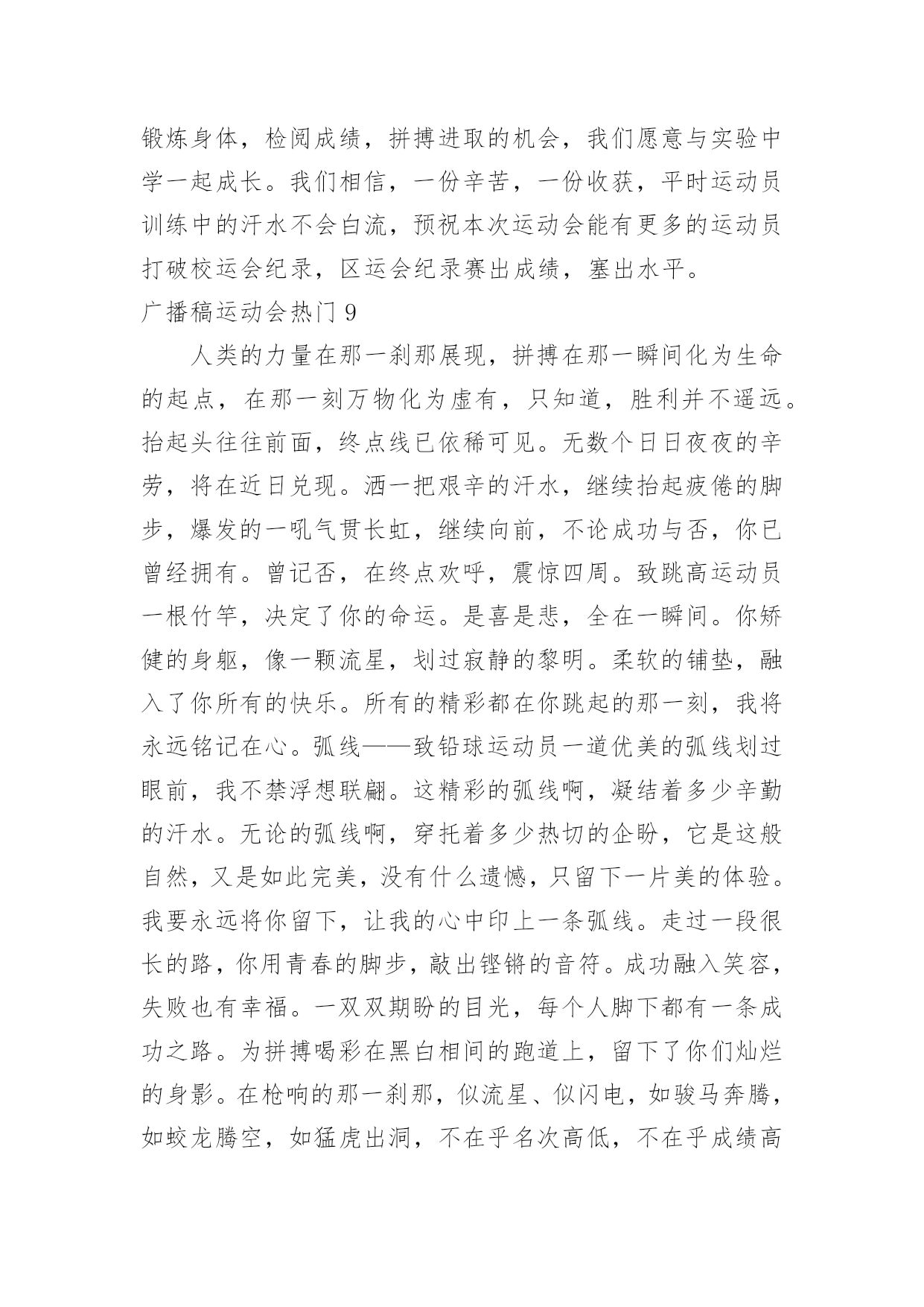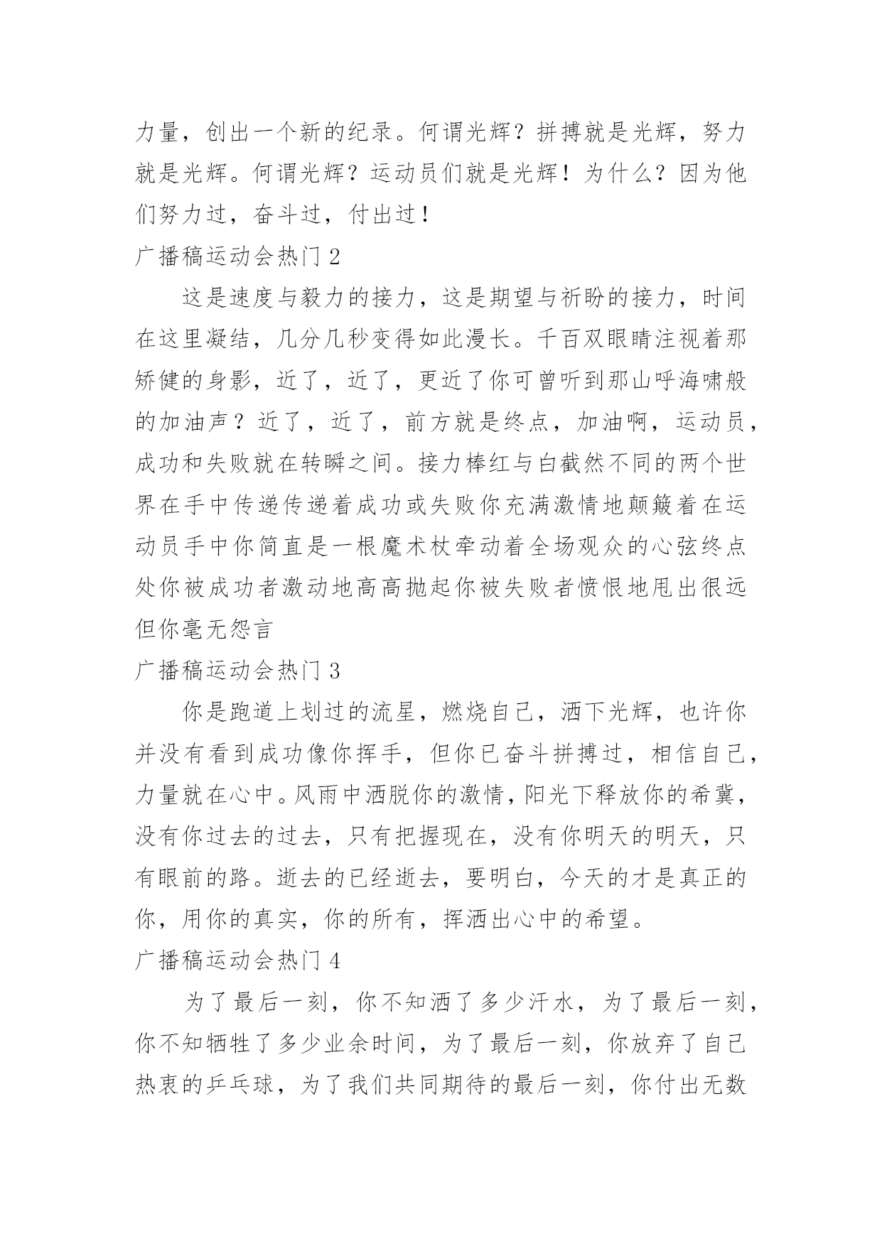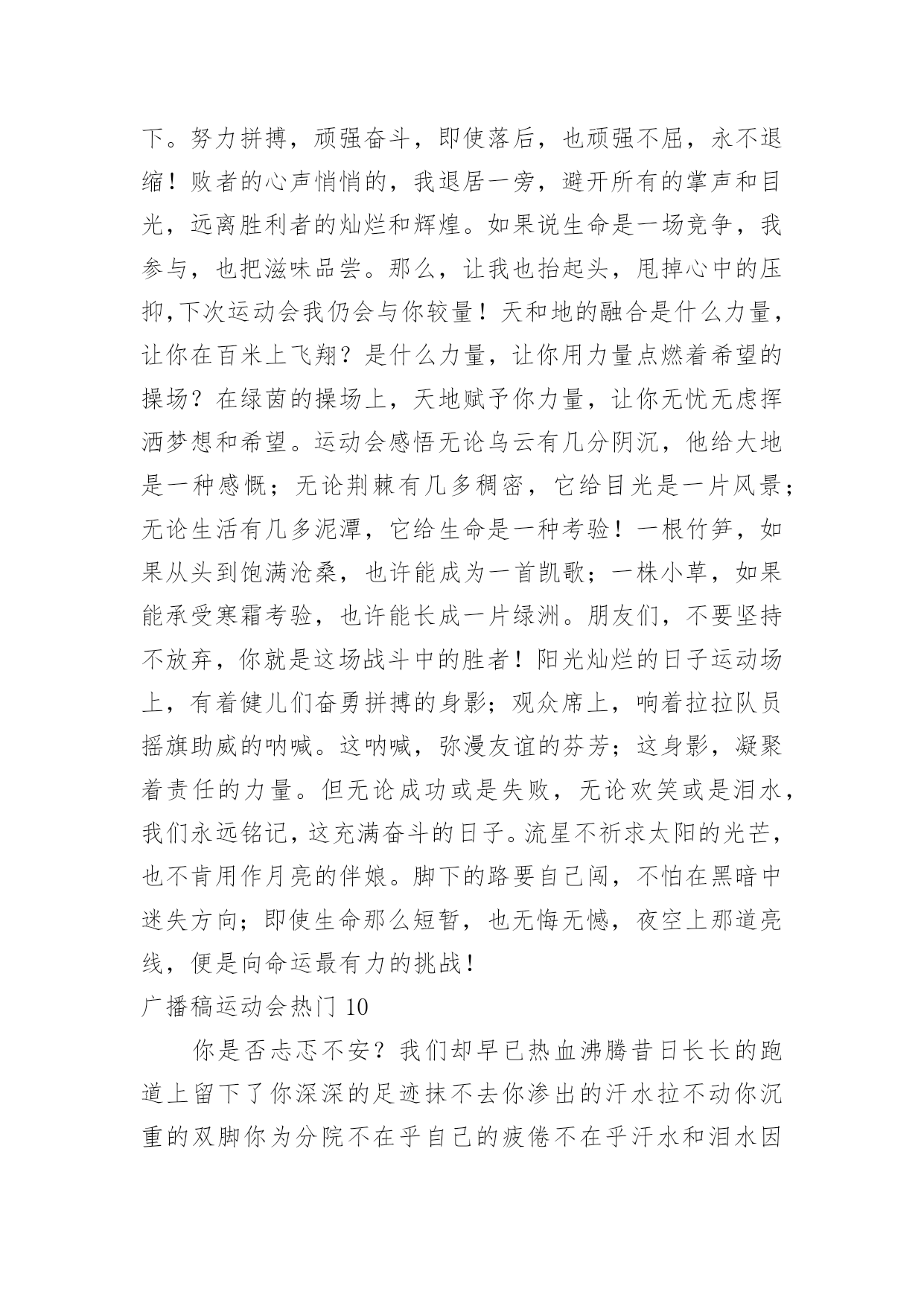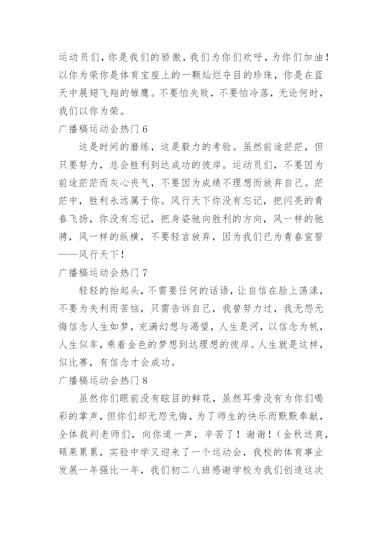 广播稿运动会广播稿运动会热门有在广播站锻炼的学生都知道,大家广播前都会提前做好广播稿,没有准备广播稿就不会有好的节目效果,广播稿应该怎么写呢?以下是小编为大家收集的广播稿运动会热门,供大家参考借鉴,希望可以帮助到有需要的朋友。广播稿运动会热门1一滴滴汗水,飘在绿茵场上,伴随着矫健的步伐,奏出希望的乐章。一种种信念,放在蔚蓝的天空,伴随着你那深沉的眼光,画出美丽的弧线。人生能有几回搏?千百上眼睛注视了你,为了希望,为了胜利,跑出青春的梦想。圆圆的希望——致铅球运动员沉甸甸的铅球,寄托着你的希望,奋力一抛的瞬间,一道闪亮的弧线划破美丽的长空,希望向前,再向前!你胜利了望着远方红色的终点线,那是汗水铺成的路,泪水堆成的山,平时的努力与奋战,不就为这一瞬间,于是你们用尽全身力气,冲向那决定命运的红线,你胜利了,耳旁飘来了同学们的欢呼与赞叹。光辉何谓光辉?在生命最无奈时,迸发出最强大的力量。何谓光辉?在身体承受重大力量下,仍然向前。何谓光辉?用上自己全部力量,创出一个新的纪录。何谓光辉?拼搏就是光辉,努力就是光辉。何谓光辉?运动员们就是光辉!为什么?因为他们努力过,奋斗过,付出过!广播稿运动会热门2这是速度与毅力的接力,这是期望与祈盼的接力,时间在这里凝结,几分几秒变得如此漫长。千百双眼睛注视着那矫健的身影,近了,近了,更近了你可曾听到那山呼海啸般的加油声?近了,近了,前方就是终点,加油啊,运动员,成功和失败就在转瞬之间。接力棒红与白截然不同的两个世界在手中传递传递着成功或失败你充满激情地颠簸着在运动员手中你简直是一根魔术杖牵动着全场观众的心弦终点处你被成功者激动地高高抛起你被失败者愤恨地甩出很远但你毫无怨言广播稿运动会热门3你是跑道上划过的流星,燃烧自己,洒下光辉,也许你并没有看到成功像你挥手,但你已奋斗拼搏过,相信自己,力量就在心中。风雨中洒脱你的激情,阳光下释放你的希冀,没有你过去的过去,只有把握现在,没有你明天的明天,只有眼前的路。逝去的已经逝去,要明白,今天的才是真正的你,用你的真实,你的所有,挥洒出心中的希望。广播稿运动会热门4为了最后一刻,你不知洒了多少汗水,为了最后一刻,你不知牺牲了多少业余时间,为了最后一刻,你放弃了自己热衷的乒乓球,为了我们共同期待的最后一刻,你付出无数努力,你是我们的自豪与骄傲。阳光总在风雨后你听过吗?阳光总在风雨后,请相信有彩虹。也许,你并没有取得预想中的成绩;也许,你此刻正在无声哭泣。抬起双眸吧你会看到,在你眼前的是满满的期盼与鼓励!胜利的橄榄枝黎明前黑暗的苍穹繁星点点普罗米修斯将体育的圣火点燃随着一道霞光运动的火焰升腾在奥林匹亚山今日的健儿们英姿勃发志存高远精神饱满的将目光凝聚在终点线努力吧拼搏吧奋斗吧女神将献上胜利的橄榄枝编成的花环。运动之歌风对我耳语:运动是我这样的轻盈岁月!雨对我耳语:运动是我这样的淋漓尽致!雷对我耳语:运动是我这样的铿锵有力!电对我耳语:运动是我这样的亮丽透明!运动吧!在运动中接受风雨的洗礼,在运动中感受雷电的闪光阳光不锈秋阳普照大地,那攒动的人群在呐喊声与歌声中意气风发那奔跑的身影融入秋日的阳光阳光不锈青春的阳光在悄悄地流淌流淌在那鼓声里流淌在那奔跑的脚步里流淌在那发令枪的声响里生命浸润在阳光中阳光不锈运动生命在阳光里展现风采生命的凯歌在阳光中走向辉煌运动的序幕已经拉开让我们用运动的火光来点燃生命的激情生命阳光永不锈致大会晨风轻轻地唤醒骄阳校园的操场传来发令枪的声响彩旗与呐喊声一起在飘荡着心和起点紧紧的相连用青春和热血来铺洒白色的跑道用激情点燃胜利的曙光运动员之歌我知道,该来一定会来的。你只要,全身心准备好。梦想在前方我们向前奔跑,生命中谁都要有个目标。谁在风中,风中燃烧。谁在雨中,雨中舞蹈。梦想前方,就在今朝。让世界把我们知道!赛场上的旋律你听那激烈奔跑的脚步声,震撼大地。你听那欢呼加油的呐喊声,催人奋进。赛场上的旋律,如旋风般急速,如号角般激扬,如激流般奔腾不息。创新!突破!超越!永远是赛场上最激动人心的旋律。致运动会秋季气爽彩旗飘,运动健儿逞英豪。千呼万喊齐加油,场上场下都骄傲。今日练出好身体,志为四化立功劳。德智体美齐发展,祖国明日更美好。掌声响起来这里需要激情,这里需要呐喊,这里同样需要掌声。当你乘胜而归,我们为你鼓掌,为你祝贺,当你失败而来,我们同样为你鼓掌,为你骄傲。当掌声再一次想起的时候,你已经站在了起跑线上,朋友,向前冲!我们在为你鼓掌。艳阳下的歌朝阳的金色洗亮了跑道,青春的旋律谱成了这首歌,充满激情的心是这首歌的音符,花季的少年火热的心,永远的真诚不变的心,你的身影是跑道上的风景,矫健的步伐迈出你的自信,听,我们都在为你喝彩,加油,不能表达我们的激动。飞吧!胜利在向你微笑。广播稿运动会热门5某一天,醒在梦的旁边;手指间,光线有些特别;我能看得见