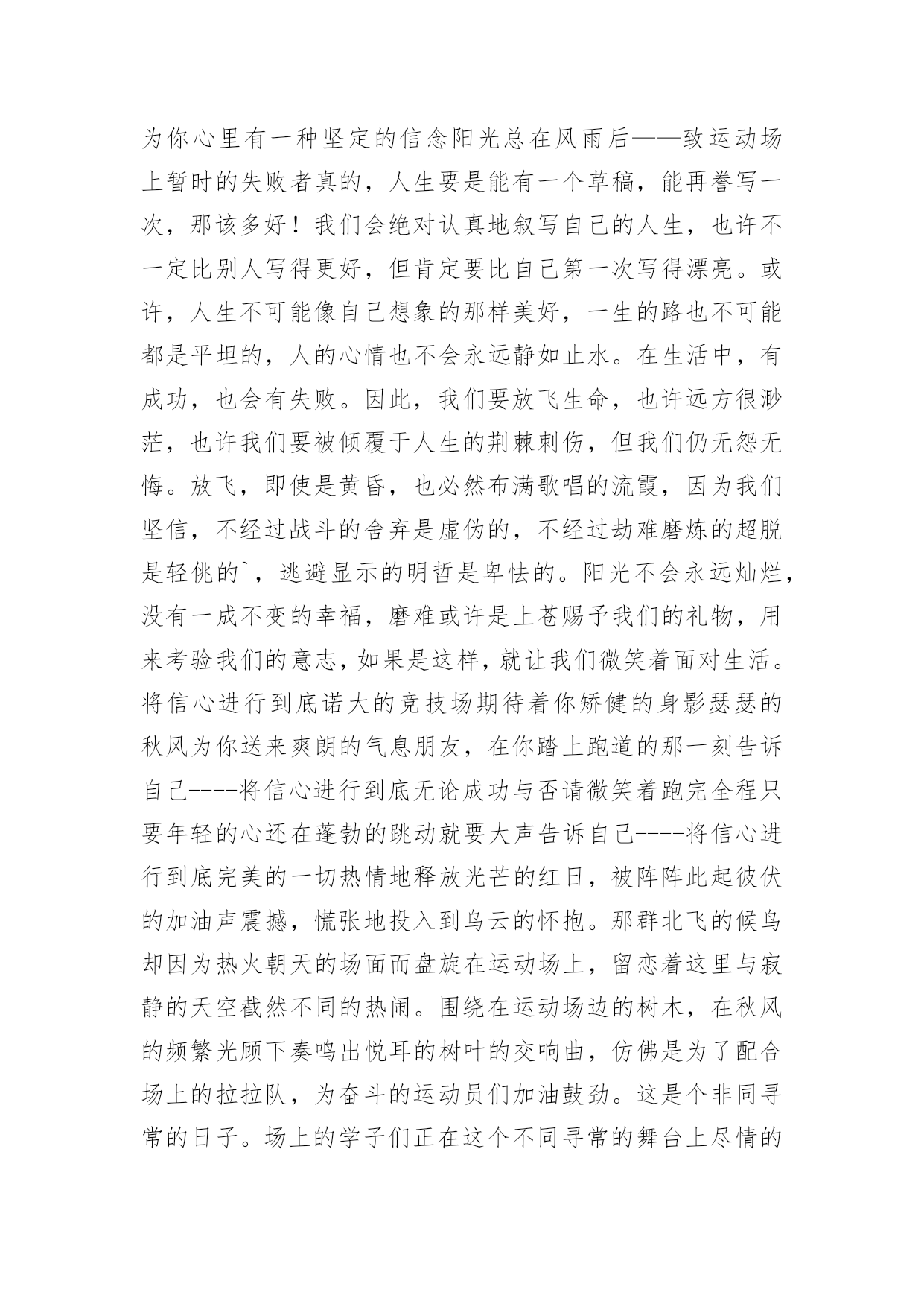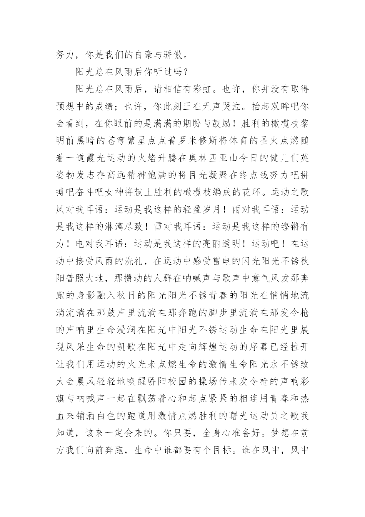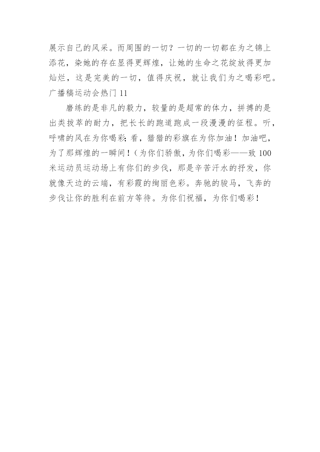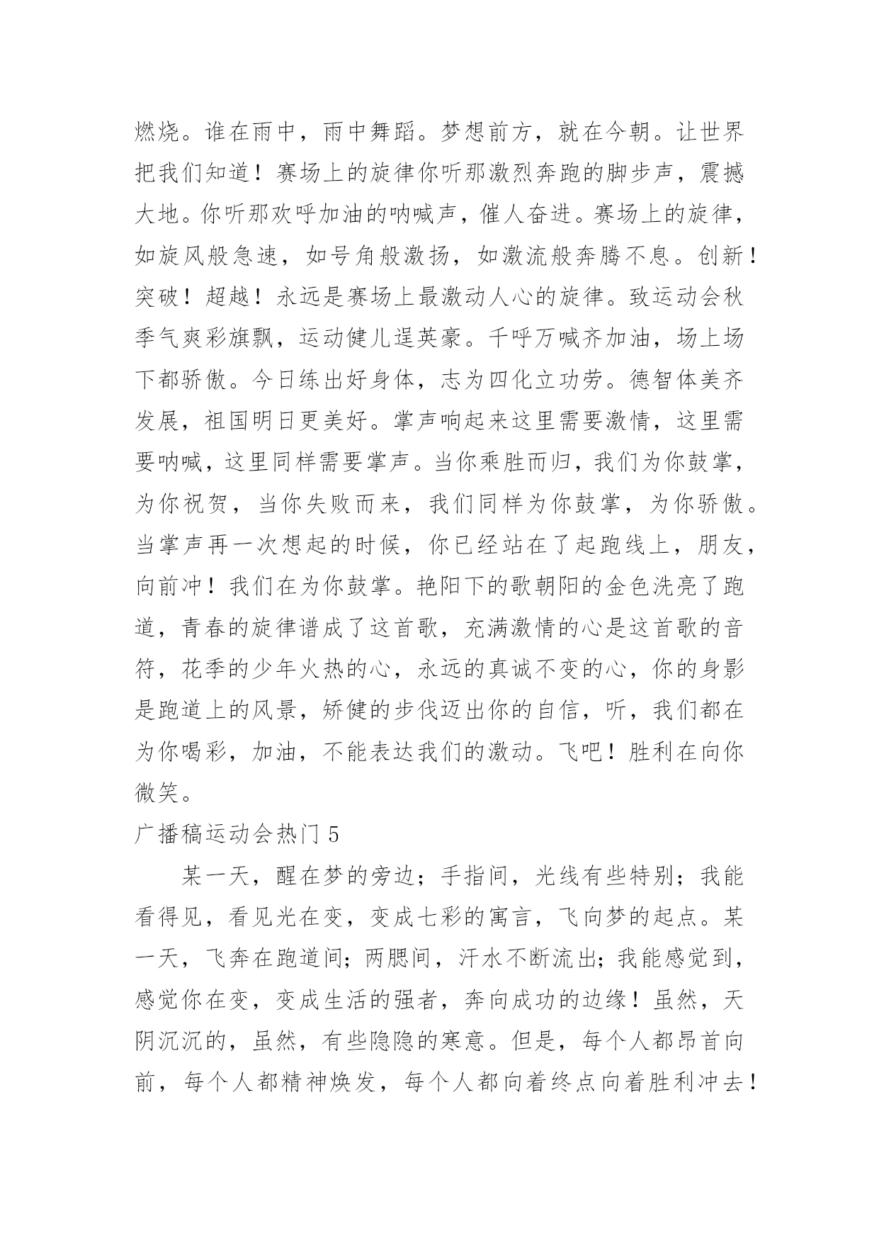 广播稿运动会广播稿运动会热门有在广播站锻炼的学生都知道,大家广播前都会提前做好广播稿,没有准备广播稿就不会有好的节目效果,广播稿应该怎么写呢?以下是小编为大家收集的广播稿运动会热门,供大家参考借鉴,希望可以帮助到有需要的朋友。广播稿运动会热门1一滴滴汗水,飘在绿茵场上,伴随着矫健的步伐,奏出希望的乐章。一种种信念,放在蔚蓝的天空,伴随着你那深沉的眼光,画出美丽的弧线。人生能有几回搏?千百上眼睛注视了你,为了希望,为了胜利,跑出青春的梦想。圆圆的希望——致铅球运动员沉甸甸的铅球,寄托着你的希望,奋力一抛的瞬间,一道闪亮的弧线划破美丽的长空,希望向前,再向前!你胜利了望着远方红色的终点线,那是汗水铺成的路,泪水堆成的山,平时的努力与奋战,不就为这一瞬间,于是你们用尽全身力气,冲向那决定命运的红线,你胜利了,耳旁飘来了同学们的欢呼与赞叹。光辉何谓光辉?在生命最无奈时,迸发出最强大的力量。何谓光辉?在身体承受重大力量下,仍然向前。何谓光辉?用上自己全部力量,创出一个新的纪录。何谓光辉?拼搏就是光辉,努力就是光辉。何谓光辉?运动员们就是光辉!为什么?因为他们努力过,奋斗过,付出过!广播稿运动会热门2这是速度与毅力的接力,这是期望与祈盼的接力,时间在这里凝结,几分几秒变得如此漫长。千百双眼睛注视着那矫健的身影,近了,近了,更近了你可曾听到那山呼海啸般的加油声?近了,近了,前方就是终点,加油啊,运动员,成功和失败就在转瞬之间。接力棒红与白截然不同的两个世界在手中传递传递着成功或失败你充满激情地颠簸着在运动员手中你简直是一根魔术杖牵动着全场观众的心弦终点处你被成功者激动地高高抛起你被失败者愤恨地甩出很远但你毫无怨言广播稿运动会热门3你是跑道上划过的流星,燃烧自己,洒下光辉,也许你并没有看到成功像你挥手,但你已奋斗拼搏过,相信自己,力量就在心中。风雨中洒脱你的激情,阳光下释放你的希冀,没有你过去的过去,只有把握现在,没有你明天的明天,只有眼前的路。逝去的已经逝去,要明白,今天的才是真正的你,用你的真实,你的所有,挥洒出心中的希望。广播稿运动会热门4为了最后一刻,你不知洒了多少汗水,为了最后一刻,你不知牺牲了多少业余时间,为了最后一刻,你放弃了自己热衷的乒乓球,为了我们共同期待的最后一刻,你付出无数努力,你是我们的自豪与骄傲。阳光总在风雨后你听过吗?阳光总在风雨后,请相信有彩虹。也许,你并没有取得预想中的成绩;也许,你此刻正在无声哭泣。抬起双眸吧你会看到,在你眼前的是满满的期盼与鼓励!胜利的橄榄枝黎明前黑暗的苍穹繁星点点普罗米修斯将体育的圣火点燃随着一道霞光运动的火焰升腾在奥林匹亚山今日的健儿们英姿勃发志存高远精神饱满的将目光凝聚在终点线努力吧拼搏吧奋斗吧女神将献上胜利的橄榄枝编成的花环。运动之歌风对我耳语:运动是我这样的轻盈岁月!雨对我耳语:运动是我这样的淋漓尽致!雷对我耳语:运动是我这样的铿锵有力!电对我耳语:运动是我这样的亮丽透明!运动吧!在运动中接受风雨的洗礼,在运动中感受雷电的闪光阳光不锈秋阳普照大地,那攒动的人群在呐喊声与歌声中意气风发那奔跑的身影融入秋日的阳光阳光不锈青春的阳光在悄悄地流淌流淌在那鼓声里流淌在那奔跑的脚步里流淌在那发令枪的声响里生命浸润在阳光中阳光不锈运动生命在阳光里展现风采生命的凯歌在阳光中走向辉煌运动的序幕已经拉开让我们用运动的火光来点燃生命的激情生命阳光永不锈致大会晨风轻轻地唤醒骄阳校园的操场传来发令枪的声响彩旗与呐喊声一起在飘荡着心和起点紧紧的相连用青春和热血来铺洒白色的跑道用激情点燃胜利的曙光运动员之歌我知道,该来一定会来的。你只要,全身心准备好。梦想在前方我们向前奔跑,生命中谁都要有个目标。谁在风中,风中燃烧。谁在雨中,雨中舞蹈。梦想前方,就在今朝。让世界把我们知道!赛场上的旋律你听那激烈奔跑的脚步声,震撼大地。你听那欢呼加油的呐喊声,催人奋进。赛场上的旋律,如旋风般急速,如号角般激扬,如激流般奔腾不息。创新!突破!超越!永远是赛场上最激动人心的旋律。致运动会秋季气爽彩旗飘,运动健儿逞英豪。千呼万喊齐加油,场上场下都骄傲。今日练出好身体,志为四化立功劳。德智体美齐发展,祖国明日更美好。掌声响起来这里需要激情,这里需要呐喊,这里同样需要掌声。当你乘胜而归,我们为你鼓掌,为你祝贺,当你失败而来,我们同样为你鼓掌,为你骄傲。当掌声再一次想起的时候,你已经站在了起跑线上,朋友,向前冲!我们在为你鼓掌。艳阳下的歌朝阳的金色洗亮了跑道,青春的旋律谱成了这首歌,充满激情的心是这首歌的音符,花季的少年火热的心,永远的真诚不变的心,你的身影是跑道上的风景,矫健的步伐迈出你的自信,听,我们都在为你喝彩,加油,不能表达我们的激动。飞吧!胜利在向你微笑。广播稿运动会热门5某一天,醒在梦的旁边;手指间,光线有些特别;我能看得见