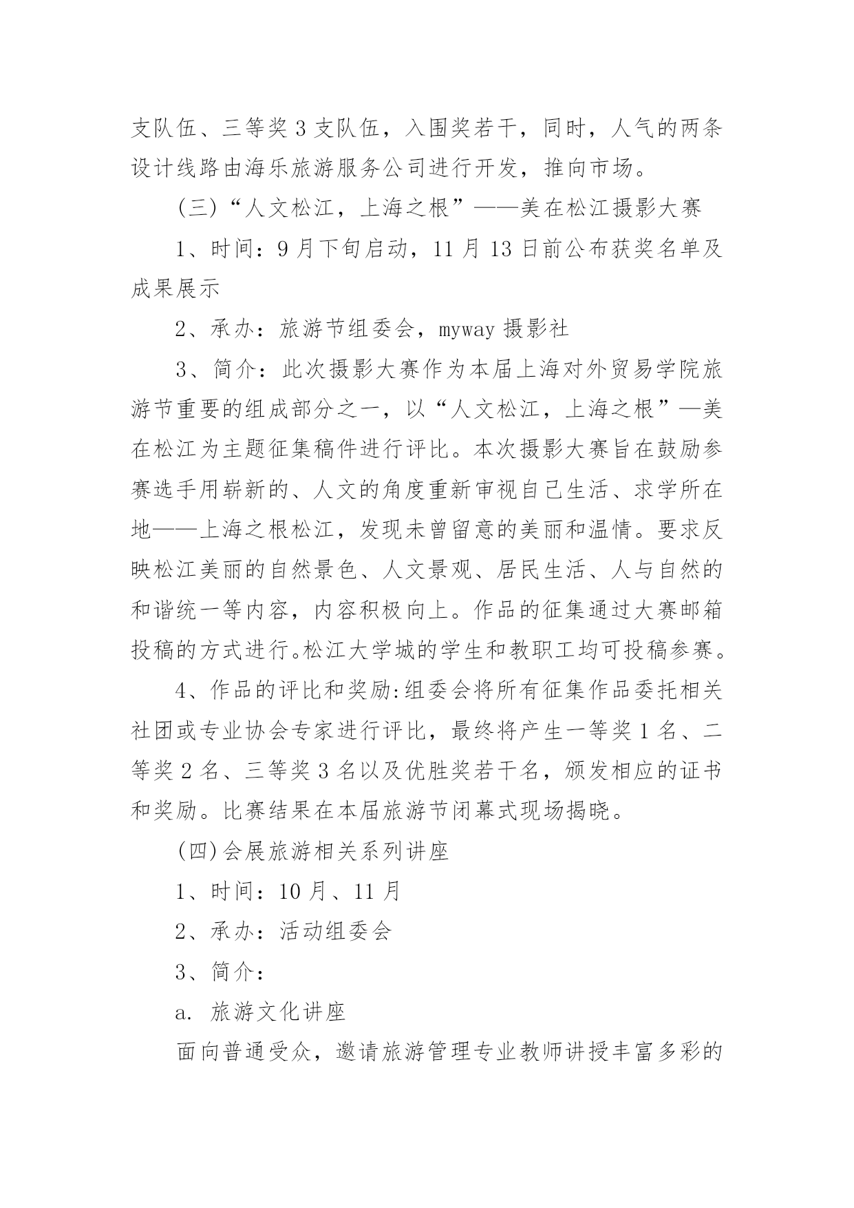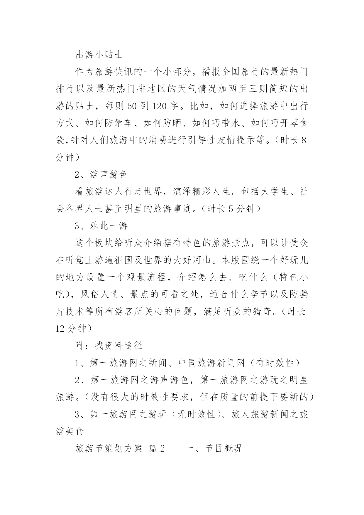 旅游节策划方案旅游节策划方案(通用14篇)为确保事情或工作高质量高水平开展,就常常需要事先准备方案,方案是有很强可操作性的书面计划。方案应该怎么制定才好呢?以下是小编收集整理的旅游节策划方案,希望能够帮助到大家。旅游节策划方案篇1一、节目概况1、节目名称:《旅游风向标》2、节目版块:①旅游快讯(出游小贴士)②游声游色③乐此一游3、节目时长:25分钟二、节目定位以旅游新闻、旅游知识、旅游探秘为主。通过主持人的介绍引领听众,力争做到最及时的旅游信息,最人本的旅游关怀,最实用的旅游知识,和最到位的旅游指导。三、节目风格欢乐、轻松,富有知识性,趣味性的娱乐聊天型节目。讲求与听众互动,吸引游客。介绍旅游途的神奇和知名景点、娱乐项目以及逸闻趣事,要求短小精悍,讲究精、奇,乐四、节目构思1、旅游快讯播报最近的旅游相关资讯,展示全国各地或者世界各地最新的旅游新闻、奇闻轶事等。出游小贴士作为旅游快讯的一个小部分,播报全国旅行的最新热门排行以及最新热门排地区的天气情况加两至三则简短的出游的贴士,每则50到120字。比如,如何选择旅游中出行方式、如何防晕车、如何防晒、如何巧带水、如何巧开零食袋,针对人们旅游中的消费进行引导性友情提示等。(时长8分钟)2、游声游色看旅游达人行走世界,演绎精彩人生。包括大学生、社会各界人士甚至明星的旅游事迹。(时长5分钟)3、乐此一游这个板块给听众介绍据有特色的旅游景点,可以让受众在听觉上游遍祖国及世界的大好河山。本版围绕一个好玩儿的地方设置一个观景流程,介绍怎么去、吃什么(特色小吃),风俗人情、景点的可看之处,适合什么季节以及防骗片技术等所有游客所关心的问题,满足听众的猎奇。(时长12分钟)附:找资料途径1、第一旅游网之新闻、中国旅游新闻网(有时效性)2、第一旅游网之游声游色,第一旅游网之游玩之明星旅游。(没有很大的时效性要求,但在质量的前提下要新的)3、第一旅游网之游玩(无时效性)、旅人旅游新闻之旅游美食旅游节策划方案篇2一、节目概况1、节目名称:《畅游神州》2、节目版块:虫虫走天下、旅人故事、温馨提示3、节目时长:30分钟4、受中人群:主要针对一家人以及平民游客二、栏目构思:1、虫虫走天下每期介绍一个旅游(物产)资源丰富的地区,把这个地方宣传出去,让更多的人了解一些贫民化的景区;在更大程度上把旅游(物产)资源转化成财富,是这个栏目的出发点。这个版块既包括对旅游(物产)资源的宣传;也包括对此以外其他地区的旅游资源的宣传。通过开办这档节目,还可以更好的引导大众化的旅游消费,迎合现在逐渐兴起的旅游热潮。2、旅人故事引入文化故事,以及可以吸引游客来此的新鲜事物,提高对受众的吸引力。3、温馨提示为栏目增添趣味性,开阔受众视野,这个版块提供了许多注意事项以及近期的天气变化情况,更好的服务大众提供出行指南。三、栏目宗旨:全面展现祖国各地的旅游资源和物产资源,以发展旅游经济为重心,建设和谐健康的旅游(物产)消费风尚;引导平民化的旅游路线。四、栏目定位:谈话类为主五、栏目风格:欢快、轻松;富有知识性、趣味性;六、播出内容:1、虫虫走天下通过主持人介绍一处旅游景点;适当时引入此旅游景点(或物产资源)的画面以及介绍,引导大众了解、认识所讨论的地方;最后由主持人进行畅想,并做小结。2、旅人故事主要是以以讲述故事以及旅游心得为主,增加讲述心情体会的内容。3、温馨提示以提示性信息为主,主要提醒受众关注未来今天的天气情况以及出行注意,及行程。七、播出方式:直播与重播相结合。八、节目要求:1、主持人:一名主持人担当,有一定的旅游体验的。九、节目制作:节目的准备阶段围绕旅游资源(或物产)的特点、价值、开发销售情况、参观(使用)体会等层面搜集资料,充分利用网络资源,提前拟好文案;联系相关单位协助安排。节目可争取旅游局、地区经委会等单位的支持,他们会提供旅游资源的相关介绍。根据景点的实际情况,制作开展“旅人故事”专题策划。十、栏目特色使受众第一时间了解景点以及出行的基本注意事项。十一、人员配置主持人两名,摄像师两名,编导两名十二、播出时间首播时间:直播晚上9:30—10:00重播次日上午10:30—11:00十三、栏目可行性分析:随着旅游热潮逐渐升温,旅游类节目也呈现出上升趋势,不过目前看来,经常参加的游客大多数是条件比较富裕的,导致很多平民化的游客无法参加,我们栏目的主要目的是要引导这部分人群也能走出家门,根据自己的实际条件领略大自然的风光以及人文景观。第一时间得到有特色的旅游咨询。十四、节目目标争创名牌节目,成为大众获取旅游、物产信息最佳来源;十五、备注1、建议本节目演播室主持人主持人固定,外景主持人主持人灵活安排2、在主持人选定上,建议让风格欢快、幽默的主持人担当旅游节策划方案篇3活动主题:大学生旅游节主办单位:上海对外贸易学院会展与旅游学