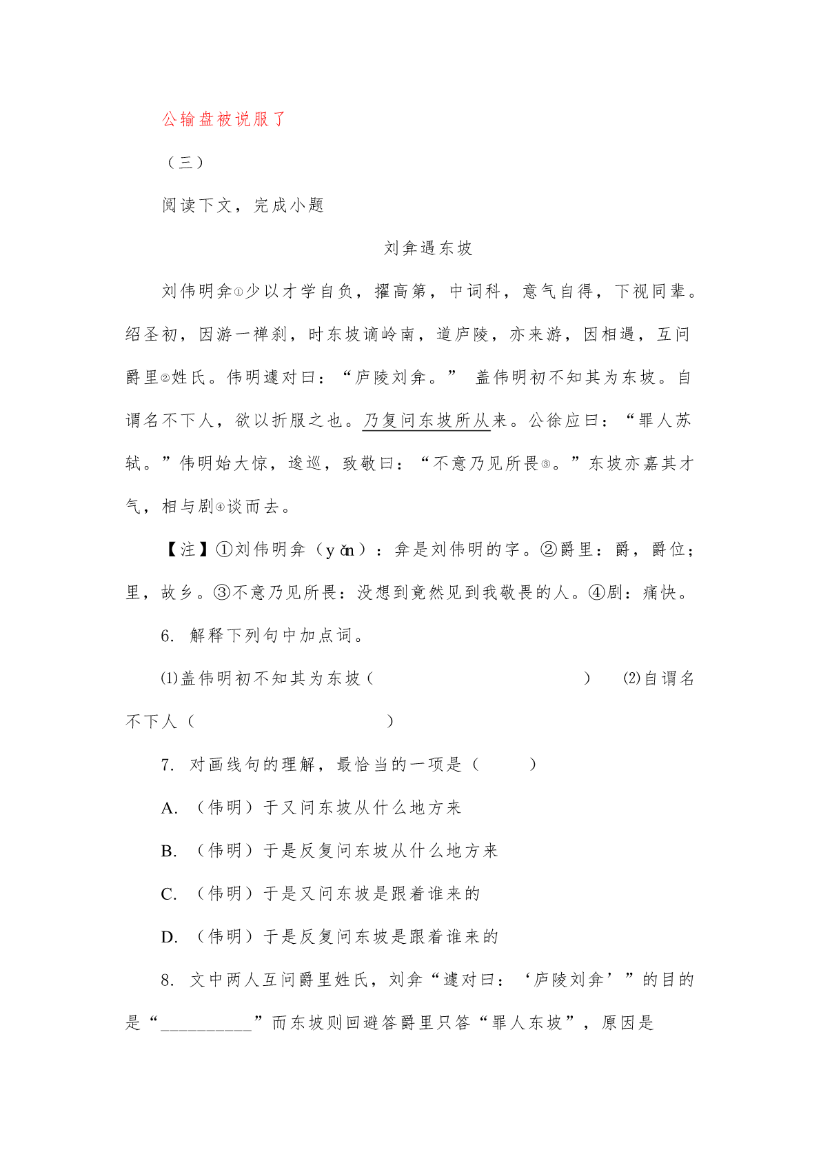 2024年上海市初中毕业学业统一考试语文试卷考生注意:1.本试卷共26题。2.试卷满分150分,考试时间100分钟。3.请将所有答案做在答题纸的指定位置上,做在试卷上一律不计分。一、文言文(40分)(一)默写(16分)1.(1)清晨入古寺,_____________________。(常建《题破山寺后禅院》)(2)青山横北郭,_____________________。(李白《送友人》)(3)相见时难别亦难,_____________________。(李商隐《无题》)(4)其必曰:“_____________________,后天下之乐而乐”乎!(范仲淹《岳阳楼记》)(5)纪录片《航拍中国》有一组镜头展现了祖国秋季的绚丽色彩,我们可用白朴《天净沙秋》中的句子“__________________,________________”为画面配字幕。【答案】(1).初日照高林(2).白水绕东城。(3).东风无力百花残。(4).先天下之忧而忧(5).青山绿水,(6).白草红叶黄花【解析】【详解】默写题作答,主要靠平时的背诵和积累。做题过程中注意:一、透彻理解诗文内容;二、认真审题,找出符合题意的诗文句子;三、默写时做到不添字、不漏字、不写错字。本题中的“初、绕、残、忧、黄花”等字词容易写错。(二)阅读下面两段选文,完成小题【甲】橘逾淮为枳(节选)王视晏子曰:“齐人固善盗乎?”晏子避席对曰:“婴闻之,橘生淮南则为橘,生于淮北则为枳,叶徒相似,其实味不同。所以然者何?水土异也。今民生长于齐不盗,入楚则盗,得无楚之水土使民善盗耶?”王笑曰:“圣人非所与熙也,寡人反取病焉。”【乙】公输(节选)公输盘曰:“夫子何命焉为?”子墨子曰:“北方有侮臣者,愿借子杀之。”公输盘不说。子墨子曰:“请献千金。”公输盘曰:“吾义固不杀人。”子墨子起,再拜,曰:“请说之。吾从北方闻子为梯,将以攻宋。宋何罪之有?荆国有余于地,而不足于民。杀所不足而争所有余,不可谓智;宋无罪而攻之,不可谓仁;知而不争,不可谓忠;争而不得,不可谓强;义不杀少而杀众,不可谓知类。”公输盘服。2.两段选文都讲了春秋战国时期的故事,《橘逾淮为枳》选自《________________》,《公输》选自诸子百家中______家的经典著作。3.用现代汉语翻译下面好句子。齐人固善盗乎?4.下列对选文内容理解正确的一项是()A.【甲】文体现了楚王是个善于纳谏、知错能改的人。B.【乙】文突出公输盘是个狂妄自大、固执己见的人。C.晏子的辩驳义正辞严、墨子的说理诙谐幽默。D.言辞交锋后,晏子使对方理屈,墨子令对方折服。5.选文通过对话,表现出晏子和墨子都具有____________和___________的特点。【答案】2.(1).晏子春秋(2).墨3.齐国人本来就善于偷窃吗?4.D5.(1).机智(2).善言【解析】【2题详解】本题考查文学常识。《晏子春秋》,又称《晏子》,是记载春秋时期齐国政治家晏婴言行的一部历史典籍,用史料和民间传说汇编而成,书中记载了很多晏婴劝告君主勤政,不要贪图享乐,以及爱护百姓、任用贤能和虚心纳谏的事例,成为后世人学习的榜样。《晏子春秋》经过刘向的整理,共有内、外八篇,二百一十五章。墨家约产生于战国时期。创始人为墨翟(墨子)。墨家是一个纪律严密的学术团体,其首领称“巨子”,其成员到各国为官必须推行墨家主张,所得俸禄亦须向团体奉献。墨家学派有前后期之分:前期思想主要涉及社会政治、伦理及认识论问题,关注现世战乱;后期墨家在逻辑学方面有重要贡献,开始向科学研究领域靠拢。墨家的主要思想主张是:主张人与人之间平等的相爱(兼爱),反对侵略战争(非攻),推崇节约、反对铺张浪费(节用),重视继承前人的文化财富(明鬼),掌握自然规律(天志)等。【3题详解】本题考查句子的翻译。“齐人固善盗乎?”注意关键字:“固”:“本来”,“善”:“善于”,“盗”:“偷窃”。翻译为:“齐国人本来就善于偷窃吗”?【4题详解】A.根据甲选段我们可以看出楚王是一位仗势欺人、自作聪明的人,故A错误;B.乙选段主要写墨子以理说服公输盘,并不能突出公输盘是个狂妄自大、固执己见的人,故B错误;C.通过选段可以看出晏子善用类比等反驳方式,幽默诙谐,不失气度,而墨子善用比喻,逻辑推理,是对方屈服,故C错误;故选D。【5题详解】本题考查人物形象。作答本题,需要对选段有一个整体的认知。选段甲记叙了晏