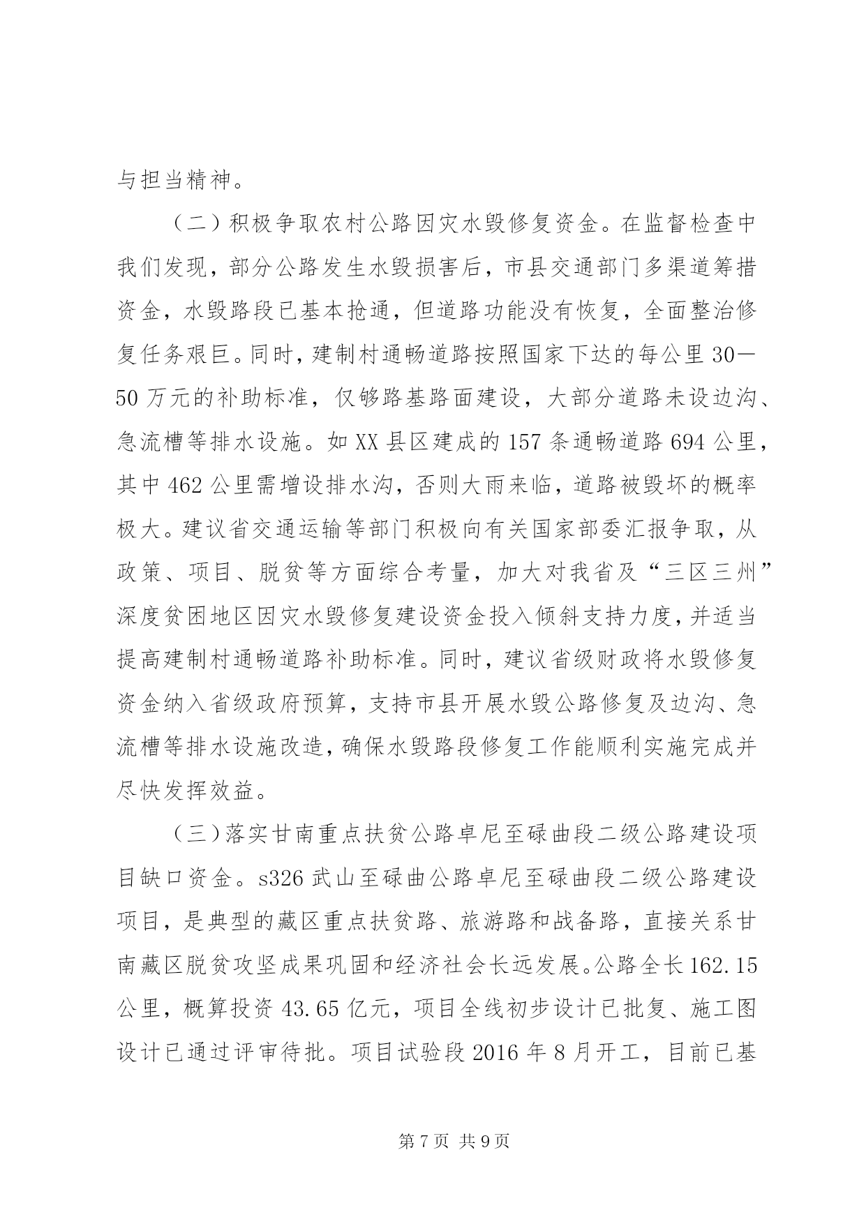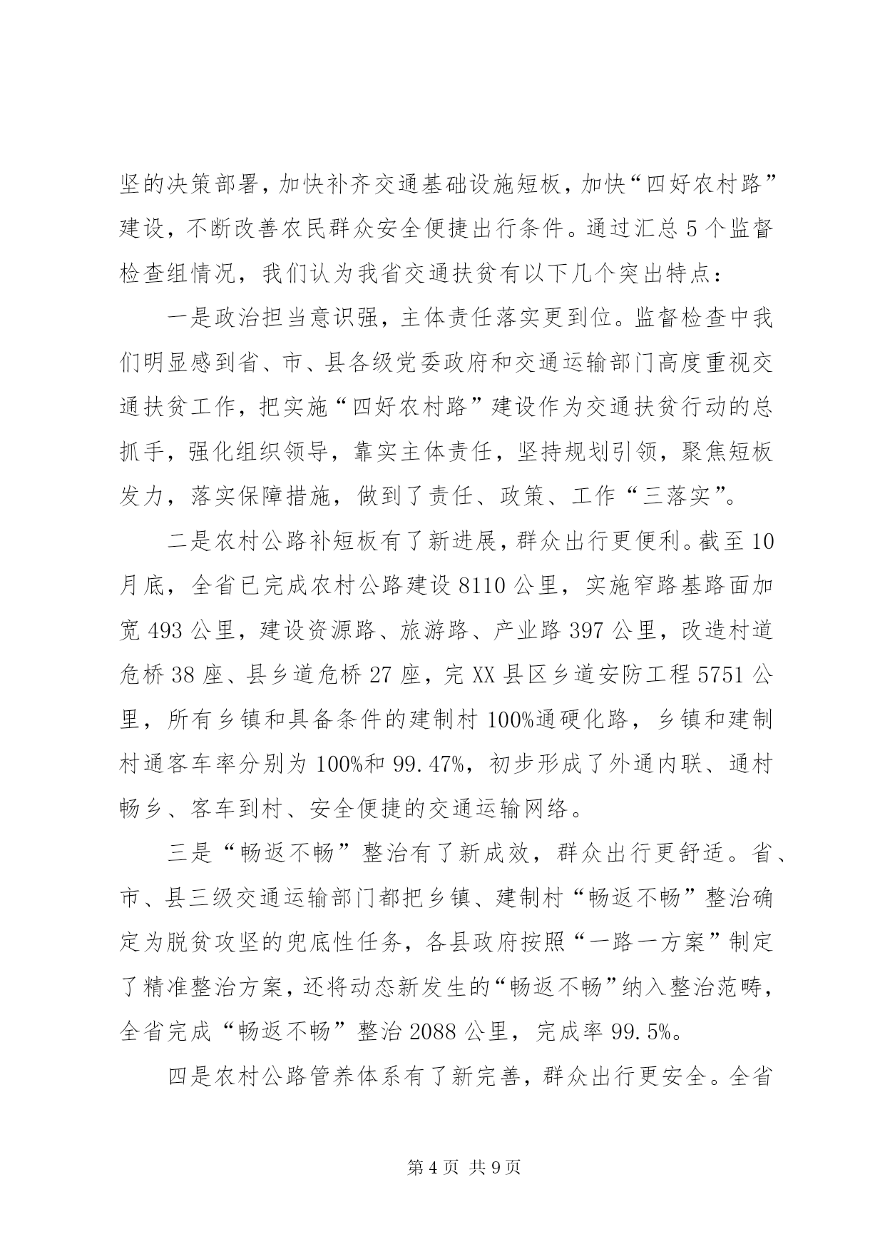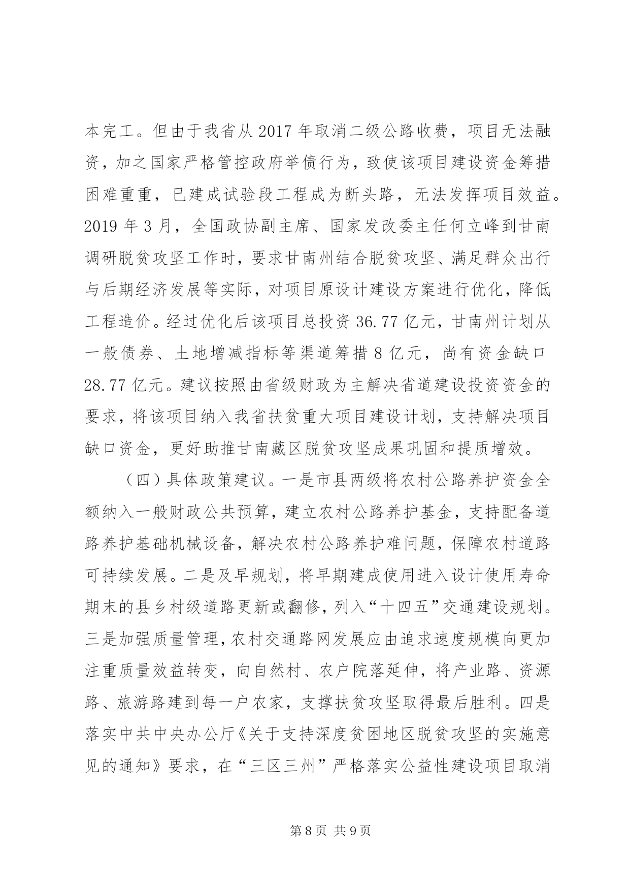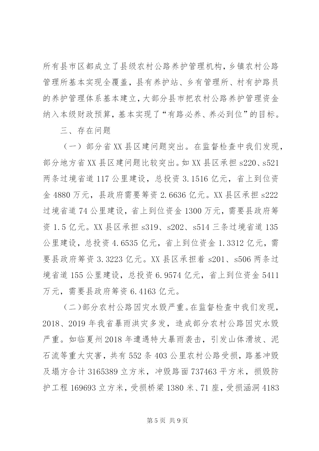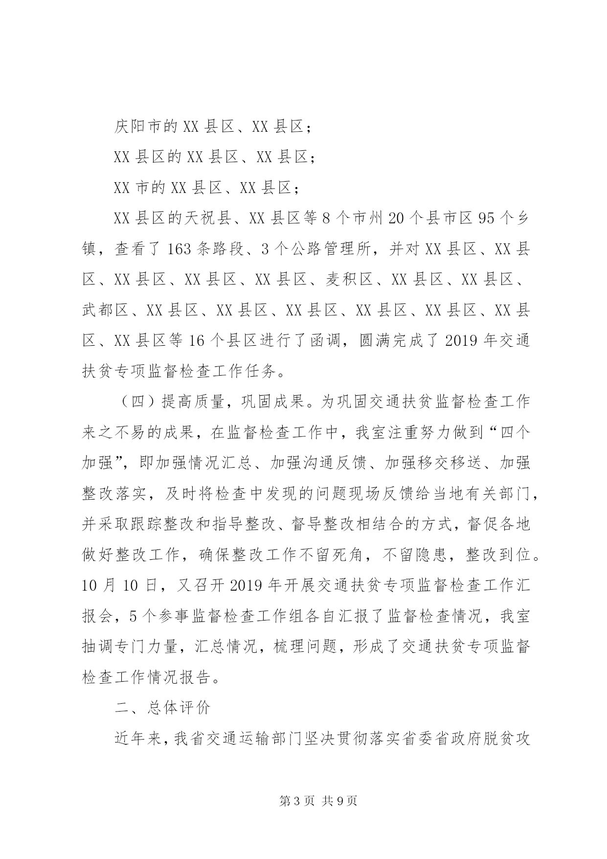第PAGE\*Arabic\*MERGEFORMAT9页共NUMPAGES\*MERGEFORMAT9页关于交通扶贫专项监督检查报告2019年,根据省委、省政府办公厅《关于加强重大扶贫工程建设项目和到村到户帮扶措施落实情况监督检查工作的通知》精神,省政府参事室坚持以习近平总书记关于“四好农村路”建设的重要指示批示精神和视察甘肃时重要讲话精神为指导,切实提高思想认识,明确监督检查任务,落实监督检查措施,履行监督检查职责,充分发挥省政府参事智力支持、勇于担当、敢讲真话、民主监督的作用,与全省交通运输部门密切配合,全面完成了2019年交通扶贫专项监督检查任务,为全省脱贫攻坚做出了应有贡献。现简要报告如下:一、基本做法(一)高度重视,严密组织。为了切实做好交通扶贫专项监督检查工作,省政府参事室成立了由主任郭清祥任组长,副主任卢杰章、魏琳及有关省政府参事、机关各处室主要负责人为成员的2019年交通扶贫专项监督检查工作领导小组,负责对监督检查情况进行跟踪、督导、协调。在与省脱贫攻坚领导小组办公室、省交通运输厅联系沟通及广泛征求意见的基础上,制定了《XX省人民政府参事室关于交通扶贫专项监督检查工作实施方案》,由3个室领导及工作责任心强的参事带队,举全室之力,从省政府参事及机关干部中抽调业务能力精湛、工作责任心强的25名同志组成5个监督检查组,每个检查组都细化了小组检查方案、健全清单台账,明确任务分工,强化责任落实。(二)开展培训,有的放矢。开展监督检查前,我室还召开了专题培训动员会,对检查人员进行了指导培训,要求检查人员认真学习中央、省委有关精神,努力做到思想认识到位、政策把握到位、联络沟通到位、情况熟悉到位,指出监督检查的目的是督促市县政府抓紧补齐农村道路基础设施短板和弱项,督促有关市县乡落实责任、落实政策和落实任务。监督检查的方式是实地核查、随机抽查、现场访谈、听取介绍、查阅资料、反馈意见。监督检查的重点是“两州一县”、深度贫困县以及2019年拟脱贫摘帽的县市区。监督检查的标准是努力让群众走上平安放心路、幸福小康路。通过培训,使监督检查人员掌握了政策,做到心中有数,有的放矢。(三)突出重点,真查实查。2019年,省政府参事室交通扶贫监督检查工作重点围绕具备条件的乡镇和建制村通硬化路、“畅返不畅”整治工程、安全生命防护工程、窄路基路面加宽、危桥改造、水毁公路修复及农村公路养护管理等“10个方面”,从9月16日至25日开展了为期10天的监督检查。检查组实地到临夏州的XX县区、积石山县、XX县区、XX县区;甘南州的XX县区、XX县区、XX县区、XX县区;陇南市的XX县区、XX县区;XX市的XX县区、张家川县;庆阳市的XX县区、XX县区;XX县区的XX县区、XX县区;XX市的XX县区、XX县区;XX县区的天祝县、XX县区等8个市州20个县市区95个乡镇,查看了163条路段、3个公路管理所,并对XX县区、XX县区、XX县区、XX县区、XX县区、麦积区、XX县区、XX县区、武都区、XX县区、XX县区、XX县区、XX县区、XX县区、XX县区、XX县区等16个县区进行了函调,圆满完成了2019年交通扶贫专项监督检查工作任务。(四)提高质量,巩固成果。为巩固交通扶贫监督检查工作来之不易的成果,在监督检查工作中,我室注重努力做到“四个加强”,即加强情况汇总、加强沟通反馈、加强移交移送、加强整改落实,及时将检查中发现的问题现场反馈给当地有关部门,并采取跟踪整改和指导整改、督导整改相结合的方式,督促各地做好整改工作,确保整改工作不留死角,不留隐患,整改到位。10月10日,又召开2019年开展交通扶贫专项监督检查工作汇报会,5个参事监督检查工作组各自汇报了监督检查情况,我室抽调专门力量,汇总情况,梳理问题,形成了交通扶贫专项监督检查工作情况报告。二、总体评价近年来,我省交通运输部门坚决贯彻落实省委省政府脱贫攻坚的决策部署,加快补齐交通基础设施短板,加快“四好农村路”建设,不断改善农民群众安全便捷出行条件。通过汇总5个监督检查组情况,我们认为我省交通扶贫有以下几个突出特点:一是政治担当意识强,主体责任落实更到位。监督检查中我们明显感到省、市、县各级党委政府和交通运输部门高度重视交通扶贫工作,把实施“四好农村路”建设作为交通扶贫行动的总抓手,强化组织领导,靠实主体责任,坚持规划引领,聚焦短板发力,落实保障措施,做到了责任、政策、工作“三落实”。二是农村公路补短板有了新进展,群众出行更便利。截至10月底,全省已完成农村公路建设8110公里,实施窄路基路面加宽493公里,建设资源路、旅游路、产业路397公里,改造村道危桥38座、县乡道危桥27座,完XX县区乡道安防工程5751公里,所有乡镇和具备条件的建制村100%通硬化路,乡镇和建制村通客车率