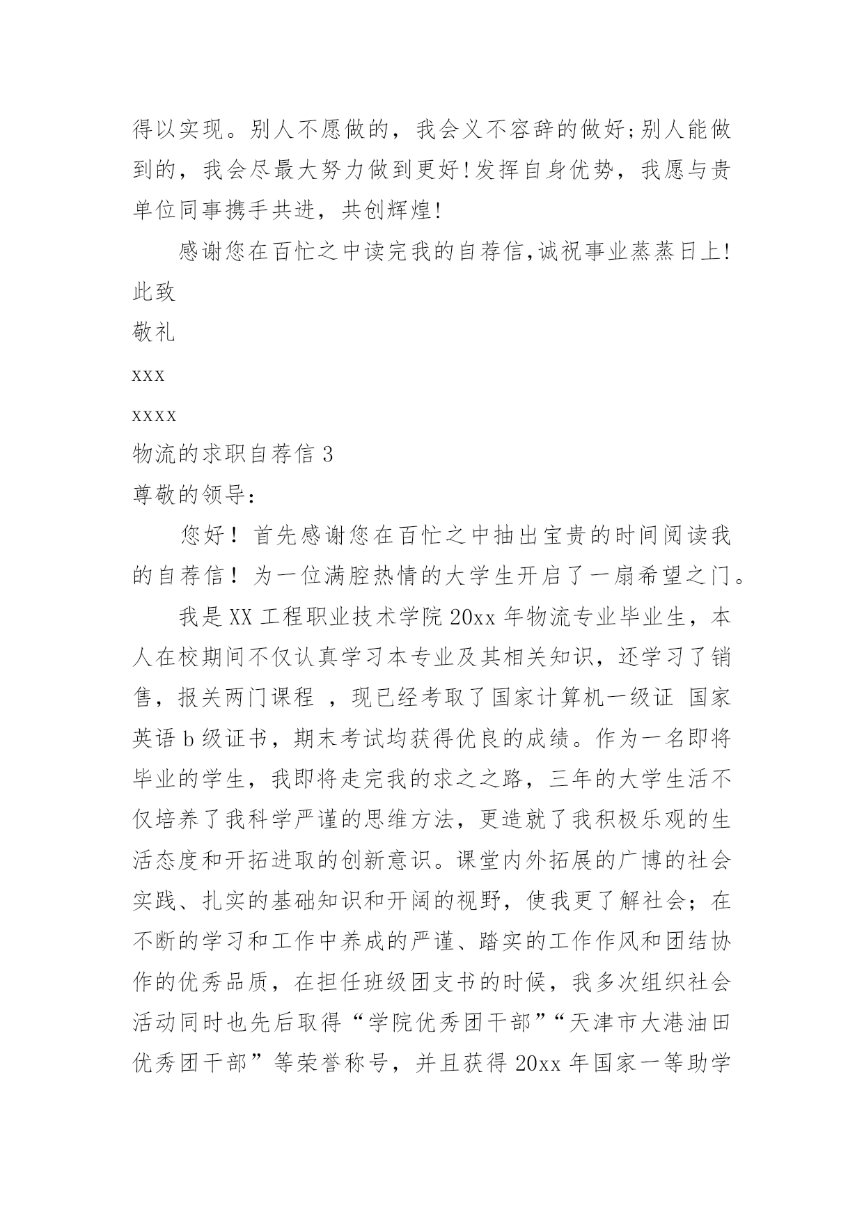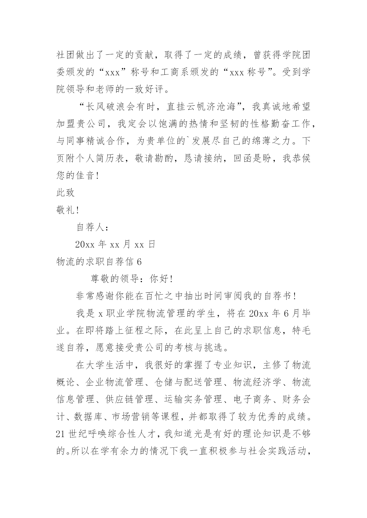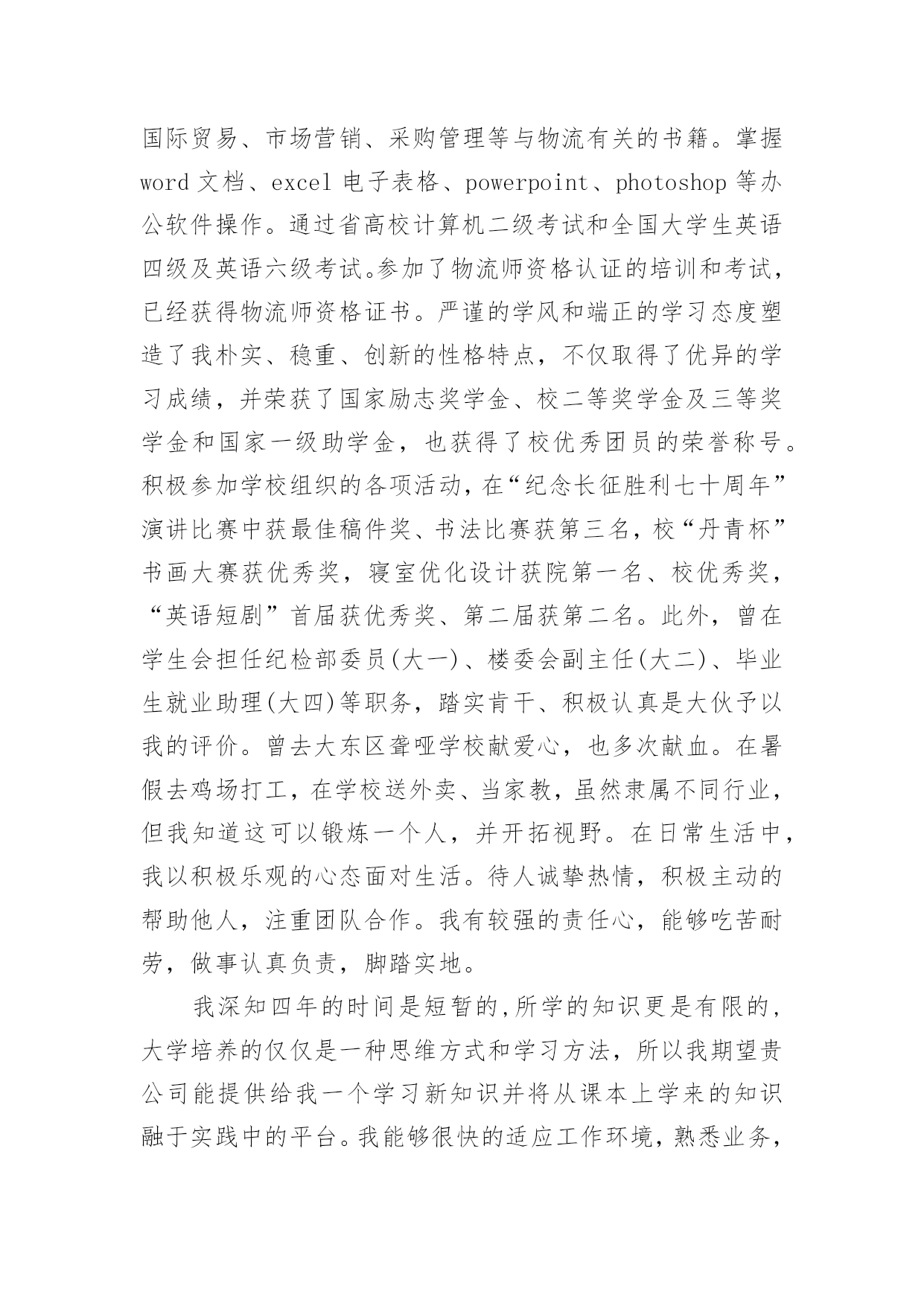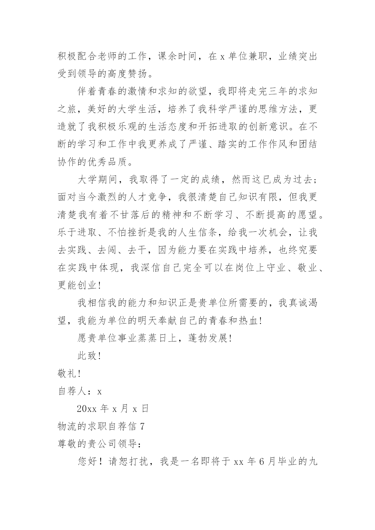 物流的求职自荐信物流的求职自荐信15篇在一步步向前发展的社会中,用到自荐信的地方越来越多,通过自荐信,我们可以展示自己的长处。那么问题来了,自荐信应该怎么写?下面是小编整理的物流的求职自荐信,仅供参考,希望能够帮助到大家。物流的求职自荐信1尊敬的领导:您好!首先感谢您在百忙之中阅览我的自荐信,为一位满腔热血的毕业学生开启一扇希望之门。我叫马xx,毕业于郑州交通学院物流专业。普通的院校,普通的我却拥有一颗不甘于平凡的心。我,自信,乐观,敢于迎接一切挑战。虽然只是一名普通的专科毕业生,但是,年轻是我的本钱,拼搏是我的天性,努力是我的责任,我坚信,成功定会成为必然。我很喜欢自己的专业,投入了大量的精力,并打算把物流作为自己的职业发展方向,我对物流这个职业的发展前景很有信心,在校期间我系统的学习了物流的相关知识,专业成绩优秀,为进一步掌握物流知识和技能,我参加了物流师资格证的考试,更深入具体的学习了物流知识,并在课余期间去图书馆阅读大量关于物流方面的书籍,通过杂志,网络我了解到物流的发展动态,并对物流兴趣更浓厚,我觉得我有信心在物流方面作出成绩来。对于专业的热爱,我很注重专业知识的应用,在生活中培养工业工程意识,并在老师的引导还学习其他有关物流反方面的知识,我性格比较外向,喜欢思考,洞察里较强,不怕吃苦,大学期间,我参加过多次社会实践活动,并在几个地方做过兼职,正因为如此,使我积累了丰富的实践经验,而且更加注重团队合作精神和集体观念,同时也更加明确了我的人生目标。自助者天助。一直以来,我都把这句话作为鼓励我和推动我不断进步的格言。我相信:有志者事竟成。我决心:要在新的起点,新的层次,以新的姿态,展现新的风貌,书写新的记录,创造新的成绩,我的自信,来自我的能力,您的鼓励;我的希望寄托于您的慧眼:请您把信任和希望留给我。如果你难以抉择,请关注我;因为您一刻的斟酌,将会是我一生的选择!祝贵公司事业蒸蒸日上,屡创佳绩!再次感谢您阅读我的求职信!物流的求职自荐信2尊敬的领导:您好!感谢您在百忙中阅读我的自荐信,您的信任就是我的动力!我叫张婷婷,毕业于长安大学物流管理专业。普通的院校,普通的我却拥有一颗不甘于平凡的心。我,自信,乐观,敢于迎接一切挑战。虽然只是一名普通的本科毕业生,但是,年轻是我的本钱,拼搏是我的天性,努力是我的责任,我坚信,成功定会成为必然。经过大学四年锤炼,在面对未来事业的'选择时,我对自己有了更清醒的认识,由于我在大学中锻练了较好的学习能力,加上“努力做到最好”的天性使然,四年中,我在班级的考试中均名列前茅,在班级100多名的学生中,我一直保持了前五名的好成绩,在学年600多人中,我也总是能排在学年前30名,与学校三等奖学金有着不解之缘。在大学四年中,我也练就了较好的实验操做技能,既能适应日后的工作,还能不断地充实自己。在大四时由于专业课成绩较好,被列入班级保送研究生的名单,可惜的是,在班级只有四个保研名额的情况下,我仅以一分之差与之失之交臂。但是,我知道,一切的辉煌与失败早已成为过去,我将要面对的是更具挑战的未来。听闻贵公司招聘物流管理专业的技术人员,我冒昧地投出自己的求职简历,四年的寒窗苦读给了我扎实的理论知识、实验操做技能及表达能力,我虽然只是一个普通的本科毕业生,但大学四年教会了我什么叫“学无止境”,我相信,在我不断努力刻苦的学习中,我一定能够胜任这份高尚的职业。一直坚信“天道酬勤”,我的人生信条是“人生在勤,不索何获”。给我一次机会,我会尽职尽责。一个人惟有把所擅长的投入到社会中才能使自我价值得以实现。别人不愿做的,我会义不容辞的做好;别人能做到的,我会尽最大努力做到更好!发挥自身优势,我愿与贵单位同事携手共进,共创辉煌!感谢您在百忙之中读完我的自荐信,诚祝事业蒸蒸日上!此致敬礼xxxxxxx物流的求职自荐信3尊敬的领导:您好!首先感谢您在百忙之中抽出宝贵的时间阅读我的自荐信!为一位满腔热情的大学生开启了一扇希望之门。我是XX工程职业技术学院20xx年物流专业毕业生,本人在校期间不仅认真学习本专业及其相关知识,还学习了销售,报关两门课程,现已经考取了国家计算机一级证国家英语b级证书,期末考试均获得优良的成绩。作为一名即将毕业的学生,我即将走完我的求之之路,三年的大学生活不仅培养了我科学严谨的思维方法,更造就了我积极乐观的生活态度和开拓进取的创新意识。课堂内外拓展的广博的社会实践、扎实的基础知识和开阔的视野,使我更了解社会;在不断的学习和工作中养成的严谨、踏实的工作作风和团结协作的优秀品质,在担任班级团支书的时候,我多次组织社会活动同时也先后取得“学院优秀团干部”“天津市大港油田优秀团干部”等荣誉称号,并且获得20xx年国家一等助学金。使我深信自己可以在岗位上守业、敬业、更能创业!我相信我的能力和知识正是贵单位所