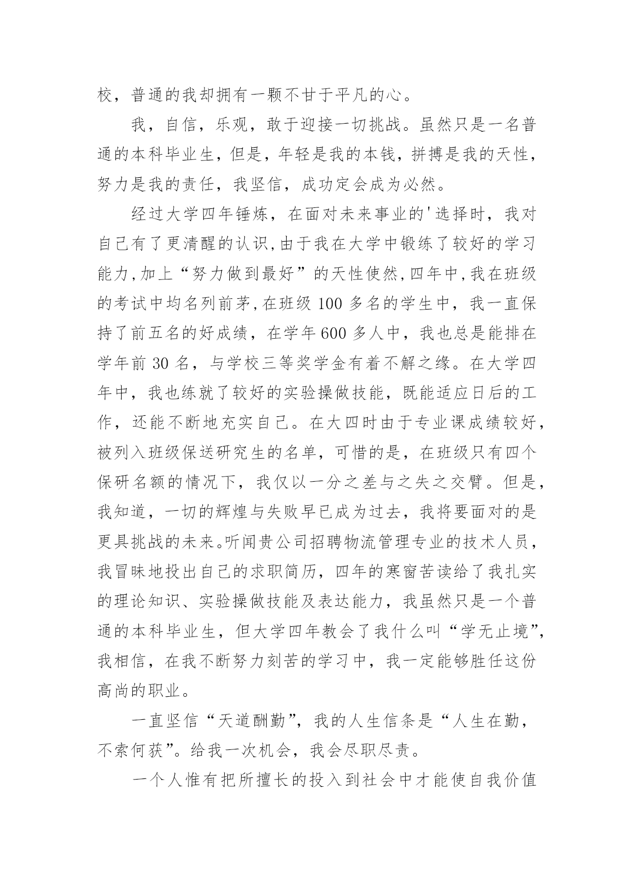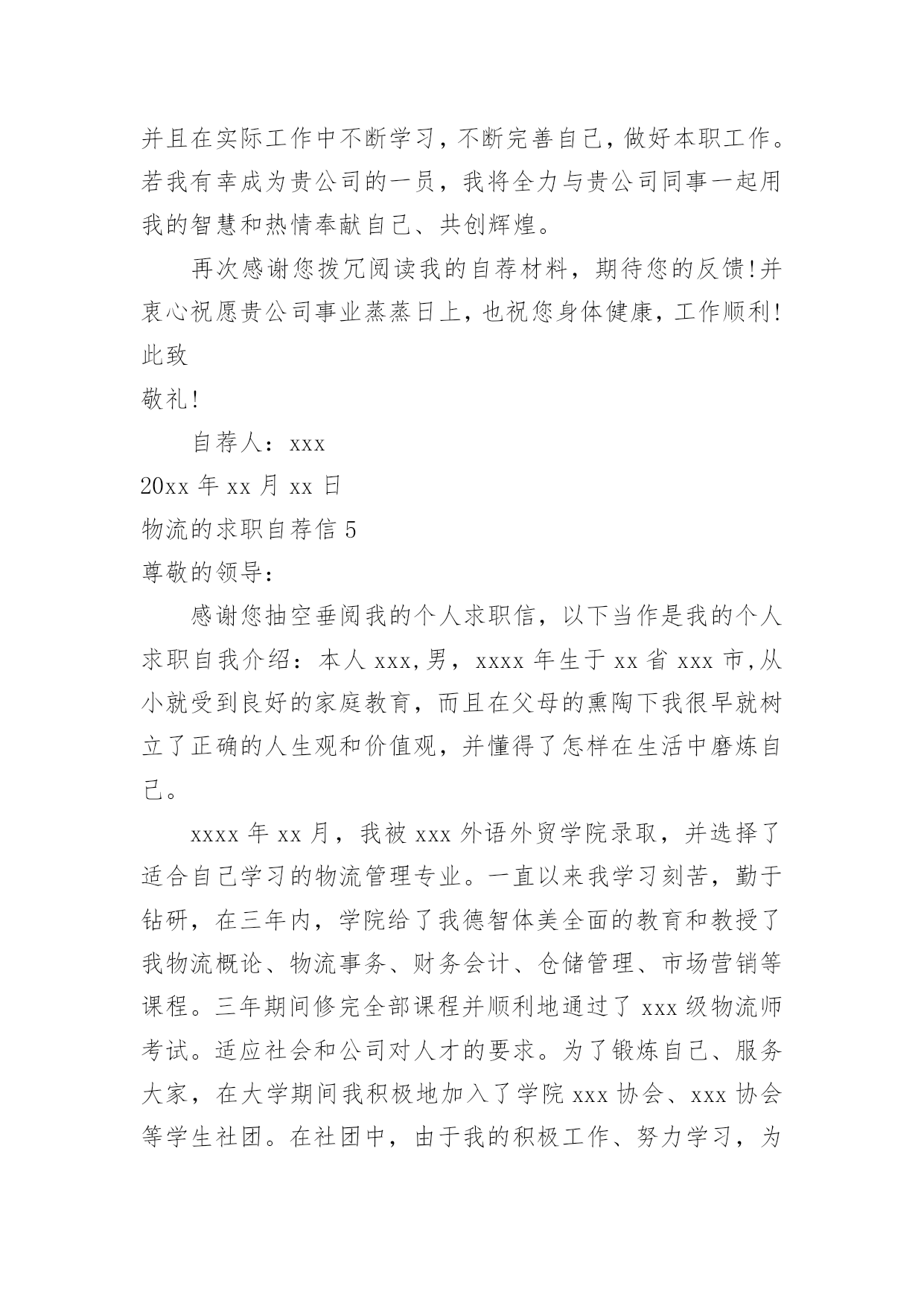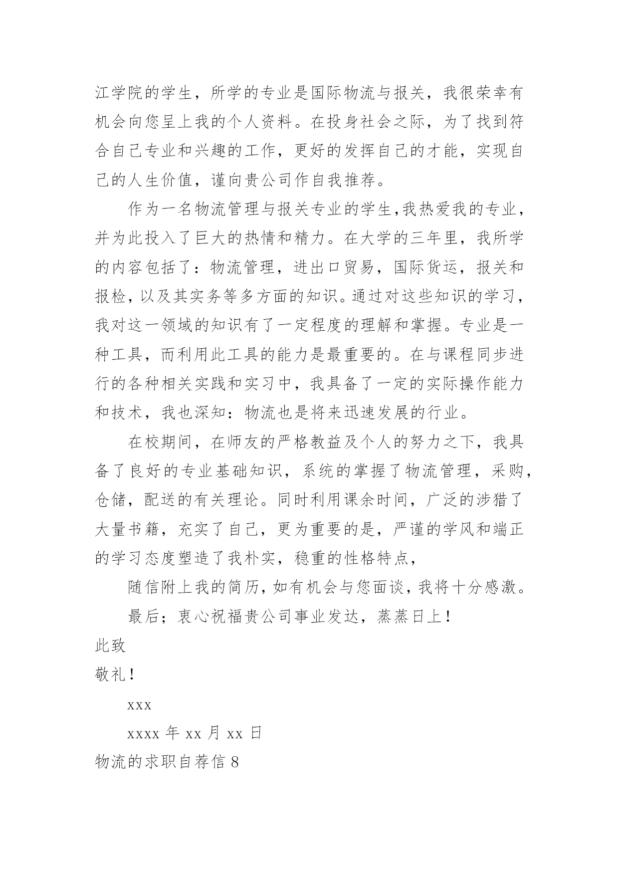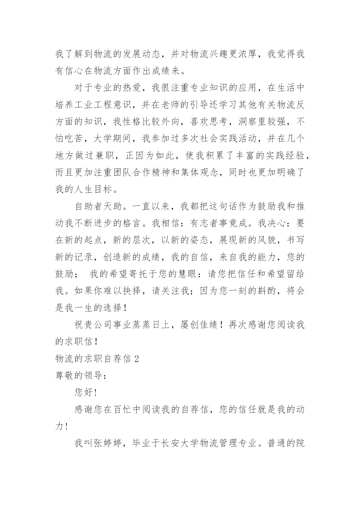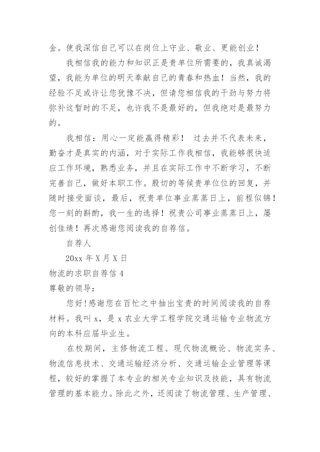 物流的求职自荐信物流的求职自荐信15篇在一步步向前发展的社会中,用到自荐信的地方越来越多,通过自荐信,我们可以展示自己的长处。那么问题来了,自荐信应该怎么写?下面是小编整理的物流的求职自荐信,仅供参考,希望能够帮助到大家。物流的求职自荐信1尊敬的领导:您好!首先感谢您在百忙之中阅览我的自荐信,为一位满腔热血的毕业学生开启一扇希望之门。我叫马xx,毕业于郑州交通学院物流专业。普通的院校,普通的我却拥有一颗不甘于平凡的心。我,自信,乐观,敢于迎接一切挑战。虽然只是一名普通的专科毕业生,但是,年轻是我的本钱,拼搏是我的天性,努力是我的责任,我坚信,成功定会成为必然。我很喜欢自己的专业,投入了大量的精力,并打算把物流作为自己的职业发展方向,我对物流这个职业的发展前景很有信心,在校期间我系统的学习了物流的相关知识,专业成绩优秀,为进一步掌握物流知识和技能,我参加了物流师资格证的考试,更深入具体的学习了物流知识,并在课余期间去图书馆阅读大量关于物流方面的书籍,通过杂志,网络我了解到物流的发展动态,并对物流兴趣更浓厚,我觉得我有信心在物流方面作出成绩来。对于专业的热爱,我很注重专业知识的应用,在生活中培养工业工程意识,并在老师的引导还学习其他有关物流反方面的知识,我性格比较外向,喜欢思考,洞察里较强,不怕吃苦,大学期间,我参加过多次社会实践活动,并在几个地方做过兼职,正因为如此,使我积累了丰富的实践经验,而且更加注重团队合作精神和集体观念,同时也更加明确了我的人生目标。自助者天助。一直以来,我都把这句话作为鼓励我和推动我不断进步的格言。我相信:有志者事竟成。我决心:要在新的起点,新的层次,以新的姿态,展现新的风貌,书写新的记录,创造新的成绩,我的自信,来自我的能力,您的鼓励;我的希望寄托于您的慧眼:请您把信任和希望留给我。如果你难以抉择,请关注我;因为您一刻的斟酌,将会是我一生的选择!祝贵公司事业蒸蒸日上,屡创佳绩!再次感谢您阅读我的求职信!物流的求职自荐信2尊敬的领导:您好!感谢您在百忙中阅读我的自荐信,您的信任就是我的动力!我叫张婷婷,毕业于长安大学物流管理专业。普通的院校,普通的我却拥有一颗不甘于平凡的心。我,自信,乐观,敢于迎接一切挑战。虽然只是一名普通的本科毕业生,但是,年轻是我的本钱,拼搏是我的天性,努力是我的责任,我坚信,成功定会成为必然。经过大学四年锤炼,在面对未来事业的'选择时,我对自己有了更清醒的认识,由于我在大学中锻练了较好的学习能力,加上“努力做到最好”的天性使然,四年中,我在班级的考试中均名列前茅,在班级100多名的学生中,我一直保持了前五名的好成绩,在学年600多人中,我也总是能排在学年前30名,与学校三等奖学金有着不解之缘。在大学四年中,我也练就了较好的实验操做技能,既能适应日后的工作,还能不断地充实自己。在大四时由于专业课成绩较好,被列入班级保送研究生的名单,可惜的是,在班级只有四个保研名额的情况下,我仅以一分之差与之失之交臂。但是,我知道,一切的辉煌与失败早已成为过去,我将要面对的是更具挑战的未来。听闻贵公司招聘物流管理专业的技术人员,我冒昧地投出自己的求职简历,四年的寒窗苦读给了我扎实的理论知识、实验操做技能及表达能力,我虽然只是一个普通的本科毕业生,但大学四年教会了我什么叫“学无止境”,我相信,在我不断努力刻苦的学习中,我一定能够胜任这份高尚的职业。一直坚信“天道酬勤”,我的人生信条是“人生在勤,不索何获”。给我一次机会,我会尽职尽责。一个人惟有把所擅长的投入到社会中才能使自我价值得以实现。别人不愿做的,我会义不容辞的做好;别人能做到的,我会尽最大努力做到更好!发挥自身优势,我愿与贵单位同事携手共进,共创辉煌!感谢您在百忙之中读完我的自荐信,诚祝事业蒸蒸日上!此致敬礼xxxxxxx物流的求职自荐信3尊敬的领导:您好!首先感谢您在百忙之中抽出宝贵的时间阅读我的自荐信!为一位满腔热情的大学生开启了一扇希望之门。我是XX工程职业技术学院20xx年物流专业毕业生,本人在校期间不仅认真学习本专业及其相关知识,还学习了销售,报关两门课程,现已经考取了国家计算机一级证国家英语b级证书,期末考试均获得优良的成绩。作为一名即将毕业的学生,我即将走完我的求之之路,三年的大学生活不仅培养了我科学严谨的思维方法,更造就了我积极乐观的生活态度和开拓进取的创新意识。课堂内外拓展的广博的社会实践、扎实的基础知识和开阔的视野,使我更了解社会;在不断的学习和工作中养成的严谨、踏实的工作作风和团结协作的优秀品质,在担任班级团支书的时候,我多次组织社会活动同时也先后取得“学院优秀团干部”“天津市大港油田优秀团干部”等荣誉称号,并且获得20xx年国家一等助学金。使我深信自己可以在岗位上守业、敬业、更能创业!我相信我的能力和知识正是贵单位所