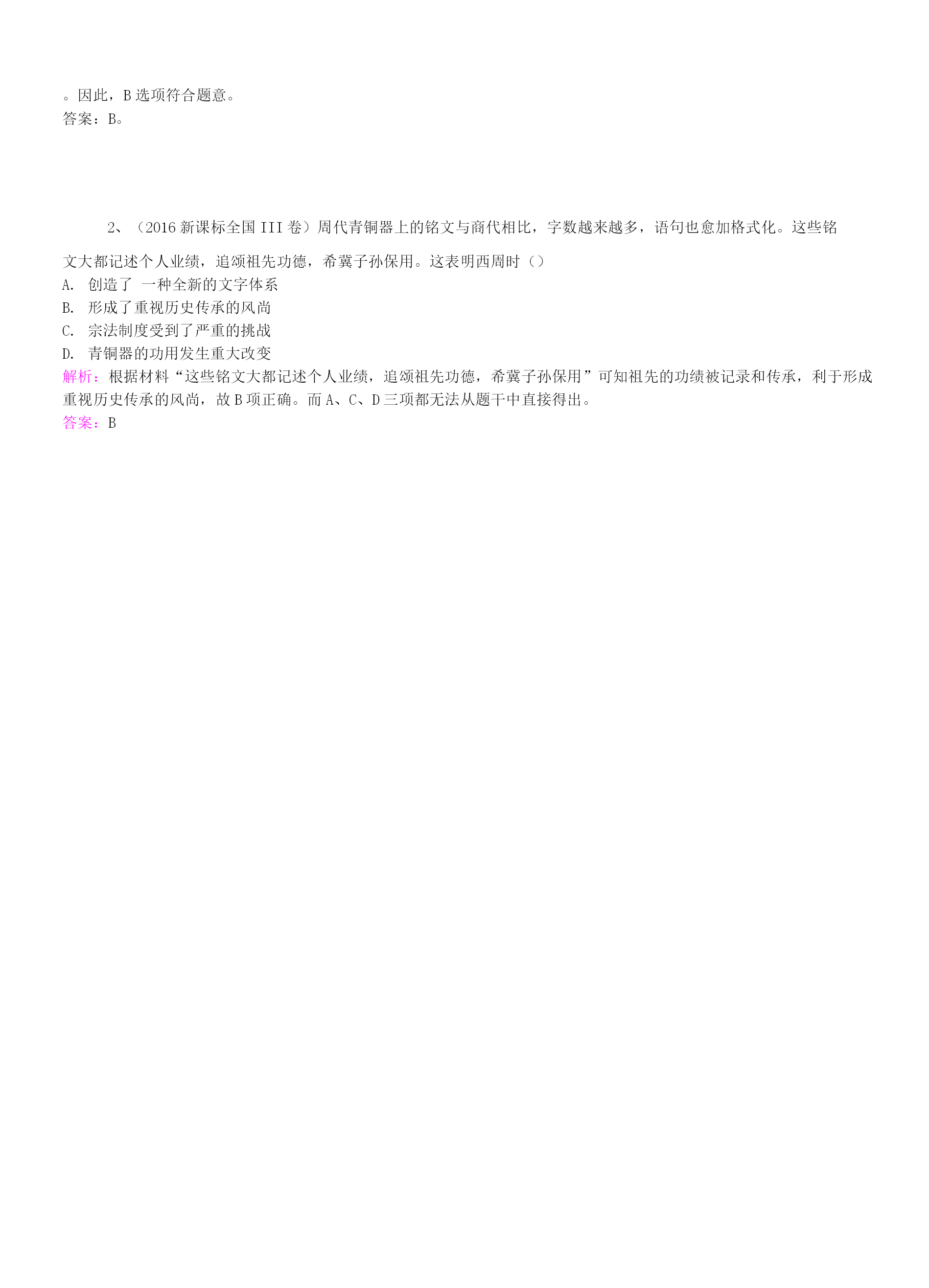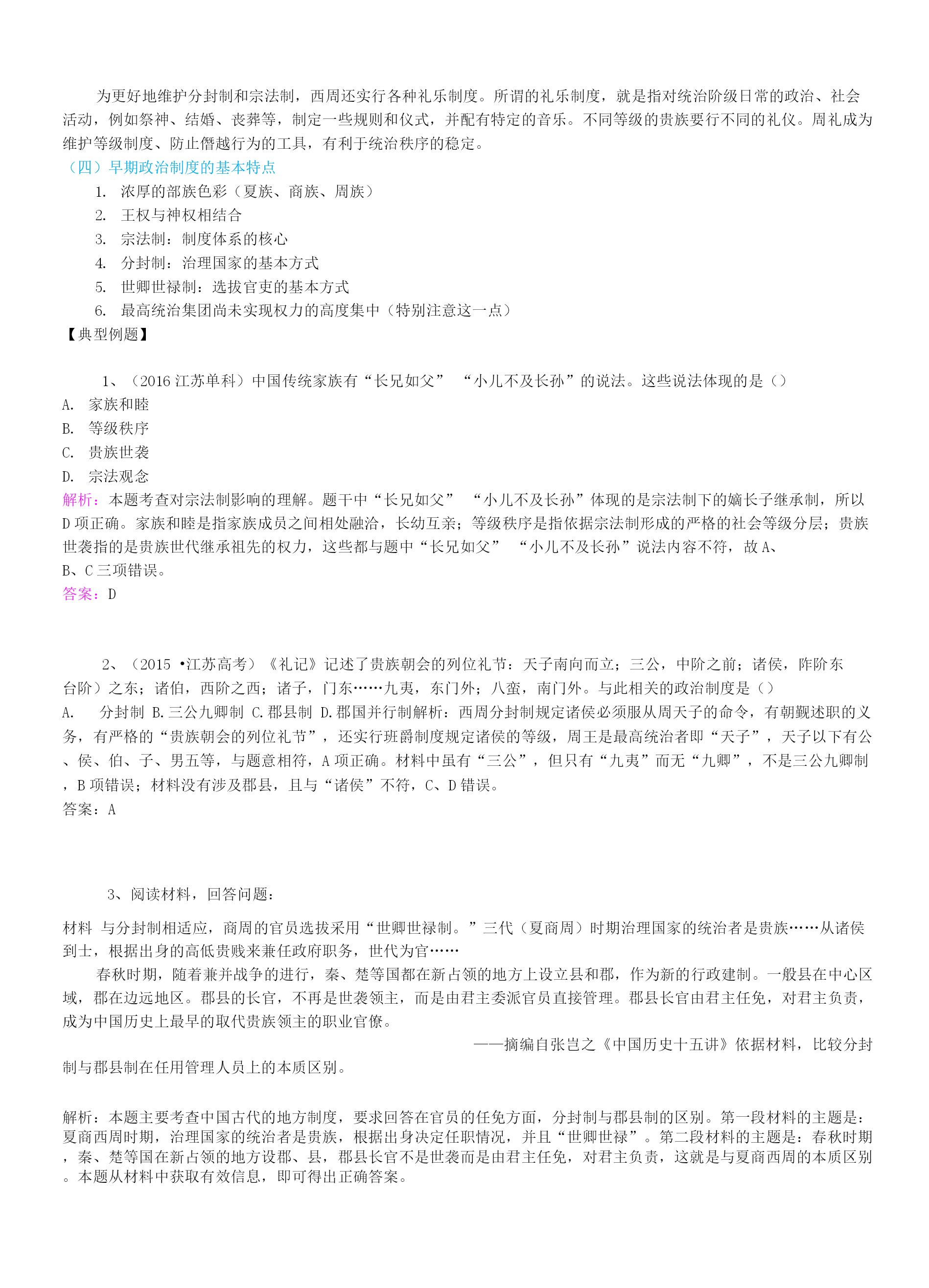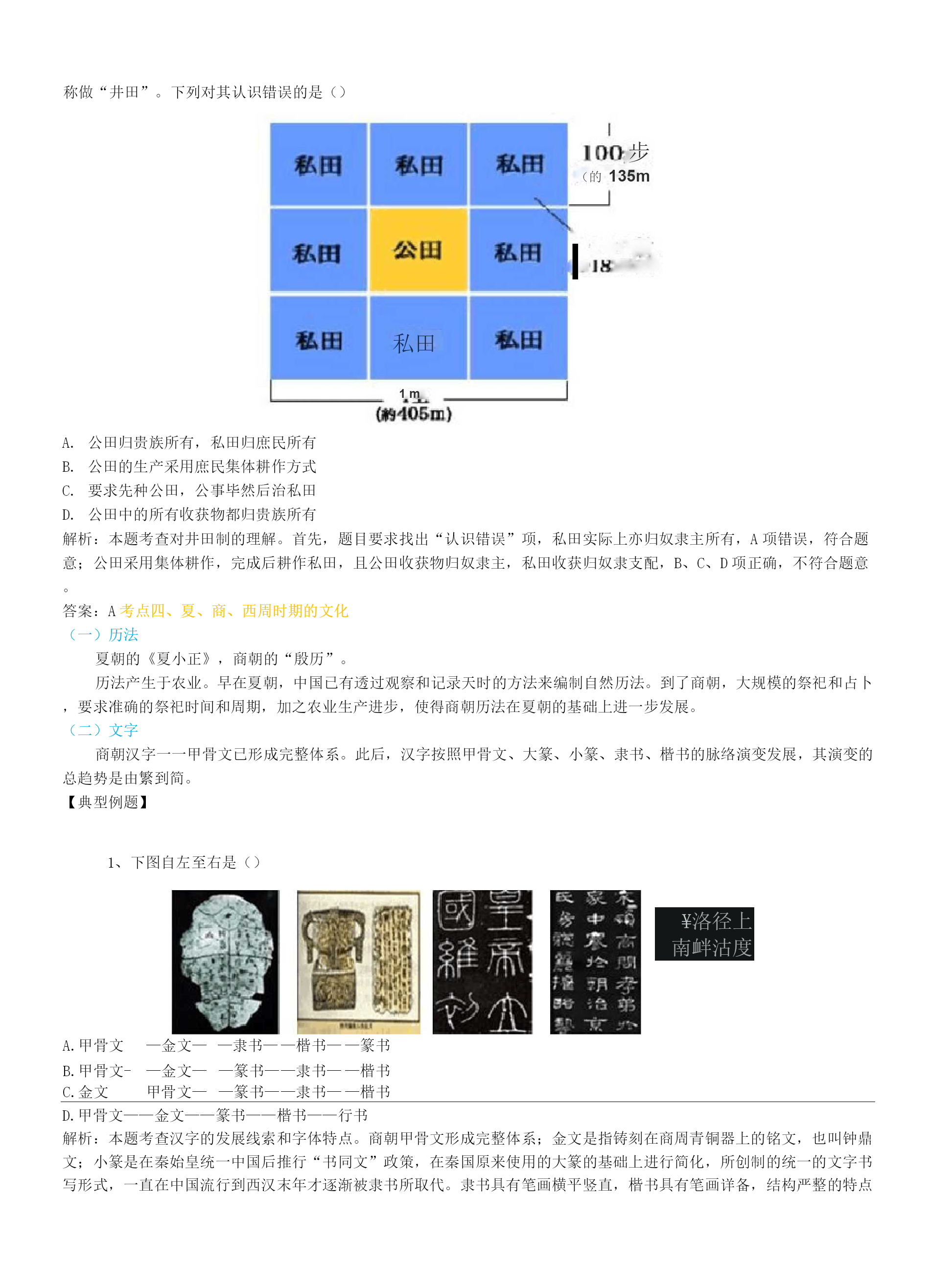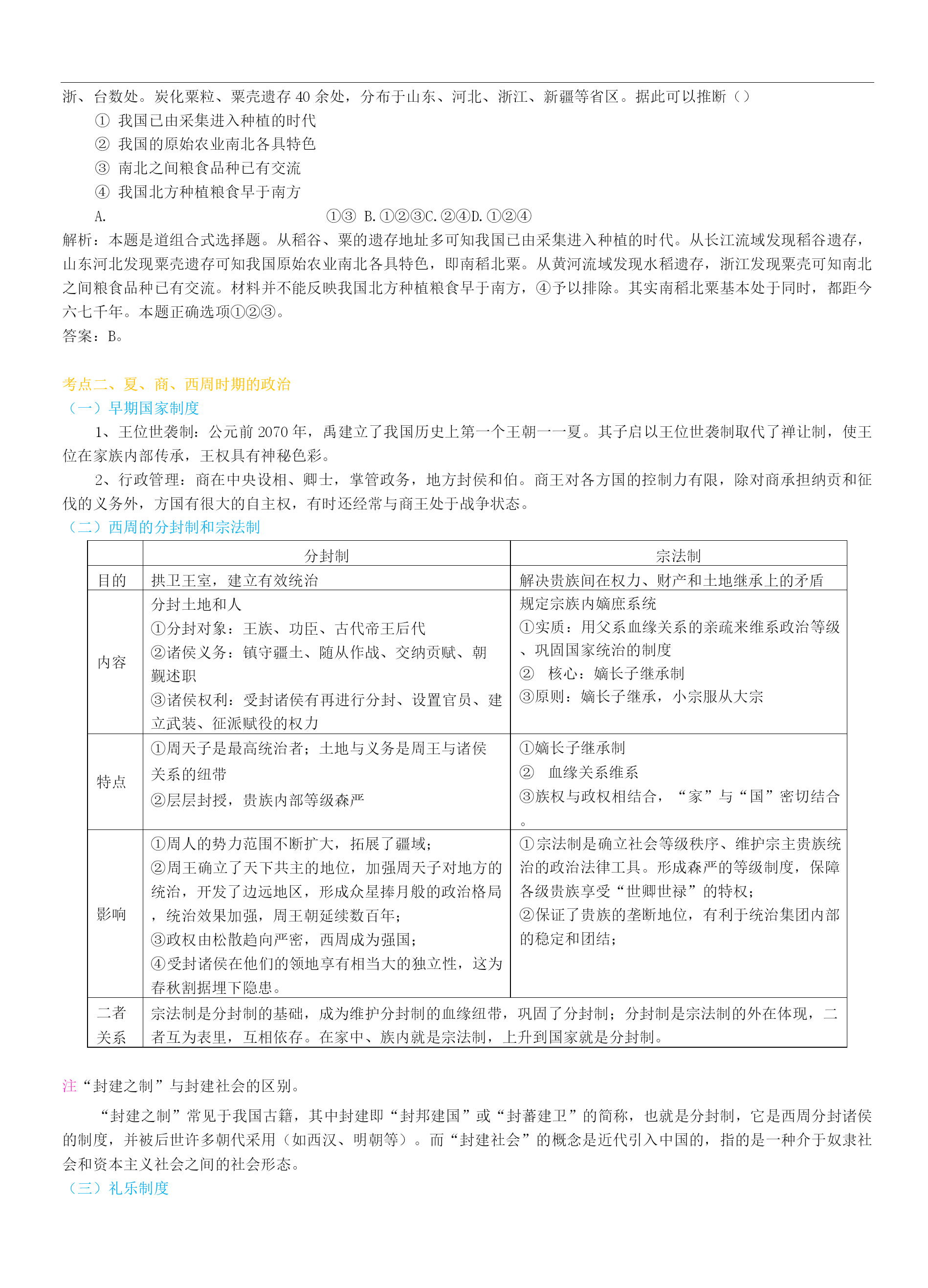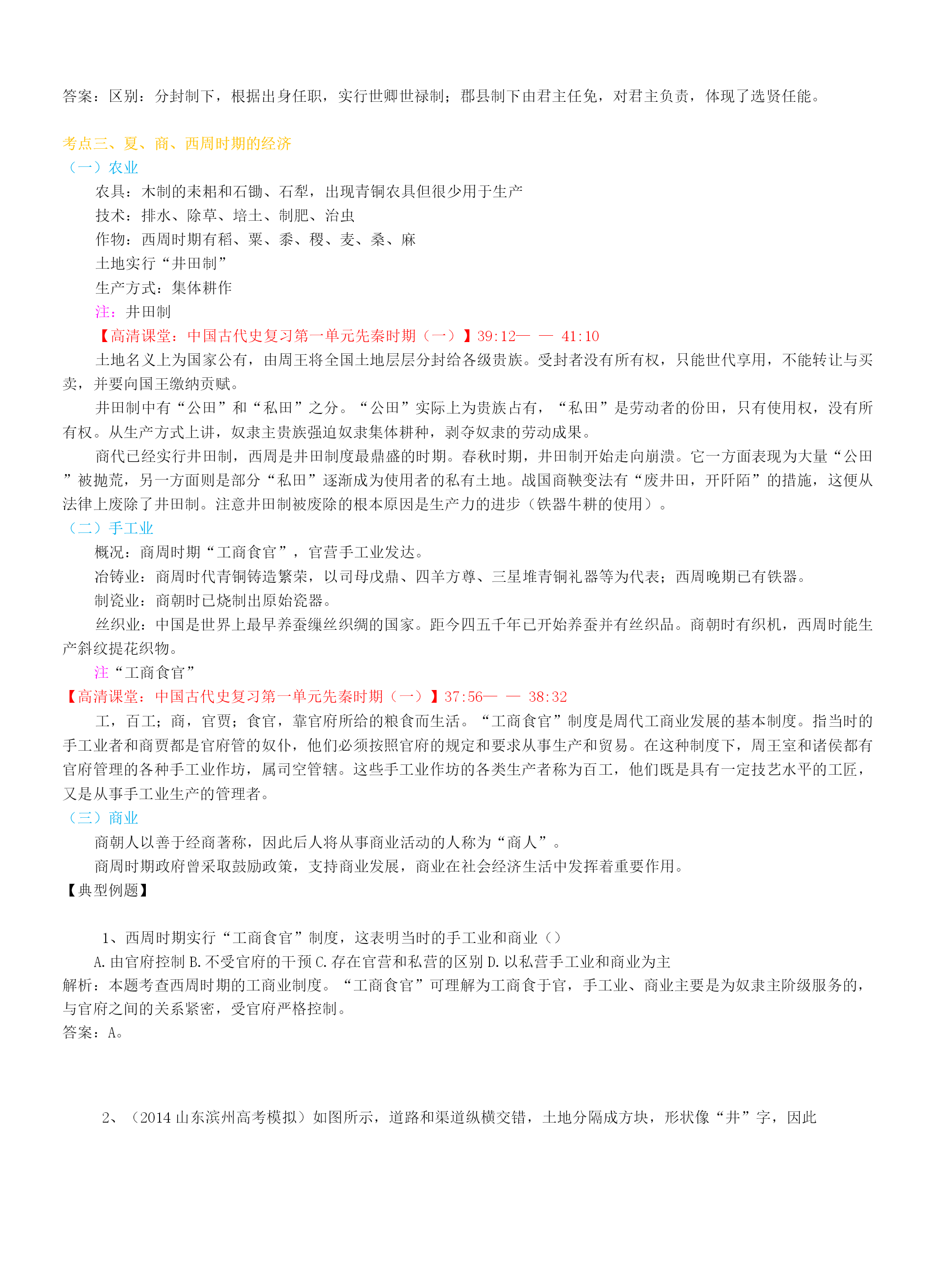 高考总复习:先秦时期(一)——夏、商、西周时期考纲解读考点提示1、夏商西周时期的政治分封制、宗法制2、夏商西周时期的经济3、夏商西周时期的文化复习建议高考对夏、商、西周时期的考查主要集中在政治制度方面。所以请同学们务必将宗法制、分封制的基本内容熟记于心,考试一般是出具一段文字材料,或者创设一个情景,考查本项内容。知识清单夏:约前2070-约前16年,都城在阳城(今河南登封)商:约前16-前1046年,屡次迁都,最终定在殷(今河南安阳)西周:前1046-前771年,都城在镐京(今陕西西安)夏商西周七时期时代特征一一中华文明的初步形成时期政治一一早期国家出现,逐步形成以①制和②制为主要内容、以③为主要特征的政治制度。早期农业生产,④制基础上奴隶⑤劳动(千耦其耘);青铜制造进入繁荣时期。中华古代文明的起源文字:⑦艺术:以司母戊鼎、四羊方尊、三星堆青铜礼器为代表。历法:⑧参考答案:①分封,②宗法,③家国一体,④井田,⑤集体,⑥甲骨文,⑦青铜,⑧殷历。考点聚焦考点一、原始社会概况(一)政治:禅让制(二)经济:原始农业起源:距今一万年左右作物:南稻和北粟(世界最早)耕作方法:刀耕火种、石器锄耕土地氏族公社所有制(三)文化:原始的“图画文字”;彩陶画《鹳鱼石斧图》。注:原始社会的史实,同学们有一个大致的掌握即可。【典型例题】一项考古统计表明,我国新石器时代稻谷遗存120余处,其中长江流域90余处,黄河流域12处,另有闽、浙、台数处。炭化粟粒、粟壳遗存40余处,分布于山东、河北、浙江、新疆等省区。据此可以推断()我国已由采集进入种植的时代我国的原始农业南北各具特色南北之间粮食品种已有交流我国北方种植粮食早于南方①③B.①②③C.②④D.①②④解析:本题是道组合式选择题。从稻谷、粟的遗存地址多可知我国已由采集进入种植的时代。从长江流域发现稻谷遗存,山东河北发现粟壳遗存可知我国原始农业南北各具特色,即南稻北粟。从黄河流域发现水稻遗存,浙江发现粟壳可知南北之间粮食品种已有交流。材料并不能反映我国北方种植粮食早于南方,④予以排除。其实南稻北粟基本处于同时,都距今六七千年。本题正确选项①②③。答案:B。考点二、夏、商、西周时期的政治(一)早期国家制度1、王位世袭制:公元前2070年,禹建立了我国历史上第一个王朝一一夏。其子启以王位世袭制取代了禅让制,使王位在家族内部传承,王权具有神秘色彩。2、行政管理:商在中央设相、卿士,掌管政务,地方封侯和伯。商王对各方国的控制力有限,除对商承担纳贡和征伐的义务外,方国有很大的自主权,有时还经常与商王处于战争状态。(二)西周的分封制和宗法制分封制宗法制目的拱卫王室,建立有效统治解决贵族间在权力、财产和土地继承上的矛盾内容分封土地和人分封对象:王族、功臣、古代帝王后代诸侯义务:镇守疆土、随从作战、交纳贡赋、朝觐述职诸侯权利:受封诸侯有再进行分封、设置官员、建立武装、征派赋役的权力规定宗族内嫡庶系统实质:用父系血缘关系的亲疏来维系政治等级、巩固国家统治的制度核心:嫡长子继承制原则:嫡长子继承,小宗服从大宗特点周天子是最高统治者;土地与义务是周王与诸侯关系的纽带层层封授,贵族内部等级森严嫡长子继承制血缘关系维系族权与政权相结合,“家”与“国”密切结合。影响周人的势力范围不断扩大,拓展了疆域;周王确立了天下共主的地位,加强周天子对地方的统治,开发了边远地区,形成众星捧月般的政治格局,统治效果加强,周王朝延续数百年;政权由松散趋向严密,西周成为强国;受封诸侯在他们的领地享有相当大的独立性,这为春秋割据埋下隐患。宗法制是确立社会等级秩序、维护宗主贵族统治的政治法律工具。形成森严的等级制度,保障各级贵族享受“世卿世禄”的特权;保证了贵族的垄断地位,有利于统治集团内部的稳定和团结;二者关系宗法制是分封制的基础,成为维护分封制的血缘纽带,巩固了分封制;分封制是宗法制的外在体现,二者互为表里,互相依存。在家中、族内就是宗法制,上升到国家就是分封制。注“封建之制”与封建社会的区别。“封建之制”常见于我国古籍,其中封建即“封邦建国”或“封蕃建卫”的简称,也就是分封制,它是西周分封诸侯的制度,并被后世许多朝代采用(如西汉、明朝等)。而“封建社会”的概念是近代引入中国的,指的是一种介于奴隶社会和资本主义社会之间的社会形态。(三)礼乐制度为更好地维护分封制和宗法制,西周还实行各种礼乐制度。所谓的礼乐制度,就是指对统治阶级日常的政治、社会活动,例如祭神、结婚、丧葬等,制定一些规则和仪式,并配有特定的音乐。不同等级的贵族要行