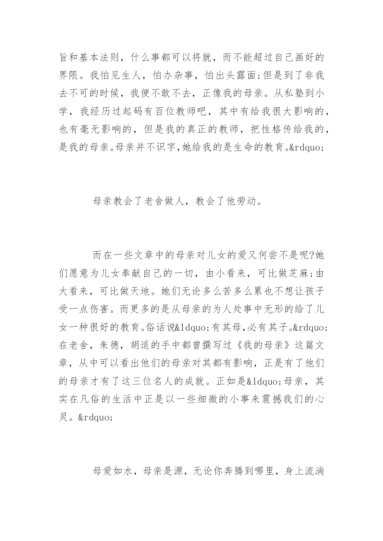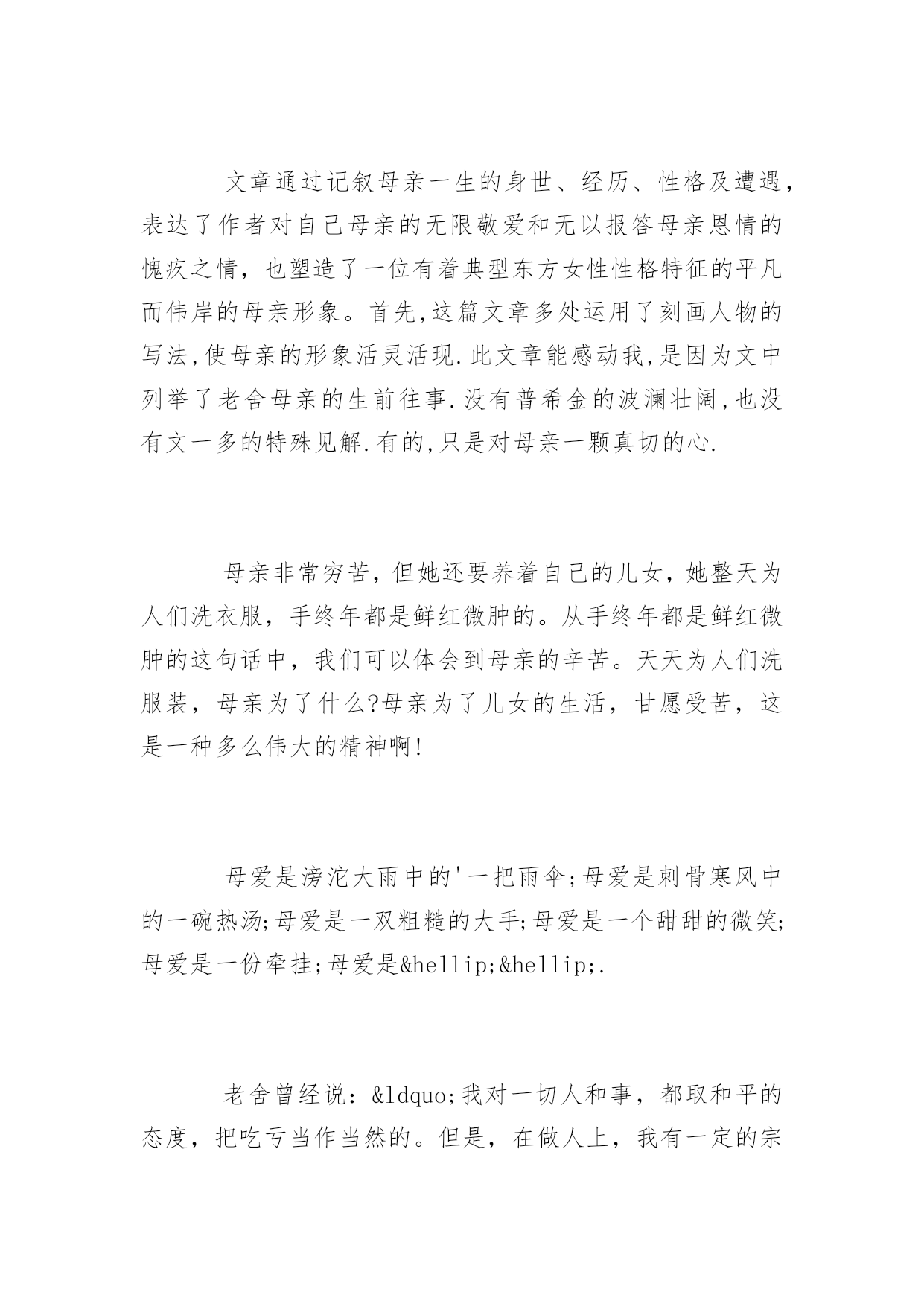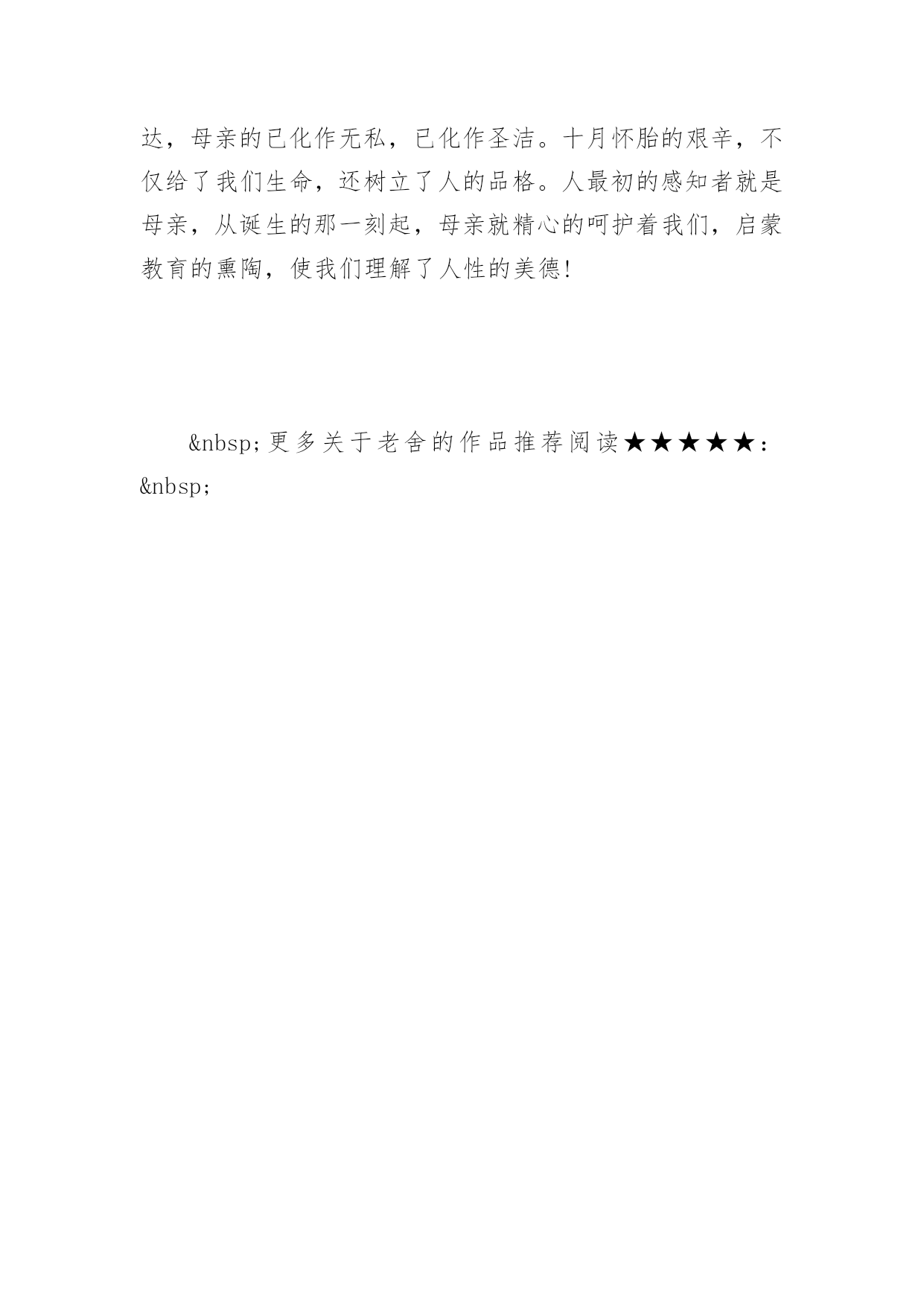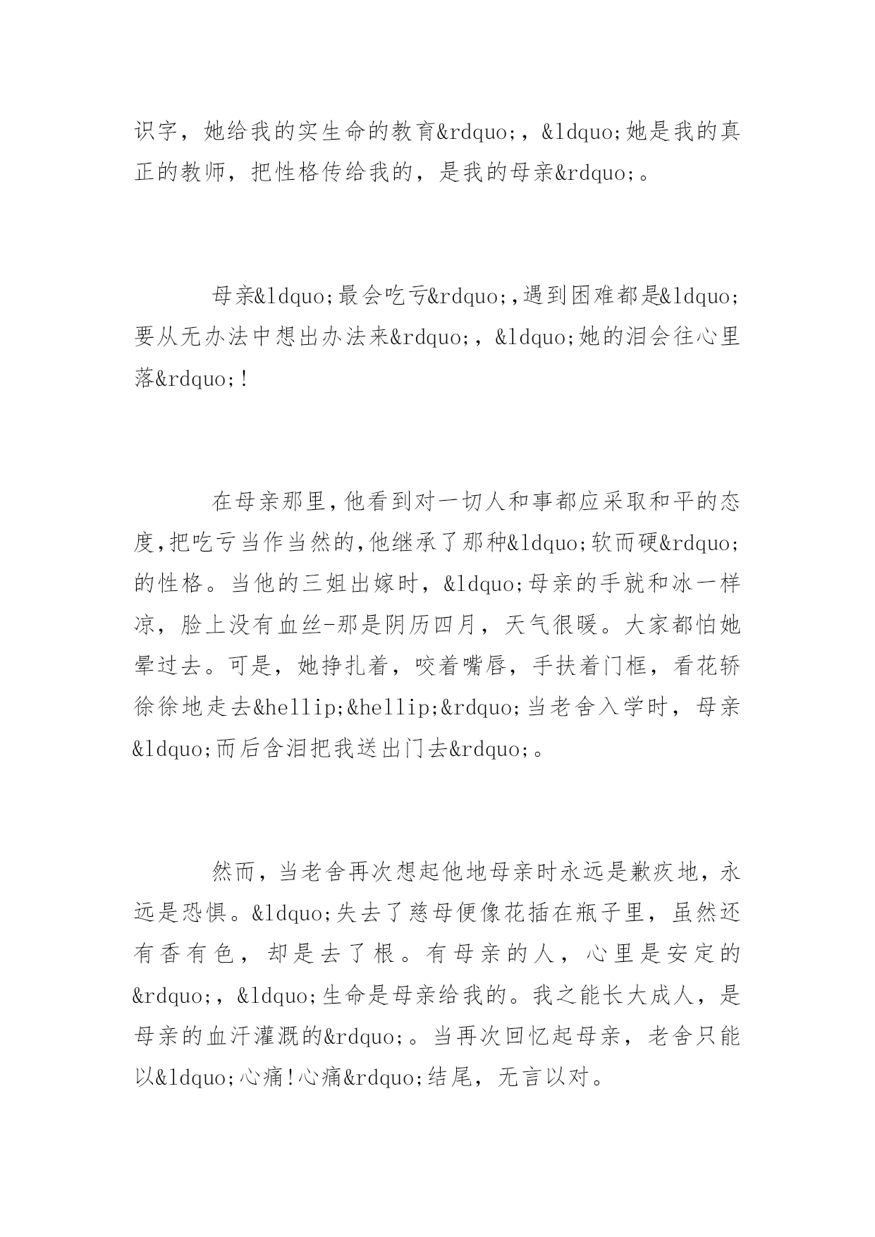 读老舍作品《我的母亲》有感读老舍作品《我的母亲》有感母亲对我们的爱总是无私的,而也正因为母亲的爱,我们才能得以健康的成长。下面是小编分享的《我的母亲》读后感,欢迎阅读!读老舍作品《我的母亲》有感篇一:父母对我们的爱总是难以回报的,可怜天下父母心,谁人的父母不伟大?偶读老舍的《我的母亲》深有感触,老舍以其平实的笔触为我们塑造了意味平凡而又伟大的母亲形象,激起了我内心的共鸣。忍不住写下这篇读后感,希望大家能有所借鉴。在老舍的文中,这是一位含辛茹苦的母亲,这是一位善良的母亲,这更是一位坚强的母亲。她的母亲“即使在最危险的时刻也要用单薄的身体保护自己的孩子”。在老舍眼里“母亲并不识字,她给我的实生命的教育”,“她是我的真正的教师,把性格传给我的,是我的母亲”。母亲“最会吃亏”,遇到困难都是“要从无办法中想出办法来”,“她的泪会往心里落”!在母亲那里,他看到对一切人和事都应采取和平的态度,把吃亏当作当然的,他继承了那种“软而硬”的性格。当他的三姐出嫁时,“母亲的手就和冰一样凉,脸上没有血丝-那是阴历四月,天气很暖。大家都怕她晕过去。可是,她挣扎着,咬着嘴唇,手扶着门框,看花轿徐徐地走去……”当老舍入学时,母亲“而后含泪把我送出门去”。然而,当老舍再次想起他地母亲时永远是歉疚地,永远是恐惧。“失去了慈母便像花插在瓶子里,虽然还有香有色,却是去了根。有母亲的人,心里是安定的”,“生命是母亲给我的。我之能长大成人,是母亲的血汗灌溉的”。当再次回忆起母亲,老舍只能以“心痛!心痛”结尾,无言以对。“儿女的生命是不依顺着父母所投下的轨道而一直前进的,所以老人总免不了伤心”。我们作为子女的,应时刻怀着一颗感恩的心,去感谢父母,感谢他们所付出的,感谢他们带给我们的一切。即便身在远方,也要常回家看看,毕竟那是你永远的根。不要让老人操心,也不要让老人孤独,因为他们付出的够多了,因为你是他们的命。读老舍作品《我的母亲》有感篇二:在字典里,你总会找到一个词:“伟人。”何为伟人?是能对后世、对人类产生深远影响的人,孙中山、毛泽东、邓小平他们都是伟人——伟大的人。但在我们的生活中,还有一群默默无闻的人堪称伟人,她们用乳汁哺育生命,用血汗灌养生命,直至自己油干灯草尽也无怨无悔,她们便是生养我们的伟大的母亲。古今中外,多少名人义士或作出杰出贡献的大人物脚下,走的都是母亲为他们铺筑的成长之路,如妇孺皆知的爱因斯坦、爱迪生、岳飞、孟子,母亲赋予他们高尚的品德与无穷的创造力,让他们在这条路上坚韧不拔、自信自强。正因为母亲的伟大,才有无数文人学子不惜笔墨,为母亲献上一首又一首赞歌。著名作家老舍先生满怀心痛地写下了《我的母亲》,我读了也倍感心痛。就在这么一个不识字的、始终生活在艰难困苦中的中国妇女身上,我看到了母性的光辉与伟大,她温柔慈祥却坚贞不屈,她甘愿吃亏却绝不软弱,她用自己的一言一行感化孩子,她给子女的是生命的教育。老舍一岁半时父亲离世,从此,母亲勤俭持家,独自一人将五个孩子拉扯大;当八国联军侵略我国时,她不慌不哭,为保护儿女从无办法中想出办法来;当女儿出嫁、儿子求学据婚时,她伤感不已却泪往肚里流,母亲,从不因自己的个人需要而耽误子女的青春与前程!在老舍心里,母亲才是让他刻骨铭心的真正的教师,她传给自己好的性格与习惯;母亲的奉献才是最无私的,她晚年的孤独寂寞与急切的念子情怀让人无奈且不安。老舍的母亲一世未曾享过一天福,临死前还吃的是粗粮,这成了老舍先生终生的伤与痛。其实,这就是母亲啊!聪慧坚忍,胸怀宽广。如果老舍生活的时代好些,他一定会尽己所能让老母安享晚年的。不管是名人还是普通人,不管岁月艰难还是生活幸福,我们每个人都有一个平凡而伟大的母亲。她们在柴米油盐酱醋茶中磨粗了双手,在叮嘱唠叨奔波劳作中花白了头发,在儿女长成飞向远方后望穿了双眼。幸福中游离着一丝悲哀,这也是矛盾的统一体吗?但对一个母亲未免太残酷了。母亲是深爱我们的人,我们也应关心她、体贴她,用一颗感恩的心来慰藉她,这样,就算哪一天我们离开了母亲,心中也会少一份缺憾。老舍说:“失了慈母的人像插在花瓶里的花,虽然还有色有香,却已失了根。”是呀,母亲就是生养我们的根,是我们永远不能离弃不能忘怀的人!我们只有努力生长,成为祖国的栋梁,开出鲜艳美丽的花朵,才对得起在泥土下不辞劳苦的&l