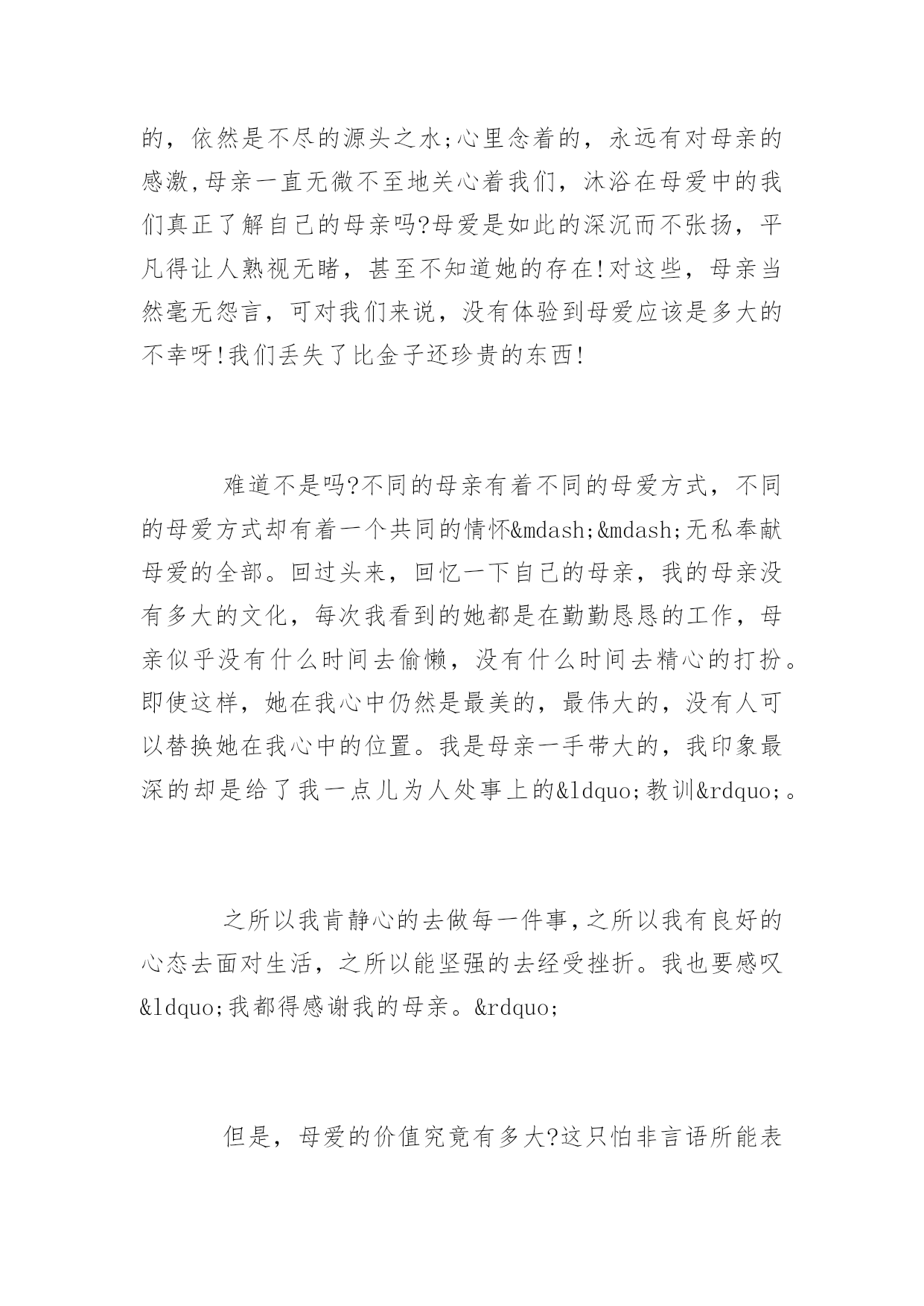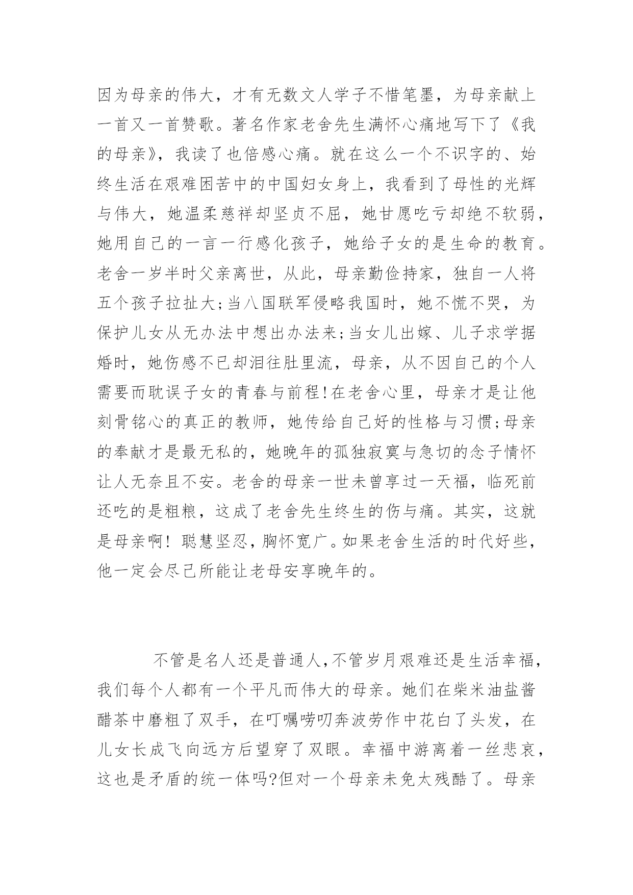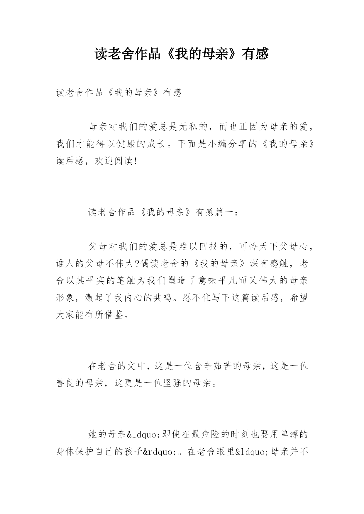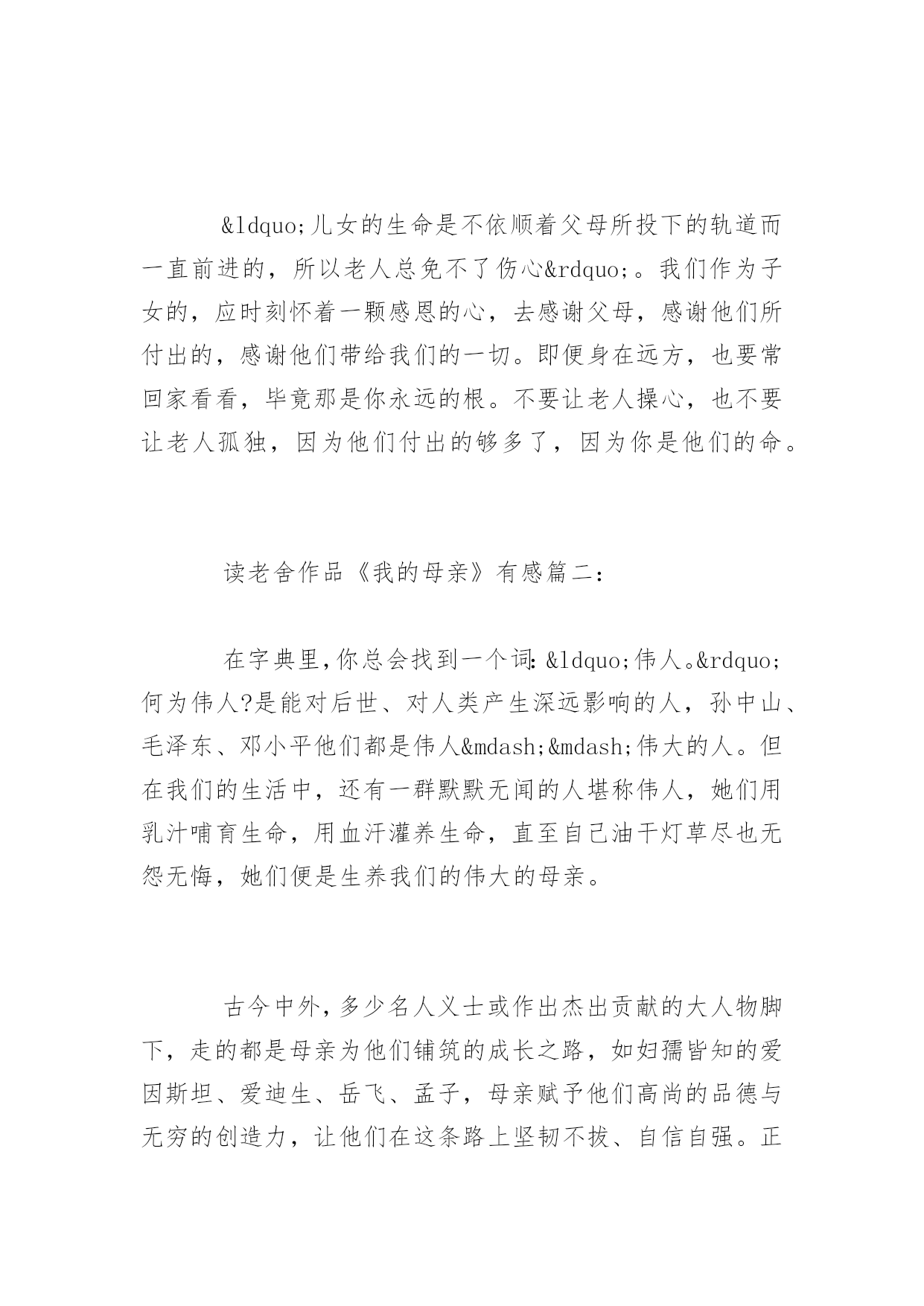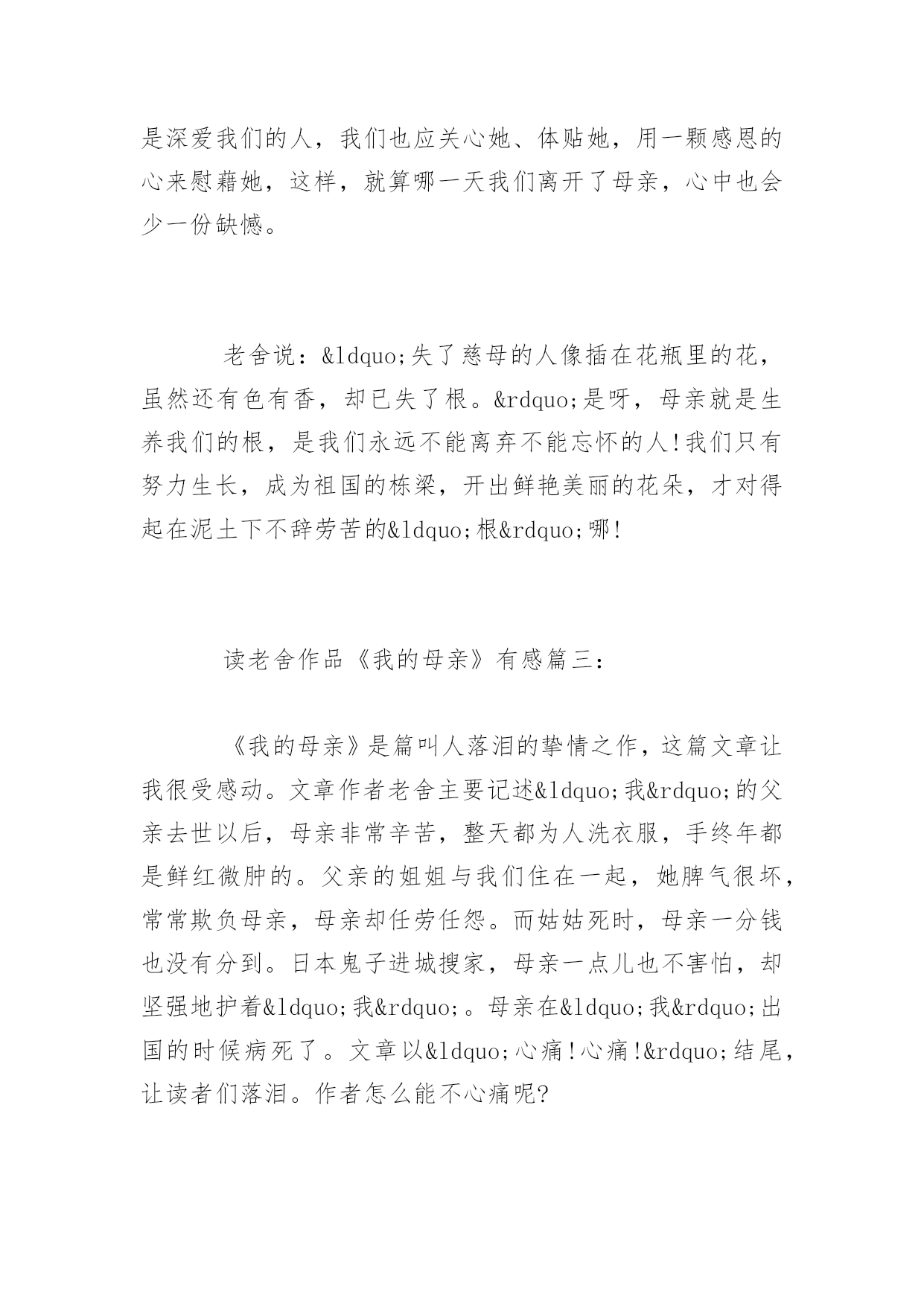 读老舍作品《我的母亲》有感读老舍作品《我的母亲》有感母亲对我们的爱总是无私的,而也正因为母亲的爱,我们才能得以健康的成长。下面是小编分享的《我的母亲》读后感,欢迎阅读!读老舍作品《我的母亲》有感篇一:父母对我们的爱总是难以回报的,可怜天下父母心,谁人的父母不伟大?偶读老舍的《我的母亲》深有感触,老舍以其平实的笔触为我们塑造了意味平凡而又伟大的母亲形象,激起了我内心的共鸣。忍不住写下这篇读后感,希望大家能有所借鉴。在老舍的文中,这是一位含辛茹苦的母亲,这是一位善良的母亲,这更是一位坚强的母亲。她的母亲“即使在最危险的时刻也要用单薄的身体保护自己的孩子”。在老舍眼里“母亲并不识字,她给我的实生命的教育”,“她是我的真正的教师,把性格传给我的,是我的母亲”。母亲“最会吃亏”,遇到困难都是“要从无办法中想出办法来”,“她的泪会往心里落”!在母亲那里,他看到对一切人和事都应采取和平的态度,把吃亏当作当然的,他继承了那种“软而硬”的性格。当他的三姐出嫁时,“母亲的手就和冰一样凉,脸上没有血丝-那是阴历四月,天气很暖。大家都怕她晕过去。可是,她挣扎着,咬着嘴唇,手扶着门框,看花轿徐徐地走去……”当老舍入学时,母亲“而后含泪把我送出门去”。然而,当老舍再次想起他地母亲时永远是歉疚地,永远是恐惧。“失去了慈母便像花插在瓶子里,虽然还有香有色,却是去了根。有母亲的人,心里是安定的”,“生命是母亲给我的。我之能长大成人,是母亲的血汗灌溉的”。当再次回忆起母亲,老舍只能以“心痛!心痛”结尾,无言以对。“儿女的生命是不依顺着父母所投下的轨道而一直前进的,所以老人总免不了伤心”。我们作为子女的,应时刻怀着一颗感恩的心,去感谢父母,感谢他们所付出的,感谢他们带给我们的一切。即便身在远方,也要常回家看看,毕竟那是你永远的根。不要让老人操心,也不要让老人孤独,因为他们付出的够多了,因为你是他们的命。读老舍作品《我的母亲》有感篇二:在字典里,你总会找到一个词:“伟人。”何为伟人?是能对后世、对人类产生深远影响的人,孙中山、毛泽东、邓小平他们都是伟人——伟大的人。但在我们的生活中,还有一群默默无闻的人堪称伟人,她们用乳汁哺育生命,用血汗灌养生命,直至自己油干灯草尽也无怨无悔,她们便是生养我们的伟大的母亲。古今中外,多少名人义士或作出杰出贡献的大人物脚下,走的都是母亲为他们铺筑的成长之路,如妇孺皆知的爱因斯坦、爱迪生、岳飞、孟子,母亲赋予他们高尚的品德与无穷的创造力,让他们在这条路上坚韧不拔、自信自强。正因为母亲的伟大,才有无数文人学子不惜笔墨,为母亲献上一首又一首赞歌。著名作家老舍先生满怀心痛地写下了《我的母亲》,我读了也倍感心痛。就在这么一个不识字的、始终生活在艰难困苦中的中国妇女身上,我看到了母性的光辉与伟大,她温柔慈祥却坚贞不屈,她甘愿吃亏却绝不软弱,她用自己的一言一行感化孩子,她给子女的是生命的教育。老舍一岁半时父亲离世,从此,母亲勤俭持家,独自一人将五个孩子拉扯大;当八国联军侵略我国时,她不慌不哭,为保护儿女从无办法中想出办法来;当女儿出嫁、儿子求学据婚时,她伤感不已却泪往肚里流,母亲,从不因自己的个人需要而耽误子女的青春与前程!在老舍心里,母亲才是让他刻骨铭心的真正的教师,她传给自己好的性格与习惯;母亲的奉献才是最无私的,她晚年的孤独寂寞与急切的念子情怀让人无奈且不安。老舍的母亲一世未曾享过一天福,临死前还吃的是粗粮,这成了老舍先生终生的伤与痛。其实,这就是母亲啊!聪慧坚忍,胸怀宽广。如果老舍生活的时代好些,他一定会尽己所能让老母安享晚年的。不管是名人还是普通人,不管岁月艰难还是生活幸福,我们每个人都有一个平凡而伟大的母亲。她们在柴米油盐酱醋茶中磨粗了双手,在叮嘱唠叨奔波劳作中花白了头发,在儿女长成飞向远方后望穿了双眼。幸福中游离着一丝悲哀,这也是矛盾的统一体吗?但对一个母亲未免太残酷了。母亲是深爱我们的人,我们也应关心她、体贴她,用一颗感恩的心来慰藉她,这样,就算哪一天我们离开了母亲,心中也会少一份缺憾。老舍说:“失了慈母的人像插在花瓶里的花,虽然还有色有香,却已失了根。”是呀,母亲就是生养我们的根,是我们永远不能离弃不能忘怀的人!我们只有努力生长,成为祖国的栋梁,开出鲜艳美丽的花朵,才对得起在泥土下不辞劳苦的&l