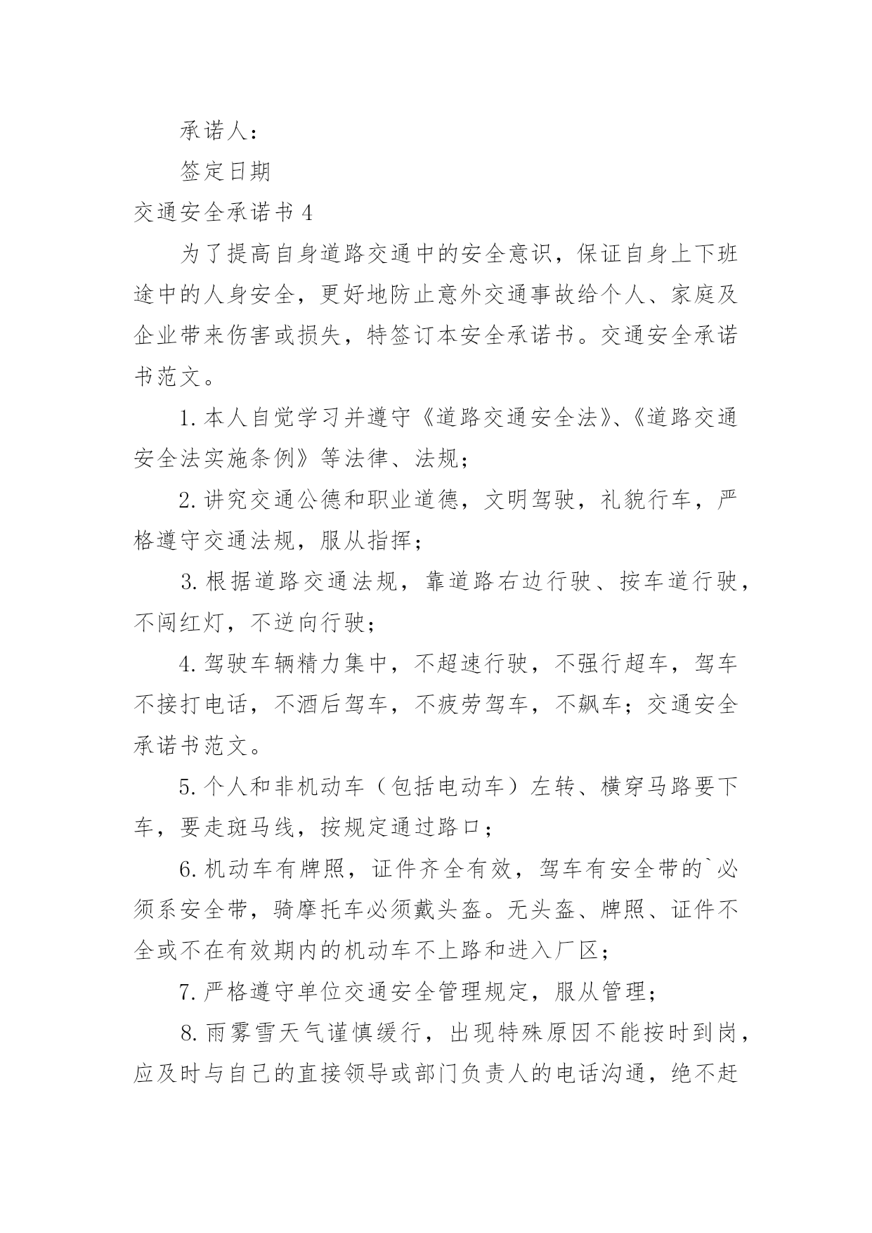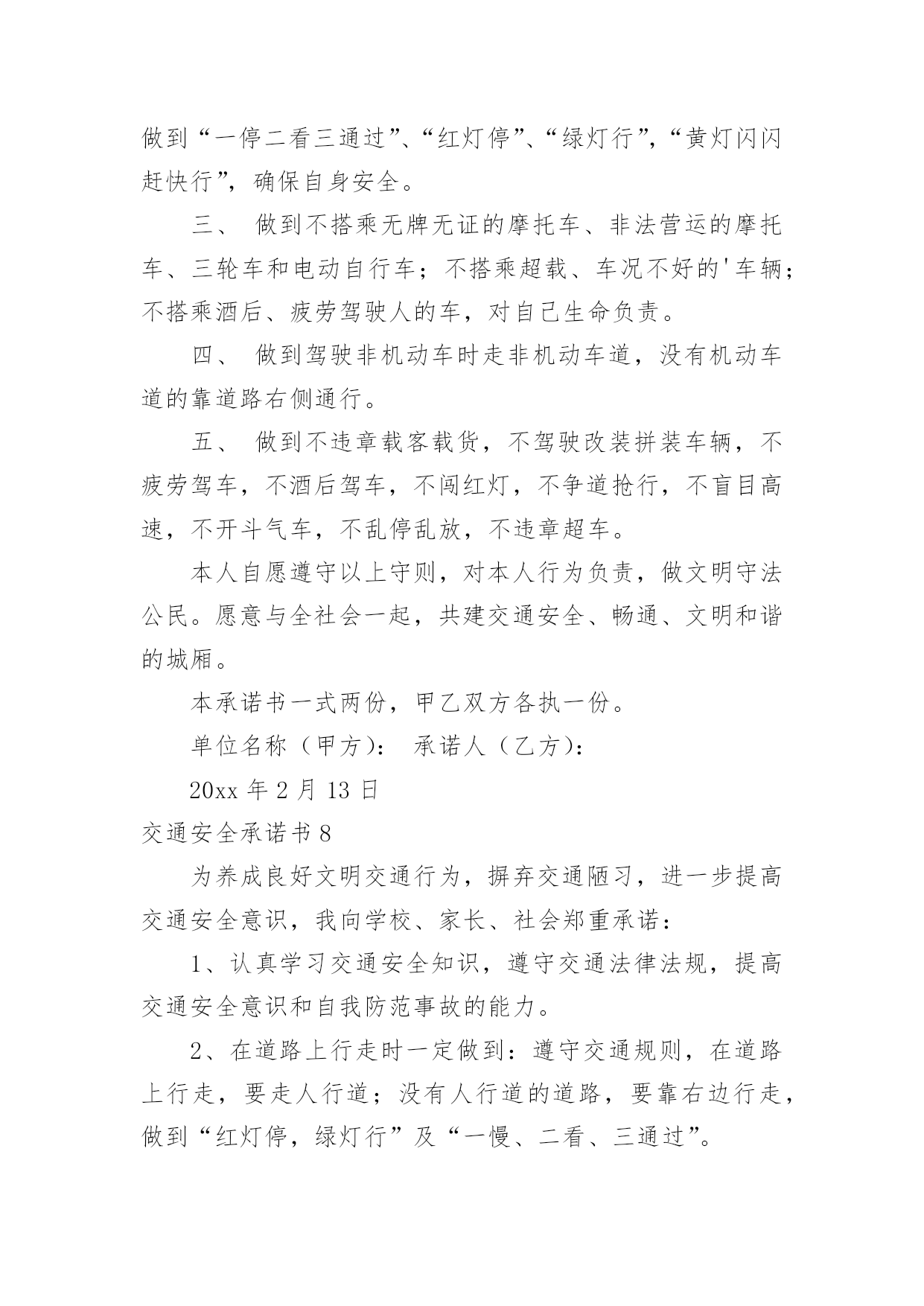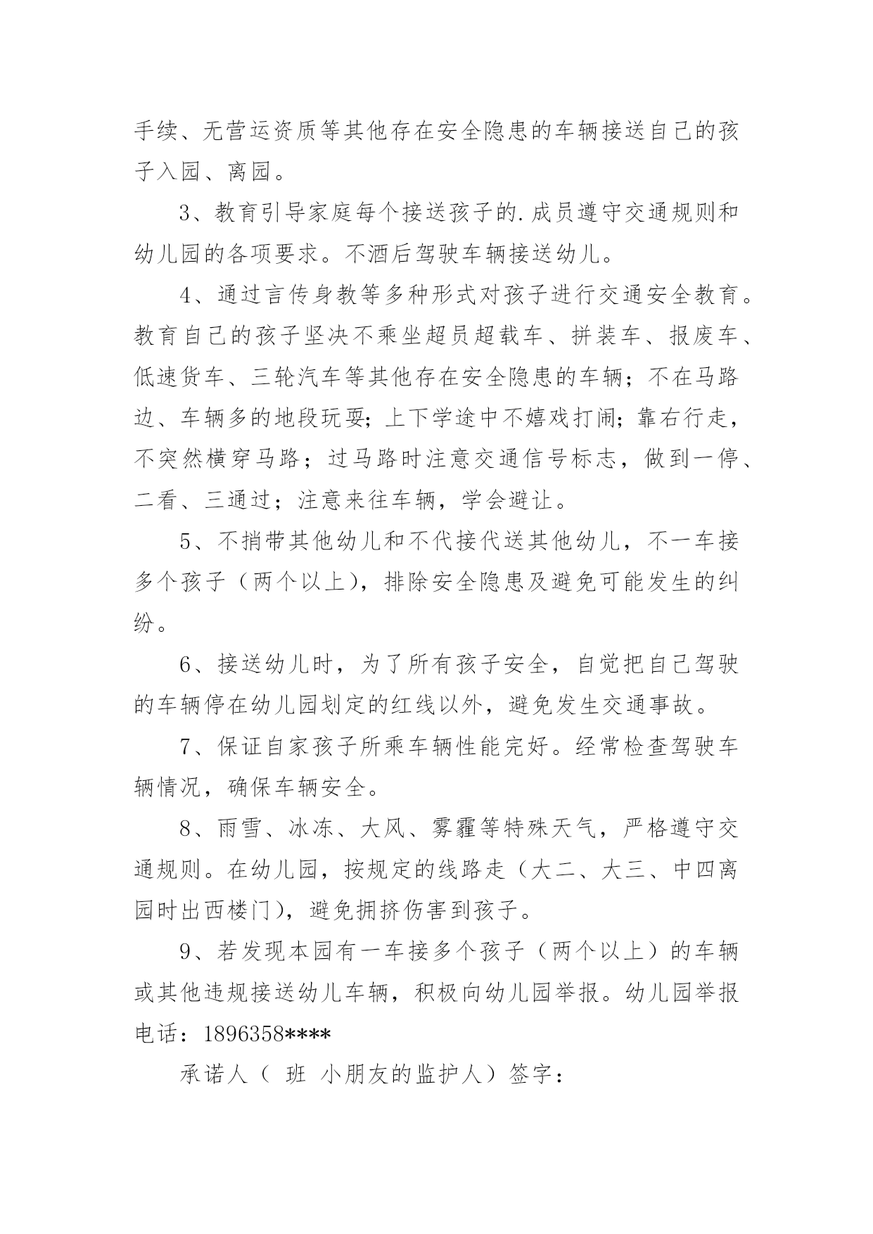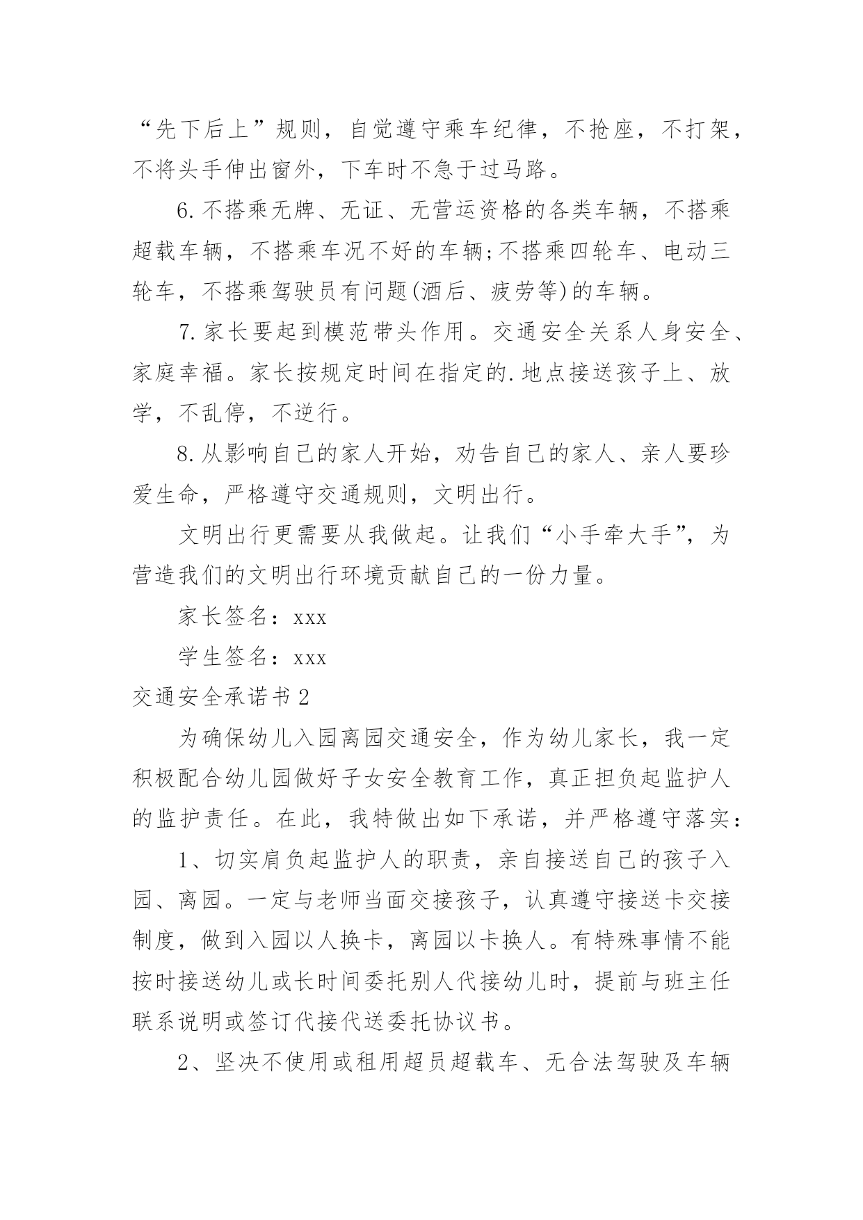 交通安全承诺书交通安全承诺书在当下社会,能够利用到承诺书的场合越来越多,承诺书是把口头承诺书面化规范化的一种产物。那么你有了解过承诺书吗?下面是小编整理的交通安全承诺书,仅供参考,大家一起来看看吧。交通安全承诺书1生命无价,安全为先。安全出行是每一个公民的愿望,营造一个文明和谐的交通环境,是每一位公民的责任,遵守交通法规,是每个公民的义务。为了时光少在拥堵中虚耗,生命不在事故中流逝,让我们一起来做文明出行的好榜样。我和爸爸妈妈一起郑重作出以下承诺:1.认真学习交通安全知识,牢固树立文明交通意识,提高防护自救能力。2.不骑“故障车”,不骑车带人,12岁以下同学不得骑车上路。3.过马路时遵守信号灯、不闯红灯、不抢黄灯,走人行横道,做到“一慢二看三通过”。4.不在马路上打闹、嬉戏或追逐,不翻越道路隔离护栏,不在车辆临近时突然横穿马路。5.乘车时要在指定地点侯车,上车时自觉排队,遵守“先下后上”规则,自觉遵守乘车纪律,不抢座,不打架,不将头手伸出窗外,下车时不急于过马路。6.不搭乘无牌、无证、无营运资格的各类车辆,不搭乘超载车辆,不搭乘车况不好的车辆;不搭乘四轮车、电动三轮车,不搭乘驾驶员有问题(酒后、疲劳等)的车辆。7.家长要起到模范带头作用。交通安全关系人身安全、家庭幸福。家长按规定时间在指定的.地点接送孩子上、放学,不乱停,不逆行。8.从影响自己的家人开始,劝告自己的家人、亲人要珍爱生命,严格遵守交通规则,文明出行。文明出行更需要从我做起。让我们“小手牵大手”,为营造我们的文明出行环境贡献自己的一份力量。家长签名:xxx学生签名:xxx交通安全承诺书2为确保幼儿入园离园交通安全,作为幼儿家长,我一定积极配合幼儿园做好子女安全教育工作,真正担负起监护人的监护责任。在此,我特做出如下承诺,并严格遵守落实:1、切实肩负起监护人的职责,亲自接送自己的孩子入园、离园。一定与老师当面交接孩子,认真遵守接送卡交接制度,做到入园以人换卡,离园以卡换人。有特殊事情不能按时接送幼儿或长时间委托别人代接幼儿时,提前与班主任联系说明或签订代接代送委托协议书。2、坚决不使用或租用超员超载车、无合法驾驶及车辆手续、无营运资质等其他存在安全隐患的车辆接送自己的孩子入园、离园。3、教育引导家庭每个接送孩子的.成员遵守交通规则和幼儿园的各项要求。不酒后驾驶车辆接送幼儿。4、通过言传身教等多种形式对孩子进行交通安全教育。教育自己的孩子坚决不乘坐超员超载车、拼装车、报废车、低速货车、三轮汽车等其他存在安全隐患的车辆;不在马路边、车辆多的地段玩耍;上下学途中不嬉戏打闹;靠右行走,不突然横穿马路;过马路时注意交通信号标志,做到一停、二看、三通过;注意来往车辆,学会避让。5、不捎带其他幼儿和不代接代送其他幼儿,不一车接多个孩子(两个以上),排除安全隐患及避免可能发生的纠纷。6、接送幼儿时,为了所有孩子安全,自觉把自己驾驶的车辆停在幼儿园划定的红线以外,避免发生交通事故。7、保证自家孩子所乘车辆性能完好。经常检查驾驶车辆情况,确保车辆安全。8、雨雪、冰冻、大风、雾霾等特殊天气,严格遵守交通规则。在幼儿园,按规定的线路走(大二、大三、中四离园时出西楼门),避免拥挤伤害到孩子。9、若发现本园有一车接多个孩子(两个以上)的车辆或其他违规接送幼儿车辆,积极向幼儿园举报。幼儿园举报电话:1896358****承诺人(班小朋友的监护人)签字:交通安全承诺书3为了强化交通安全责任意识,明确管理和使用机动车辆的安全责任和义务,维护道路交通秩序,保障自己和他人的人身、财产安全,本人承诺如下:一、认真学习并自觉遵守《中华人民共和国道路交通安全法》及相关《实施细则》,严格执行当地交通安全管理部门和单位的车辆安全管理规章制度,坚持“安全第一、文明行车”、“宁停三分、不抢一秒”的行为准则。二、积极参加政府组织的交通安全教育学习和培训,接受定期安全知识、驾驶技能和机械常识的`考核。三、精心维护所驾车辆,严格落实车辆《三检》制度,保持车辆技术状况完好,严格按规程操作车辆,杜绝车辆机械事故的发生。四、不酒后驾驶车辆、不疲劳驾驶车辆,不闯禁令标志、不超速行车、不野蛮驾驶。五、行经路口要减速、避让优先放行的机动车、非机动车和行人。六、不持无效《驾驶证》驾车或驾驶与《驾驶证》准驾车型不相符的车辆,《驾驶证》被暂扣期间不驾驶机动车,不驾驶无效《机动车行驶证》的车辆。七、造成交通事故后不擅离事故现场或逃逸。按规定报告给单位领导、安全管理部门和保险公司。八、不出私车、不将车交给没有驾驶资格的人员驾驶或交给未经单位考核批准的其他司机驾驶。承诺人:签定日期交通安全承诺书4为了提高自身道路交通中的安全意识,保证自身上下班途中的人身安全,更好地防止意外交通事故给个人、家庭及企业带来伤害或损失,特签订本安全承诺书。交通安全