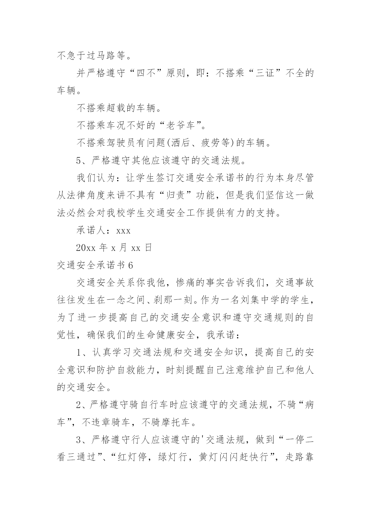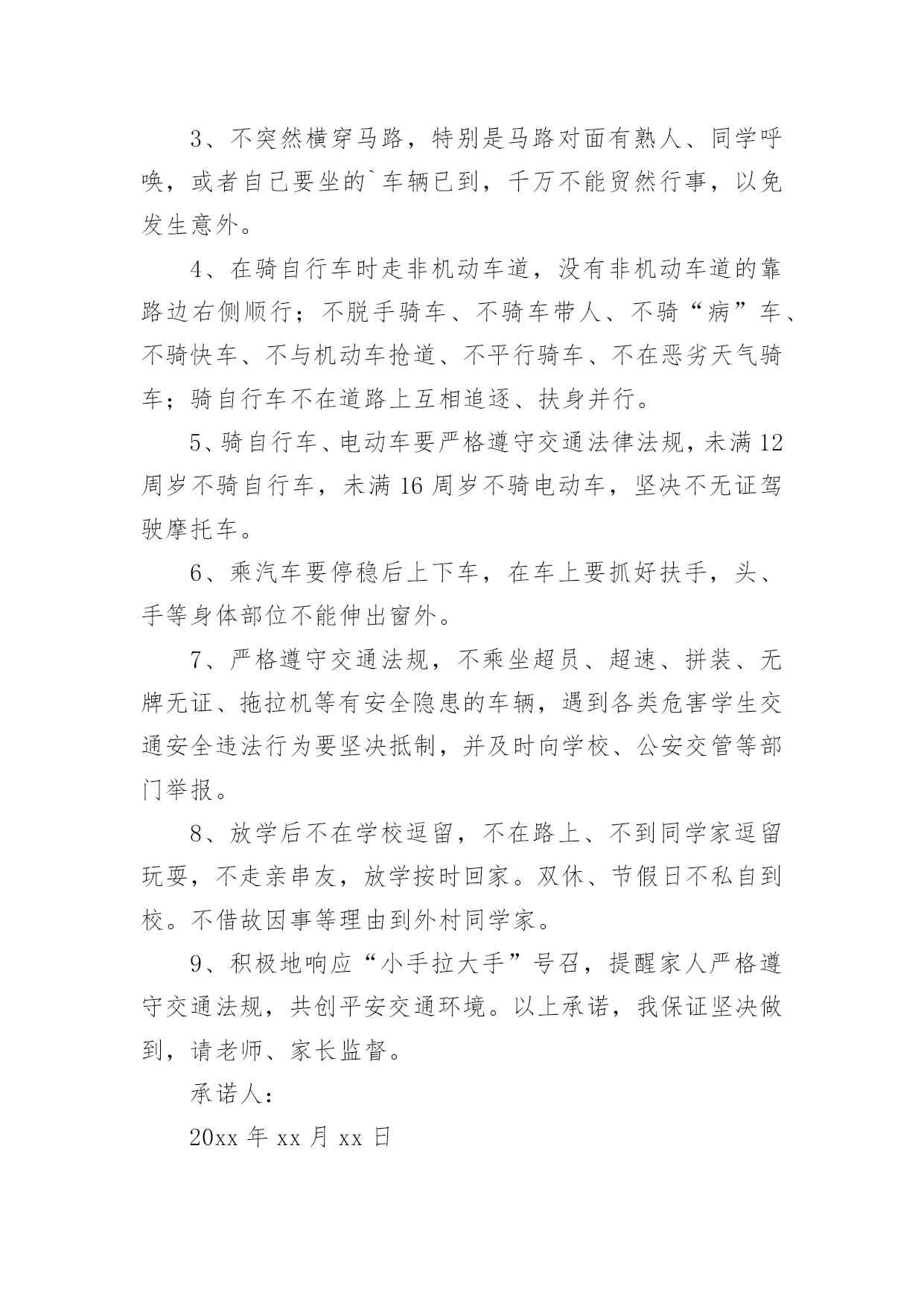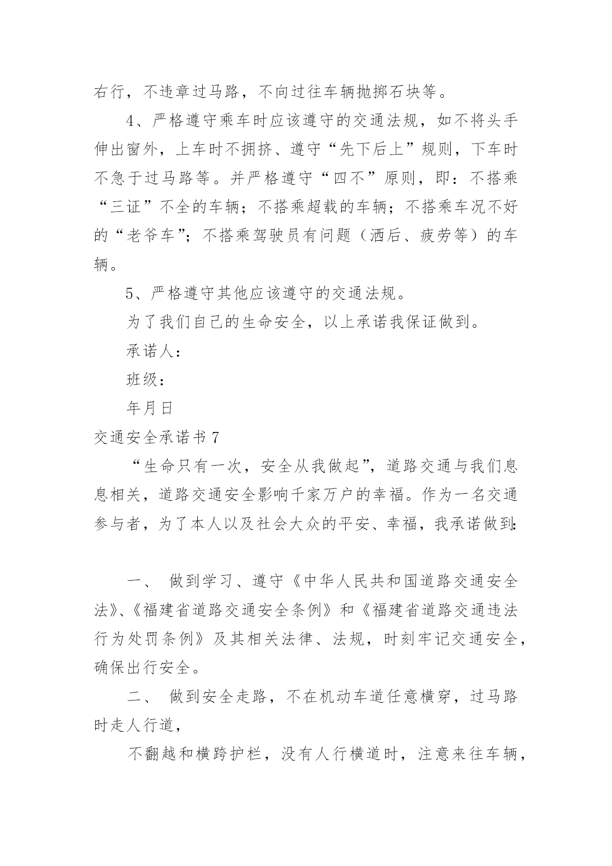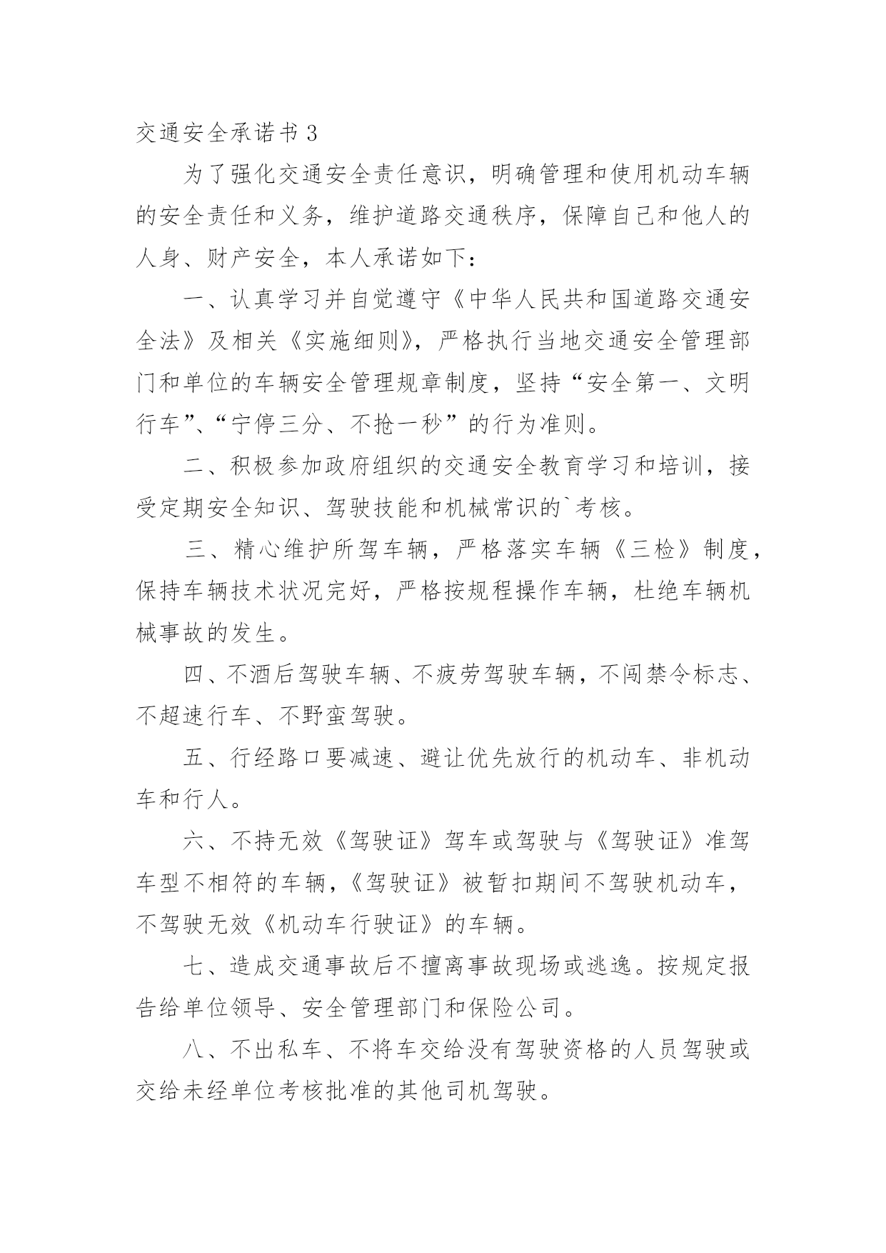 交通安全承诺书交通安全承诺书在当下社会,能够利用到承诺书的场合越来越多,承诺书是把口头承诺书面化规范化的一种产物。那么你有了解过承诺书吗?下面是小编整理的交通安全承诺书,仅供参考,大家一起来看看吧。交通安全承诺书1生命无价,安全为先。安全出行是每一个公民的愿望,营造一个文明和谐的交通环境,是每一位公民的责任,遵守交通法规,是每个公民的义务。为了时光少在拥堵中虚耗,生命不在事故中流逝,让我们一起来做文明出行的好榜样。我和爸爸妈妈一起郑重作出以下承诺:1.认真学习交通安全知识,牢固树立文明交通意识,提高防护自救能力。2.不骑“故障车”,不骑车带人,12岁以下同学不得骑车上路。3.过马路时遵守信号灯、不闯红灯、不抢黄灯,走人行横道,做到“一慢二看三通过”。4.不在马路上打闹、嬉戏或追逐,不翻越道路隔离护栏,不在车辆临近时突然横穿马路。5.乘车时要在指定地点侯车,上车时自觉排队,遵守“先下后上”规则,自觉遵守乘车纪律,不抢座,不打架,不将头手伸出窗外,下车时不急于过马路。6.不搭乘无牌、无证、无营运资格的各类车辆,不搭乘超载车辆,不搭乘车况不好的车辆;不搭乘四轮车、电动三轮车,不搭乘驾驶员有问题(酒后、疲劳等)的车辆。7.家长要起到模范带头作用。交通安全关系人身安全、家庭幸福。家长按规定时间在指定的.地点接送孩子上、放学,不乱停,不逆行。8.从影响自己的家人开始,劝告自己的家人、亲人要珍爱生命,严格遵守交通规则,文明出行。文明出行更需要从我做起。让我们“小手牵大手”,为营造我们的文明出行环境贡献自己的一份力量。家长签名:xxx学生签名:xxx交通安全承诺书2为确保幼儿入园离园交通安全,作为幼儿家长,我一定积极配合幼儿园做好子女安全教育工作,真正担负起监护人的监护责任。在此,我特做出如下承诺,并严格遵守落实:1、切实肩负起监护人的职责,亲自接送自己的孩子入园、离园。一定与老师当面交接孩子,认真遵守接送卡交接制度,做到入园以人换卡,离园以卡换人。有特殊事情不能按时接送幼儿或长时间委托别人代接幼儿时,提前与班主任联系说明或签订代接代送委托协议书。2、坚决不使用或租用超员超载车、无合法驾驶及车辆手续、无营运资质等其他存在安全隐患的车辆接送自己的孩子入园、离园。3、教育引导家庭每个接送孩子的.成员遵守交通规则和幼儿园的各项要求。不酒后驾驶车辆接送幼儿。4、通过言传身教等多种形式对孩子进行交通安全教育。教育自己的孩子坚决不乘坐超员超载车、拼装车、报废车、低速货车、三轮汽车等其他存在安全隐患的车辆;不在马路边、车辆多的地段玩耍;上下学途中不嬉戏打闹;靠右行走,不突然横穿马路;过马路时注意交通信号标志,做到一停、二看、三通过;注意来往车辆,学会避让。5、不捎带其他幼儿和不代接代送其他幼儿,不一车接多个孩子(两个以上),排除安全隐患及避免可能发生的纠纷。6、接送幼儿时,为了所有孩子安全,自觉把自己驾驶的车辆停在幼儿园划定的红线以外,避免发生交通事故。7、保证自家孩子所乘车辆性能完好。经常检查驾驶车辆情况,确保车辆安全。8、雨雪、冰冻、大风、雾霾等特殊天气,严格遵守交通规则。在幼儿园,按规定的线路走(大二、大三、中四离园时出西楼门),避免拥挤伤害到孩子。9、若发现本园有一车接多个孩子(两个以上)的车辆或其他违规接送幼儿车辆,积极向幼儿园举报。幼儿园举报电话:1896358****承诺人(班小朋友的监护人)签字:交通安全承诺书3为了强化交通安全责任意识,明确管理和使用机动车辆的安全责任和义务,维护道路交通秩序,保障自己和他人的人身、财产安全,本人承诺如下:一、认真学习并自觉遵守《中华人民共和国道路交通安全法》及相关《实施细则》,严格执行当地交通安全管理部门和单位的车辆安全管理规章制度,坚持“安全第一、文明行车”、“宁停三分、不抢一秒”的行为准则。二、积极参加政府组织的交通安全教育学习和培训,接受定期安全知识、驾驶技能和机械常识的`考核。三、精心维护所驾车辆,严格落实车辆《三检》制度,保持车辆技术状况完好,严格按规程操作车辆,杜绝车辆机械事故的发生。四、不酒后驾驶车辆、不疲劳驾驶车辆,不闯禁令标志、不超速行车、不野蛮驾驶。五、行经路口要减速、避让优先放行的机动车、非机动车和行人。六、不持无效《驾驶证》驾车或驾驶与《驾驶证》准驾车型不相符的车辆,《驾驶证》被暂扣期间不驾驶机动车,不驾驶无效《机动车行驶证》的车辆。七、造成交通事故后不擅离事故现场或逃逸。按规定报告给单位领导、安全管理部门和保险公司。八、不出私车、不将车交给没有驾驶资格的人员驾驶或交给未经单位考核批准的其他司机驾驶。承诺人:签定日期交通安全承诺书4为了提高自身道路交通中的安全意识,保证自身上下班途中的人身安全,更好地防止意外交通事故给个人、家庭及企业带来伤害或损失,特签订本安全承诺书。交通安全