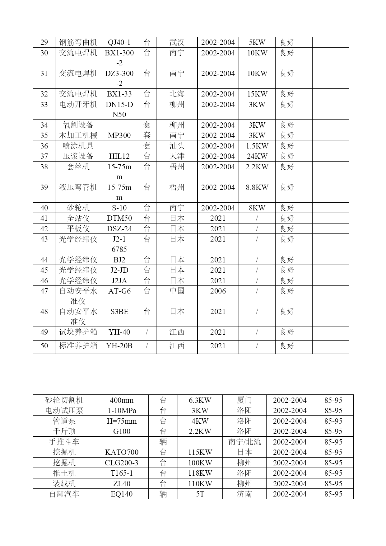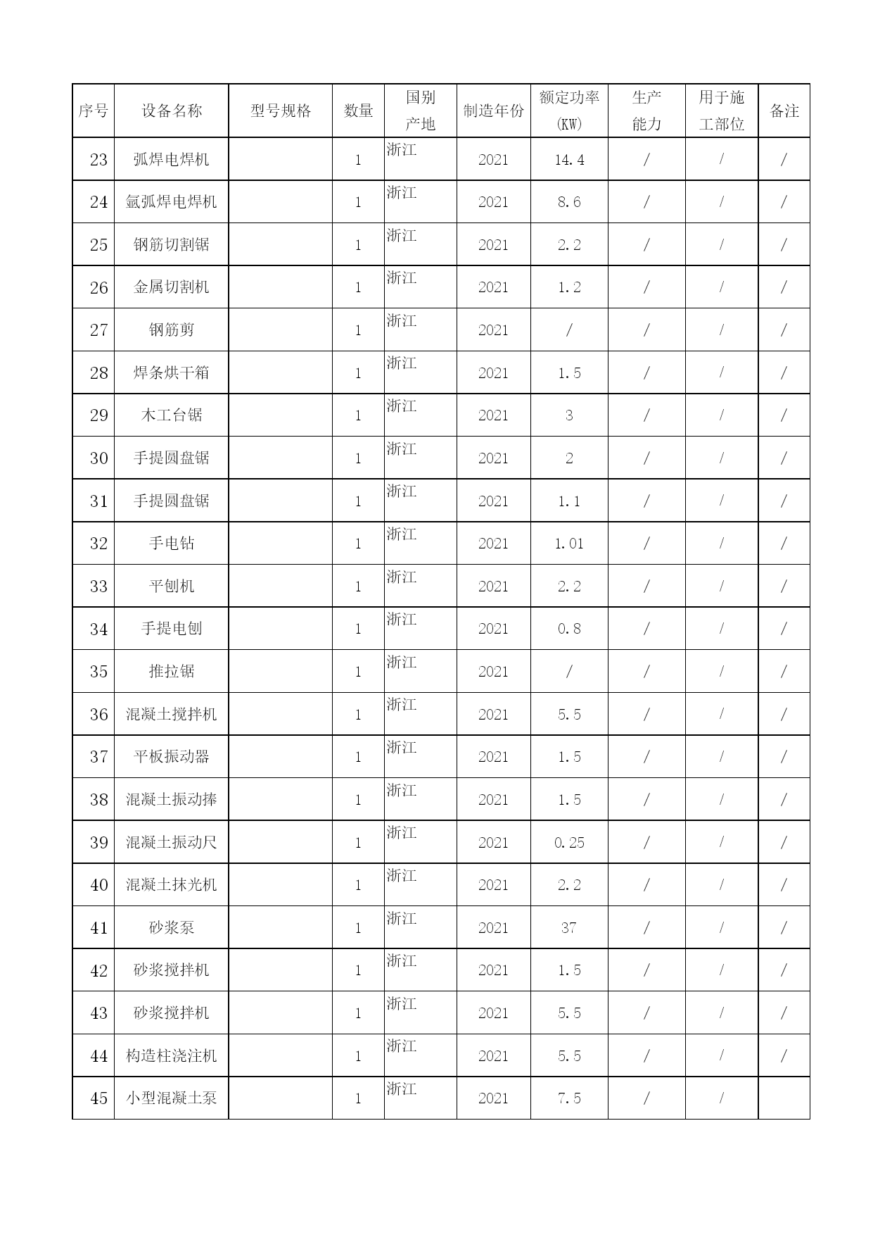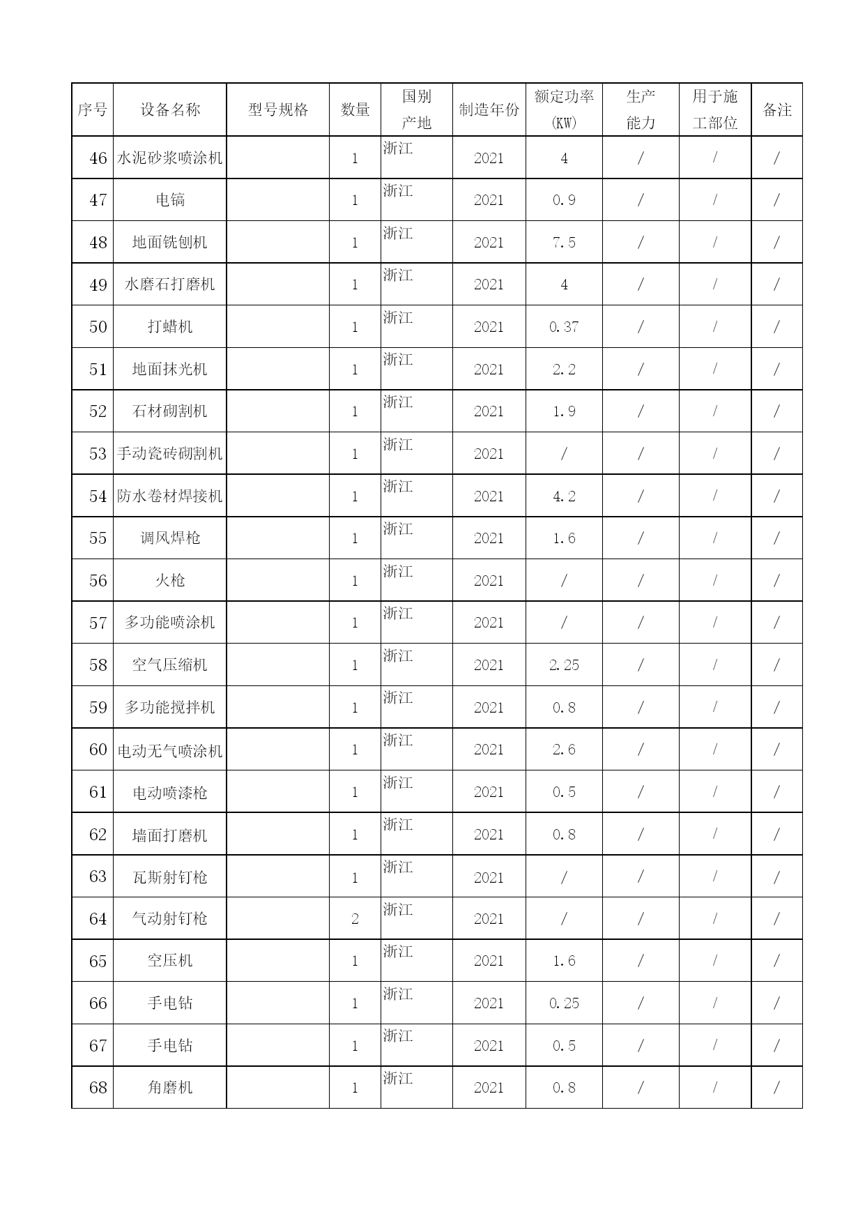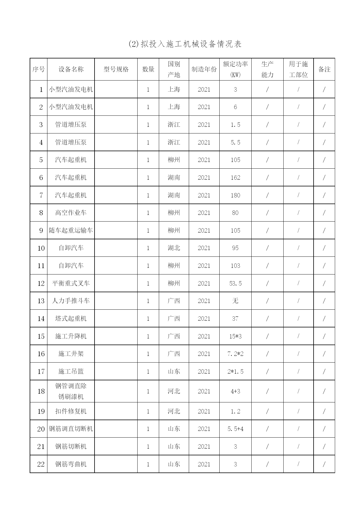 装饰装修机械表优质资料(可以直接使用,可编辑优质资料,欢迎下载)(2)拟投入施工机械设备情况表序号设备名称型号规格数量国别产地制造年份额定功率(KW)生产能力用于施工部位备注小型汽油发电机1上海20213///小型汽油发电机1上海20216///管道增压泵1浙江20211.5///管道增压泵1浙江20215.5///汽车起重机1柳州2021105///汽车起重机1湖南2021162///汽车起重机1湖南2021180///高空作业车1柳州202180///随车起重运输车1柳州2021105///自卸汽车1湖北202195///自卸汽车1柳州2021103///平衡重式叉车1柳州202153.5///人力手推斗车1广西2021无///塔式起重机1广西202137///施工升降机1广西202115*3///施工井架1广西20217.2*2///施工吊篮1山东20212*1.5///钢管调直除锈刷漆机1河北20214+3///扣件修复机1河北20211.2///钢筋调直切断机1山东20215.5+4///钢筋切断机1山东20213///钢筋弯曲机1山东20213///弧焊电焊机1浙江202114.4///氩弧焊电焊机1浙江20218.6///钢筋切割锯1浙江20212.2///金属切割机1浙江20211.2///钢筋剪1浙江2021////焊条烘干箱1浙江20211.5///木工台锯1浙江20213///手提圆盘锯1浙江20212///手提圆盘锯1浙江20211.1///手电钻1浙江20211.01///平刨机1浙江20212.2///手提电刨1浙江20210.8///推拉锯1浙江2021////混凝土搅拌机1浙江20215.5///平板振动器1浙江20211.5///混凝土振动捧1浙江20211.5///混凝土振动尺1浙江20210.25///混凝土抹光机1浙江20212.2///砂浆泵1浙江202137///砂浆搅拌机1浙江20211.5///砂浆搅拌机1浙江20215.5///构造柱浇注机1浙江20215.5///小型混凝土泵1浙江20217.5//水泥砂浆喷涂机1浙江20214///电镐1浙江20210.9///地面铣刨机1浙江20217.5///水磨石打磨机1浙江20214///打蜡机1浙江20210.37///地面抹光机1浙江20212.2///石材砌割机1浙江20211.9///手动瓷砖砌割机1浙江2021////防水卷材焊接机1浙江20214.2///调风焊枪1浙江20211.6///火枪1浙江2021////多功能喷涂机1浙江2021////空气压缩机1浙江20212.25///多功能搅拌机1浙江20210.8///电动无气喷涂机1浙江20212.6///电动喷漆枪1浙江20210.5///墙面打磨机1浙江20210.8///瓦斯射钉枪1浙江2021////气动射钉枪2浙江2021////空压机1浙江20211.6///手电钻1浙江20210.25///手电钻1浙江20210.5///角磨机1浙江20210.8///电锤1浙江20210.96///电镐1浙江20211.5///充电式冲击电钻1浙江2021////水钻开孔机1浙江20211.8///电动螺丝刀1浙江2021////充电式马刀锯1浙江2021////电动打胶枪1浙江2021////切割打磨机1浙江20210.67///电动吹风机1浙江2021////石材切割机1浙江20211.2///手动瓷砖砌割机1浙江2021////型材切割机1浙江20211.8///多功能台锯1浙江20211.1///斜切割机1浙江20211.65///圆盘锯1浙江20211.4///钻铣床1浙江20210.55///开槽机1浙江20211.4///开槽机1浙江20211.4///电刨1浙江20210.8///拉丝机(抛磨机)1浙江20211.4///电木铣1浙江20211.65///弧焊机1浙江20216.2///氩弧焊机1浙江20216.2///气动射钉枪1浙江2021////空压机1浙江20211.6///弧焊机1浙江20216.2///氩弧焊机1浙江20216.2///型材切割机1浙江20211.8///斜切割机1浙江20211.65///圆盘锯1浙江20211.4///多功能台锯1浙江20211.1///切割打磨机1浙江20210.67///电刨1浙江20210.8///电锤1浙江20210.96///电动螺丝刀1浙江2021////电动打胶枪1浙江2021////钢锯1浙江2021////钻铣床1浙江20210.55///开槽机1浙江20211.4///开槽机1浙江20211.4///电锤1浙江20210.96///电镐1浙江20211.5///水钻开孔
