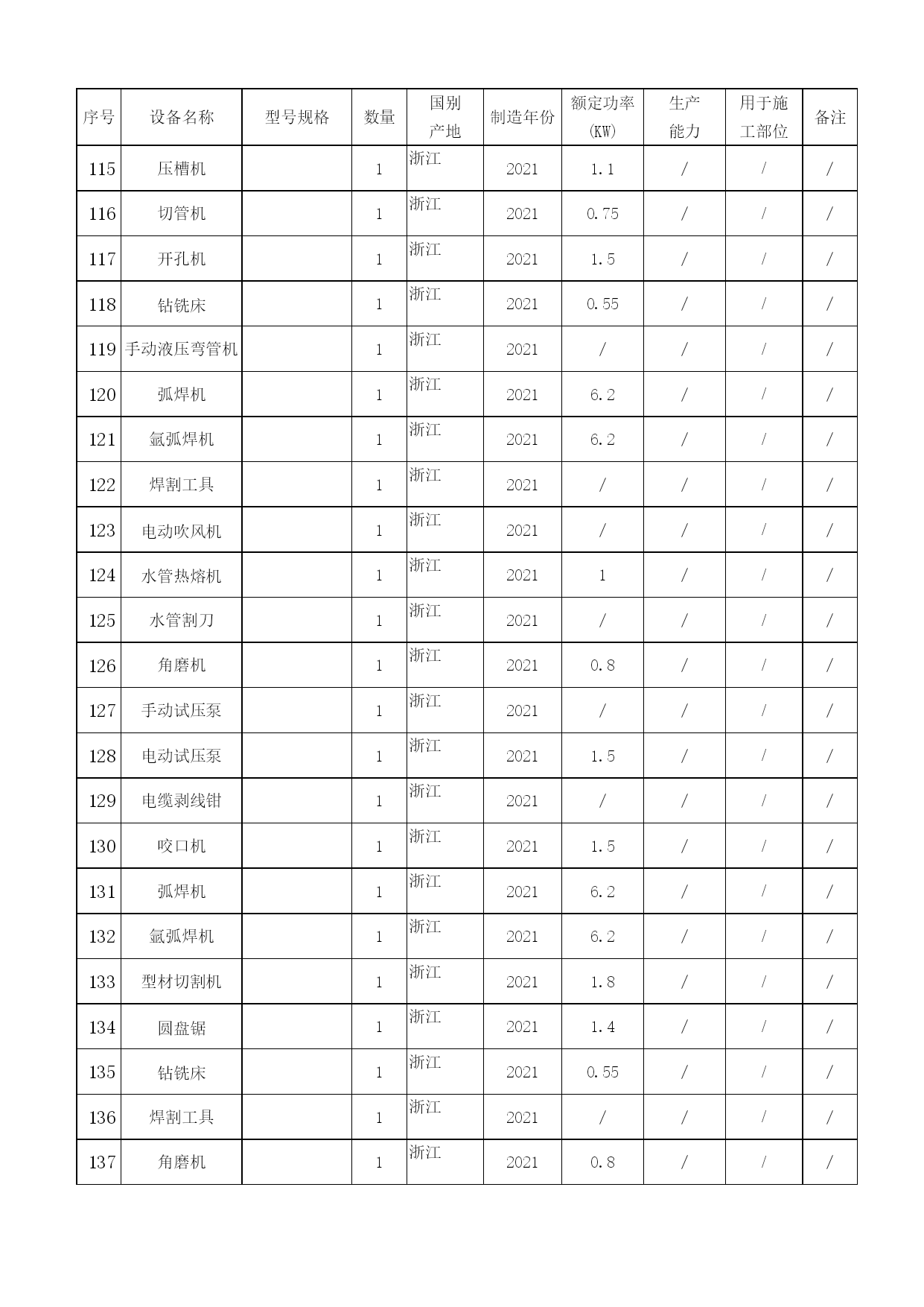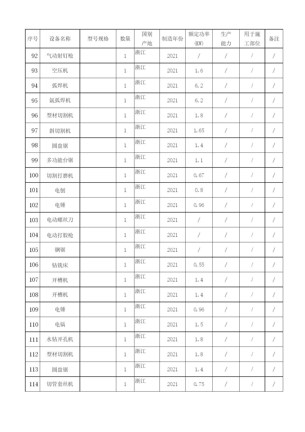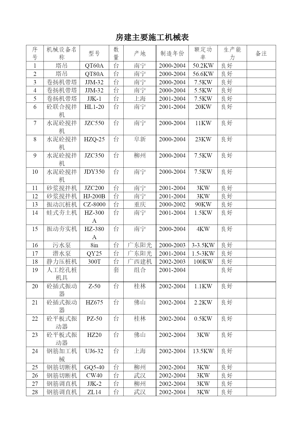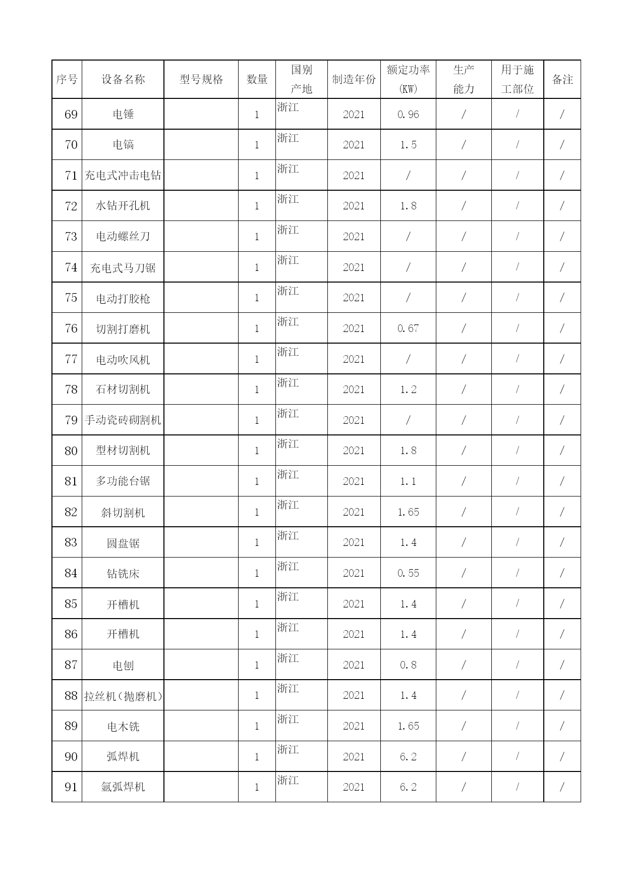 装饰装修机械表优质资料(可以直接使用,可编辑优质资料,欢迎下载)(2)拟投入施工机械设备情况表序号设备名称型号规格数量国别产地制造年份额定功率(KW)生产能力用于施工部位备注小型汽油发电机1上海20213///小型汽油发电机1上海20216///管道增压泵1浙江20211.5///管道增压泵1浙江20215.5///汽车起重机1柳州2021105///汽车起重机1湖南2021162///汽车起重机1湖南2021180///高空作业车1柳州202180///随车起重运输车1柳州2021105///自卸汽车1湖北202195///自卸汽车1柳州2021103///平衡重式叉车1柳州202153.5///人力手推斗车1广西2021无///塔式起重机1广西202137///施工升降机1广西202115*3///施工井架1广西20217.2*2///施工吊篮1山东20212*1.5///钢管调直除锈刷漆机1河北20214+3///扣件修复机1河北20211.2///钢筋调直切断机1山东20215.5+4///钢筋切断机1山东20213///钢筋弯曲机1山东20213///弧焊电焊机1浙江202114.4///氩弧焊电焊机1浙江20218.6///钢筋切割锯1浙江20212.2///金属切割机1浙江20211.2///钢筋剪1浙江2021////焊条烘干箱1浙江20211.5///木工台锯1浙江20213///手提圆盘锯1浙江20212///手提圆盘锯1浙江20211.1///手电钻1浙江20211.01///平刨机1浙江20212.2///手提电刨1浙江20210.8///推拉锯1浙江2021////混凝土搅拌机1浙江20215.5///平板振动器1浙江20211.5///混凝土振动捧1浙江20211.5///混凝土振动尺1浙江20210.25///混凝土抹光机1浙江20212.2///砂浆泵1浙江202137///砂浆搅拌机1浙江20211.5///砂浆搅拌机1浙江20215.5///构造柱浇注机1浙江20215.5///小型混凝土泵1浙江20217.5//水泥砂浆喷涂机1浙江20214///电镐1浙江20210.9///地面铣刨机1浙江20217.5///水磨石打磨机1浙江20214///打蜡机1浙江20210.37///地面抹光机1浙江20212.2///石材砌割机1浙江20211.9///手动瓷砖砌割机1浙江2021////防水卷材焊接机1浙江20214.2///调风焊枪1浙江20211.6///火枪1浙江2021////多功能喷涂机1浙江2021////空气压缩机1浙江20212.25///多功能搅拌机1浙江20210.8///电动无气喷涂机1浙江20212.6///电动喷漆枪1浙江20210.5///墙面打磨机1浙江20210.8///瓦斯射钉枪1浙江2021////气动射钉枪2浙江2021////空压机1浙江20211.6///手电钻1浙江20210.25///手电钻1浙江20210.5///角磨机1浙江20210.8///电锤1浙江20210.96///电镐1浙江20211.5///充电式冲击电钻1浙江2021////水钻开孔机1浙江20211.8///电动螺丝刀1浙江2021////充电式马刀锯1浙江2021////电动打胶枪1浙江2021////切割打磨机1浙江20210.67///电动吹风机1浙江2021////石材切割机1浙江20211.2///手动瓷砖砌割机1浙江2021////型材切割机1浙江20211.8///多功能台锯1浙江20211.1///斜切割机1浙江20211.65///圆盘锯1浙江20211.4///钻铣床1浙江20210.55///开槽机1浙江20211.4///开槽机1浙江20211.4///电刨1浙江20210.8///拉丝机(抛磨机)1浙江20211.4///电木铣1浙江20211.65///弧焊机1浙江20216.2///氩弧焊机1浙江20216.2///气动射钉枪1浙江2021////空压机1浙江20211.6///弧焊机1浙江20216.2///氩弧焊机1浙江20216.2///型材切割机1浙江20211.8///斜切割机1浙江20211.65///圆盘锯1浙江20211.4///多功能台锯1浙江20211.1///切割打磨机1浙江20210.67///电刨1浙江20210.8///电锤1浙江20210.96///电动螺丝刀1浙江2021////电动打胶枪1浙江2021////钢锯1浙江2021////钻铣床1浙江20210.55///开槽机1浙江20211.4///开槽机1浙江20211.4///电锤1浙江20210.96///电镐1浙江20211.5///水钻开孔