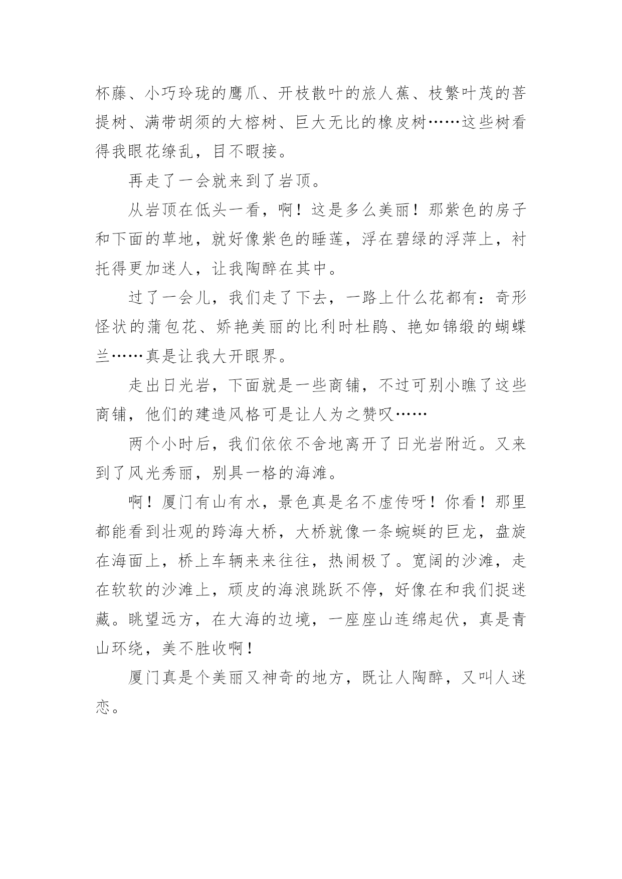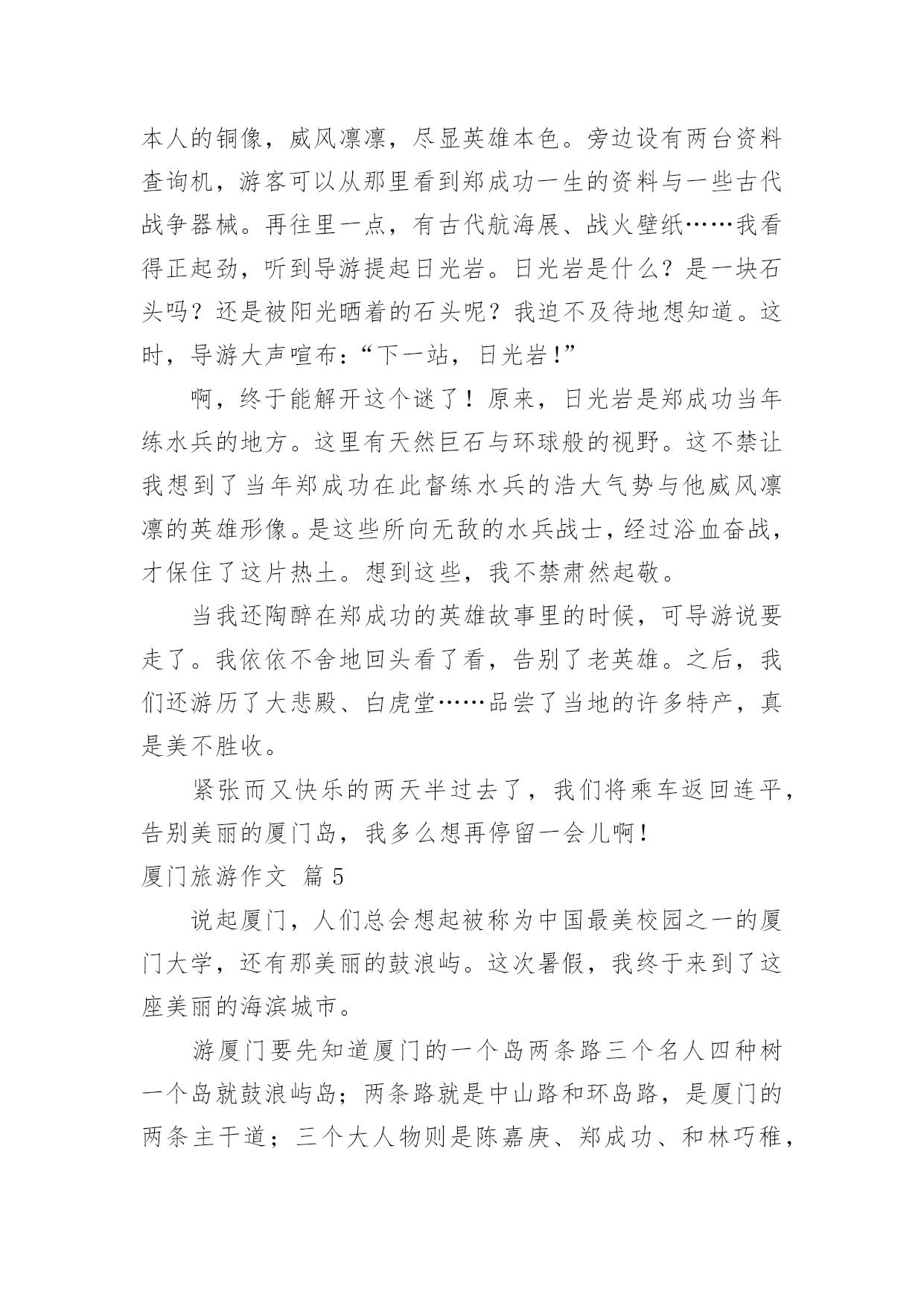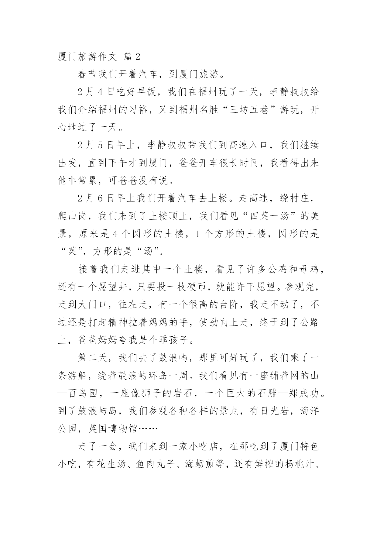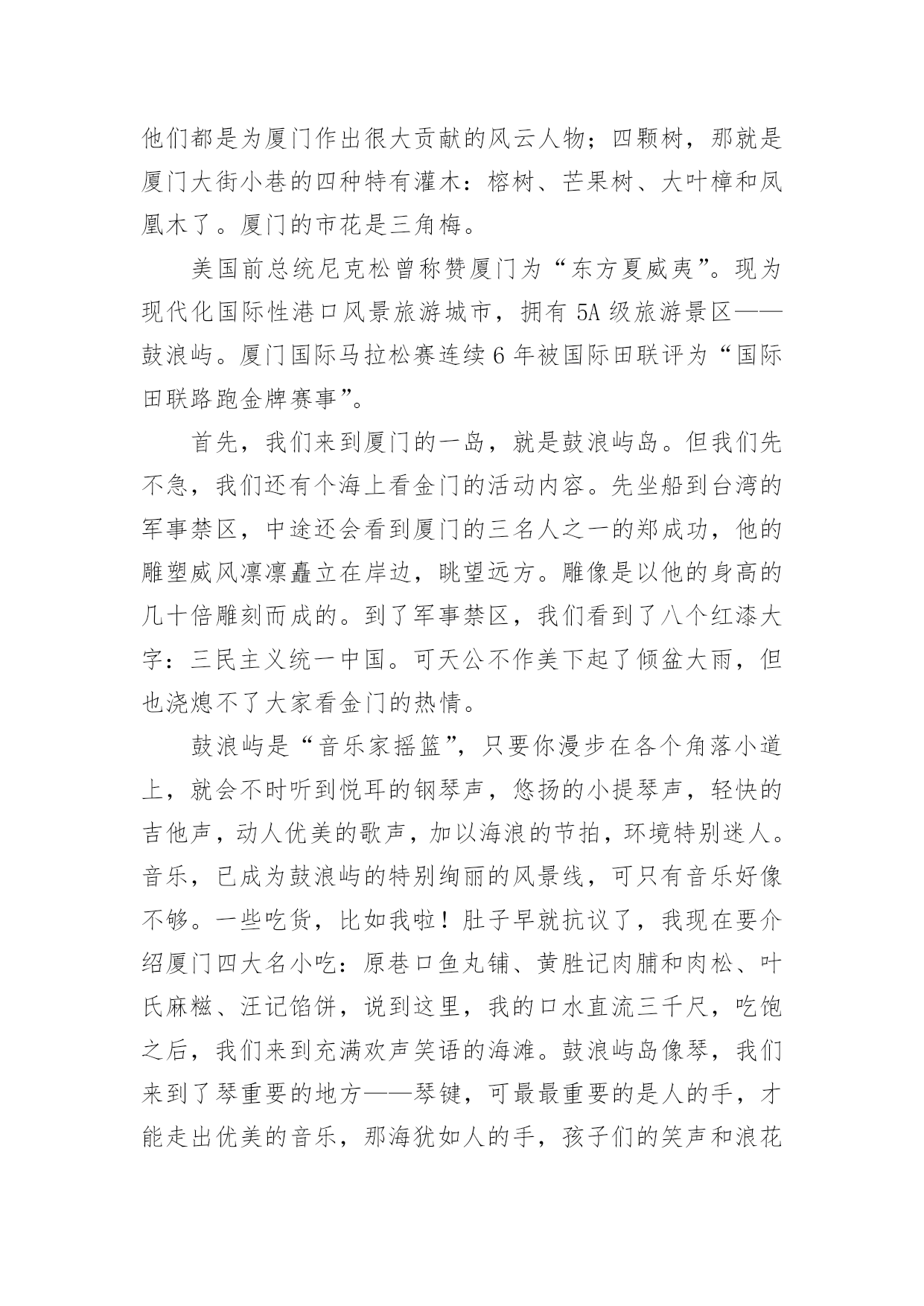 厦门旅游作文【热门】厦门旅游作文6篇在日复一日的学习、工作或生活中,大家都写过作文,肯定对各类作文都很熟悉吧,借助作文可以宣泄心中的情感,调节自己的心情。你写作文时总是无从下笔?下面是小编为大家整理的厦门旅游作文6篇,希望能够帮助到大家。厦门旅游作文篇1今天,我们的快乐之旅马上要开始起航喽!因为这一次我们要去美丽的海滨城市---厦门。我们去了鼓浪屿。鼓浪屿是厦门主要的旅游景点。我去了岛上的海洋世界玩,其它在鼓浪屿上的景点我就不一个一个说了,我就详细地写在海洋世界里发生的事吧。在海洋馆里的鱼儿都展示着自己身上的颜色,争着让人去拍呢!不过,水母比鱼儿还要好看,因为水母每一分钟变一次颜色,哈哈,其时是水箱里的灯光在变换着颜色。海底隧道里游来游去的鲨鱼,让人在看了有点害怕,不敢动。不过,在回去的路上,我们路过卖吃的地方和商场。进了商场,我看见有一只鱼缸里放着几只很小的鱼,旁边放着几盒小鱼的鱼卵,盒子上写着“太空小鱼”这几个字。我一看到这几个字就很好奇,很想买。于是,我价格也没看,就拿去给妈妈看,说要买这个,可是,妈妈不肯给我买。我后来才看到价格,很贵。后来想想买来也没用,就不买了。我们马上要走了,因为下一个景点还在等着我呢。厦门旅游作文篇2春节我们开着汽车,到厦门旅游。2月4日吃好早饭,我们在福州玩了一天,李静叔叔给我们介绍福州的习裕,又到福州名胜“三坊五巷”游玩,开心地过了一天。2月5日早上,李静叔叔带我们到高速入口,我们继续出发,直到下午才到厦门,爸爸开车很长时间,我看得出来他非常累,可爸爸没有说。2月6日早上我们开着汽车去土楼。走高速,绕村庄,爬山岗,我们来到了土楼顶上,我们看见“四菜一汤”的美景,原来是4个圆形的土楼,1个方形的土楼,圆形的是“菜”,方形的是“汤”。接着我们走进其中一个土楼,看见了许多公鸡和母鸡,还有一个愿望井,只要投一枚硬币,就能许下愿望。参观完,走到大门口,往左走,有一个很高的台阶,我走不动了,不过还是打起精神拉着妈妈的手,使劲向上走,终于到了公路上,爸爸妈妈夸我是个乖孩子。第二天,我们去了鼓浪屿,那里可好玩了,我们乘了一条游船,绕着鼓浪屿环岛一周。我们看见有一座铺着网的山—百鸟园,一座像狮子的岩石,一个巨大的石雕—郑成功。到了鼓浪屿岛,我们参观各种各样的景点,有日光岩,海洋公园,英国博物馆……走了一会,我们来到一家小吃店,在那吃到了厦门特色小吃,有花生汤、鱼肉丸子、海蛎煎等,还有鲜榨的杨桃汁、芒果汁,可好吃了。2月7日要回家了,爸爸开着汽车,我们用照相机录下了一路的风景,踏上了回家的路。厦门旅游作文篇3八月十四日,我们三个先吃完早饭,然后,坐公交车去南普陀玩。到了南普陀,这时,我看到这里已经成了人山人海了。随后,我们就在门前投钱上香。我刚要投钱,才发现这枚硬币的价值很小,于是我就问妈妈:“妈妈,投这么少钱能不能拿到一枝香啊?”妈妈说:“能,你看,人家拿那么少钱还不是能拿到香吗?所以,你也能拿到香啊!”上完香,我们就到一个宫殿的出口买门票。一进门,我就看到了一个大佛,于是我们就拜拂,拜完拂,我们在后面看见了一座小山。于是,我们先在小山左边发现了一个山洞。这个山洞很大也很宽,宽度为七到八米,我还发现,里面摆满了菩萨,于是,我们又进洞拜菩萨,我们还在山脚下发现了几个用石头做的狮子,在山的右边还发现了一个“拂”字,大家都在这个地方拍照呢!我们准备出去南普陀的时候,我还看到了有一座小池,里面有很多各种各样的小鱼呢,最后,照了几个相,就离开了南普陀。今天,是我最快乐的一天。厦门旅游作文篇4三八节的时候,我与妈妈与她的同事一起去厦门旅游。那是个电力之城,而且景点多如繁星,一想起这些,我就非常兴奋。午饭后,我们约坐了九个小时的车程,已经是晚上十一点多了,终于到达了厦门,一座灯火通明的不夜城出现在前方。首先映入我眼帘的是跨海大桥,桥上灯火辉煌,在灯光的照耀下,跨海大桥像一条金色的苍龙横跨在海面上。这是海上的交通要道,没有了它与船,厦门几乎是一座死岛。第二天早饭后,我们跟着导游来到了胡里山炮台。胡里山炮台是海防要塞,成千上万的大炮摆在那里,显得格外威严。然而,最吸引我的是德克博虎大炮。这大炮有一百多吨重,身长二十九米,单炮杆就有二十米长。据说一炮可打二十公里远,就连飞机与航母它都不放在眼里。这门炮是海防的核心力量,当年它是够威风的,曾打得敌军闻风丧胆。接着,我们来到了集美。说到集美,就不得不去看陈嘉庚纪念馆。陈嘉庚是一位名人,纪念馆里陈列着他的遗物,里面有他穿过的旧靴、打过补丁的衣服、逢补过的雨伞,还有他与他兴办的学校师生的留影……这不禁让我想到了陈嘉庚的节省、为国家着想的心。我下定决心,在我长大后,一定也要像陈嘉庚那样做一个爱国的人。午饭后,我们坐船来到了鼓浪屿。因为这里不准开机动车,所以没有废气,没有噪音,空气非常新