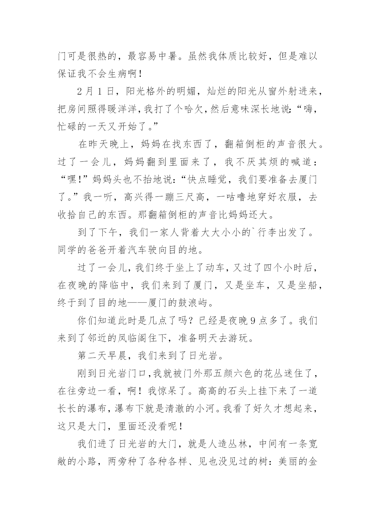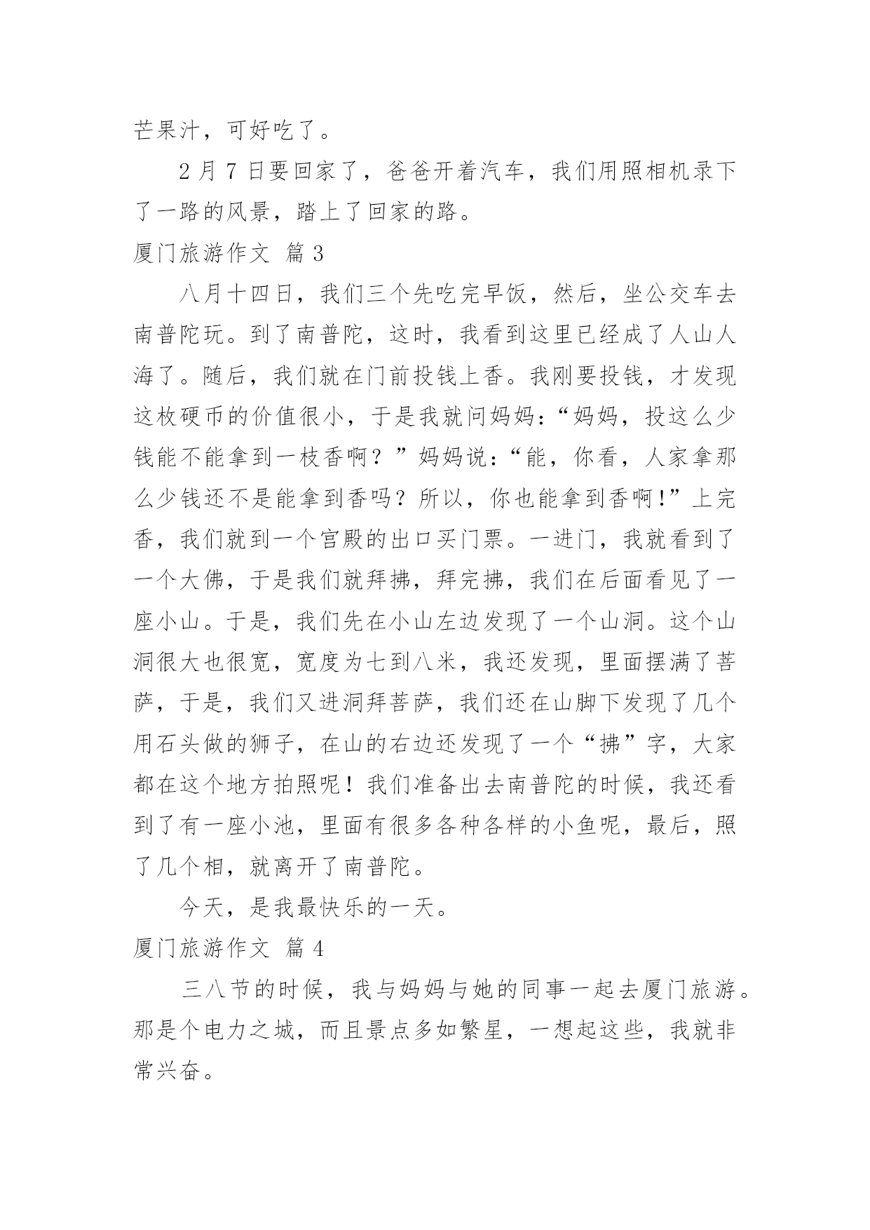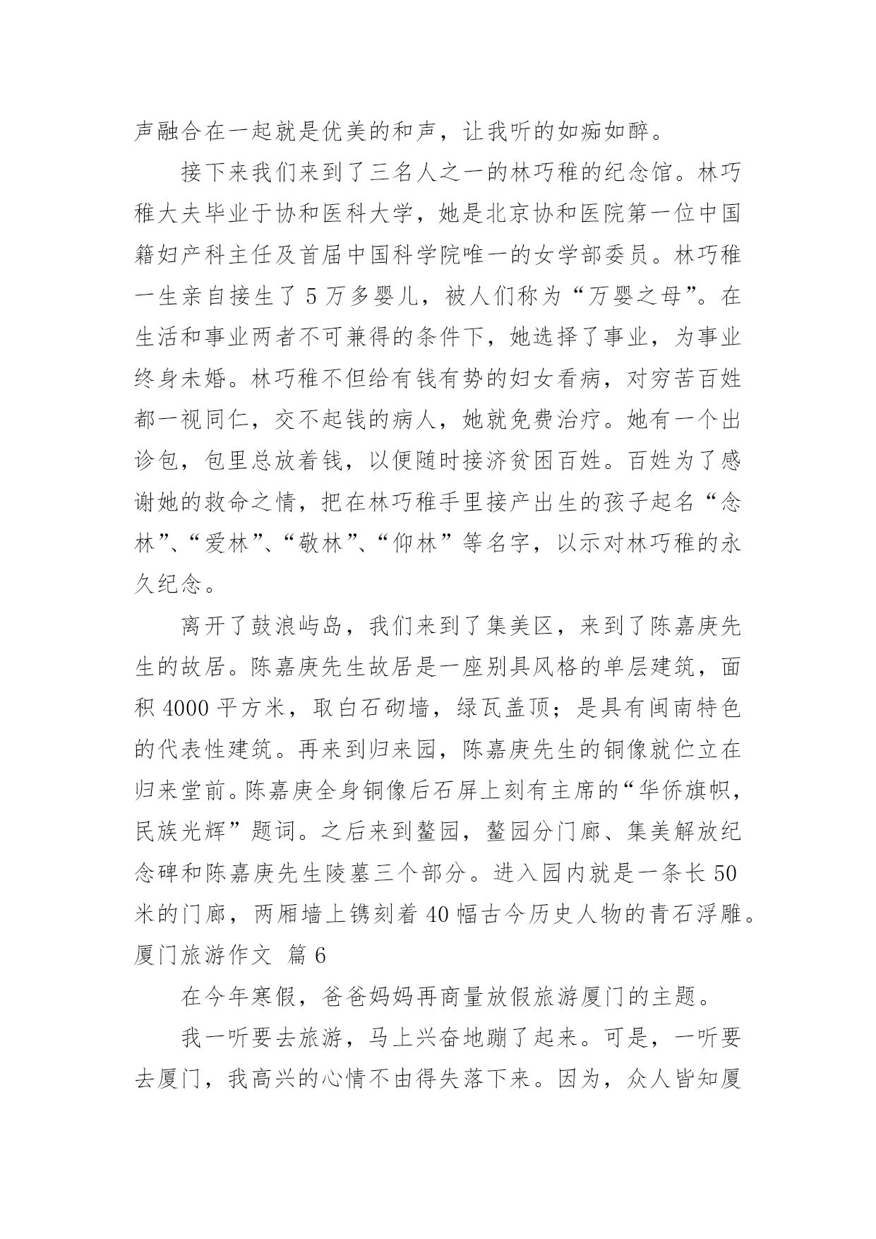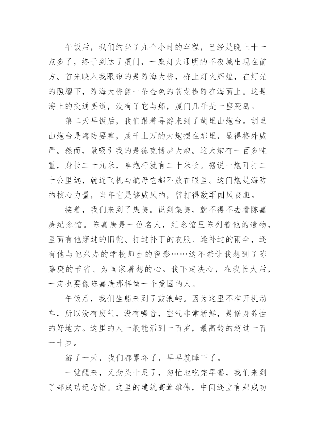 厦门旅游作文【热门】厦门旅游作文6篇在日复一日的学习、工作或生活中,大家都写过作文,肯定对各类作文都很熟悉吧,借助作文可以宣泄心中的情感,调节自己的心情。你写作文时总是无从下笔?下面是小编为大家整理的厦门旅游作文6篇,希望能够帮助到大家。厦门旅游作文篇1今天,我们的快乐之旅马上要开始起航喽!因为这一次我们要去美丽的海滨城市---厦门。我们去了鼓浪屿。鼓浪屿是厦门主要的旅游景点。我去了岛上的海洋世界玩,其它在鼓浪屿上的景点我就不一个一个说了,我就详细地写在海洋世界里发生的事吧。在海洋馆里的鱼儿都展示着自己身上的颜色,争着让人去拍呢!不过,水母比鱼儿还要好看,因为水母每一分钟变一次颜色,哈哈,其时是水箱里的灯光在变换着颜色。海底隧道里游来游去的鲨鱼,让人在看了有点害怕,不敢动。不过,在回去的路上,我们路过卖吃的地方和商场。进了商场,我看见有一只鱼缸里放着几只很小的鱼,旁边放着几盒小鱼的鱼卵,盒子上写着“太空小鱼”这几个字。我一看到这几个字就很好奇,很想买。于是,我价格也没看,就拿去给妈妈看,说要买这个,可是,妈妈不肯给我买。我后来才看到价格,很贵。后来想想买来也没用,就不买了。我们马上要走了,因为下一个景点还在等着我呢。厦门旅游作文篇2春节我们开着汽车,到厦门旅游。2月4日吃好早饭,我们在福州玩了一天,李静叔叔给我们介绍福州的习裕,又到福州名胜“三坊五巷”游玩,开心地过了一天。2月5日早上,李静叔叔带我们到高速入口,我们继续出发,直到下午才到厦门,爸爸开车很长时间,我看得出来他非常累,可爸爸没有说。2月6日早上我们开着汽车去土楼。走高速,绕村庄,爬山岗,我们来到了土楼顶上,我们看见“四菜一汤”的美景,原来是4个圆形的土楼,1个方形的土楼,圆形的是“菜”,方形的是“汤”。接着我们走进其中一个土楼,看见了许多公鸡和母鸡,还有一个愿望井,只要投一枚硬币,就能许下愿望。参观完,走到大门口,往左走,有一个很高的台阶,我走不动了,不过还是打起精神拉着妈妈的手,使劲向上走,终于到了公路上,爸爸妈妈夸我是个乖孩子。第二天,我们去了鼓浪屿,那里可好玩了,我们乘了一条游船,绕着鼓浪屿环岛一周。我们看见有一座铺着网的山—百鸟园,一座像狮子的岩石,一个巨大的石雕—郑成功。到了鼓浪屿岛,我们参观各种各样的景点,有日光岩,海洋公园,英国博物馆……走了一会,我们来到一家小吃店,在那吃到了厦门特色小吃,有花生汤、鱼肉丸子、海蛎煎等,还有鲜榨的杨桃汁、芒果汁,可好吃了。2月7日要回家了,爸爸开着汽车,我们用照相机录下了一路的风景,踏上了回家的路。厦门旅游作文篇3八月十四日,我们三个先吃完早饭,然后,坐公交车去南普陀玩。到了南普陀,这时,我看到这里已经成了人山人海了。随后,我们就在门前投钱上香。我刚要投钱,才发现这枚硬币的价值很小,于是我就问妈妈:“妈妈,投这么少钱能不能拿到一枝香啊?”妈妈说:“能,你看,人家拿那么少钱还不是能拿到香吗?所以,你也能拿到香啊!”上完香,我们就到一个宫殿的出口买门票。一进门,我就看到了一个大佛,于是我们就拜拂,拜完拂,我们在后面看见了一座小山。于是,我们先在小山左边发现了一个山洞。这个山洞很大也很宽,宽度为七到八米,我还发现,里面摆满了菩萨,于是,我们又进洞拜菩萨,我们还在山脚下发现了几个用石头做的狮子,在山的右边还发现了一个“拂”字,大家都在这个地方拍照呢!我们准备出去南普陀的时候,我还看到了有一座小池,里面有很多各种各样的小鱼呢,最后,照了几个相,就离开了南普陀。今天,是我最快乐的一天。厦门旅游作文篇4三八节的时候,我与妈妈与她的同事一起去厦门旅游。那是个电力之城,而且景点多如繁星,一想起这些,我就非常兴奋。午饭后,我们约坐了九个小时的车程,已经是晚上十一点多了,终于到达了厦门,一座灯火通明的不夜城出现在前方。首先映入我眼帘的是跨海大桥,桥上灯火辉煌,在灯光的照耀下,跨海大桥像一条金色的苍龙横跨在海面上。这是海上的交通要道,没有了它与船,厦门几乎是一座死岛。第二天早饭后,我们跟着导游来到了胡里山炮台。胡里山炮台是海防要塞,成千上万的大炮摆在那里,显得格外威严。然而,最吸引我的是德克博虎大炮。这大炮有一百多吨重,身长二十九米,单炮杆就有二十米长。据说一炮可打二十公里远,就连飞机与航母它都不放在眼里。这门炮是海防的核心力量,当年它是够威风的,曾打得敌军闻风丧胆。接着,我们来到了集美。说到集美,就不得不去看陈嘉庚纪念馆。陈嘉庚是一位名人,纪念馆里陈列着他的遗物,里面有他穿过的旧靴、打过补丁的衣服、逢补过的雨伞,还有他与他兴办的学校师生的留影……这不禁让我想到了陈嘉庚的节省、为国家着想的心。我下定决心,在我长大后,一定也要像陈嘉庚那样做一个爱国的人。午饭后,我们坐船来到了鼓浪屿。因为这里不准开机动车,所以没有废气,没有噪音,空气非常新