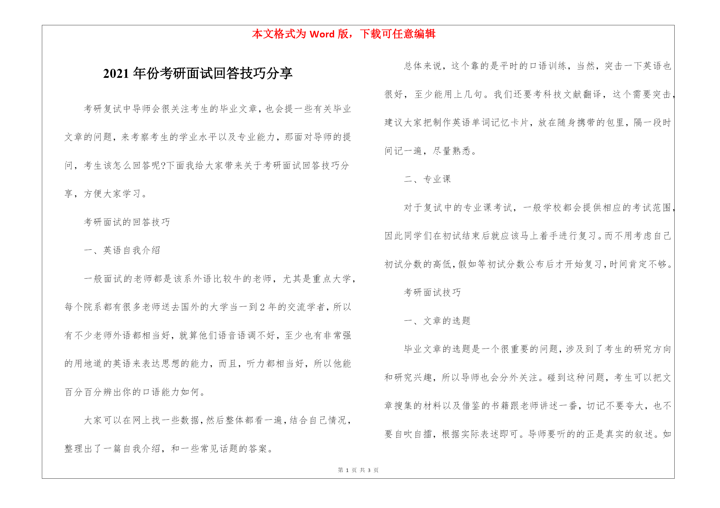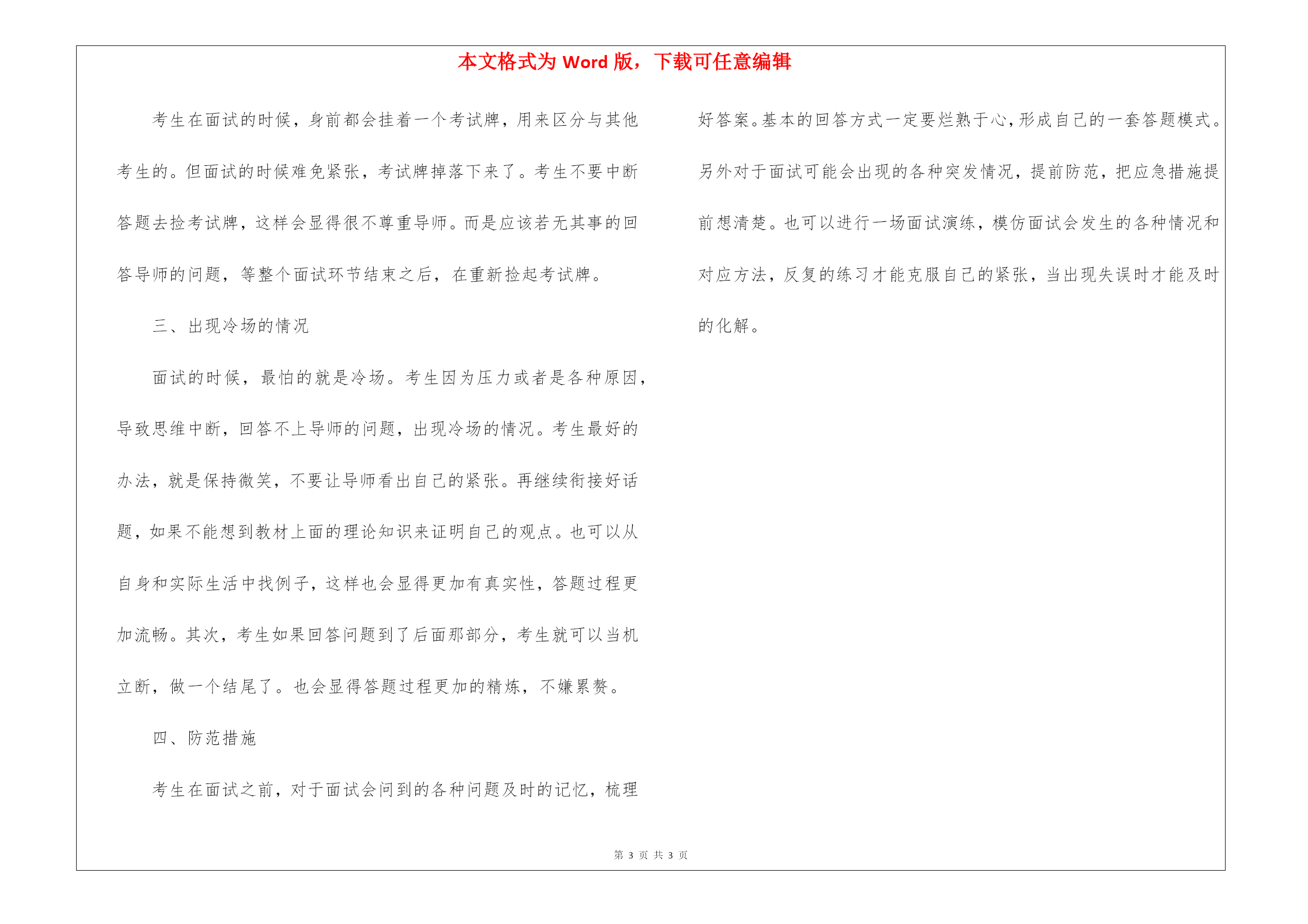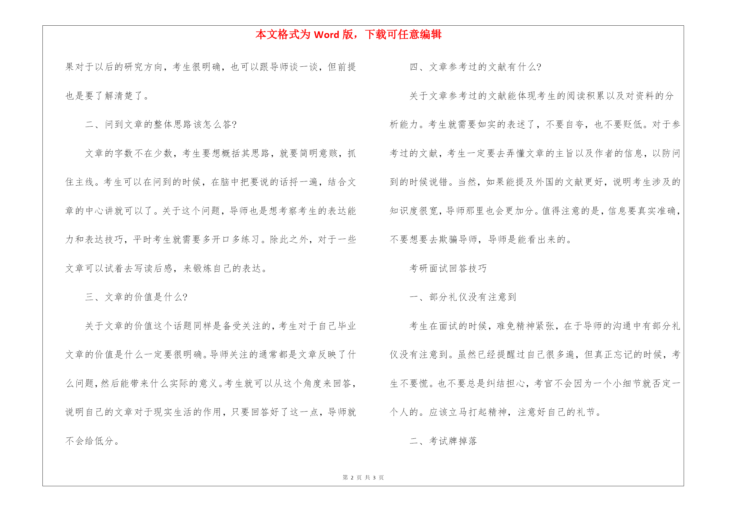 本文格式为Word版,下载可任意编辑第PAGE\*MERGEFORMAT3页共NUMPAGES\*MERGEFORMAT3页2021年份考研面试回答技巧分享考研复试中导师会很关注考生的毕业文章,也会提一些有关毕业文章的问题,来考察考生的学业水平以及专业能力,那面对导师的提问,考生该怎么回答呢?下面我给大家带来关于考研面试回答技巧分享,方便大家学习。考研面试的回答技巧一、英语自我介绍一般面试的老师都是该系外语比较牛的老师,尤其是重点大学,每个院系都有很多老师送去国外的大学当一到2年的交流学者,所以有不少老师外语都相当好,就算他们语音语调不好,至少也有非常强的用地道的英语来表达思想的能力,而且,听力都相当好,所以他能百分百分辨出你的口语能力如何。大家可以在网上找一些数据,然后整体都看一遍,结合自己情况,整理出了一篇自我介绍,和一些常见话题的答案。总体来说,这个靠的是平时的口语训练,当然,突击一下英语也很好,至少能用上几句。我们还要考科技文献翻译,这个需要突击,建议大家把制作英语单词记忆卡片,放在随身携带的包里,隔一段时间记一遍,尽量熟悉。二、专业课对于复试中的专业课考试,一般学校都会提供相应的考试范围,因此同学们在初试结束后就应该马上着手进行复习。而不用考虑自己初试分数的高低,假如等初试分数公布后才开始复习,时间肯定不够。考研面试技巧一、文章的选题毕业文章的选题是一个很重要的问题,涉及到了考生的研究方向和研究兴趣,所以导师也会分外关注。碰到这种问题,考生可以把文章搜集的材料以及借鉴的书籍跟老师讲述一番,切记不要夸大,也不要自吹自擂,根据实际表述即可。导师要听的的正是真实的叙述。如果对于以后的研究方向,考生很明确,也可以跟导师谈一谈,但前提也是要了解清楚了。二、问到文章的整体思路该怎么答?文章的字数不在少数,考生要想概括其思路,就要简明意赅,抓住主线。考生可以在问到的时候,在脑中把要说的话捋一遍,结合文章的中心讲就可以了。关于这个问题,导师也是想考察考生的表达能力和表达技巧,平时考生就需要多开口多练习。除此之外,对于一些文章可以试着去写读后感,来锻炼自己的表达。三、文章的价值是什么?关于文章的价值这个话题同样是备受关注的,考生对于自己毕业文章的价值是什么一定要很明确。导师关注的通常都是文章反映了什么问题,然后能带来什么实际的意义。考生就可以从这个角度来回答,说明自己的文章对于现实生活的作用,只要回答好了这一点,导师就不会给低分。四、文章参考过的文献有什么?关于文章参考过的文献能体现考生的阅读积累以及对资料的分析能力。考生就需要如实的表述了,不要自夸,也不要贬低。对于参考过的文献,考生一定要去弄懂文章的主旨以及作者的信息,以防问到的时候说错。当然,如果能提及外国的文献更好,说明考生涉及的知识度很宽,导师那里也会更加分。值得注意的是,信息要真实准确,不要想要去欺骗导师,导师是能看出来的。考研面试回答技巧一、部分礼仪没有注意到考生在面试的时候,难免精神紧张,在于导师的沟通中有部分礼仪没有注意到。虽然已经提醒过自己很多遍,但真正忘记的时候,考生不要慌。也不要总是纠结担心,考官不会因为一个小细节就否定一个人的。应该立马打起精神,注意好自己的礼节。二、考试牌掉落考生在面试的时候,身前都会挂着一个考试牌,用来区分与其他考生的。但面试的时候难免紧张,考试牌掉落下来了。考生不要中断答题去捡考试牌,这样会显得很不尊重导师。而是应该若无其事的回答导师的问题,等整个面试环节结束之后,在重新捡起考试牌。三、出现冷场的情况面试的时候,最怕的就是冷场。考生因为压力或者是各种原因,导致思维中断,回答不上导师的问题,出现冷场的情况。考生最好的办法,就是保持微笑,不要让导师看出自己的紧张。再继续衔接好话题,如果不能想到教材上面的理论知识来证明自己的观点。也可以从自身和实际生活中找例子,这样也会显得更加有真实性,答题过程更加流畅。其次,考生如果回答问题到了后面那部分,考生就可以当机立断,做一个结尾了。也会显得答题过程更加的精炼,不嫌累赘。四、防范措施考生在面试之前,对于面试会问到的各种问题及时的记忆,梳理好答案。基本的回答方式一定要烂熟于心,形成自己的一套答题模式。另外对于面试可能会出现的各种突发情况,提前防范,把应急措施提前想清楚。也可以进行一场面试演练,模仿面试会发生的各种情况和对应方法,反复的练习才能克服自己的紧张,当出现失误时才能及时的化解。