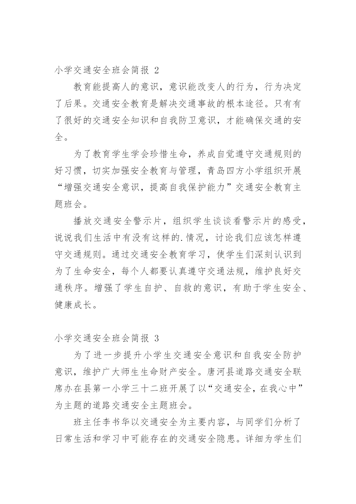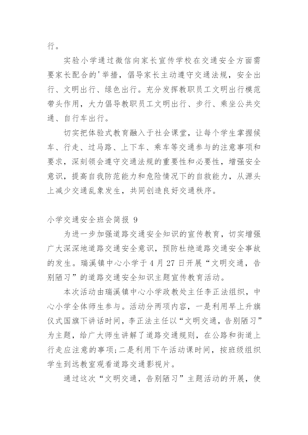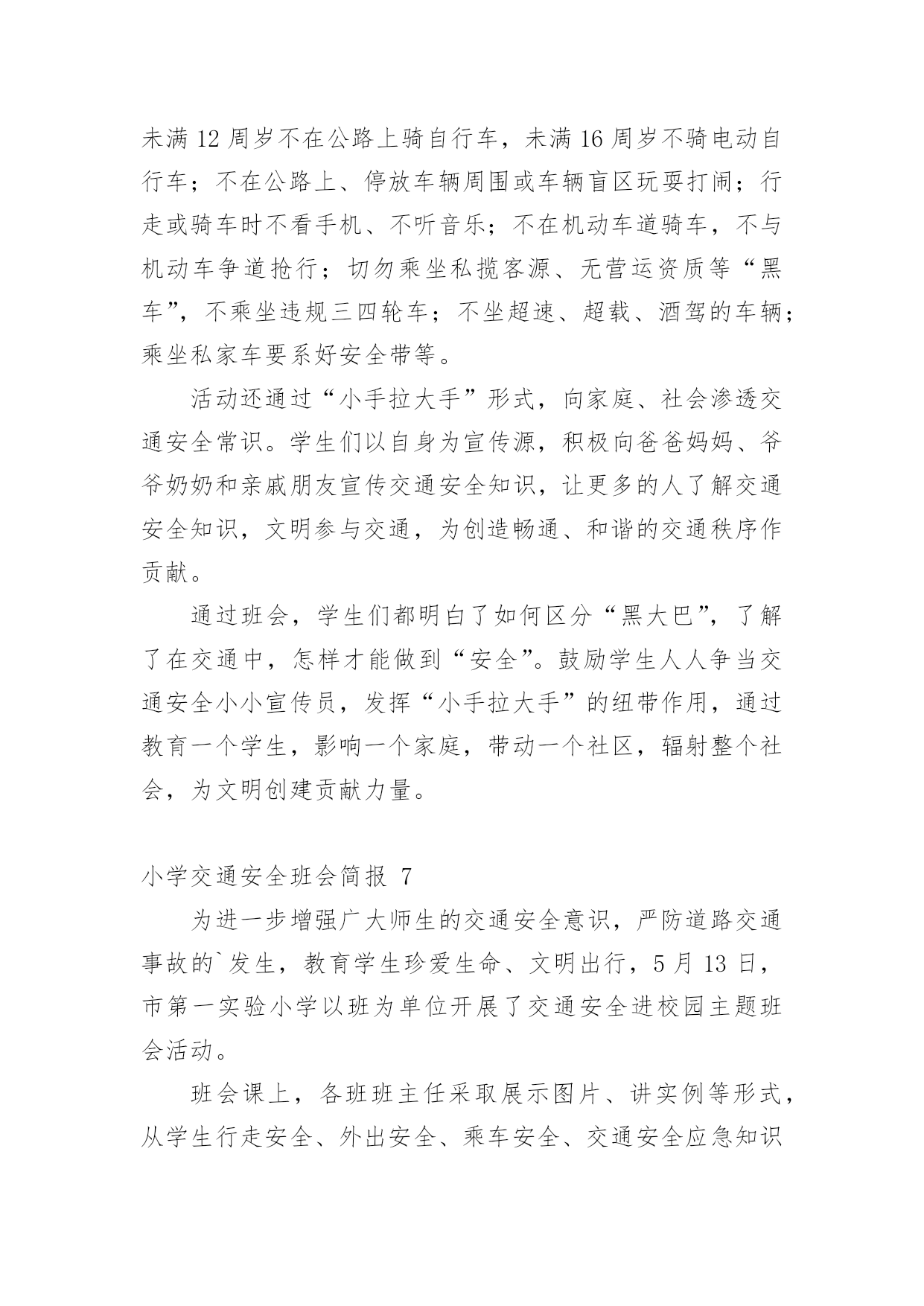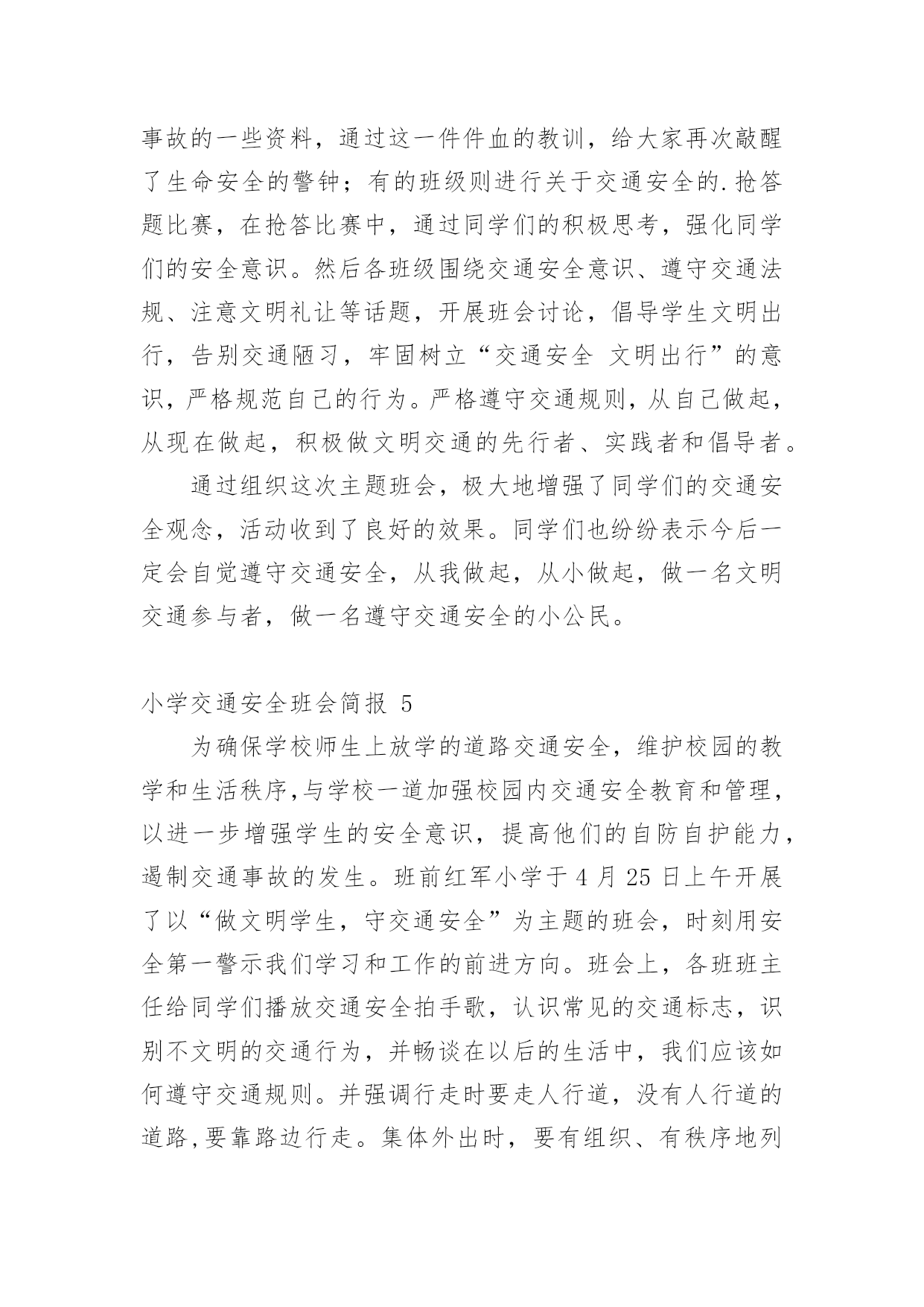 小学交通安全班会简报小学交通安全班会简报(精选20篇)在日常学习、工作抑或是生活中,人们运用到简报的场合不断增多,简报是传递某方面信息的简短的内部小报。拟起简报来就毫无头绪?以下是小编收集整理的小学交通安全班会简报,欢迎阅读与收藏。小学交通安全班会简报1为牢固树立“安全第一、预防为主、教育在前、综合治理”的指导思想,提高师生及家长们的`交通安全意识,小学部于5月26日下午组织开展了线上交通安全宣传教育活动,切实提升孩子的交通安全防范意识,养成文明交通行为习惯。学部根据小学生的年龄特点,开展了关于交通安全的主题教育活动,学习安全交通知识,学唱交通安全歌谣,观看交通动画宣传片,让同学们知安全、讲安全,提高交通安全意识,做一个遵守交通规则的好孩子。道路千万条,安全第一条,交通安全教育应从小做起,让同学们从小学习,懂得遵守交通安全知识,文明出行。同时也请家长们以身作则,戴好安全盔,系好安全带,自觉遵守交通规则,让我们一起守护孩子的平安健康,携手筑牢安全防线,为孩子的生命安全和身体健康保驾护航,为文明城市创建贡献自己的力量!小学交通安全班会简报2教育能提高人的意识,意识能改变人的行为,行为决定了后果。交通安全教育是解决交通事故的根本途径。只有有了很好的交通安全知识和自我防卫意识,才能确保交通的安全。为了教育学生学会珍惜生命,养成自觉遵守交通规则的好习惯,切实加强安全教育与管理,青岛四方小学组织开展“增强交通安全意识,提高自我保护能力”交通安全教育主题班会。播放交通安全警示片,组织学生谈谈看警示片的感受,说说我们生活中有没有这样的.情况,讨论我们应该怎样遵守交通规则。通过交通安全教育学习,使学生们深刻认识到为了生命安全,每个人都要认真遵守交通法规,维护良好交通秩序。增强了学生自护、自救的意识,有助于学生安全、健康成长。小学交通安全班会简报3为了进一步提升小学生交通安全意识和自我安全防护意识,维护广大师生生命财产安全。唐河县道路交通安全联席办在县第一小学三十二班开展了以“交通安全,在我心中”为主题的道路交通安全主题班会。班主任李书华以交通安全为主要内容,与同学们分析了日常生活和学习中可能存在的交通安全隐患。详细为学生们讲解过马路应注意的细节,并纠正了学生们在交通安全中容易犯的几种错误。提高同学们的.自我保护意识,巩固同学们的安全防范心理。班会上,联席办同志组织学生观看了交通安全宣传警示光碟和交通安全知识展板、分发了交通安全知识资料,对在校学生进行交通安全教育,力争把宣传教育的内容融入到小学生的法制教育和社会实践活动当中去。在此次学习活动中,同学们争相回答问题,并以自身为宣传源,积极向爸爸妈妈、爷爷奶奶和亲戚朋友宣传交通安全知识,让更多的人了解交通安全知识,积极参与文明交通活动,为创造畅通、和谐、安全的交通秩序做出贡献。小学交通安全班会简报4为进一步提高学生交通安全意识,促进学生养成自觉遵守交通法规的良好习惯,切实保护学生的生命安全,10月11日下午,青白江区华严小学部开展了“交通安全我践行”为主题的班会活动。本次班会课,各位班主任立足身边实事,通过多种形式,对学生进行交通安全教育。有的班级组织学生共同观看了小学生交通安全知识教育宣传片,以直观的手段,让学生懂得了过马路时一定要走人行横道线、要遵守交通信号灯、行人靠右走、不在马路上追逐打闹、不骑自行车和滑板车上学,不做非法电动车、三轮车……大家都看得非常认真,听得非常仔细;有的班级让同学们上台讲述自己搜集到的关于安全事故的一些资料,通过这一件件血的教训,给大家再次敲醒了生命安全的警钟;有的班级则进行关于交通安全的.抢答题比赛,在抢答比赛中,通过同学们的积极思考,强化同学们的安全意识。然后各班级围绕交通安全意识、遵守交通法规、注意文明礼让等话题,开展班会讨论,倡导学生文明出行,告别交通陋习,牢固树立“交通安全文明出行”的意识,严格规范自己的行为。严格遵守交通规则,从自己做起,从现在做起,积极做文明交通的先行者、实践者和倡导者。通过组织这次主题班会,极大地增强了同学们的交通安全观念,活动收到了良好的效果。同学们也纷纷表示今后一定会自觉遵守交通安全,从我做起,从小做起,做一名文明交通参与者,做一名遵守交通安全的小公民。小学交通安全班会简报5为确保学校师生上放学的道路交通安全,维护校园的教学和生活秩序,与学校一道加强校园内交通安全教育和管理,以进一步增强学生的安全意识,提高他们的自防自护能力,遏制交通事故的发生。班前红军小学于4月25日上午开展了以“做文明学生,守交通安全”为主题的班会,时刻用安全第一警示我们学习和工作的前进方向。班会上,各班班主任给同学们播放交通安全拍手歌,认识常见的交通标志,识别不文明的交通行为,并畅谈在以后的生活中,我们应该如何遵守交通规则。并强调行走时要走人行道,没有人行道