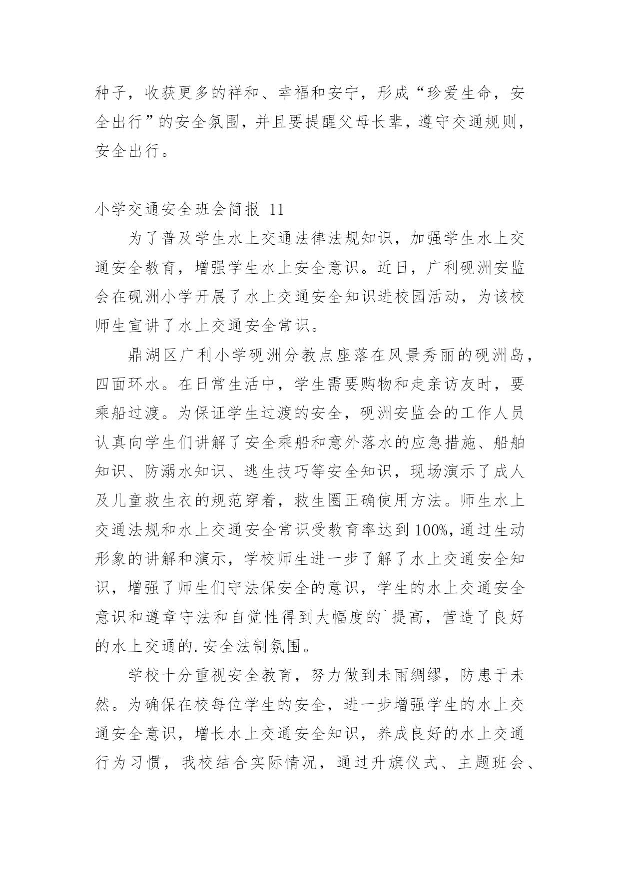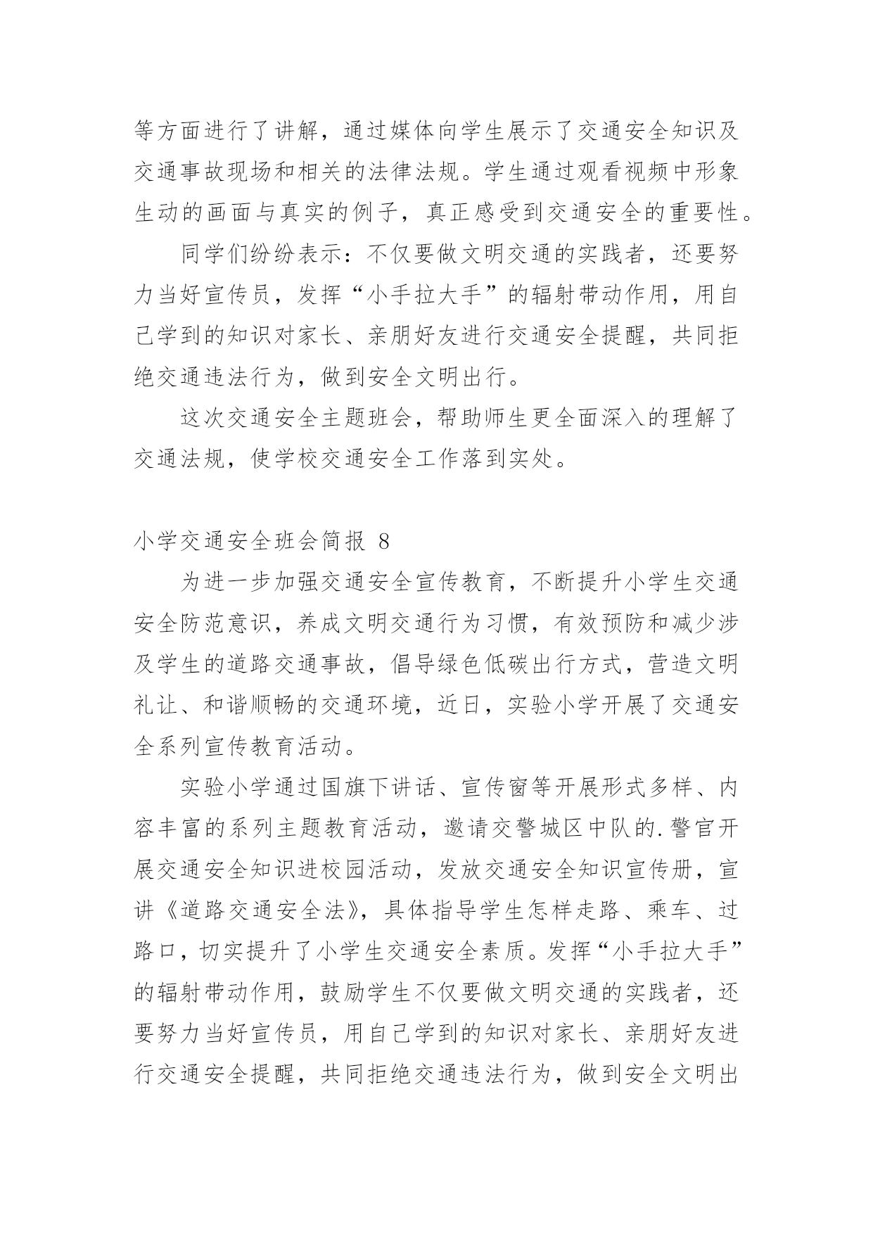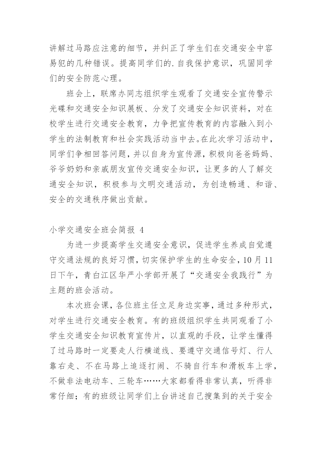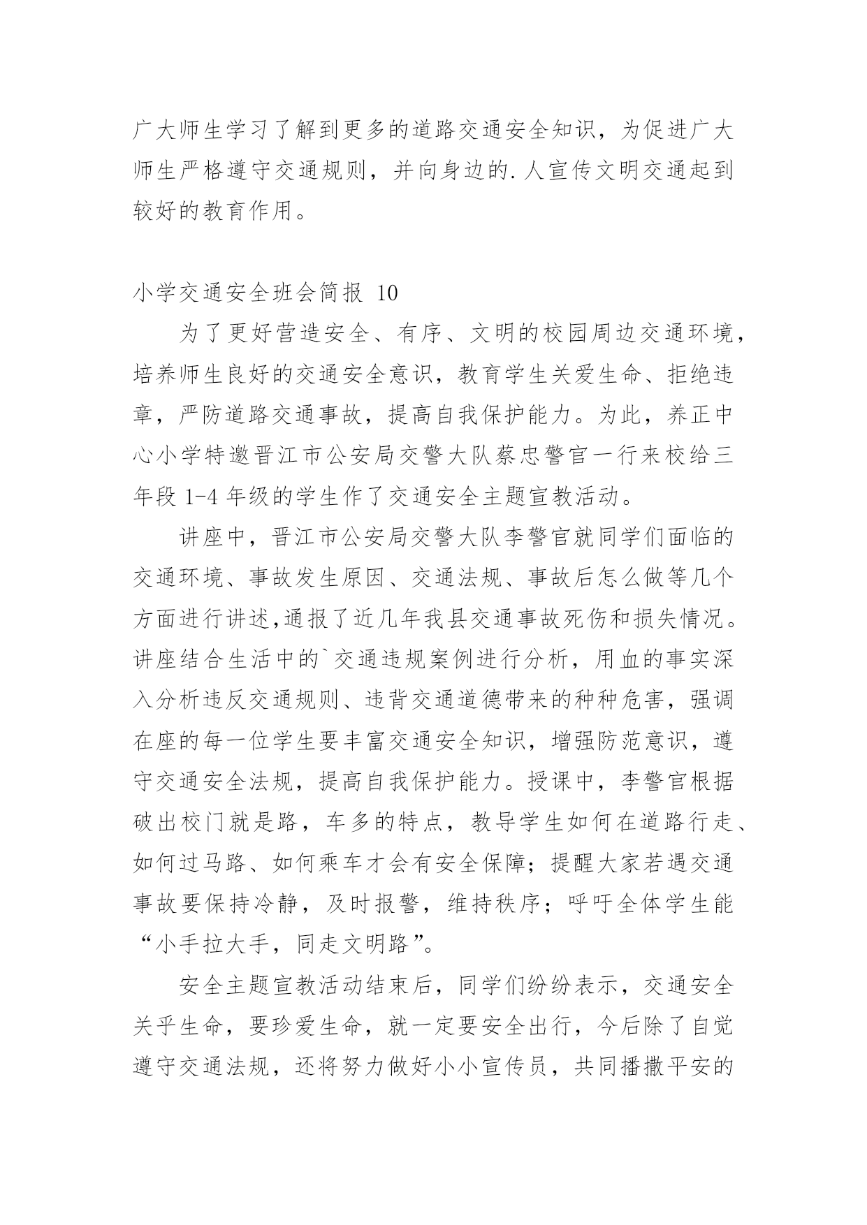 小学交通安全班会简报小学交通安全班会简报(精选20篇)在日常学习、工作抑或是生活中,人们运用到简报的场合不断增多,简报是传递某方面信息的简短的内部小报。拟起简报来就毫无头绪?以下是小编收集整理的小学交通安全班会简报,欢迎阅读与收藏。小学交通安全班会简报1为牢固树立“安全第一、预防为主、教育在前、综合治理”的指导思想,提高师生及家长们的`交通安全意识,小学部于5月26日下午组织开展了线上交通安全宣传教育活动,切实提升孩子的交通安全防范意识,养成文明交通行为习惯。学部根据小学生的年龄特点,开展了关于交通安全的主题教育活动,学习安全交通知识,学唱交通安全歌谣,观看交通动画宣传片,让同学们知安全、讲安全,提高交通安全意识,做一个遵守交通规则的好孩子。道路千万条,安全第一条,交通安全教育应从小做起,让同学们从小学习,懂得遵守交通安全知识,文明出行。同时也请家长们以身作则,戴好安全盔,系好安全带,自觉遵守交通规则,让我们一起守护孩子的平安健康,携手筑牢安全防线,为孩子的生命安全和身体健康保驾护航,为文明城市创建贡献自己的力量!小学交通安全班会简报2教育能提高人的意识,意识能改变人的行为,行为决定了后果。交通安全教育是解决交通事故的根本途径。只有有了很好的交通安全知识和自我防卫意识,才能确保交通的安全。为了教育学生学会珍惜生命,养成自觉遵守交通规则的好习惯,切实加强安全教育与管理,青岛四方小学组织开展“增强交通安全意识,提高自我保护能力”交通安全教育主题班会。播放交通安全警示片,组织学生谈谈看警示片的感受,说说我们生活中有没有这样的.情况,讨论我们应该怎样遵守交通规则。通过交通安全教育学习,使学生们深刻认识到为了生命安全,每个人都要认真遵守交通法规,维护良好交通秩序。增强了学生自护、自救的意识,有助于学生安全、健康成长。小学交通安全班会简报3为了进一步提升小学生交通安全意识和自我安全防护意识,维护广大师生生命财产安全。唐河县道路交通安全联席办在县第一小学三十二班开展了以“交通安全,在我心中”为主题的道路交通安全主题班会。班主任李书华以交通安全为主要内容,与同学们分析了日常生活和学习中可能存在的交通安全隐患。详细为学生们讲解过马路应注意的细节,并纠正了学生们在交通安全中容易犯的几种错误。提高同学们的.自我保护意识,巩固同学们的安全防范心理。班会上,联席办同志组织学生观看了交通安全宣传警示光碟和交通安全知识展板、分发了交通安全知识资料,对在校学生进行交通安全教育,力争把宣传教育的内容融入到小学生的法制教育和社会实践活动当中去。在此次学习活动中,同学们争相回答问题,并以自身为宣传源,积极向爸爸妈妈、爷爷奶奶和亲戚朋友宣传交通安全知识,让更多的人了解交通安全知识,积极参与文明交通活动,为创造畅通、和谐、安全的交通秩序做出贡献。小学交通安全班会简报4为进一步提高学生交通安全意识,促进学生养成自觉遵守交通法规的良好习惯,切实保护学生的生命安全,10月11日下午,青白江区华严小学部开展了“交通安全我践行”为主题的班会活动。本次班会课,各位班主任立足身边实事,通过多种形式,对学生进行交通安全教育。有的班级组织学生共同观看了小学生交通安全知识教育宣传片,以直观的手段,让学生懂得了过马路时一定要走人行横道线、要遵守交通信号灯、行人靠右走、不在马路上追逐打闹、不骑自行车和滑板车上学,不做非法电动车、三轮车……大家都看得非常认真,听得非常仔细;有的班级让同学们上台讲述自己搜集到的关于安全事故的一些资料,通过这一件件血的教训,给大家再次敲醒了生命安全的警钟;有的班级则进行关于交通安全的.抢答题比赛,在抢答比赛中,通过同学们的积极思考,强化同学们的安全意识。然后各班级围绕交通安全意识、遵守交通法规、注意文明礼让等话题,开展班会讨论,倡导学生文明出行,告别交通陋习,牢固树立“交通安全文明出行”的意识,严格规范自己的行为。严格遵守交通规则,从自己做起,从现在做起,积极做文明交通的先行者、实践者和倡导者。通过组织这次主题班会,极大地增强了同学们的交通安全观念,活动收到了良好的效果。同学们也纷纷表示今后一定会自觉遵守交通安全,从我做起,从小做起,做一名文明交通参与者,做一名遵守交通安全的小公民。小学交通安全班会简报5为确保学校师生上放学的道路交通安全,维护校园的教学和生活秩序,与学校一道加强校园内交通安全教育和管理,以进一步增强学生的安全意识,提高他们的自防自护能力,遏制交通事故的发生。班前红军小学于4月25日上午开展了以“做文明学生,守交通安全”为主题的班会,时刻用安全第一警示我们学习和工作的前进方向。班会上,各班班主任给同学们播放交通安全拍手歌,认识常见的交通标志,识别不文明的交通行为,并畅谈在以后的生活中,我们应该如何遵守交通规则。并强调行走时要走人行道,没有人行道