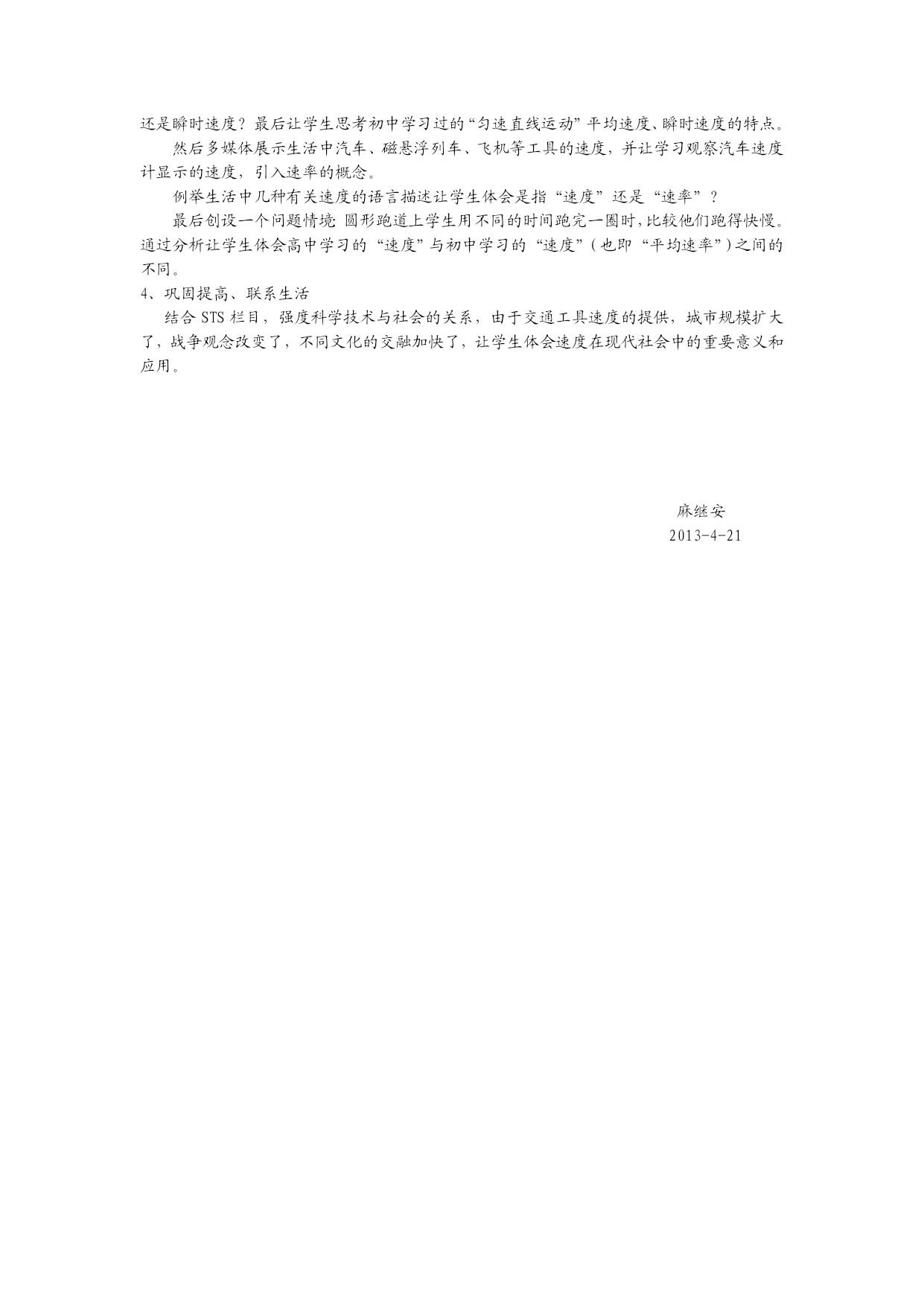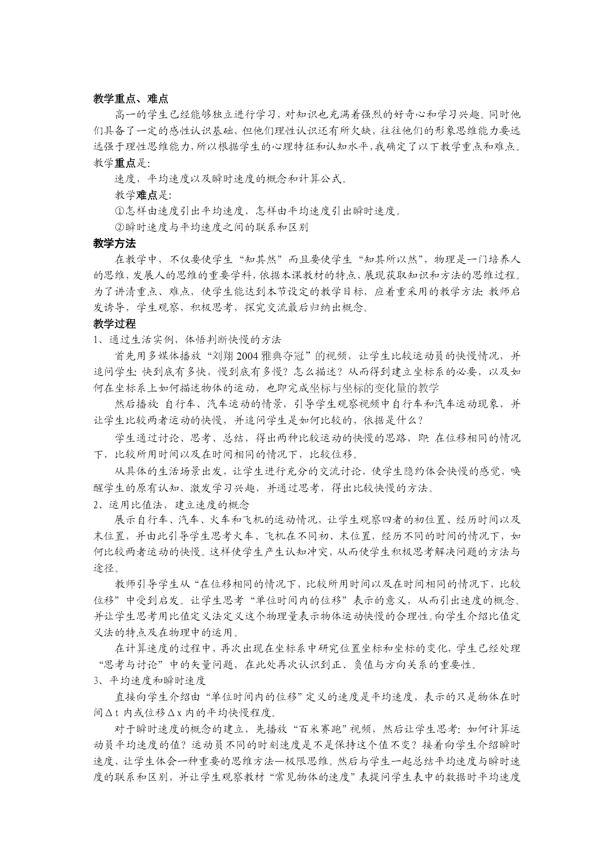 《运动快慢的描述-速度》我说课的课题是《运动快慢的描述-速度》,是人教版普通高中课程标准实验教科书《物理》必修1第一章第三节的内容。教材分析“运动快慢的描述-速度”是高中物理必修1第一章第三节的内容,它与上面两节内容一样,属于运动描述的基础知识。本节内容是建立在学生掌握了参考系、坐标系等描述物体运动的基本方法后提出的,可以说是对这些内容的运用。教材通过坐标的变化量,明确运用矢量描述位置变化的方法,然后将其与时间变化量的比值定义为速度。教材在速度平均速度的概念表述中,用位移代替了初中的路程,因而使速度概念变成矢量,并且首次用比值法来进行定义。同时平均速度是从整体角度反映物体运动快慢的物理量,有助于学生形成整体综合的解决问题的策略。瞬时速度是反映物体在某一时刻(或某一位移)运动快慢和方向的物理量。在引出瞬时速度概念时,利用极限的思想进行思维,是学生学习极限思想方法的很好途径,也是学生对瞬时速度能有一个很好的理解。本节课强调比值法定义物理量,对后面匀变速运动加速度的概念的学习做了很好的铺垫,建立好速度和速率的概念对后面匀变速直线运动、平抛、圆周运动以及对力学和电磁学都有很好的帮助。此外本节内容与生产生活实际联系非常紧密。学情分析1、高一学生认识事物的特点是:已经开始习惯抽象逻辑思维,但思维还常常与感性经验直接相联系,仍需具体形象来支持。2、由于学生在初中已学习过有关速度的知识,在生活中对于速度也有较多的感性知识,在高中重新学习应该困难不大。但学生在初中学习中,速度是一个标量,是用单位时间内通过的路程来表示速度,而高中确是将速度变为矢量,而且采用比值法对速度下了一个规范的定义,达到了由原有的通俗的比较物体运动快慢的方法,过渡到了一个统一的标准,改变了学生已有的认识,拓展概念的内涵,是本节教学的一个难点。教学设计为了充分体现新课程“从生活走向物理,从物理走向社会”的理念,结合教材和学生特点,本节课我以建构主义学习理论为基础,采用启发式教学,以“刘翔2004雅典夺冠”拉开学习的序幕。以师生互动、生生互动为主要的课堂形式引导学生通过通俗的比较运动快慢的方法,过渡到一个统一标准,由此得到速度的定义。自然地得出用比值法定义速度。讲述平均速度时,创设一个问题情境:圆形跑道上学生用不同的时间跑完一圈时,比较他们跑得快慢。引起学生对初中速度定义和高中速度定义的认知冲突,从而很好地区分平均速度和平均速率。在突破瞬时速度这个难点时,可以通过“百米赛跑”中运动员运动快慢的变化并让学生举出生活中类似的例子以及结合教材中“说一说”先感性地认识瞬时速度,至于理性理解瞬时速度可以在以后的学习中逐步加强。教学目标本着面向全体学生的原则,我确定的知识与技能目标是:①理解速度的定义,能正确运用速度公式进行计算。②知道速度是矢量,知道速度的单位。③理解平均速度、瞬时速度的概念并掌握其计算方法。通过对学生认知能力和基本现状的分析,我确定的过程与方法目标是:通过新旧知识的结合以及例题和实例的引导,运用类比的方法,使学生学会如何比较运动的快慢。高中阶段的同学有一定的理性认识基础,对学习有了更加理性的认识,对知识的渴望也不同于一般的学生,因此我确定的情感与态度目标是:通过所学的速度的知识在生活中的实际运用,激发学生学习物理的兴趣和学习物理知识的强烈愿望,进一步培养学生分析和解决问题的能力。教学重点、难点高一的学生已经能够独立进行学习,对知识也充满着强烈的好奇心和学习兴趣。同时他们具备了一定的感性认识基础,但他们理性认识还有所欠缺,往往他们的形象思维能力要远远强于理性思维能力,所以根据学生的心理特征和认知水平,我确定了以下教学重点和难点。教学重点是:速度,平均速度以及瞬时速度的概念和计算公式。教学难点是:①怎样由速度引出平均速度,怎样由平均速度引出瞬时速度。②瞬时速度与平均速度之间的联系和区别教学方法在教学中,不仅要使学生“知其然”而且要使学生“知其所以然”,物理是一门培养人的思维,发展人的思维的重要学科,依据本课教材的特点,展现获取知识和方法的思维过程。为了讲清重点、难点,使学生能达到本节设定的教学目标,应着重采用的教学方法:教师启发诱导,学生观察,积极思考,探究交流最后归纳出概念。教学过程1、通过生活实例,体悟判断快慢的方法首先用多媒体播放“刘翔2004雅典夺冠”的视频,让学生比较运动员的快慢情况,并追问学生:快到底有多快,慢到底有多慢?怎么描述?从而得到建立坐标系的必要,以及如何在坐标系上如何描述物体的运动,也即完成坐标与坐标的变化量的教学然后播放:自行车、汽车运动的情景,引导学生观察视频中自行车和汽车运动现象,并让学生比较两者运动的快慢,并追问学生是如何比较的,依据是什么?学生通过讨论、思考、总结,得出两种比较运动的快慢的