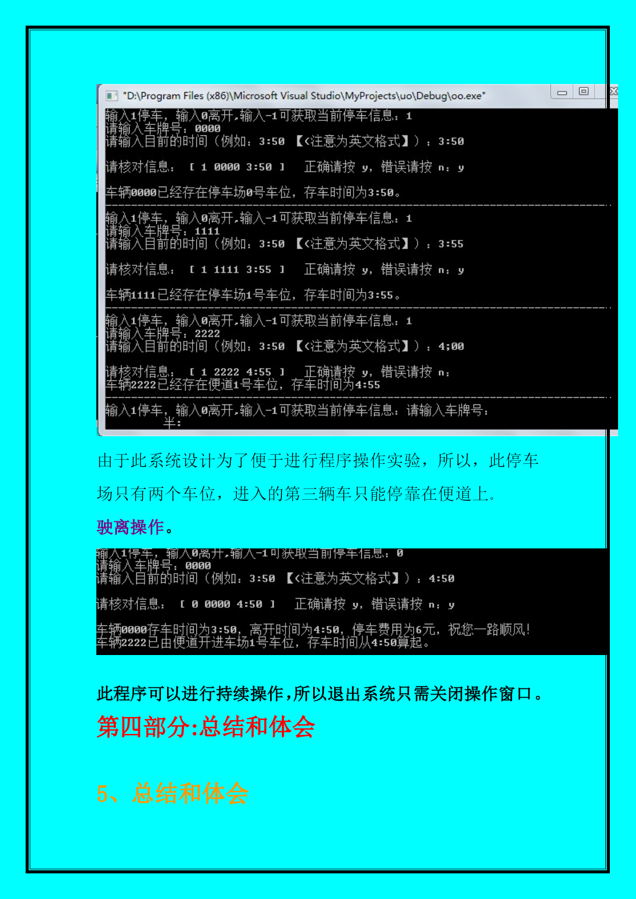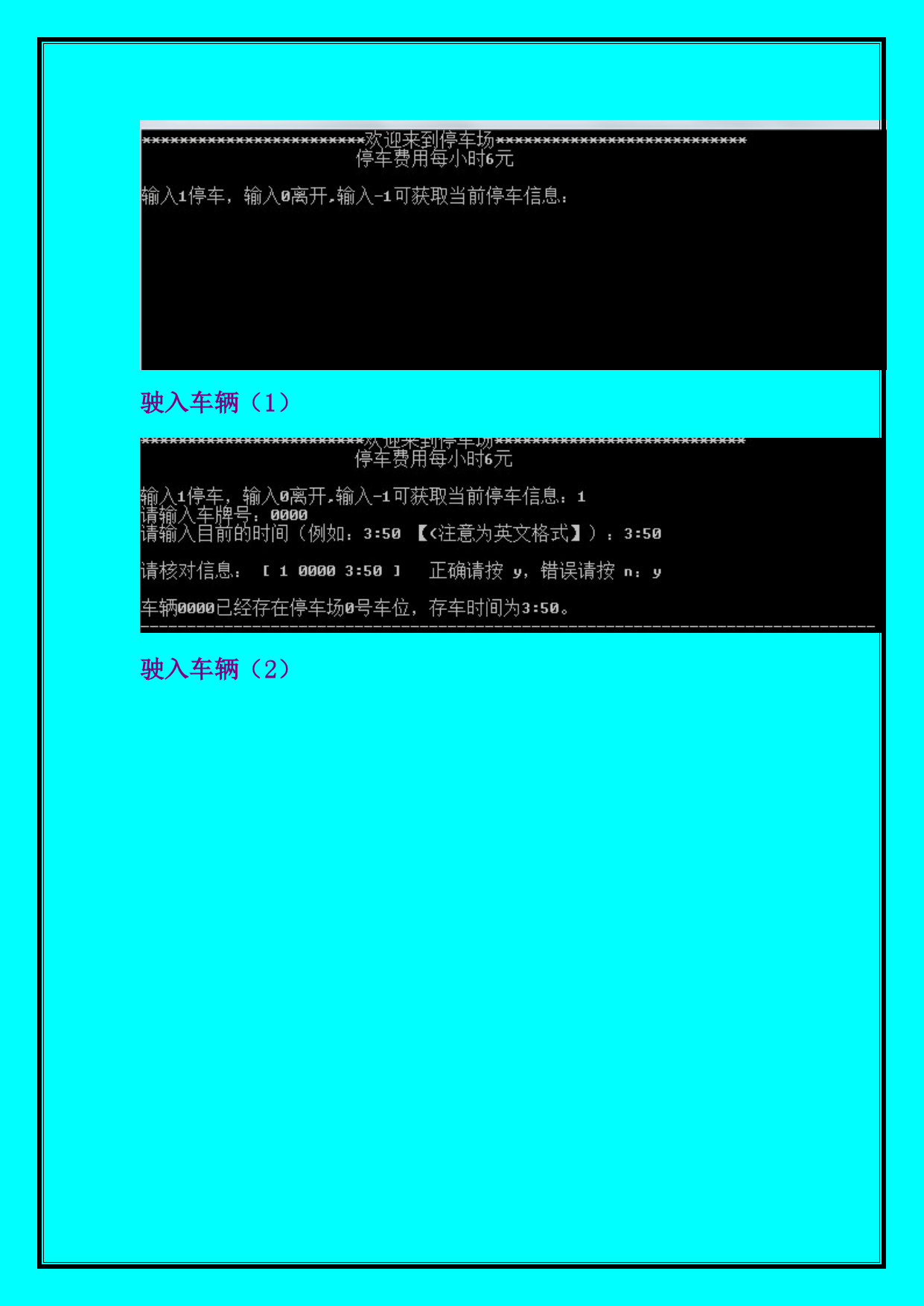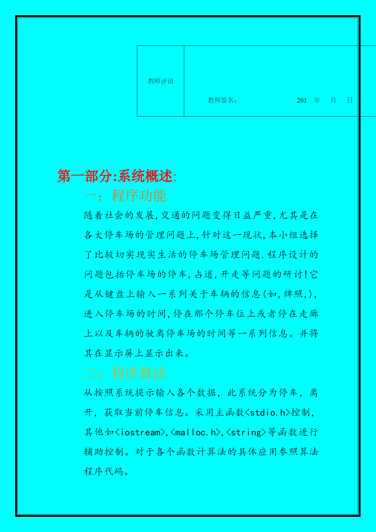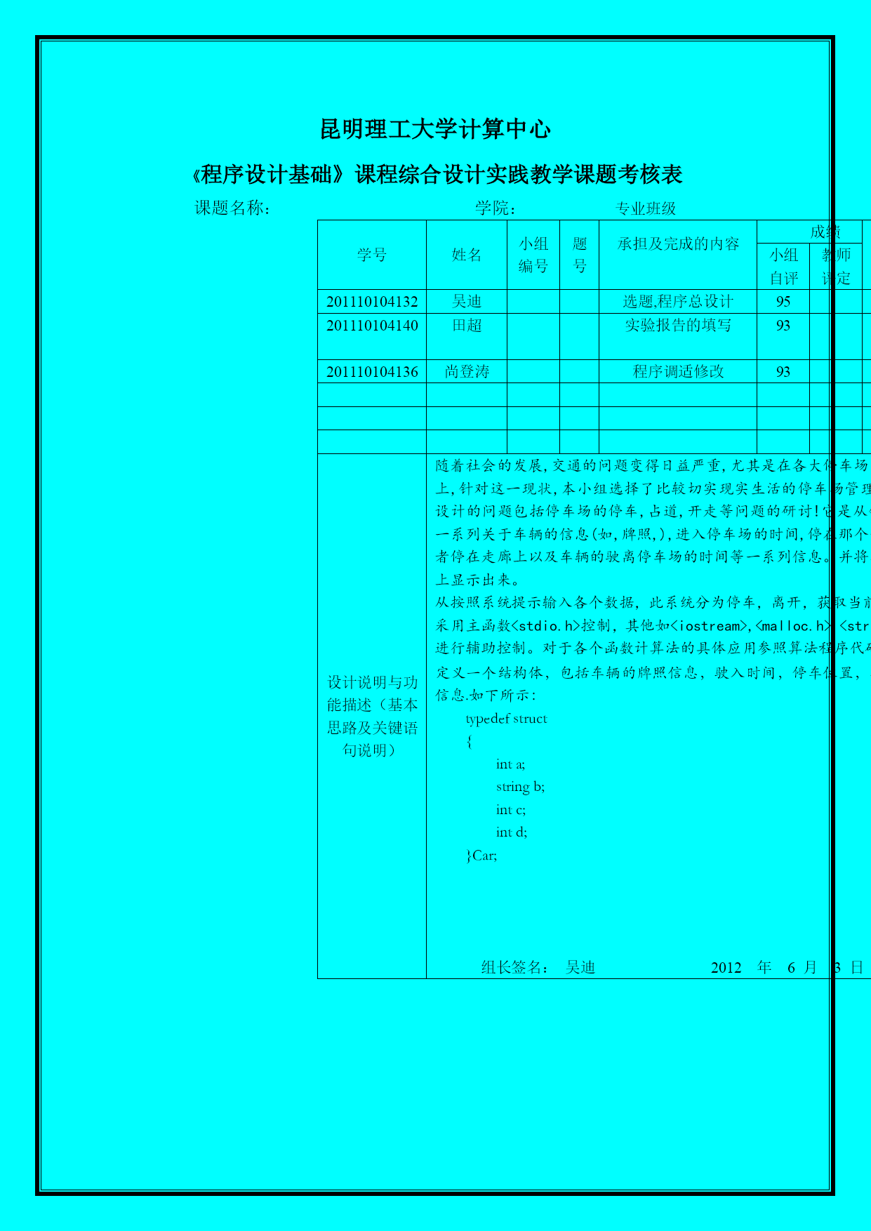 昆明理工大学《程序设计基础》课程综合设计实践教学课题报告课程名称:C语言课题名称:停车场停车及其收费问题组长:学号201110104132姓名吴迪组员:学号201110104136姓名尚登涛学号201110104140姓名田超学院:国土资源工程学院专业班级:采矿111指导教师:耿值林昆明理工大学计算中心2012年5月25日昆明理工大学计算中心《程序设计基础》课程综合设计实践教学课题考核表课题名称:学院:专业班级学号姓名小组编号题号承担及完成的内容成绩备注小组自评教师评定201110104132吴迪选题,程序总设计95201110104140田超实验报告的填写93201110104136尚登涛程序调适修改93设计说明与功能描述(基本思路及关键语句说明)随着社会的发展,交通的问题变得日益严重,尤其是在各大停车场的管理问题上,针对这一现状,本小组选择了比较切实现实生活的停车场管理问题.程序设计的问题包括停车场的停车,占道,开走等问题的研讨!它是从键盘上输入一系列关于车辆的信息(如,牌照,),进入停车场的时间,停在那个停车位上或者停在走廊上以及车辆的驶离停车场的时间等一系列信息。并将其在显示屏上显示出来。从按照系统提示输入各个数据,此系统分为停车,离开,获取当前停车信息。采用主函数<stdio.h>控制,其他如<iostream>,<malloc.h>,<string>等函数进行辅助控制。对于各个函数计算法的具体应用参照算法程序代码。定义一个结构体,包括车辆的牌照信息,驶入时间,停车位置,驶离时间等信息.如下所示:typedefstruct{inta;stringb;intc;intd;}Car;组长签名:吴迪2012年6月3日教师评语教师签名:201年月日第一部分:系统概述:一:程序功能随着社会的发展,交通的问题变得日益严重,尤其是在各大停车场的管理问题上,针对这一现状,本小组选择了比较切实现实生活的停车场管理问题.程序设计的问题包括停车场的停车,占道,开走等问题的研讨!它是从键盘上输入一系列关于车辆的信息(如,牌照,),进入停车场的时间,停在那个停车位上或者停在走廊上以及车辆的驶离停车场的时间等一系列信息。并将其在显示屏上显示出来。二:程序算法从按照系统提示输入各个数据,此系统分为停车,离开,获取当前停车信息。采用主函数<stdio.h>控制,其他如<iostream>,<malloc.h>,<string>等函数进行辅助控制。对于各个函数计算法的具体应用参照算法程序代码。第二部分数据结构体设计三:定义结构体定义一个结构体,包括车辆的牌照信息,驶入时间,停车位置,驶离时间等信息.如下所示:typedefstruct{inta;stringb;intc;intd;}Car;四:算法要求(1)要求以顺序栈模拟停车场,以链队列模拟便道。(2)从终端读入汽车到达或离去的数据,每组数据包括三项:①是“到达”还是“离去”;②汽车牌照号码;③“到达”或“离去”的时刻。与每组输入信息相应的输出信息为:如果是到达的车辆,则输出其在停车场中或便道上的位置;如果是离去的车辆,则输出其在停车场中停留的时间和应交的费五:函数定义定义了对个函数,以便于可以处理各种情况,并增强程序的健壮性,一边可以抵御可以遇到的非法输入。主流程示意图主函数入口↓用户可视化操作↓输入信息↓停车查询驶离↓输出信息(时间,费用)六:程序的操作性测试主界面:驶入车辆(1)驶入车辆(2)驶入车辆(3)由于此系统设计为了便于进行程序操作实验,所以,此停车场只有两个车位,进入的第三辆车只能停靠在便道上。驶离操作。此程序可以进行持续操作,所以退出系统只需关闭操作窗口。第四部分:总结和体会5、总结和体会重点写明本次设计以及该课程学习、应用过程中的收获和体会组长:通过本次的综合作业的程序设计,我们小组大家一起努力,反复调试,经过不断地改正错误的程序,终于调试出来了,心中充满了成就感,让我首次体会到了团队协作的力量,C语言这门课程起初真的很难学进去,看着一个个的字母,一个个的程序语言,感到头皮发麻,可是后来学进去了,其实还是挺有趣的,看着程序成功的运行,心中的喜悦感是别人无法体会的。通过这门课程我也收获到了很多,从开始看着天书一般的课本,到现在可以编出简单的程序了,我觉得这就是我的收获,这就是我这个学期学到的知识,这就是成功,这就是我不断努力地结果,一分耕耘一分收获,我相信只要努力,无论再难的事,我们也能成功。世上无难事只怕有心人!组员:我们在组长的带领下,在课余时间,三次一起来到计算