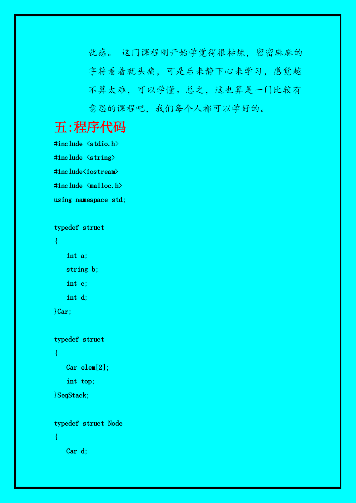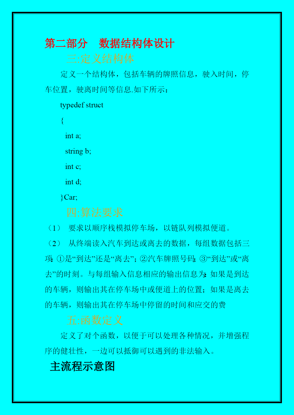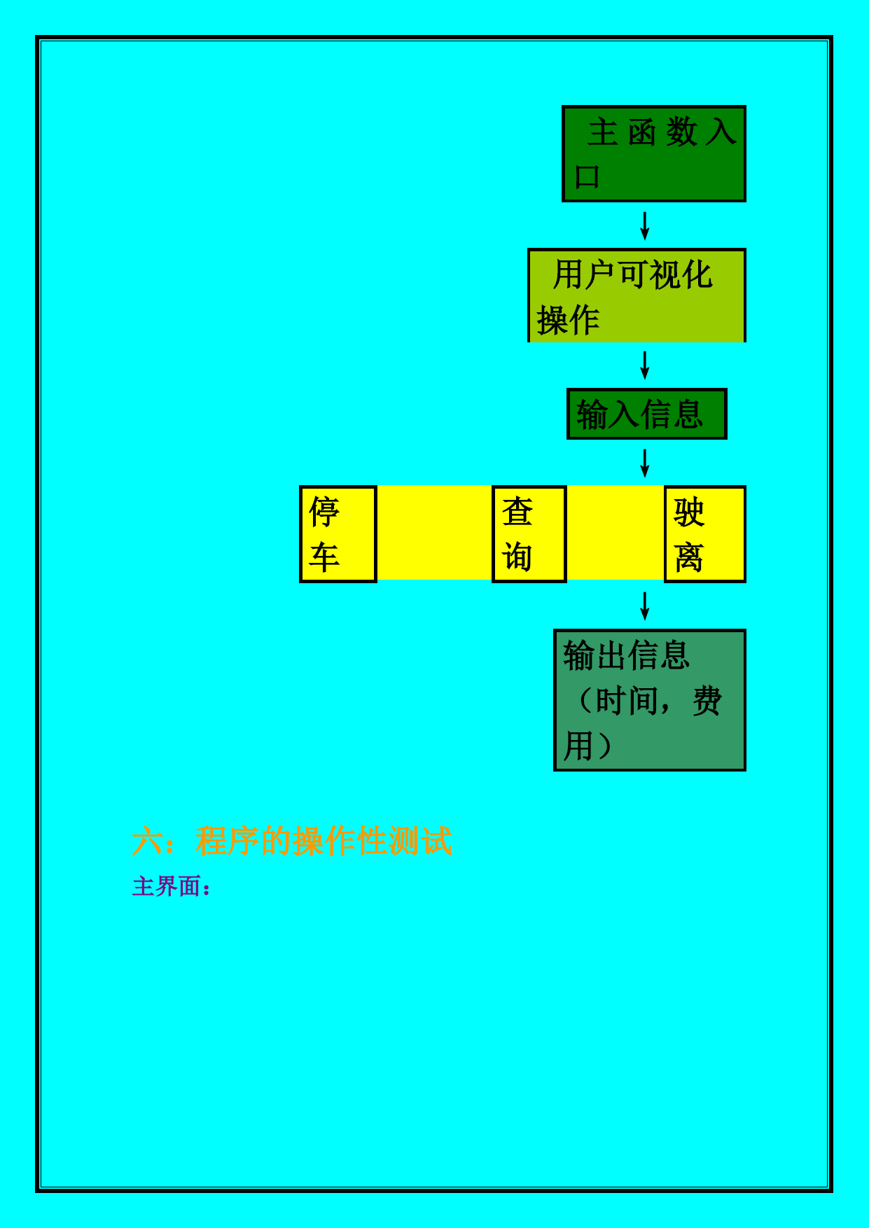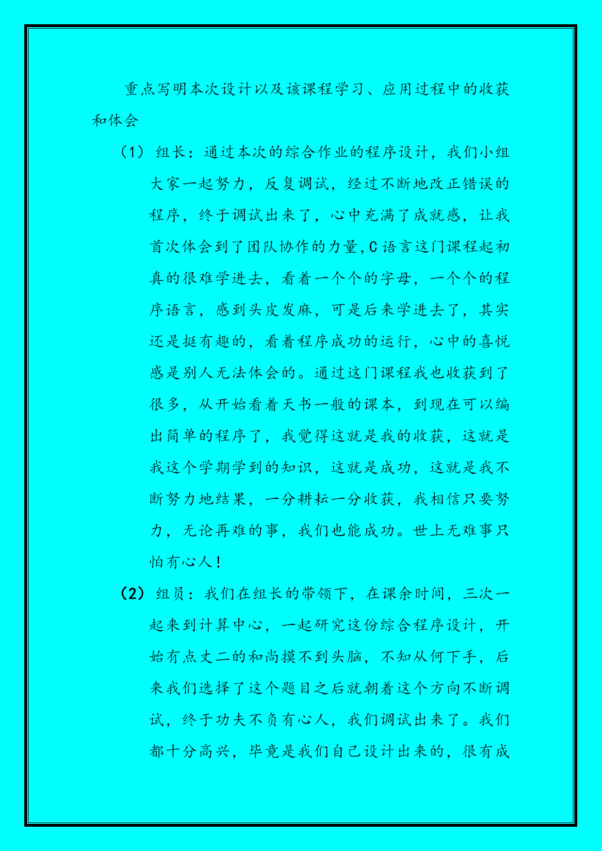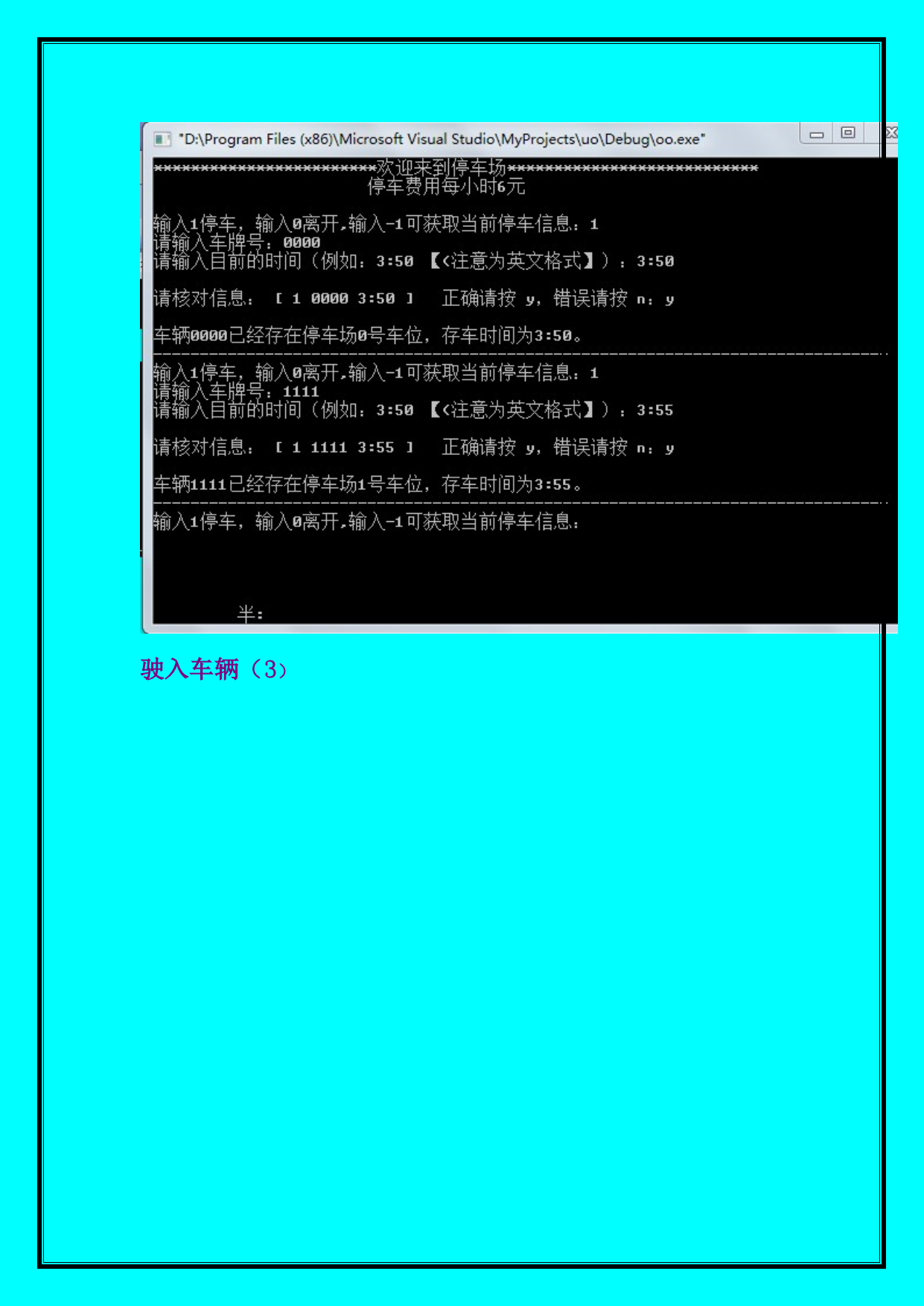 昆明理工大学《程序设计基础》课程综合设计实践教学课题报告课程名称:C语言课题名称:停车场停车及其收费问题组长:学号201110104132姓名吴迪组员:学号201110104136姓名尚登涛学号201110104140姓名田超学院:国土资源工程学院专业班级:采矿111指导教师:耿值林昆明理工大学计算中心2012年5月25日昆明理工大学计算中心《程序设计基础》课程综合设计实践教学课题考核表课题名称:学院:专业班级学号姓名小组编号题号承担及完成的内容成绩备注小组自评教师评定201110104132吴迪选题,程序总设计95201110104140田超实验报告的填写93201110104136尚登涛程序调适修改93设计说明与功能描述(基本思路及关键语句说明)随着社会的发展,交通的问题变得日益严重,尤其是在各大停车场的管理问题上,针对这一现状,本小组选择了比较切实现实生活的停车场管理问题.程序设计的问题包括停车场的停车,占道,开走等问题的研讨!它是从键盘上输入一系列关于车辆的信息(如,牌照,),进入停车场的时间,停在那个停车位上或者停在走廊上以及车辆的驶离停车场的时间等一系列信息。并将其在显示屏上显示出来。从按照系统提示输入各个数据,此系统分为停车,离开,获取当前停车信息。采用主函数<stdio.h>控制,其他如<iostream>,<malloc.h>,<string>等函数进行辅助控制。对于各个函数计算法的具体应用参照算法程序代码。定义一个结构体,包括车辆的牌照信息,驶入时间,停车位置,驶离时间等信息.如下所示:typedefstruct{inta;stringb;intc;intd;}Car;组长签名:吴迪2012年6月3日教师评语教师签名:201年月日第一部分:系统概述:一:程序功能随着社会的发展,交通的问题变得日益严重,尤其是在各大停车场的管理问题上,针对这一现状,本小组选择了比较切实现实生活的停车场管理问题.程序设计的问题包括停车场的停车,占道,开走等问题的研讨!它是从键盘上输入一系列关于车辆的信息(如,牌照,),进入停车场的时间,停在那个停车位上或者停在走廊上以及车辆的驶离停车场的时间等一系列信息。并将其在显示屏上显示出来。二:程序算法从按照系统提示输入各个数据,此系统分为停车,离开,获取当前停车信息。采用主函数<stdio.h>控制,其他如<iostream>,<malloc.h>,<string>等函数进行辅助控制。对于各个函数计算法的具体应用参照算法程序代码。第二部分数据结构体设计三:定义结构体定义一个结构体,包括车辆的牌照信息,驶入时间,停车位置,驶离时间等信息.如下所示:typedefstruct{inta;stringb;intc;intd;}Car;四:算法要求(1)要求以顺序栈模拟停车场,以链队列模拟便道。(2)从终端读入汽车到达或离去的数据,每组数据包括三项:①是“到达”还是“离去”;②汽车牌照号码;③“到达”或“离去”的时刻。与每组输入信息相应的输出信息为:如果是到达的车辆,则输出其在停车场中或便道上的位置;如果是离去的车辆,则输出其在停车场中停留的时间和应交的费五:函数定义定义了对个函数,以便于可以处理各种情况,并增强程序的健壮性,一边可以抵御可以遇到的非法输入。主流程示意图主函数入口↓用户可视化操作↓输入信息↓停车查询驶离↓输出信息(时间,费用)六:程序的操作性测试主界面:驶入车辆(1)驶入车辆(2)驶入车辆(3)由于此系统设计为了便于进行程序操作实验,所以,此停车场只有两个车位,进入的第三辆车只能停靠在便道上。驶离操作。此程序可以进行持续操作,所以退出系统只需关闭操作窗口。第四部分:总结和体会5、总结和体会重点写明本次设计以及该课程学习、应用过程中的收获和体会组长:通过本次的综合作业的程序设计,我们小组大家一起努力,反复调试,经过不断地改正错误的程序,终于调试出来了,心中充满了成就感,让我首次体会到了团队协作的力量,C语言这门课程起初真的很难学进去,看着一个个的字母,一个个的程序语言,感到头皮发麻,可是后来学进去了,其实还是挺有趣的,看着程序成功的运行,心中的喜悦感是别人无法体会的。通过这门课程我也收获到了很多,从开始看着天书一般的课本,到现在可以编出简单的程序了,我觉得这就是我的收获,这就是我这个学期学到的知识,这就是成功,这就是我不断努力地结果,一分耕耘一分收获,我相信只要努力,无论再难的事,我们也能成功。世上无难事只怕有心人!组员:我们在组长的带领下,在课余时间,三次一起来到计算