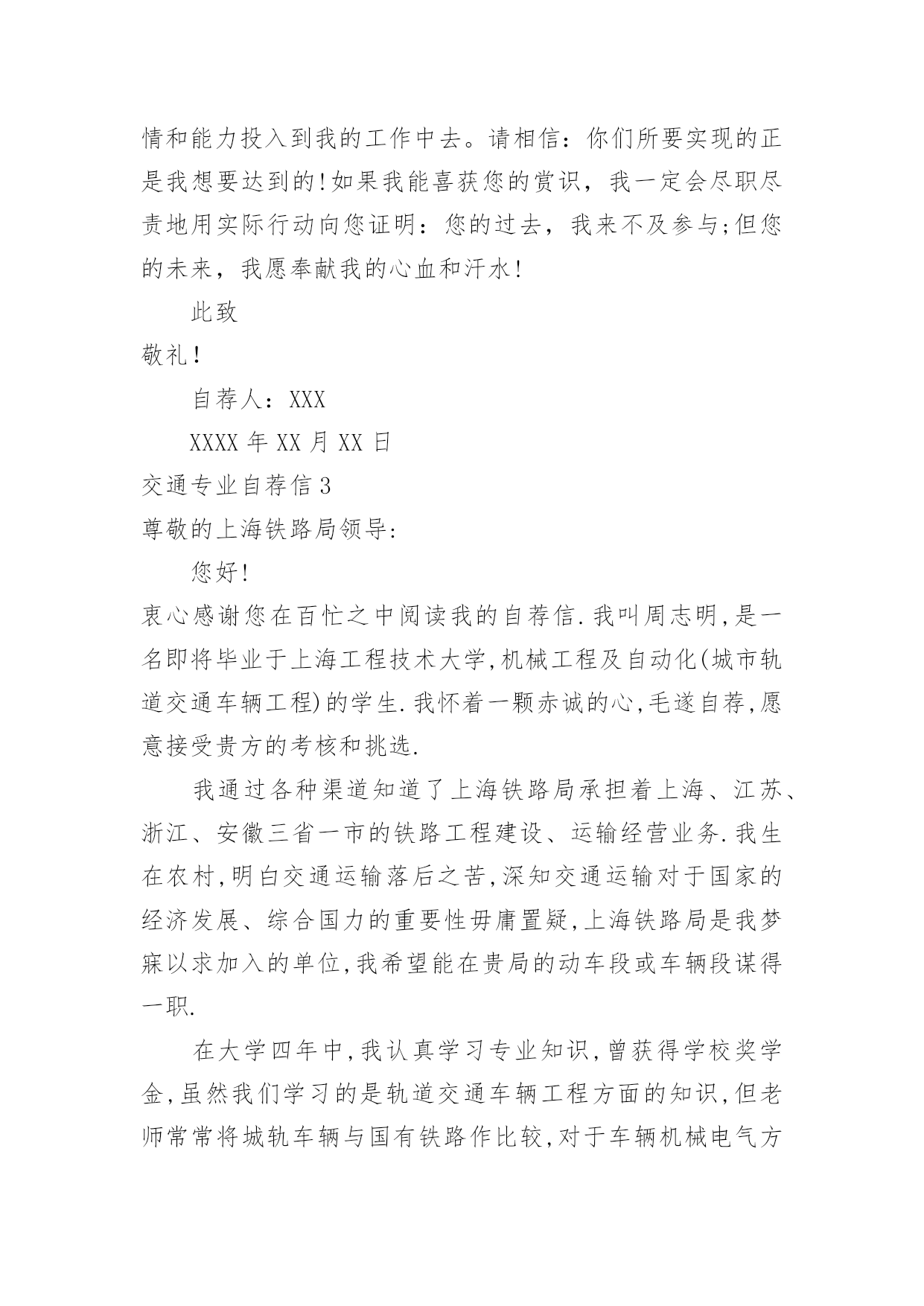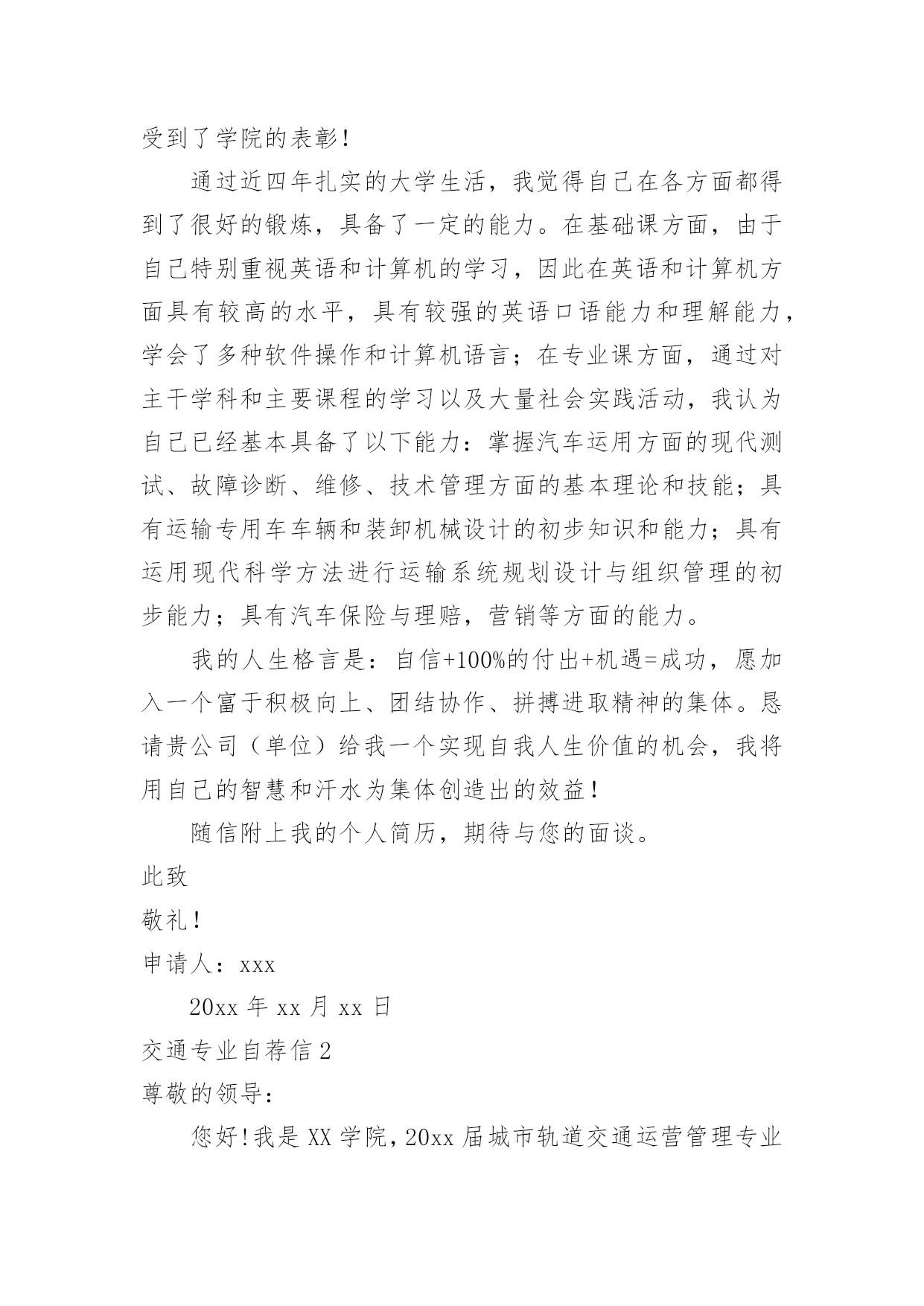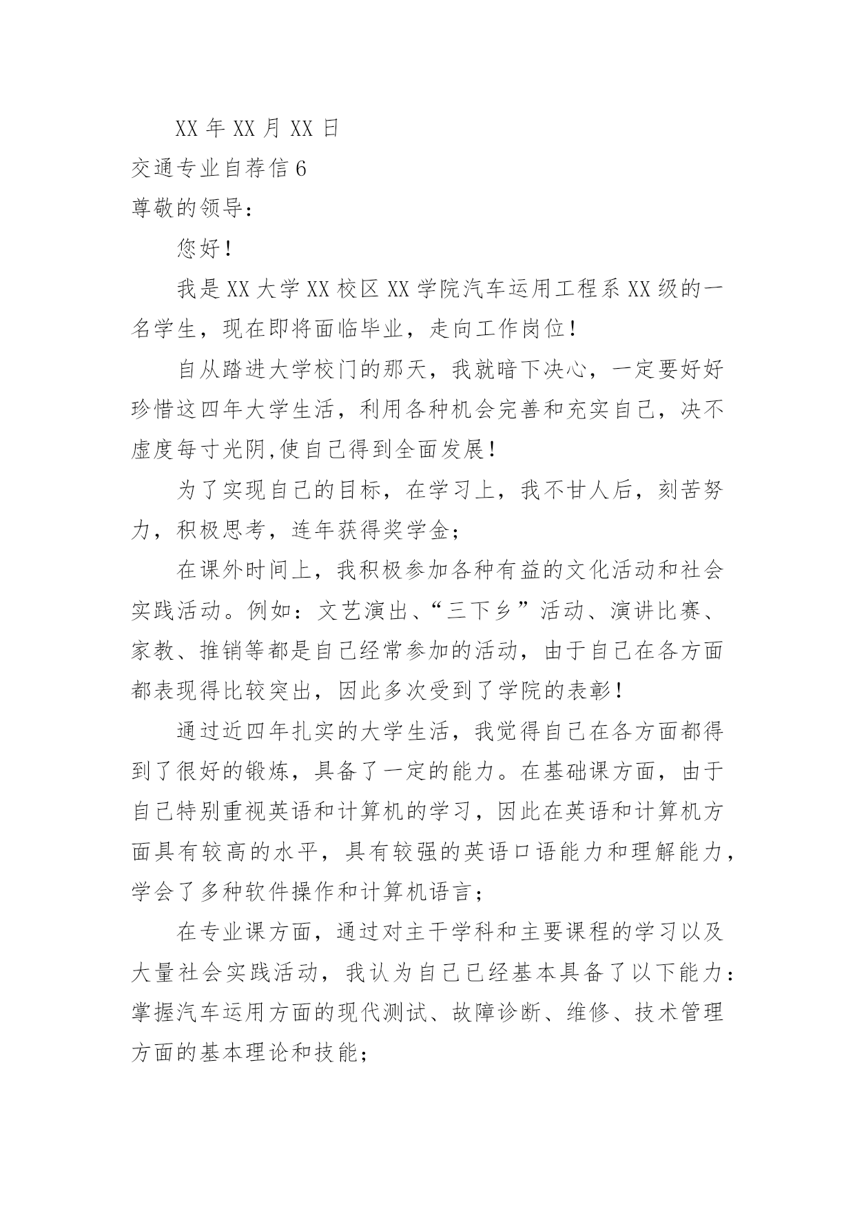交通专业自荐信交通专业自荐信在眼下市场经济活跃,人们的进取心不断增强的社会,我们都跟自荐信有着直接或间接的联系,写自荐信的时候要注意内容的完整。到底应如何写自荐信呢?下面是小编收集整理的交通专业自荐信,希望能够帮助到大家。交通专业自荐信1尊敬的领导:您好!我是XX大学XX校区XX学院汽车运用工程系XX级的一名学生,现在即将面临毕业,走向工作岗位!现知贵单位招聘,特拟此自荐信自荐。自从踏进大学校门的那天,我就暗下决心,一定要好好珍惜这四年大学生活,利用各种机会完善和充实自己,决不虚度每寸光阴,使自己得到全面发展!为了实现自己的目标,在学习上,我不甘人后,刻苦努力,积极思考,连年获得奖学金;在课外时间上,我积极参加各种有益的文化活动和社会实践活动。例如:文艺演出、“三下乡”活动、演讲比赛、家教、推销等都是自己经常参加的活动,由于自己在各方面都表现得比较突出,因此多次受到了学院的表彰!通过近四年扎实的大学生活,我觉得自己在各方面都得到了很好的锻炼,具备了一定的能力。在基础课方面,由于自己特别重视英语和计算机的学习,因此在英语和计算机方面具有较高的水平,具有较强的英语口语能力和理解能力,学会了多种软件操作和计算机语言;在专业课方面,通过对主干学科和主要课程的学习以及大量社会实践活动,我认为自己已经基本具备了以下能力:掌握汽车运用方面的现代测试、故障诊断、维修、技术管理方面的基本理论和技能;具有运输专用车车辆和装卸机械设计的初步知识和能力;具有运用现代科学方法进行运输系统规划设计与组织管理的初步能力;具有汽车保险与理赔,营销等方面的能力。我的人生格言是:自信+100%的付出+机遇=成功,愿加入一个富于积极向上、团结协作、拼搏进取精神的集体。恳请贵公司(单位)给我一个实现自我人生价值的机会,我将用自己的智慧和汗水为集体创造出的效益!随信附上我的个人简历,期待与您的面谈。此致敬礼!申请人:xxx20xx年xx月xx日交通专业自荐信2尊敬的领导:您好!我是XX学院,20xx届城市轨道交通运营管理专业的毕业生。珍贵的大学生活已接近尾声,感觉非常有必要总结一下大学生活的得失,从中继承做得好的方面改进不足的地方,使自己回顾走过的路,也更是为了看清将来要走的路。我觉得大学生的首要任务还是学好文化知识。虽然我的学习成绩不是非常好,但我却在学习的过程中收获了很多。首先是我端正了学习态度。在我考进大学时,脑子里想的是好好放松从重压下解放出来的自己,然而很快我就明白了,大学仍需努力认真的学习。看到周围的同学们拼命的学习,我也打消了初衷,开始大学的学习旅程。我认为学习是学生的职业,这份职业同样需要有智慧、毅力和恒心。在当今这个快速发展的信息时代,我们只有不断汲取新知识,才不会落伍。大学校园就是一个大家庭。在这个大家庭中,我们扮演着被培养对象的角色。老师是我们的长辈,所以我对他们尊敬有加。同学们就像兄弟,我们一起学习,一起娱乐,互帮互助,和睦的相处。集体生活使我懂得了要主动去体谅别人和关心别人,也使我变得更加坚强和独立。我觉得自己的事情就应该由自己负责,别人最多只能给你一些建议。遇到事情要冷静地思考,不要急躁。不轻易的承诺,承诺了就要努力去兑现。生活需要自己来勾画,不一样的方式就有不一样的人生。作为一名大学应届毕业生,我所拥有的是年轻和知识。年轻也许意味着欠缺经验,但是年轻也意味着热情和活力。恕冒昧,如果我能成为贵公司的一员,我定当用我的热情和能力投入到我的工作中去。请相信:你们所要实现的正是我想要达到的!如果我能喜获您的赏识,我一定会尽职尽责地用实际行动向您证明:您的过去,我来不及参与;但您的未来,我愿奉献我的心血和汗水!此致敬礼!自荐人:XXXXXXX年XX月XX日交通专业自荐信3尊敬的上海铁路局领导:您好!衷心感谢您在百忙之中阅读我的自荐信.我叫周志明,是一名即将毕业于上海工程技术大学,机械工程及自动化(城市轨道交通车辆工程)的学生.我怀着一颗赤诚的心,毛遂自荐,愿意接受贵方的考核和挑选.我通过各种渠道知道了上海铁路局承担着上海、江苏、浙江、安徽三省一市的铁路工程建设、运输经营业务.我生在农村,明白交通运输落后之苦,深知交通运输对于国家的经济发展、综合国力的重要性毋庸置疑,上海铁路局是我梦寐以求加入的单位,我希望能在贵局的动车段或车辆段谋得一职.在大学四年中,我认真学习专业知识,曾获得学校奖学金,虽然我们学习的是轨道交通车辆工程方面的知识,但老师常常将城轨车辆与国有铁路作比较,对于车辆机械电气方面的知识,我有了较系统的认识.制造技术实习、电工实习以及实验课锻炼了我的动手思考能力,城市轨道交通基础实习、认识实习让我学会了将实践与理论相结合.与此同时,我学习计算机辅助设计软件,熟悉autocad、ug,努力掌握计算机知识.在课余生活中,我积极参与体育活动,