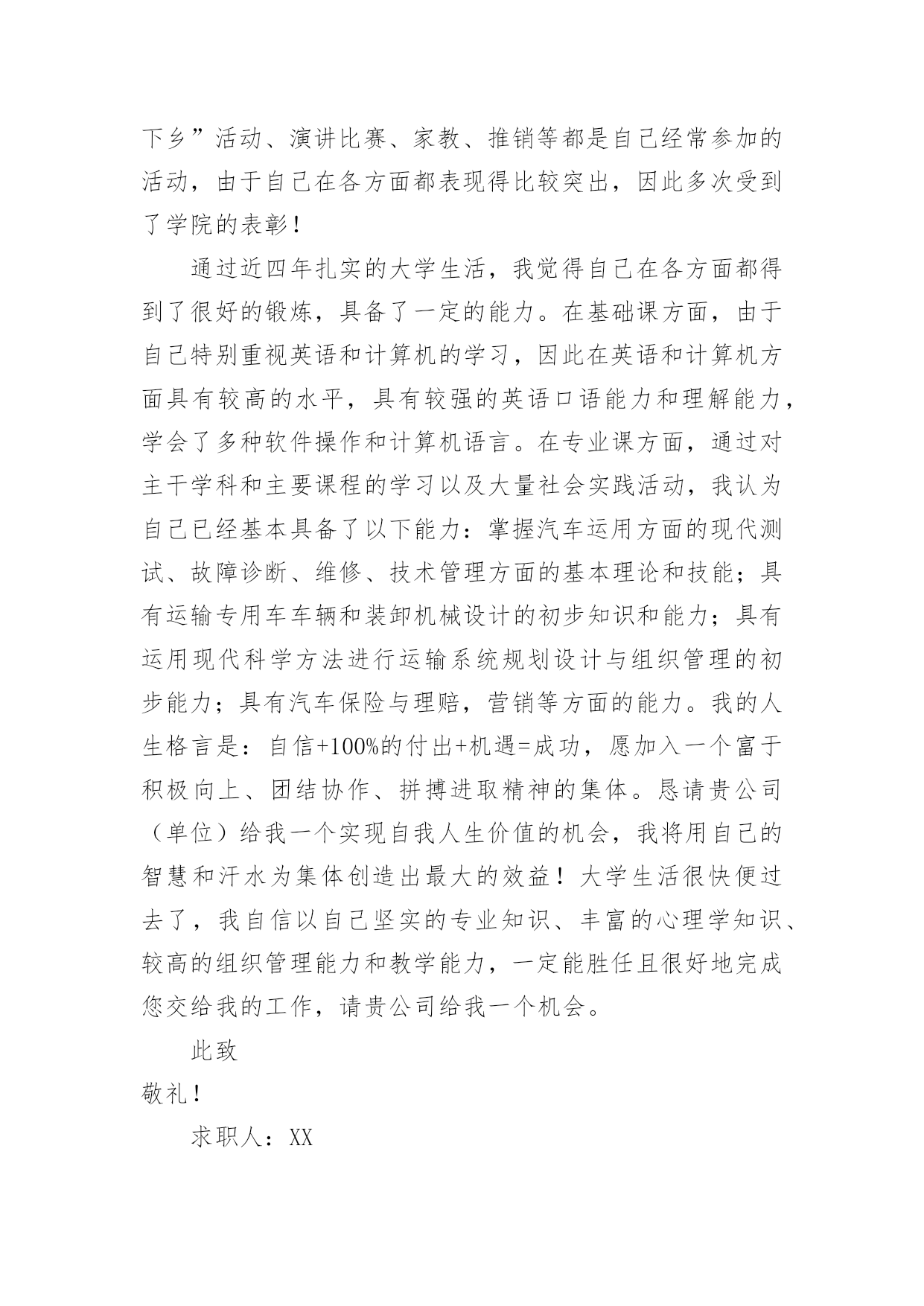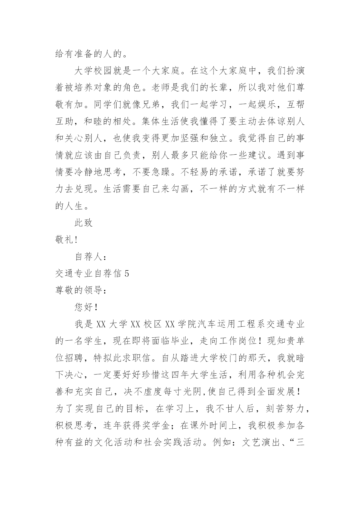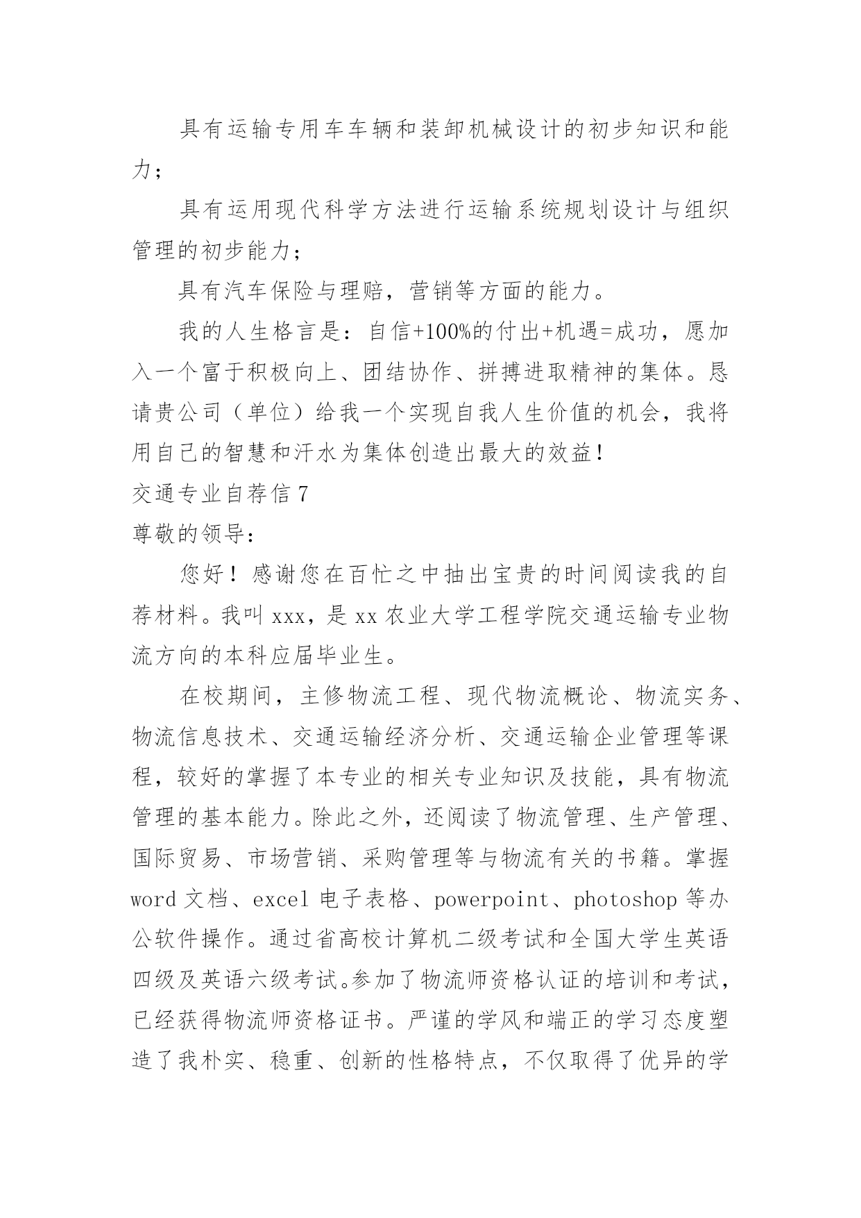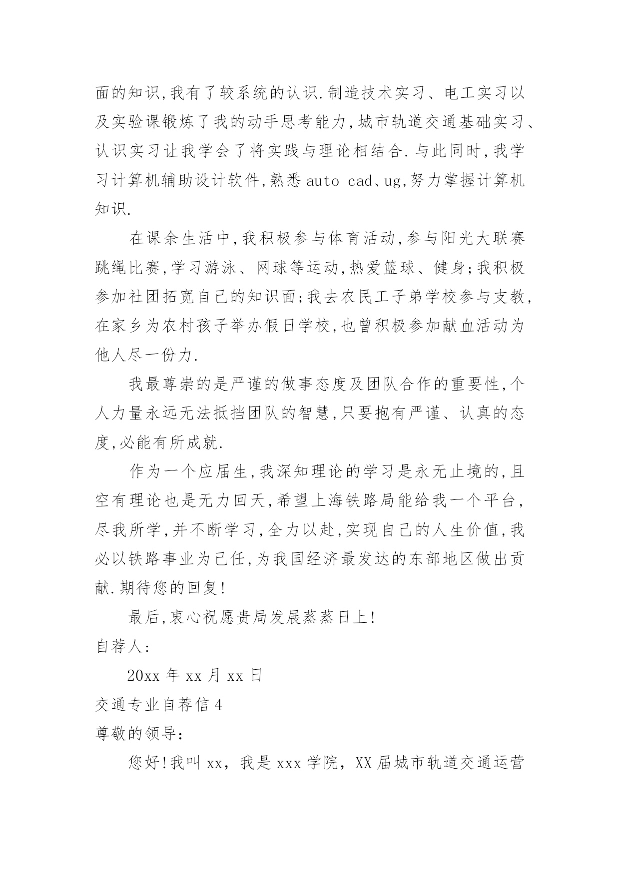 交通专业自荐信交通专业自荐信在眼下市场经济活跃,人们的进取心不断增强的社会,我们都跟自荐信有着直接或间接的联系,写自荐信的时候要注意内容的完整。到底应如何写自荐信呢?下面是小编收集整理的交通专业自荐信,希望能够帮助到大家。交通专业自荐信1尊敬的领导:您好!我是XX大学XX校区XX学院汽车运用工程系XX级的一名学生,现在即将面临毕业,走向工作岗位!现知贵单位招聘,特拟此自荐信自荐。自从踏进大学校门的那天,我就暗下决心,一定要好好珍惜这四年大学生活,利用各种机会完善和充实自己,决不虚度每寸光阴,使自己得到全面发展!为了实现自己的目标,在学习上,我不甘人后,刻苦努力,积极思考,连年获得奖学金;在课外时间上,我积极参加各种有益的文化活动和社会实践活动。例如:文艺演出、“三下乡”活动、演讲比赛、家教、推销等都是自己经常参加的活动,由于自己在各方面都表现得比较突出,因此多次受到了学院的表彰!通过近四年扎实的大学生活,我觉得自己在各方面都得到了很好的锻炼,具备了一定的能力。在基础课方面,由于自己特别重视英语和计算机的学习,因此在英语和计算机方面具有较高的水平,具有较强的英语口语能力和理解能力,学会了多种软件操作和计算机语言;在专业课方面,通过对主干学科和主要课程的学习以及大量社会实践活动,我认为自己已经基本具备了以下能力:掌握汽车运用方面的现代测试、故障诊断、维修、技术管理方面的基本理论和技能;具有运输专用车车辆和装卸机械设计的初步知识和能力;具有运用现代科学方法进行运输系统规划设计与组织管理的初步能力;具有汽车保险与理赔,营销等方面的能力。我的人生格言是:自信+100%的付出+机遇=成功,愿加入一个富于积极向上、团结协作、拼搏进取精神的集体。恳请贵公司(单位)给我一个实现自我人生价值的机会,我将用自己的智慧和汗水为集体创造出的效益!随信附上我的个人简历,期待与您的面谈。此致敬礼!申请人:xxx20xx年xx月xx日交通专业自荐信2尊敬的领导:您好!我是XX学院,20xx届城市轨道交通运营管理专业的毕业生。珍贵的大学生活已接近尾声,感觉非常有必要总结一下大学生活的得失,从中继承做得好的方面改进不足的地方,使自己回顾走过的路,也更是为了看清将来要走的路。我觉得大学生的首要任务还是学好文化知识。虽然我的学习成绩不是非常好,但我却在学习的过程中收获了很多。首先是我端正了学习态度。在我考进大学时,脑子里想的是好好放松从重压下解放出来的自己,然而很快我就明白了,大学仍需努力认真的学习。看到周围的同学们拼命的学习,我也打消了初衷,开始大学的学习旅程。我认为学习是学生的职业,这份职业同样需要有智慧、毅力和恒心。在当今这个快速发展的信息时代,我们只有不断汲取新知识,才不会落伍。大学校园就是一个大家庭。在这个大家庭中,我们扮演着被培养对象的角色。老师是我们的长辈,所以我对他们尊敬有加。同学们就像兄弟,我们一起学习,一起娱乐,互帮互助,和睦的相处。集体生活使我懂得了要主动去体谅别人和关心别人,也使我变得更加坚强和独立。我觉得自己的事情就应该由自己负责,别人最多只能给你一些建议。遇到事情要冷静地思考,不要急躁。不轻易的承诺,承诺了就要努力去兑现。生活需要自己来勾画,不一样的方式就有不一样的人生。作为一名大学应届毕业生,我所拥有的是年轻和知识。年轻也许意味着欠缺经验,但是年轻也意味着热情和活力。恕冒昧,如果我能成为贵公司的一员,我定当用我的热情和能力投入到我的工作中去。请相信:你们所要实现的正是我想要达到的!如果我能喜获您的赏识,我一定会尽职尽责地用实际行动向您证明:您的过去,我来不及参与;但您的未来,我愿奉献我的心血和汗水!此致敬礼!自荐人:XXXXXXX年XX月XX日交通专业自荐信3尊敬的上海铁路局领导:您好!衷心感谢您在百忙之中阅读我的自荐信.我叫周志明,是一名即将毕业于上海工程技术大学,机械工程及自动化(城市轨道交通车辆工程)的学生.我怀着一颗赤诚的心,毛遂自荐,愿意接受贵方的考核和挑选.我通过各种渠道知道了上海铁路局承担着上海、江苏、浙江、安徽三省一市的铁路工程建设、运输经营业务.我生在农村,明白交通运输落后之苦,深知交通运输对于国家的经济发展、综合国力的重要性毋庸置疑,上海铁路局是我梦寐以求加入的单位,我希望能在贵局的动车段或车辆段谋得一职.在大学四年中,我认真学习专业知识,曾获得学校奖学金,虽然我们学习的是轨道交通车辆工程方面的知识,但老师常常将城轨车辆与国有铁路作比较,对于车辆机械电气方面的知识,我有了较系统的认识.制造技术实习、电工实习以及实验课锻炼了我的动手思考能力,城市轨道交通基础实习、认识实习让我学会了将实践与理论相结合.与此同时,我学习计算机辅助设计软件,熟悉autocad、ug,努力掌握计算机知识.在课余生活中,我积极参与体育活动,