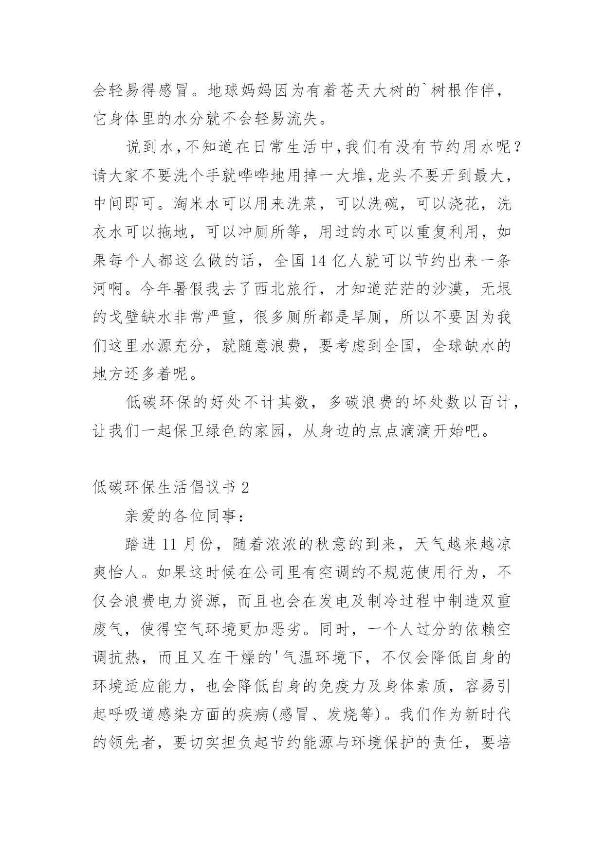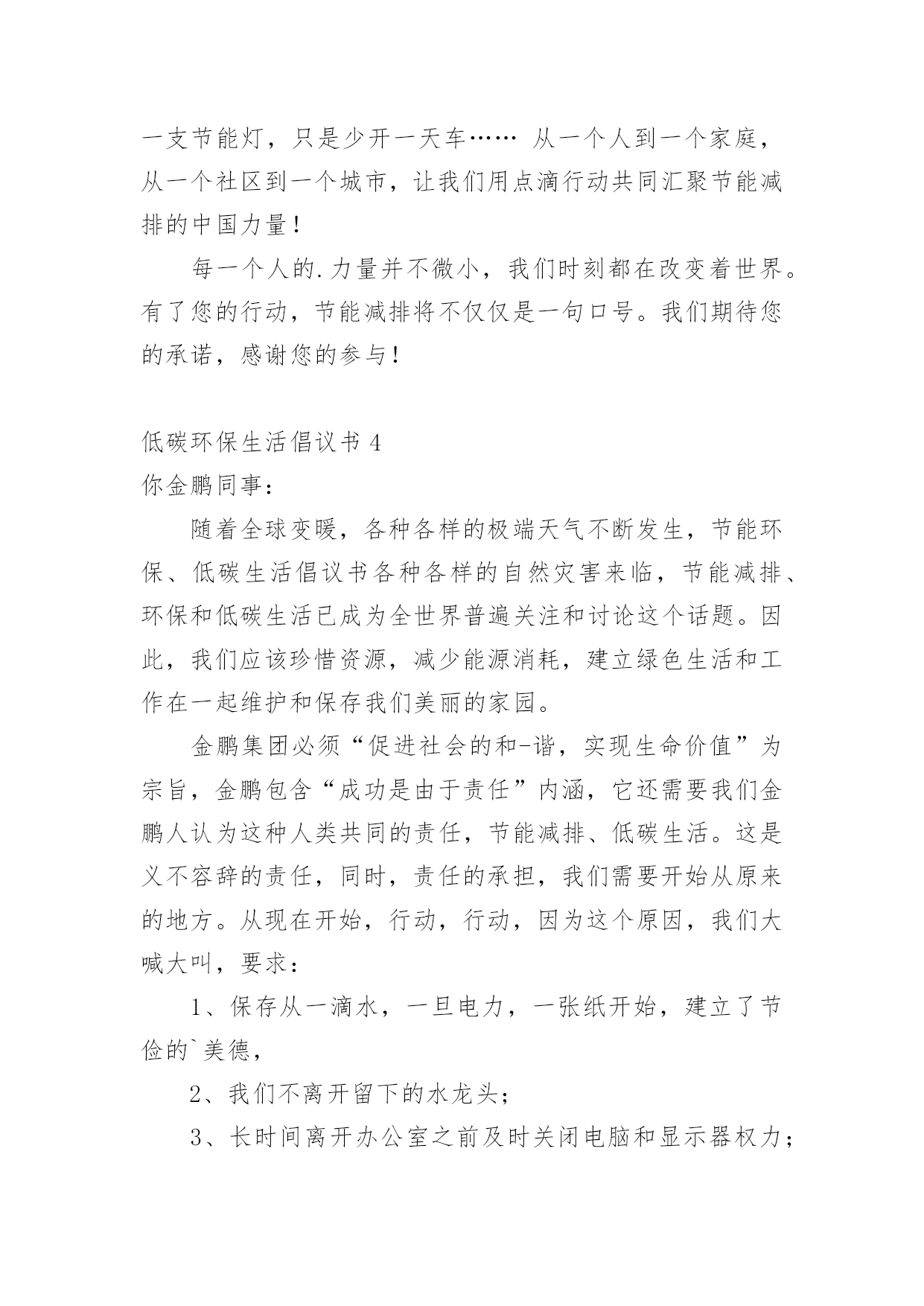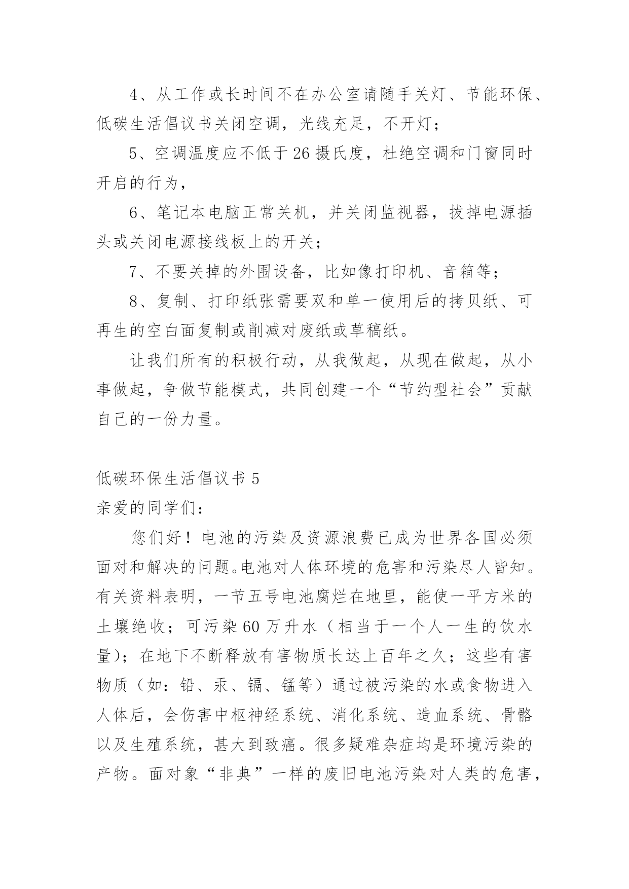 低碳环保生活倡议书低碳环保生活倡议书低碳环保生活倡议书1汽车尾气,人类和动物呼出的气,烧煤的气和雾在一起变成了讨厌的雾霾。不仅让地球母亲感冒,还让人们的身体被病毒入侵,这可怎么办?没有办法,开启低碳环保生活吧。“女儿,咱们开车去玩吧。”爸爸一脸兴奋地说。“no,no,no.那地方不远,咱们还是走路比较好,这样又锻炼身体,又防止汽车尾气污染空气。”“嗯,嗯,女儿的提议很好,说得很有道理。那咱们就走路吧。”“嗯。”我笑着回答。就这样,本来开车八分钟的路程,我们一路说着,笑着走过来了。汽油也省了,环境也保护了,身体也锻炼了,亲子时间也多了,一举几得,何乐而不为呢?另外发电,我们尽量放弃用煤.风车发电,太阳能发电多好,因为烧煤,煤释放出来大量的污染,让我们生活在灰尘中,为了见到蓝天白云,为了不让地球蒙上一层灰尘,请尽量不要烧煤。这几年来,地球妈妈的感冒越来越严重,它经常咳嗽,经常散发出难闻的味道,经常眼睛蒙蒙地看不清楚远方。那如何才让让地球妈妈感冒好起来呢?对的,植树,绿化环境。大家都来种树,一人种一棵树,14亿棵翠绿的参天大树在几年后就会傲立在全国各地,地球母亲因为身着绿衣裳,就不会轻易得感冒。地球妈妈因为有着苍天大树的`树根作伴,它身体里的水分就不会轻易流失。说到水,不知道在日常生活中,我们有没有节约用水呢?请大家不要洗个手就哗哗地用掉一大堆,龙头不要开到最大,中间即可。淘米水可以用来洗菜,可以洗碗,可以浇花,洗衣水可以拖地,可以冲厕所等,用过的水可以重复利用,如果每个人都这么做的话,全国14亿人就可以节约出来一条河啊。今年暑假我去了西北旅行,才知道茫茫的沙漠,无垠的戈壁缺水非常严重,很多厕所都是旱厕,所以不要因为我们这里水源充分,就随意浪费,要考虑到全国,全球缺水的地方还多着呢。低碳环保的好处不计其数,多碳浪费的坏处数以百计,让我们一起保卫绿色的家园,从身边的点点滴滴开始吧。低碳环保生活倡议书2亲爱的各位同事:踏进11月份,随着浓浓的秋意的到来,天气越来越凉爽怡人。如果这时候在公司里有空调的不规范使用行为,不仅会浪费电力资源,而且也会在发电及制冷过程中制造双重废气,使得空气环境更加恶劣。同时,一个人过分的依赖空调抗热,而且又在干燥的'气温环境下,不仅会降低自身的环境适应能力,也会降低自身的免疫力及身体素质,容易引起呼吸道感染方面的疾病(感冒、发烧等)。我们作为新时代的领先者,要切实担负起节约能源与环境保护的责任,要培养良好的社会公德,同时也要提高自身身体素质。国家出台的环保标准中空调使用的温度范围应该为0度及0度以下、30度及30度以上。鉴于现时天气已经比较适宜,我们提倡从11月1日开始,公司空调制冷功能严格停止使用。客服部办公室由于没有窗户,可以开启空调的换气功能,其他办公区域全部停止使用空调。办公期间,大家都把窗户打开,呼吸新鲜空气,充分与大自然接触!勤俭节约是中华民族的传统美德,节约能源、节约用电是每一位公民的社会责任。在创建节约型社会的今天,我们真诚的希望每一位员工积极行动起来,齐心协力、统一思想,从身边小事做起,提倡节能环保,低碳新生活,节约每一度电,共同为公司的建设发展尽最大努力!行政人事部20xx年11月1日低碳环保生活倡议书3从今天开始,让我们尽量选乘公交出行;从今天开始,让我们选用高效节能家电;从今天开始,让我们珍惜宝贵的水资源;……——节能减排我承诺,中国行动有力量!为了我们拥有更健康的生活环境,为了经济社会的可持续发展,让我们一起行动起来,参与“节能减排我承诺”,以自己的实际行动来减少浪费,实现资源、能源的合理使用和高效利用。请您在这里写上您的节能承诺,那怕只是换上一支节能灯,只是少开一天车……从一个人到一个家庭,从一个社区到一个城市,让我们用点滴行动共同汇聚节能减排的中国力量!每一个人的.力量并不微小,我们时刻都在改变着世界。有了您的行动,节能减排将不仅仅是一句口号。我们期待您的承诺,感谢您的参与!低碳环保生活倡议书4你金鹏同事:随着全球变暖,各种各样的极端天气不断发生,节能环保、低碳生活倡议书各种各样的自然灾害来临,节能减排、环保和低碳生活已成为全世界普遍关注和讨论这个话题。因此,我们应该珍惜资源,减少能源消耗,建立绿色生活和工作在一起维护和保存我们美丽的家园。金鹏集团必须“促进社会的和-谐,实现生命价值”为宗旨,金鹏包含“成功是由于责任”内涵,它还需要我们金鹏人认为这种人类共同的责任,节能减排、低碳生活。这是义不容辞的责任,同时,责任的承担,我们需要开始从原来的地方。从现在开始,行动,行动,因为这个原因,我们大喊大叫,要求:1、保存从一滴水,一旦电力,一张纸开始,建立了节俭的`美德,2、我们不离开留下的水龙头;3、长时间离开办公室之前及时关闭电脑和显示器权力;4、从工作或长时间不在办公室请随手关灯