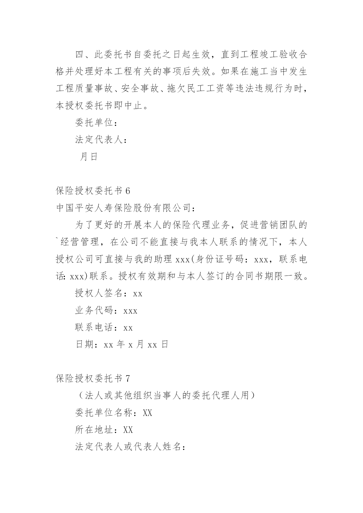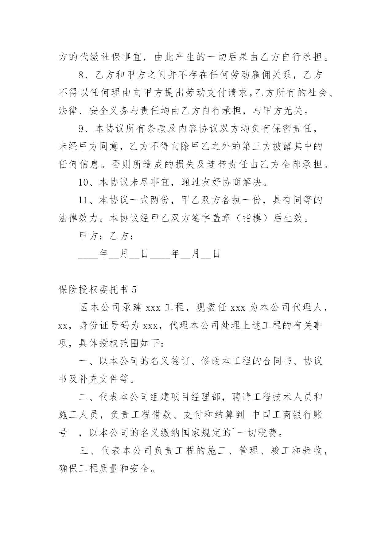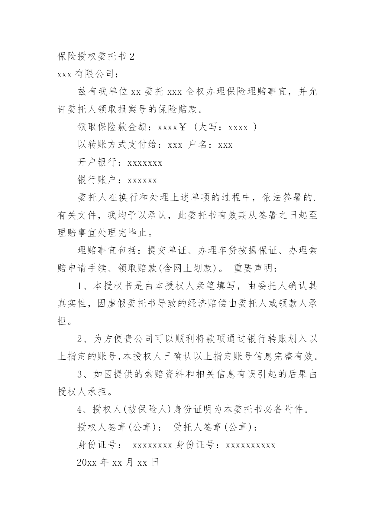 保险授权委托书被委托人如果没有做出违背国家法律的任何权益,被委托人在行使权力时委托人不得以任何理由反悔委托事项。在日常生活中,委托书在处理事务上使用的情况越来越多,为了让您在写委托书时更加简单方便,以下是小编整理的保险授权委托书,欢迎阅读,希望大家能够喜欢。保险授权委托书1委托人:xxx性别:xxx身份证号码:xxxxxxxxxxxx受托人:xx性别:x身份证号码:xxxxxxxxxxxxx本人马希武有房屋壹处,该房屋坐落在解放路75号(市民贸购物中心一单元401室),《房屋所有权证》编号为xxxxxx号,建筑面积100.59平方米。本人因在外地出差,不能亲自来办理上述房屋的过户手续,特委托代为办理。受托人在办理上述事宜过程中所签署的相关文件,我均予以认可。被委托人:xxxxx年xx月xx日保险授权委托书2xxx有限公司:兹有我单位xx委托xxx全权办理保险理赔事宜,并允许委托人领取报案号的保险赔款。领取保险款金额:xxxx¥(大写:xxxx)以转账方式支付给:xxx户名:xxx开户银行:xxxxxxx银行账户:xxxxxx委托人在换行和处理上述单项的过程中,依法签署的.有关文件,我均予以承认,此委托书有效期从签署之日起至理赔事宜处理完毕止。理赔事宜包括:提交单证、办理车贷按揭保证、办理索赔申请手续、领取赔款(含网上划款)。重要声明:1、本授权书是由本授权人亲笔填写,由委托人确认其真实性,因虚假委托书导致的经济赔偿由委托人或领款人承担。2、为方便贵公司可以顺利将款项通过银行转账划入以上指定的账号,本授权人已确认以上指定账号信息完整有效。3、如因提供的索赔资料和相关信息有误引起的后果由授权人承担。4、授权人(被保险人)身份证明为本委托书必备附件。授权人签章(公章):受托人签章(公章):身份证号:xxxxxxxx身份证号:xxxxxxxxxx20xx年xx月xx日保险授权委托书3委托人:XX身份证号:XX被委托人:XX身份证号:XX委托事项:XXXX委托权限:1.XXXXX2.XXXXX委托时限:自XX年XX月X日至XX年XX月XX日备注:本委托书一式三份。签字生效。委托人签名:XX委托人电话:XX被委托人签名:XX被委托人电话:XX委托日期:XXXX年XX月XX日附件:1.委托人身份证复印件2.被委托人身份证复印件保险授权委托书4甲方:_____限责任公司乙方:身份证号码:住址:联系电话:因乙方没有固定工作,现乙方向甲方提出,希望由甲方代其缴纳养老保险费,缴费基数为上年度四川省在岗职工平均工资的60%,企业和个人负担的社保保险费用以及由此产生的所有费用均由乙方个人全额负担,甲、乙双方不存在任何形式的劳动关系以及其他任何责任。乙方应当每月以现金方式交付甲方代缴的`养老保险费用,否则甲方有权终止为乙方代为缴纳,无论甲方事先有无通知乙方,由此产生的法律后果由乙方自行承担,乙方承诺放弃向甲方主张任何经济索赔等权利。经双方协商一致,达成如下协议:1、自年月开始,甲方为乙方代缴养老保险费用,缴费基数为上年度四川省在岗职工平均工资的60%。2、若乙方没有书面通知甲方其与任何企业、个体工商户、社会团体等建立劳动关系,视为乙方一直处于无固定工作状态。3、若乙方与第三方建立劳动关系,最迟应在建立劳动关系后5个工作日内通知甲方,由甲方为其办理养老保险终止缴费手续,否则由此产生的一切法律后果由乙方自行承担。4、甲方代乙方缴纳养老保险费用,甲方所代缴的全部费用由乙方个人承担,包括公司与个人缴纳款。5、甲方在为乙方代缴社保时,乙方应提前向甲方提供所需资料,自行办理转移手续,并承担其他相关费用。6、乙方支付方式:在甲方代缴之前,每月提前五天一次性支付完毕当月的所有费用。7、乙方如未按期支付社保费用,甲方有权停止办理乙方的代缴社保事宜,由此产生的一切后果由乙方自行承担。8、乙方和甲方之间并不存在任何劳动雇佣关系,乙方不得以任何理由向甲方提出劳动支付请求,乙方所有的社会、法律、安全义务与责任均由乙方自行承担,与甲方无关。9、本协议所有条款及内容协议双方均负有保密责任,未经甲方同意,乙方不得向除甲乙之外的第三方披露其中的任何信息。否则所造成的损失及连带责任由乙方全部承担。10、本协议未尽事宜,通过友好协商解决。11、本协议一式两份,甲乙双方各执一份,具有同等的法律效力。本协议经甲乙双方签字盖章(指模)后生效。甲方:乙方:____年__月__日____年__月__日保险授权委托书5因本公司承建xxx工程,现委任xxx为本公司代理人,xx,身份证号码为xxx,代理本公司处理上述工程的有关事项,具体授权范围如下:一、以本公司的名义签订、修改本工程的合同书、协议书及补充文件等。二、代表本公司组建项目经理部,聘请工程技术人员和施工人员,负责工程借款、支付和结算到中国工商