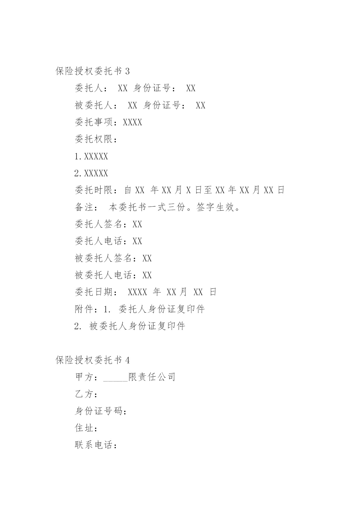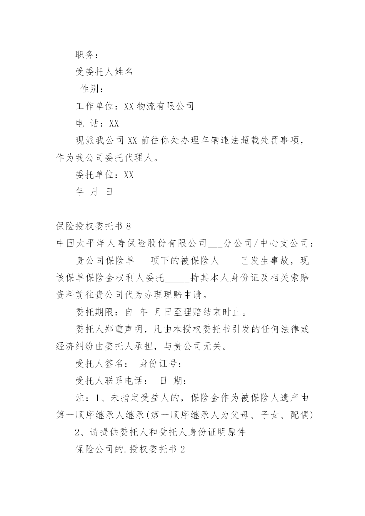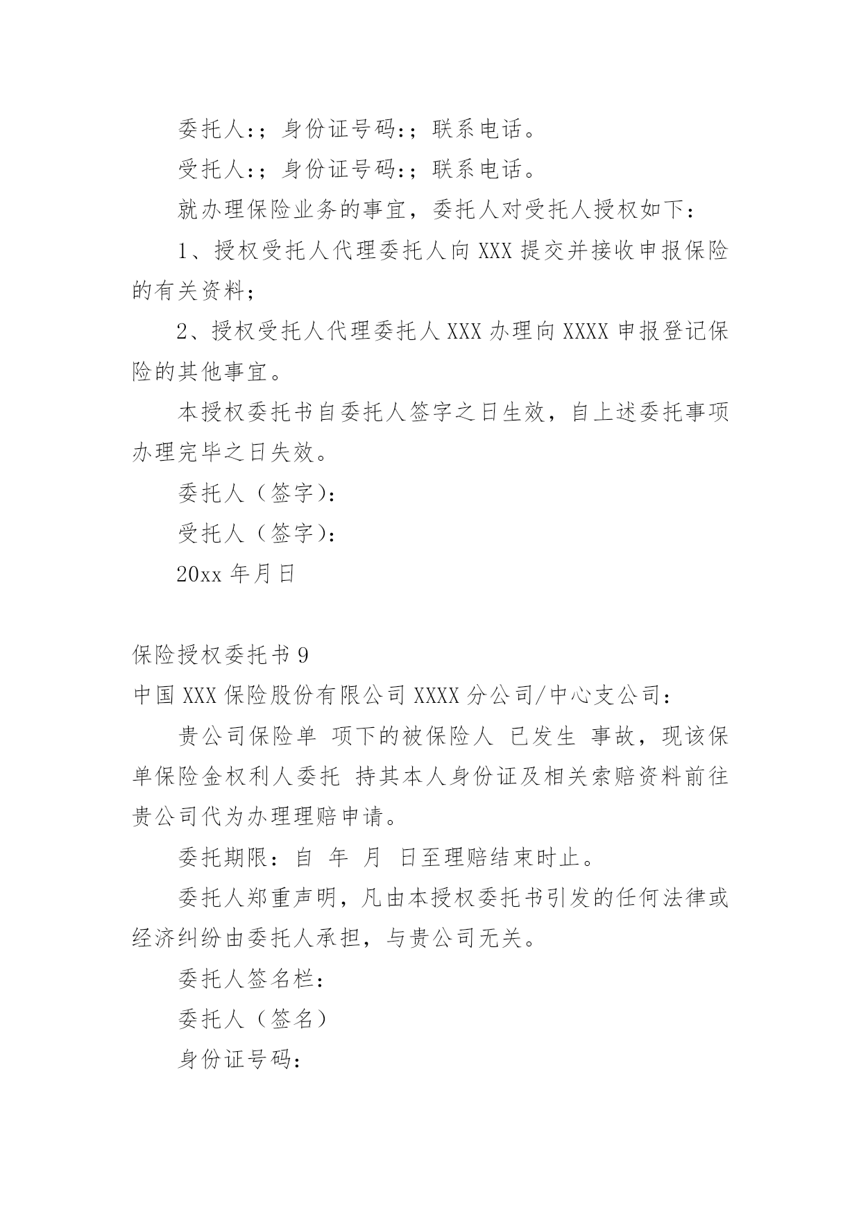 保险授权委托书被委托人如果没有做出违背国家法律的任何权益,被委托人在行使权力时委托人不得以任何理由反悔委托事项。在日常生活中,委托书在处理事务上使用的情况越来越多,为了让您在写委托书时更加简单方便,以下是小编整理的保险授权委托书,欢迎阅读,希望大家能够喜欢。保险授权委托书1委托人:xxx性别:xxx身份证号码:xxxxxxxxxxxx受托人:xx性别:x身份证号码:xxxxxxxxxxxxx本人马希武有房屋壹处,该房屋坐落在解放路75号(市民贸购物中心一单元401室),《房屋所有权证》编号为xxxxxx号,建筑面积100.59平方米。本人因在外地出差,不能亲自来办理上述房屋的过户手续,特委托代为办理。受托人在办理上述事宜过程中所签署的相关文件,我均予以认可。被委托人:xxxxx年xx月xx日保险授权委托书2xxx有限公司:兹有我单位xx委托xxx全权办理保险理赔事宜,并允许委托人领取报案号的保险赔款。领取保险款金额:xxxx¥(大写:xxxx)以转账方式支付给:xxx户名:xxx开户银行:xxxxxxx银行账户:xxxxxx委托人在换行和处理上述单项的过程中,依法签署的.有关文件,我均予以承认,此委托书有效期从签署之日起至理赔事宜处理完毕止。理赔事宜包括:提交单证、办理车贷按揭保证、办理索赔申请手续、领取赔款(含网上划款)。重要声明:1、本授权书是由本授权人亲笔填写,由委托人确认其真实性,因虚假委托书导致的经济赔偿由委托人或领款人承担。2、为方便贵公司可以顺利将款项通过银行转账划入以上指定的账号,本授权人已确认以上指定账号信息完整有效。3、如因提供的索赔资料和相关信息有误引起的后果由授权人承担。4、授权人(被保险人)身份证明为本委托书必备附件。授权人签章(公章):受托人签章(公章):身份证号:xxxxxxxx身份证号:xxxxxxxxxx20xx年xx月xx日保险授权委托书3委托人:XX身份证号:XX被委托人:XX身份证号:XX委托事项:XXXX委托权限:1.XXXXX2.XXXXX委托时限:自XX年XX月X日至XX年XX月XX日备注:本委托书一式三份。签字生效。委托人签名:XX委托人电话:XX被委托人签名:XX被委托人电话:XX委托日期:XXXX年XX月XX日附件:1.委托人身份证复印件2.被委托人身份证复印件保险授权委托书4甲方:_____限责任公司乙方:身份证号码:住址:联系电话:因乙方没有固定工作,现乙方向甲方提出,希望由甲方代其缴纳养老保险费,缴费基数为上年度四川省在岗职工平均工资的60%,企业和个人负担的社保保险费用以及由此产生的所有费用均由乙方个人全额负担,甲、乙双方不存在任何形式的劳动关系以及其他任何责任。乙方应当每月以现金方式交付甲方代缴的`养老保险费用,否则甲方有权终止为乙方代为缴纳,无论甲方事先有无通知乙方,由此产生的法律后果由乙方自行承担,乙方承诺放弃向甲方主张任何经济索赔等权利。经双方协商一致,达成如下协议:1、自年月开始,甲方为乙方代缴养老保险费用,缴费基数为上年度四川省在岗职工平均工资的60%。2、若乙方没有书面通知甲方其与任何企业、个体工商户、社会团体等建立劳动关系,视为乙方一直处于无固定工作状态。3、若乙方与第三方建立劳动关系,最迟应在建立劳动关系后5个工作日内通知甲方,由甲方为其办理养老保险终止缴费手续,否则由此产生的一切法律后果由乙方自行承担。4、甲方代乙方缴纳养老保险费用,甲方所代缴的全部费用由乙方个人承担,包括公司与个人缴纳款。5、甲方在为乙方代缴社保时,乙方应提前向甲方提供所需资料,自行办理转移手续,并承担其他相关费用。6、乙方支付方式:在甲方代缴之前,每月提前五天一次性支付完毕当月的所有费用。7、乙方如未按期支付社保费用,甲方有权停止办理乙方的代缴社保事宜,由此产生的一切后果由乙方自行承担。8、乙方和甲方之间并不存在任何劳动雇佣关系,乙方不得以任何理由向甲方提出劳动支付请求,乙方所有的社会、法律、安全义务与责任均由乙方自行承担,与甲方无关。9、本协议所有条款及内容协议双方均负有保密责任,未经甲方同意,乙方不得向除甲乙之外的第三方披露其中的任何信息。否则所造成的损失及连带责任由乙方全部承担。10、本协议未尽事宜,通过友好协商解决。11、本协议一式两份,甲乙双方各执一份,具有同等的法律效力。本协议经甲乙双方签字盖章(指模)后生效。甲方:乙方:____年__月__日____年__月__日保险授权委托书5因本公司承建xxx工程,现委任xxx为本公司代理人,xx,身份证号码为xxx,代理本公司处理上述工程的有关事项,具体授权范围如下:一、以本公司的名义签订、修改本工程的合同书、协议书及补充文件等。二、代表本公司组建项目经理部,聘请工程技术人员和施工人员,负责工程借款、支付和结算到中国工商